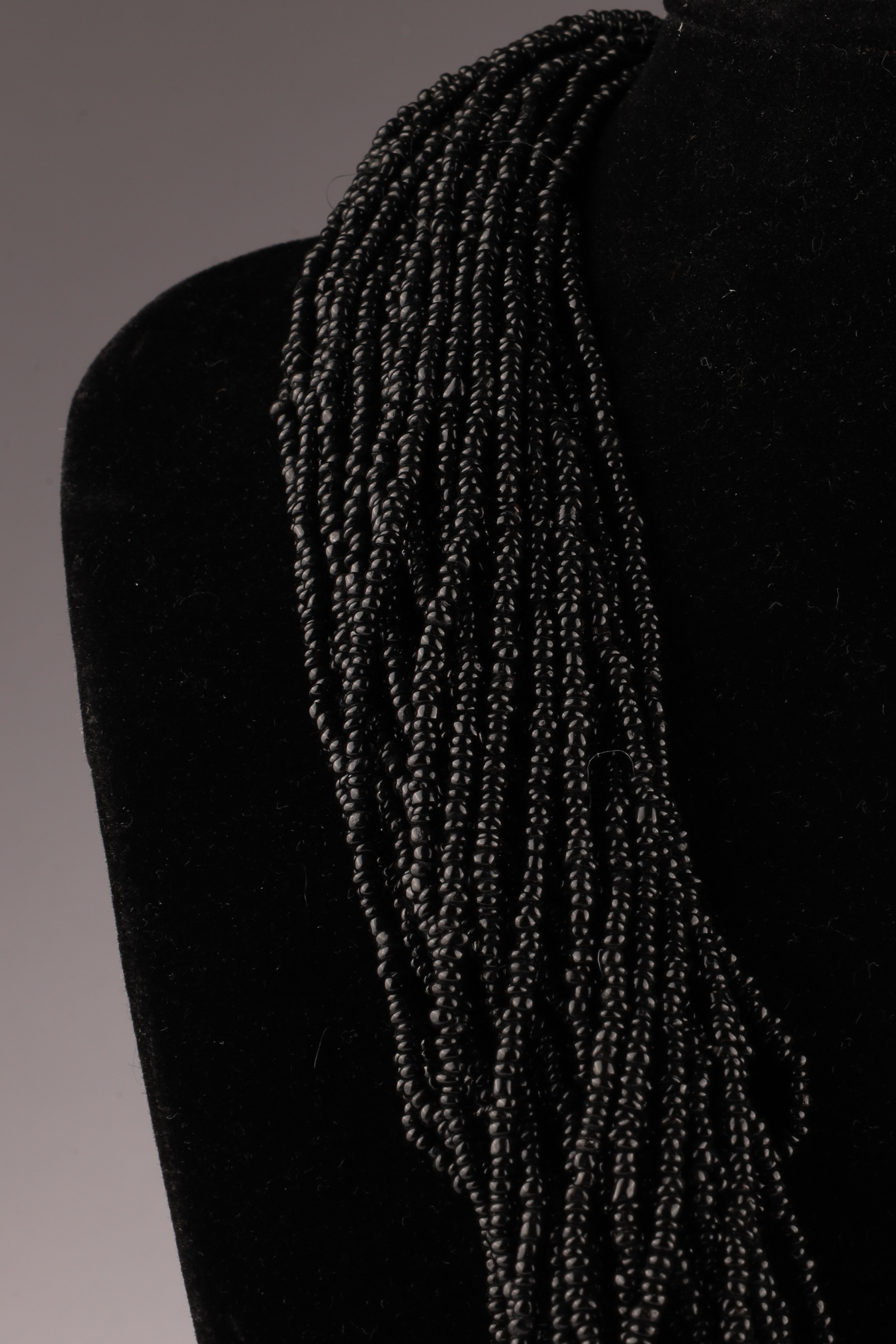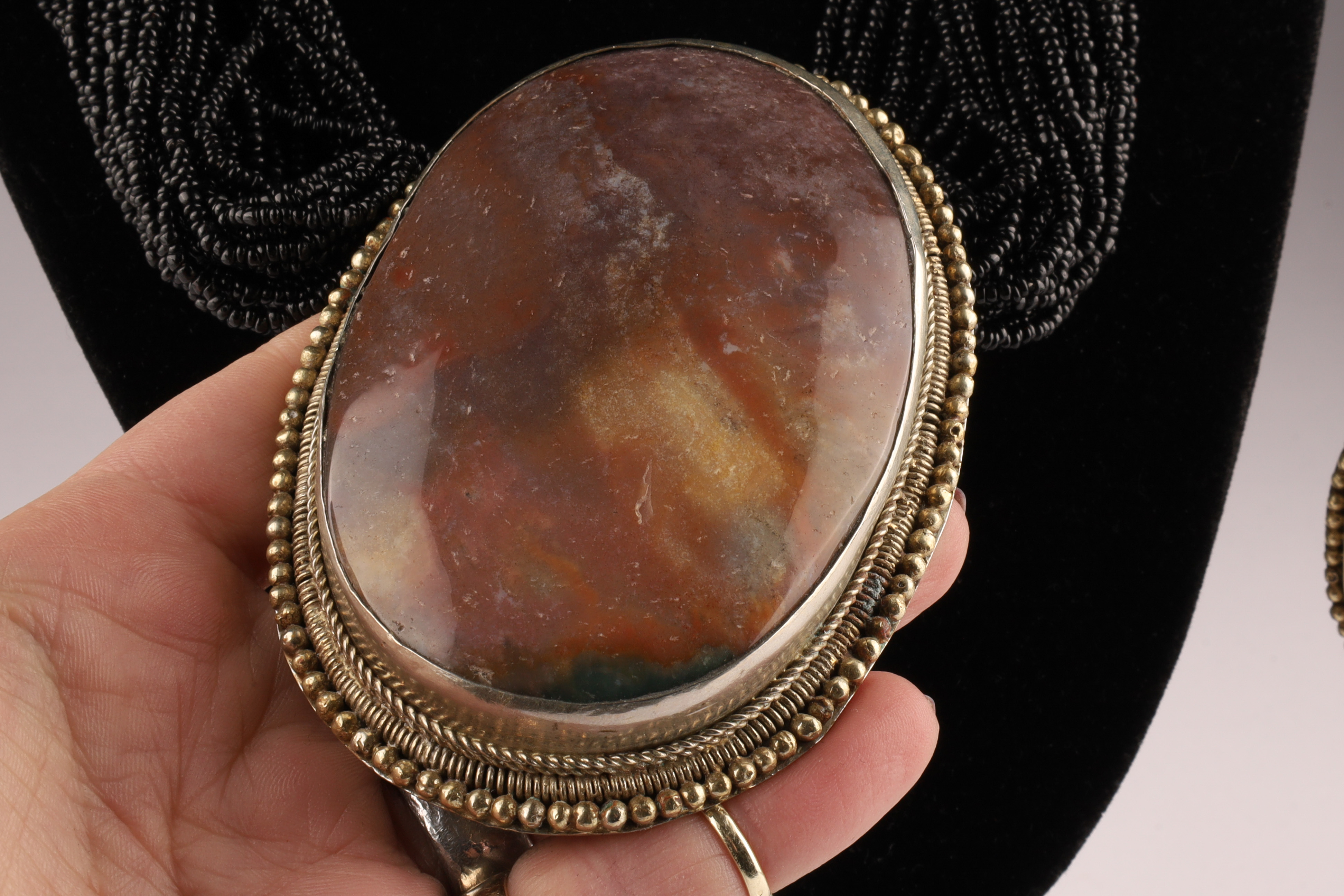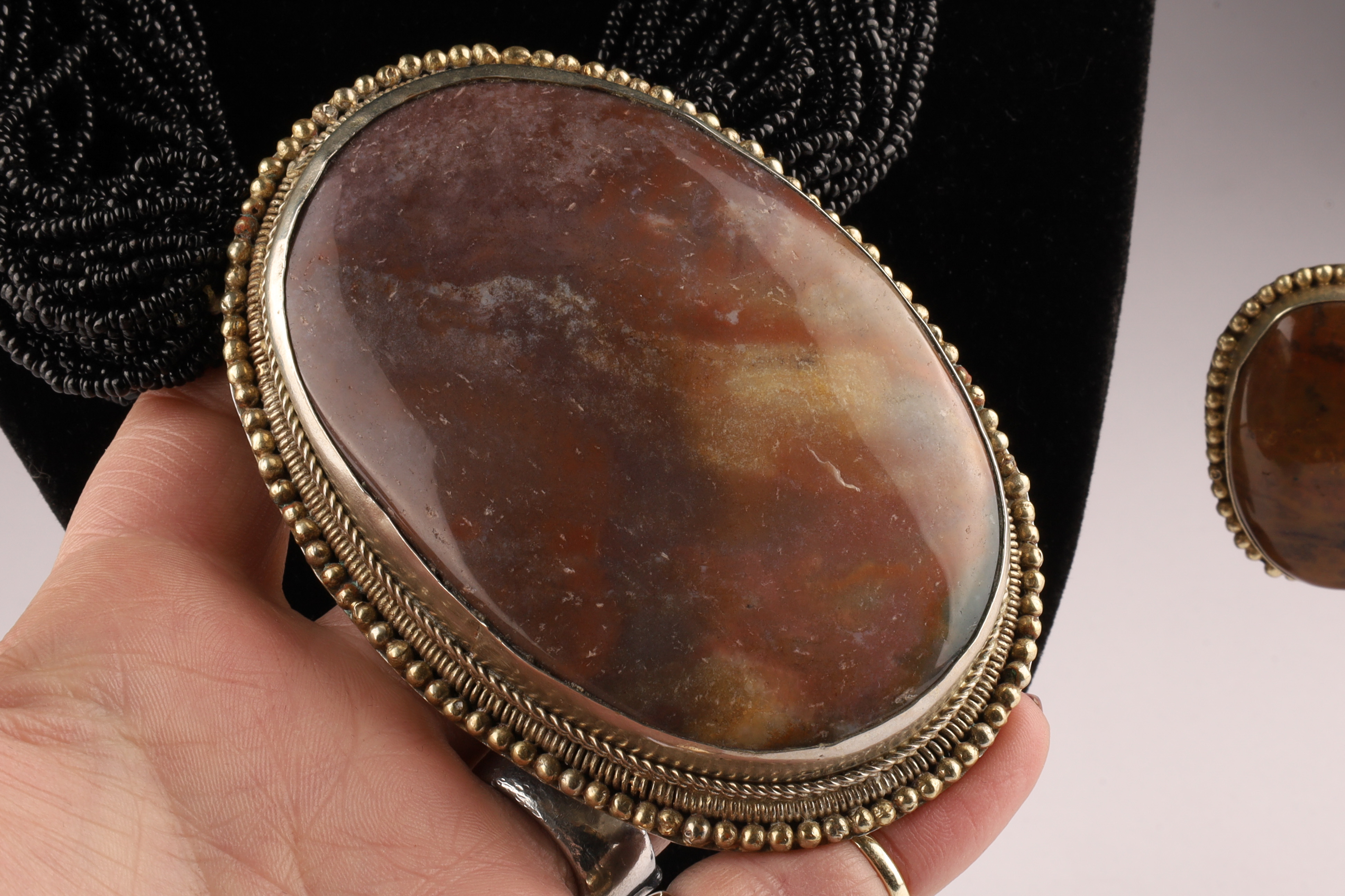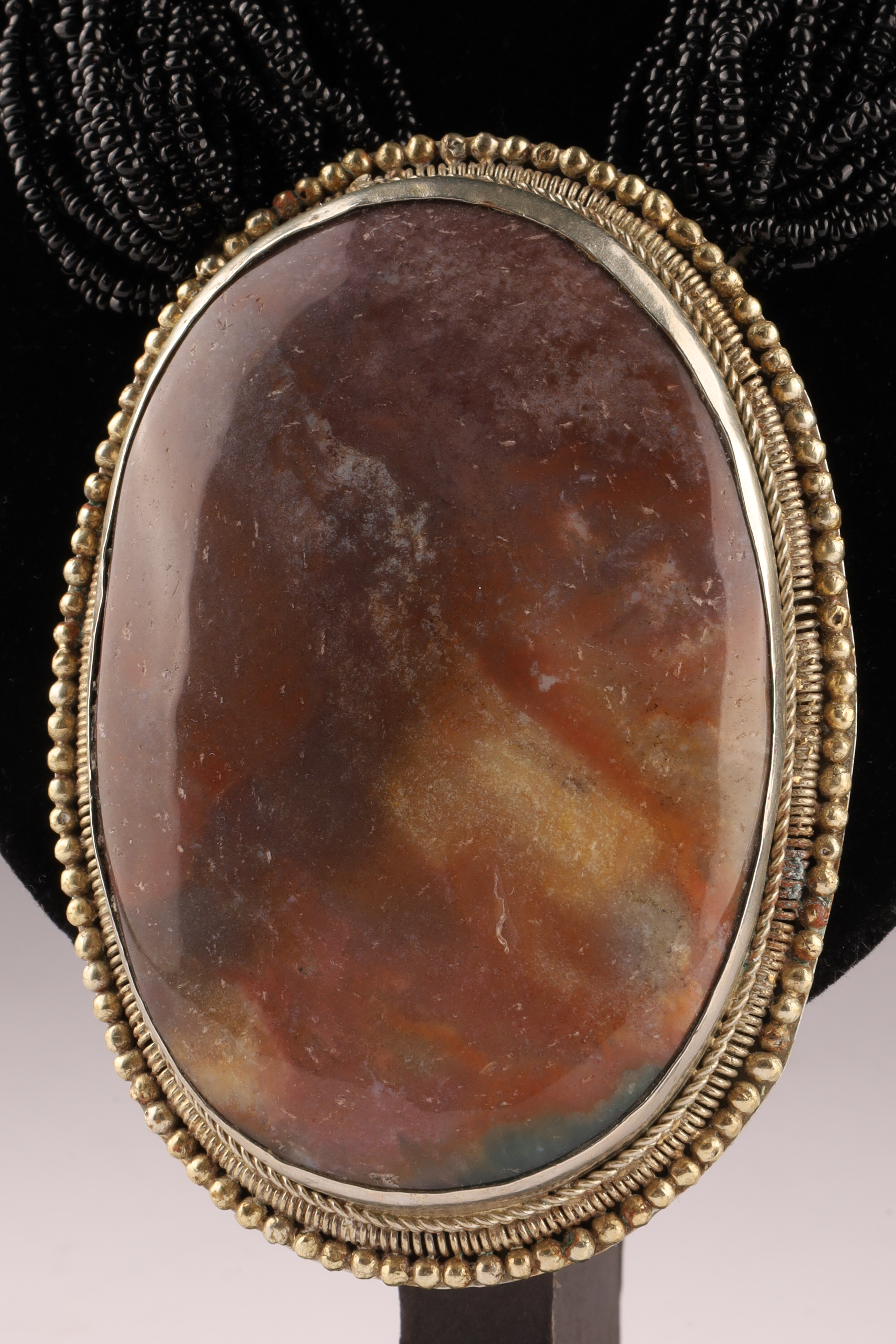 Set Multi Strand Black Beaded Necklace with Large Stone Pendant and Earrings