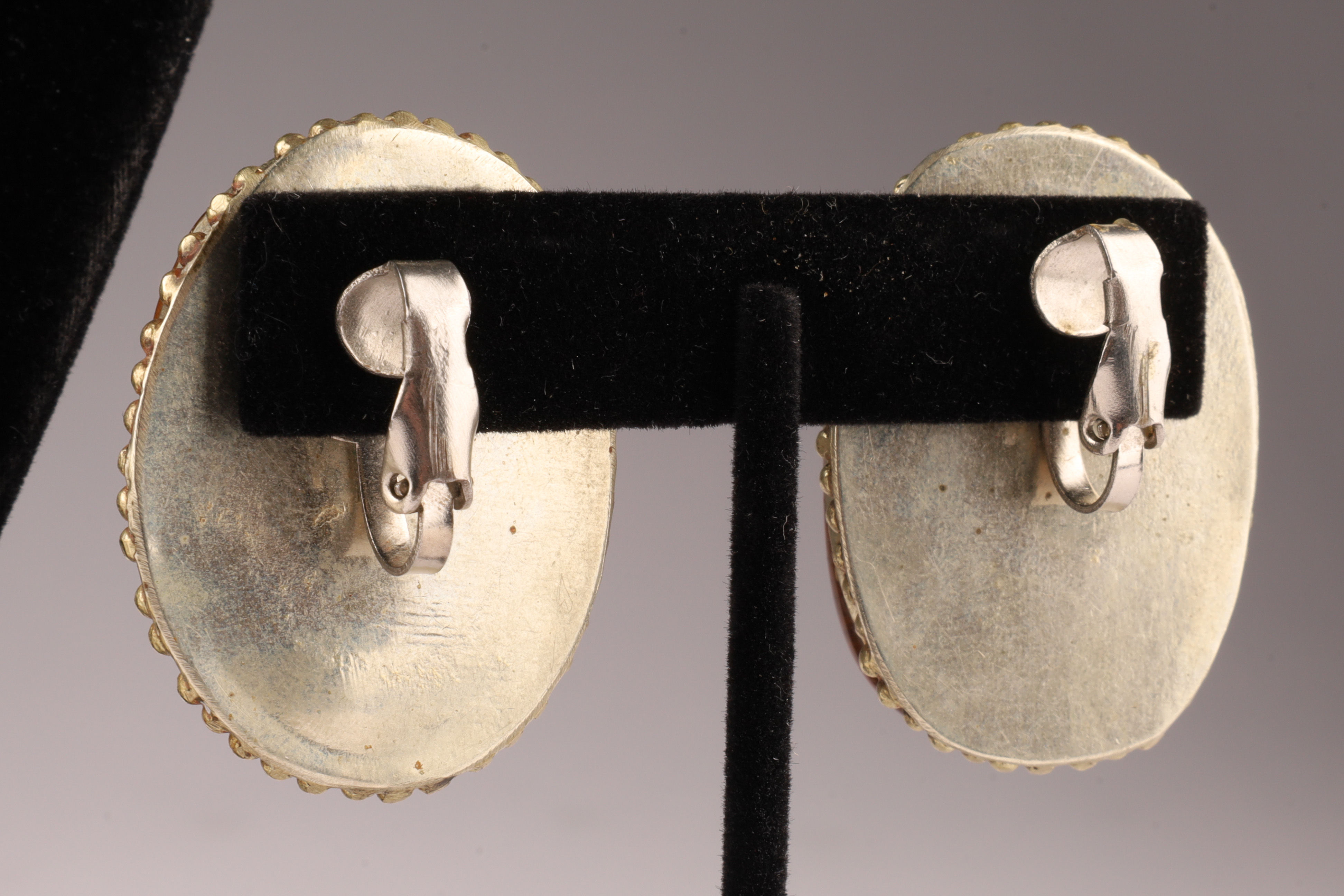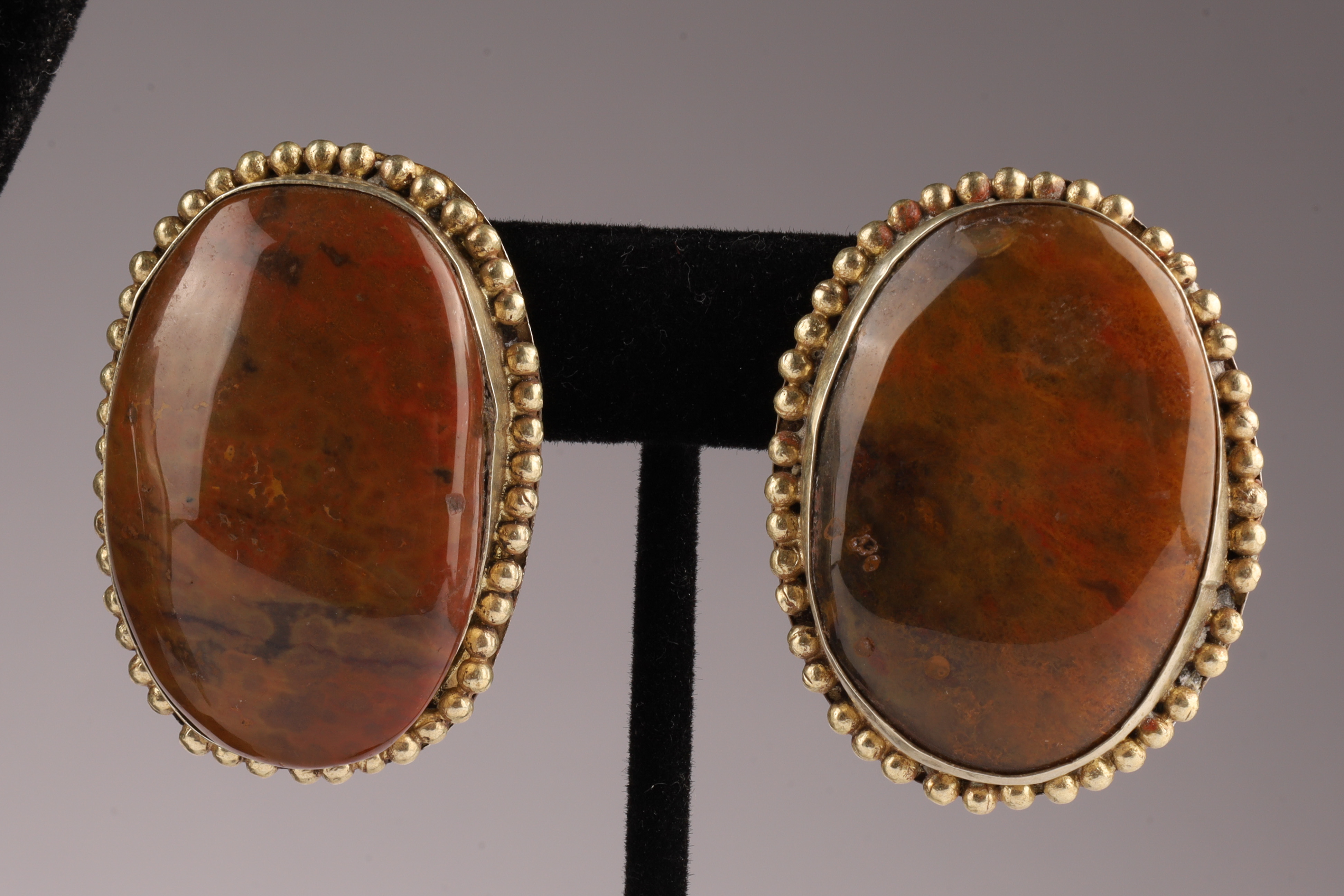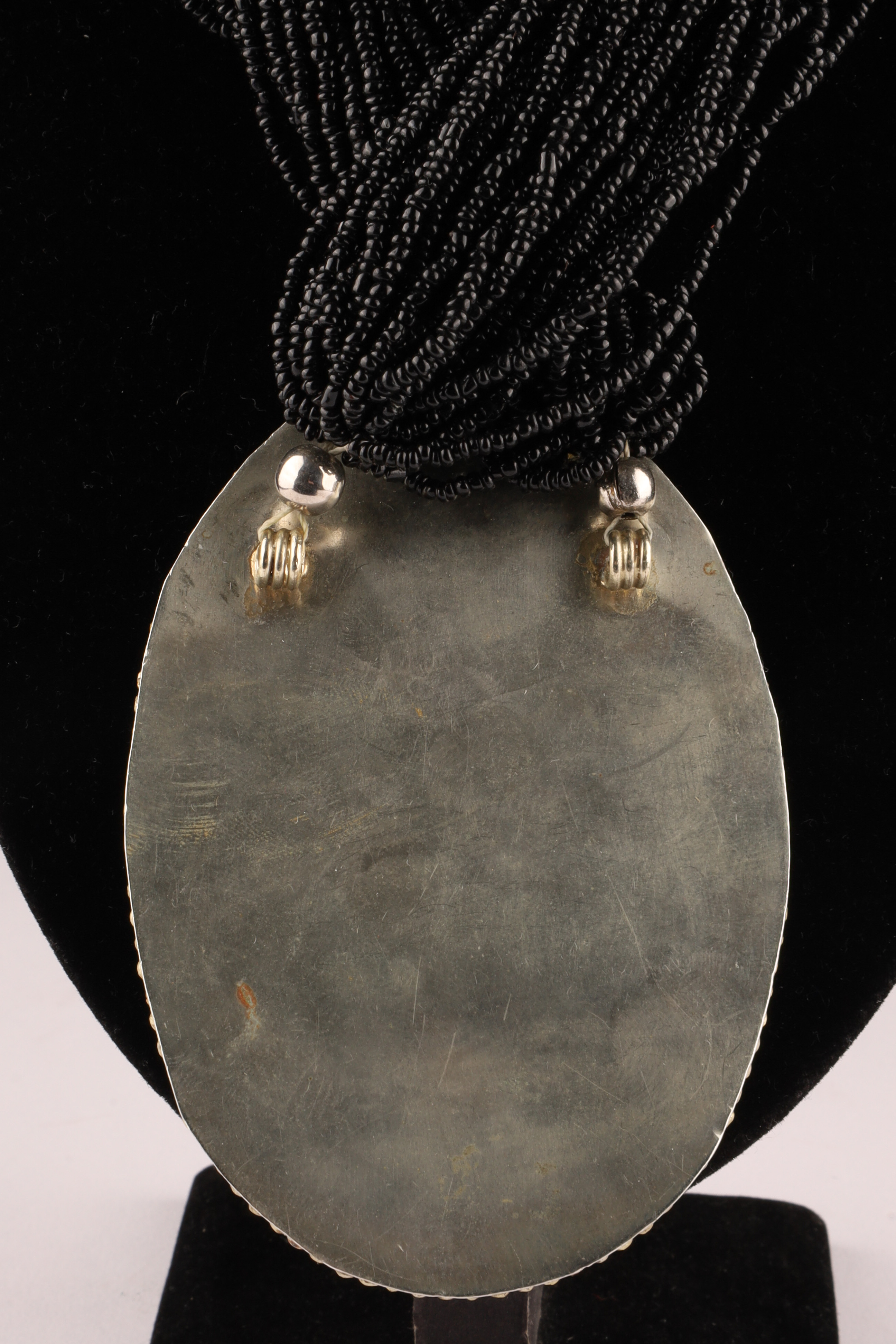 Set Multi Strand Black Beaded Necklace with Large Stone Pendant and Earrings. Pendant measures 4 inches H x 2.5 W, necklace measures 22 inches L, earrings measure 2 inches H x 1 W.