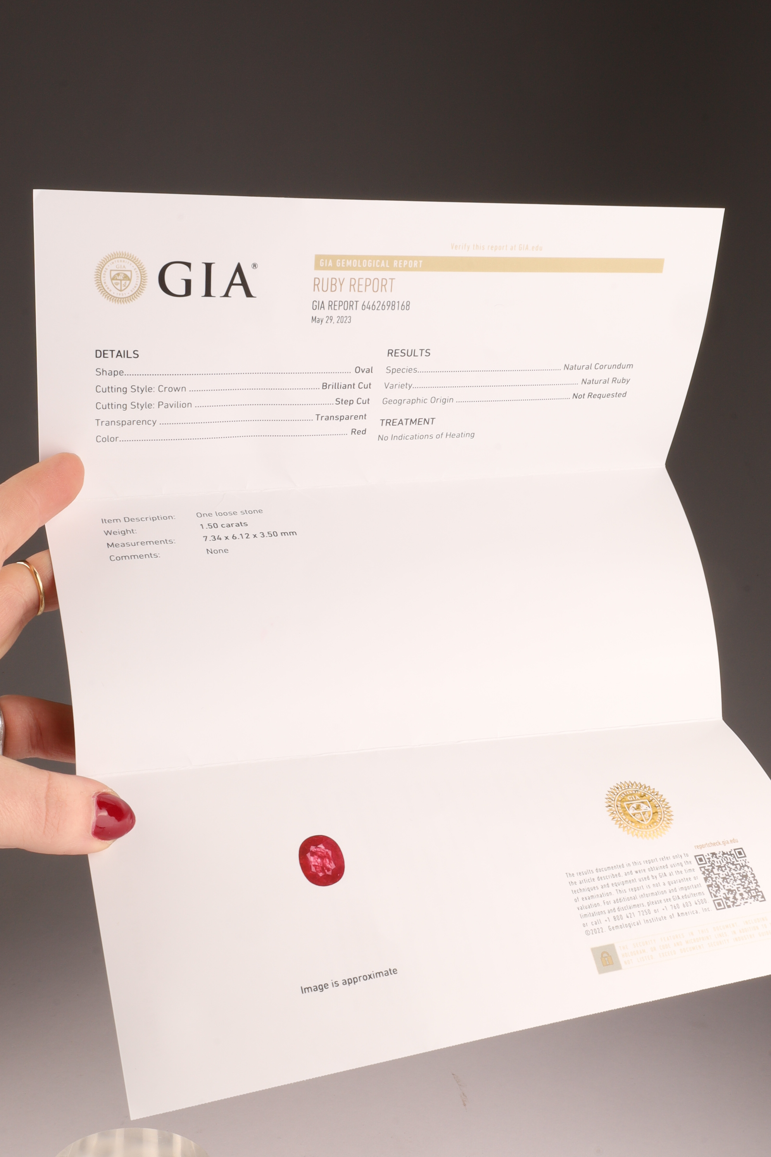 A fine oval-cut ruby weighing 1.50 carats, transparent red, with no indications of heating (GIA Report no. 6462698168, May 29, 2023). Brilliant-cut crown and step-cut pavilion, measuring 7.34 × 6.12 × 3.50 mm. Offered loose, accompanied by original GIA paperwork.