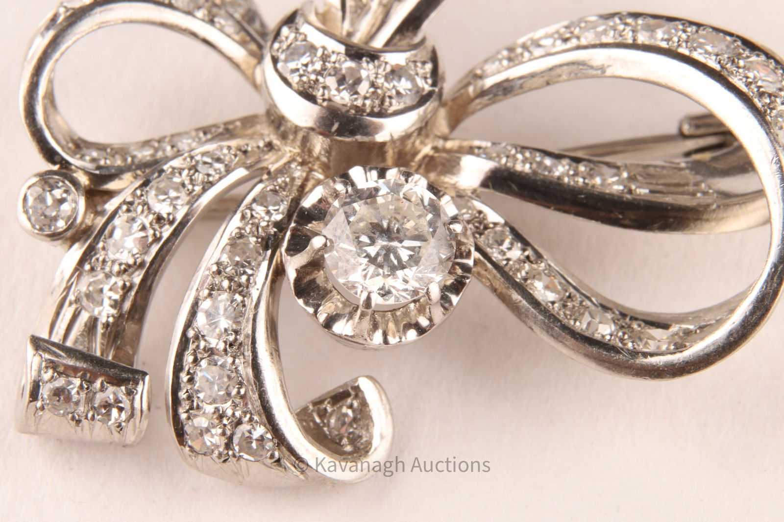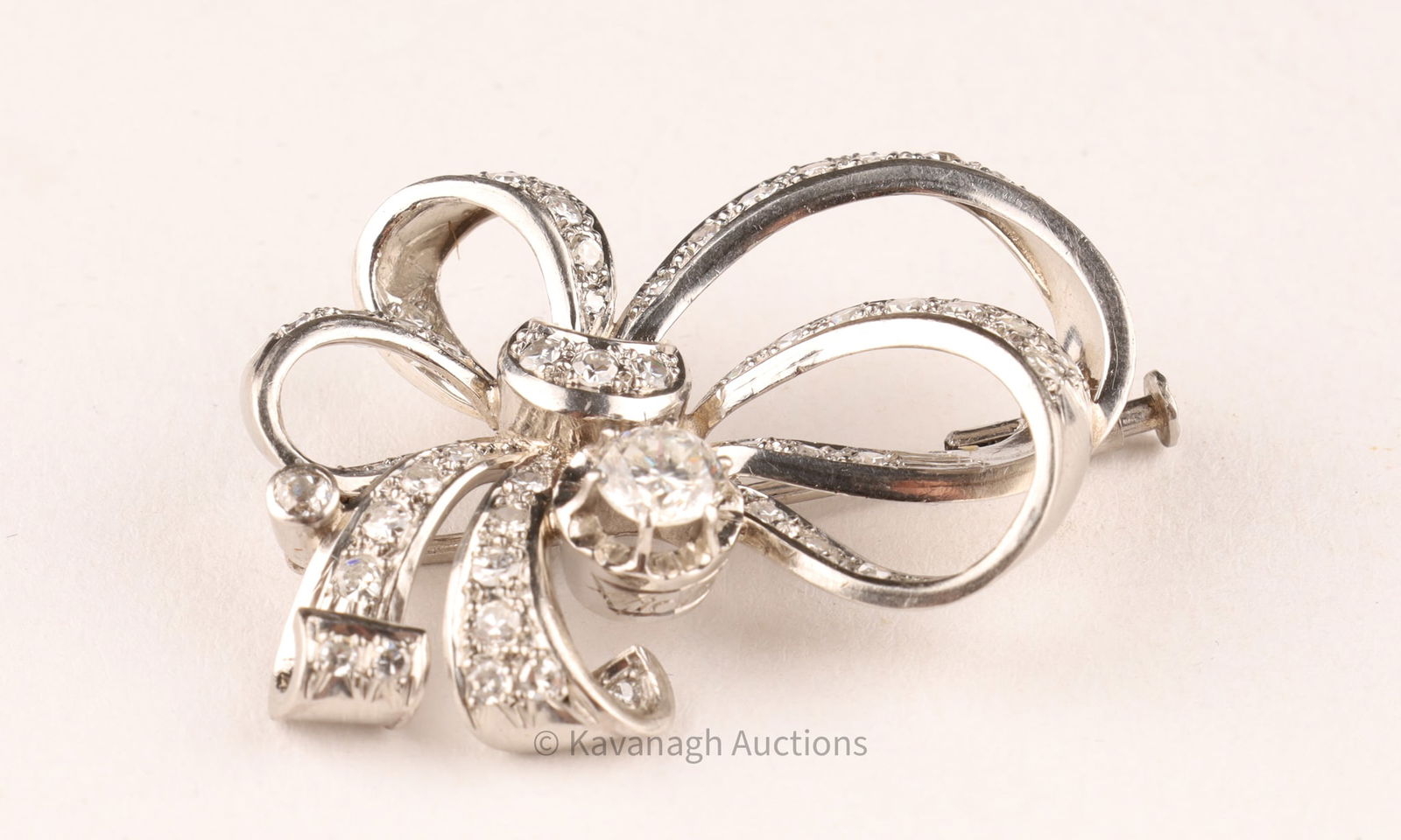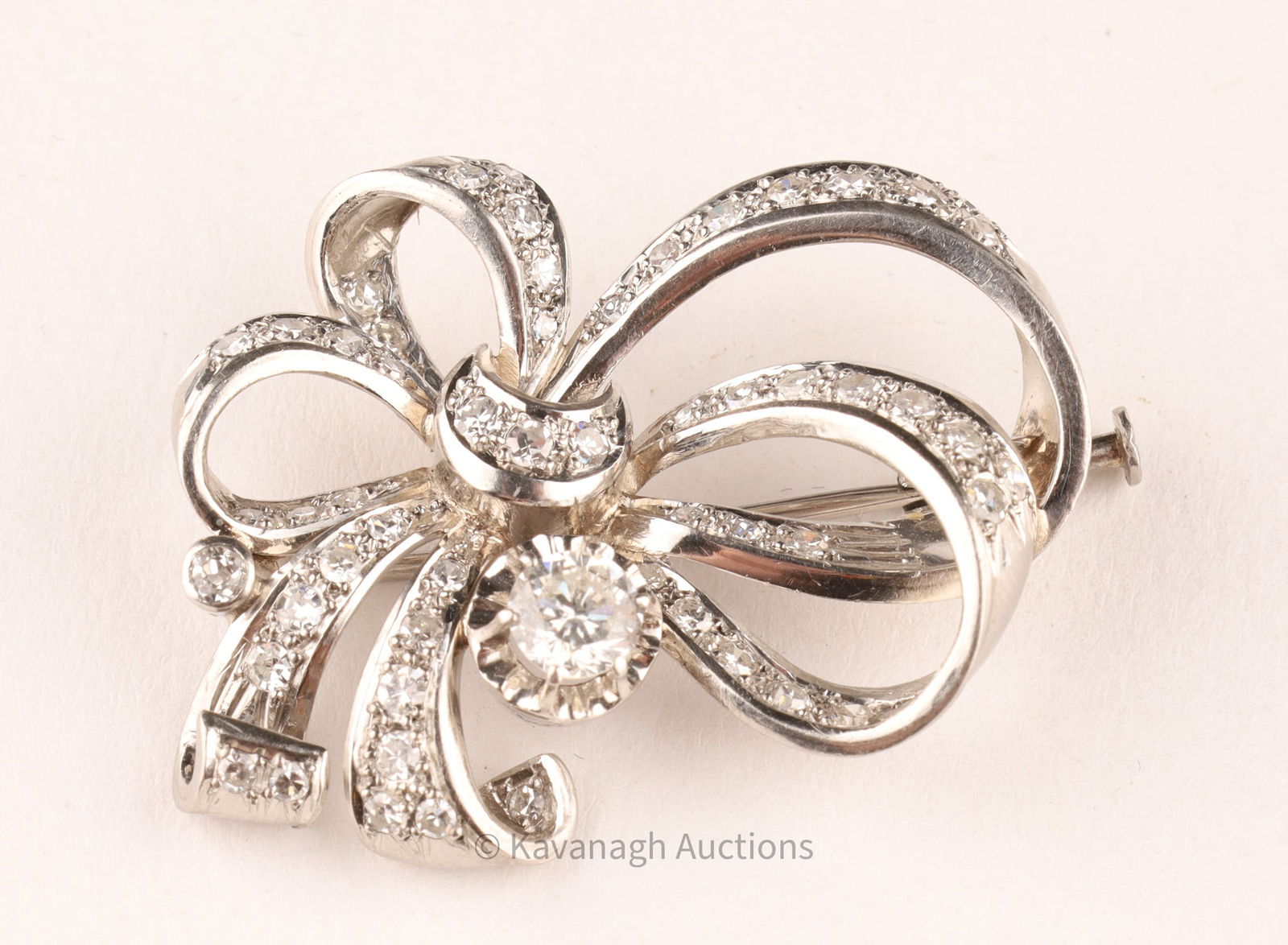 A refined vintage brooch of stylized bow design, crafted in platinum and set with an estimated 1.85-1.95 total carats of diamonds. At center rests a round brilliant-cut diamond of approx. 0.50 ct, mounted in a six-prong setting, surrounded by pavé-set round diamonds totaling about 1.45 cts.