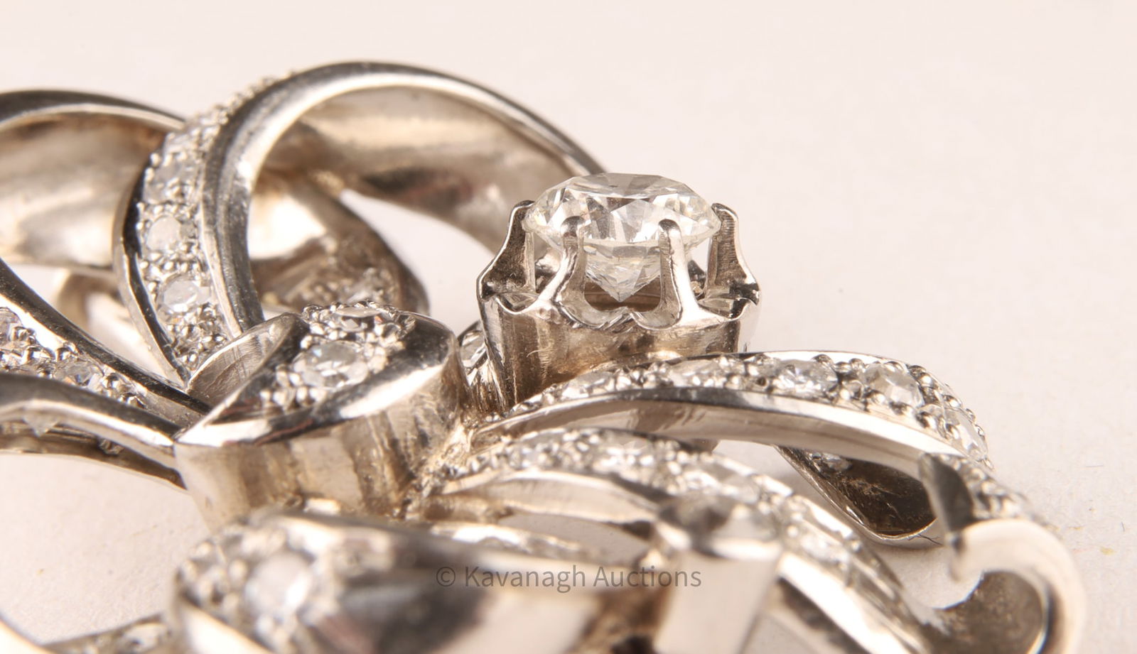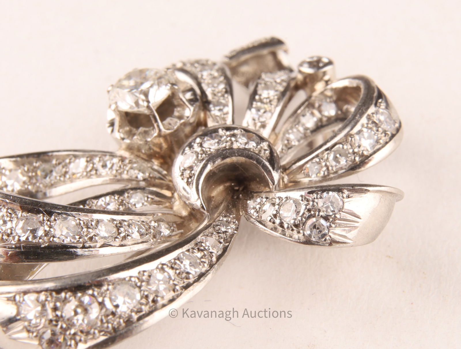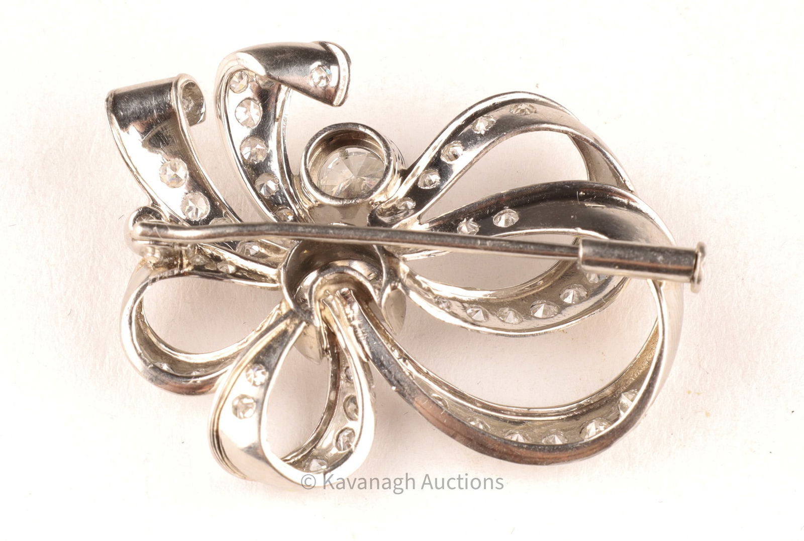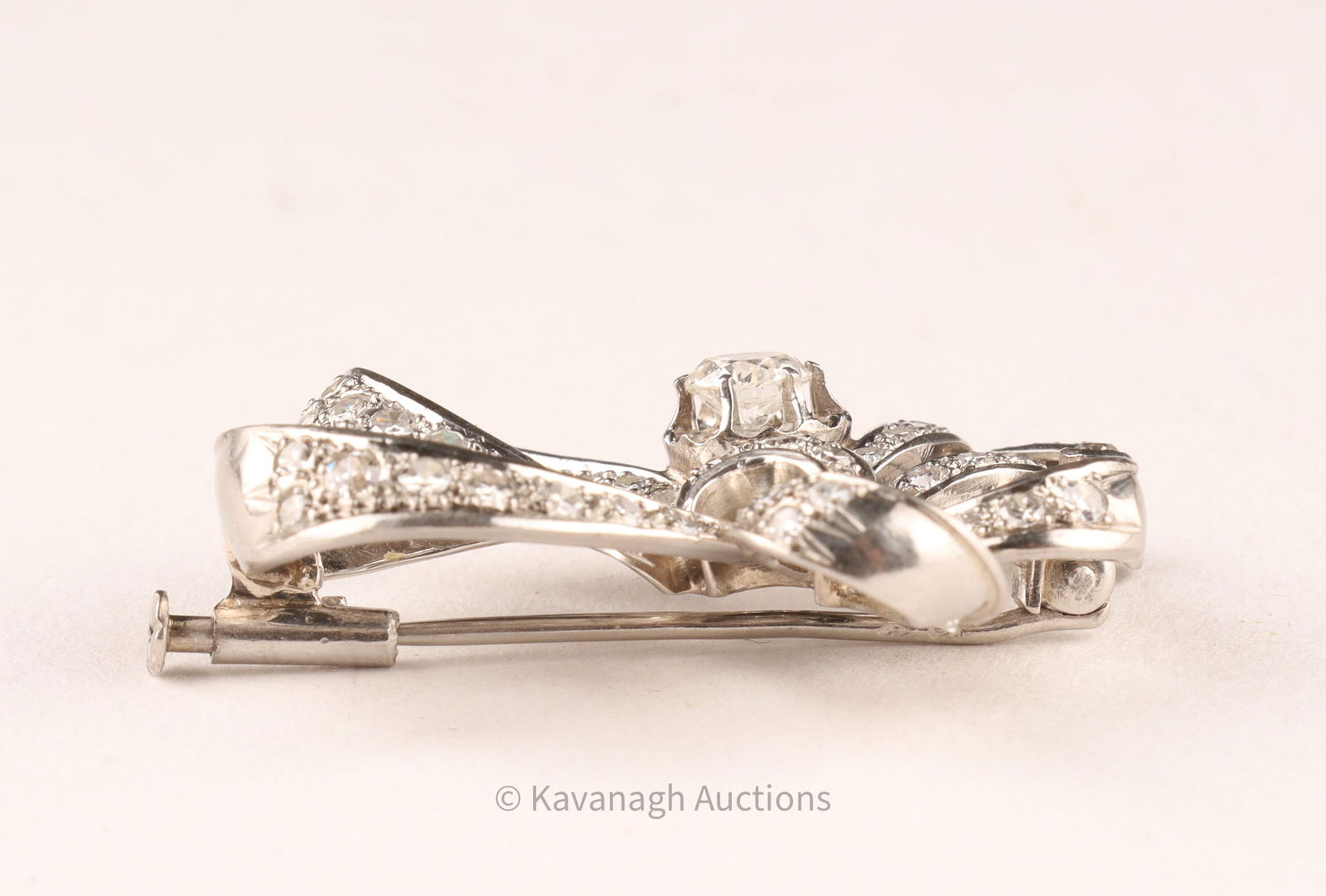 A refined vintage brooch of stylized bow design, crafted in platinum and set with an estimated 1.85-1.95 total carats of diamonds. At center rests a round brilliant-cut diamond of approx. 0.50 ct, mounted in a six-prong setting, surrounded by pavé-set round diamonds totaling about 1.45 cts.