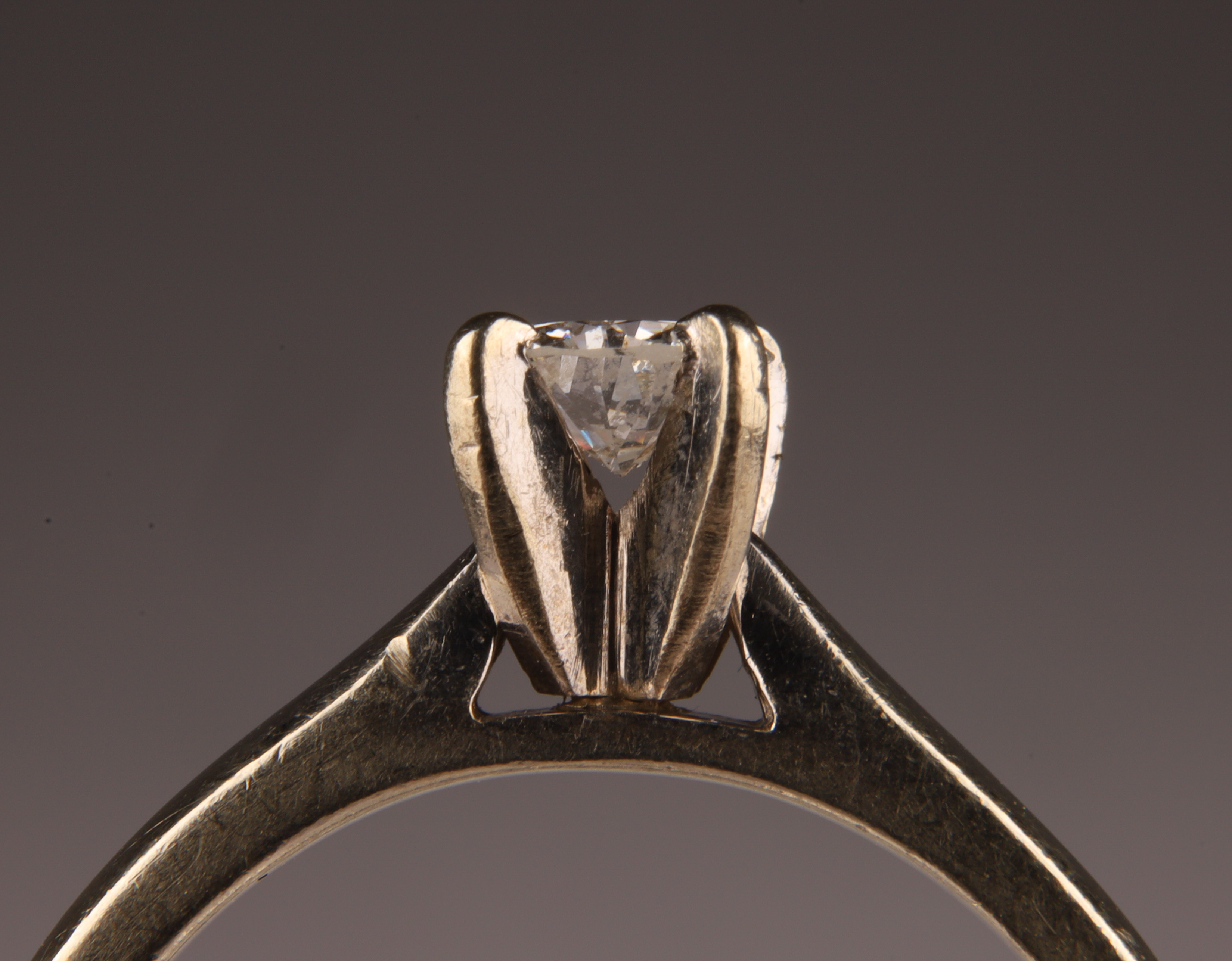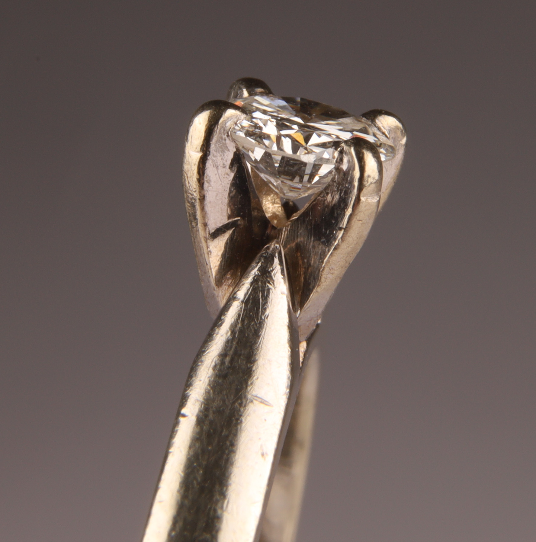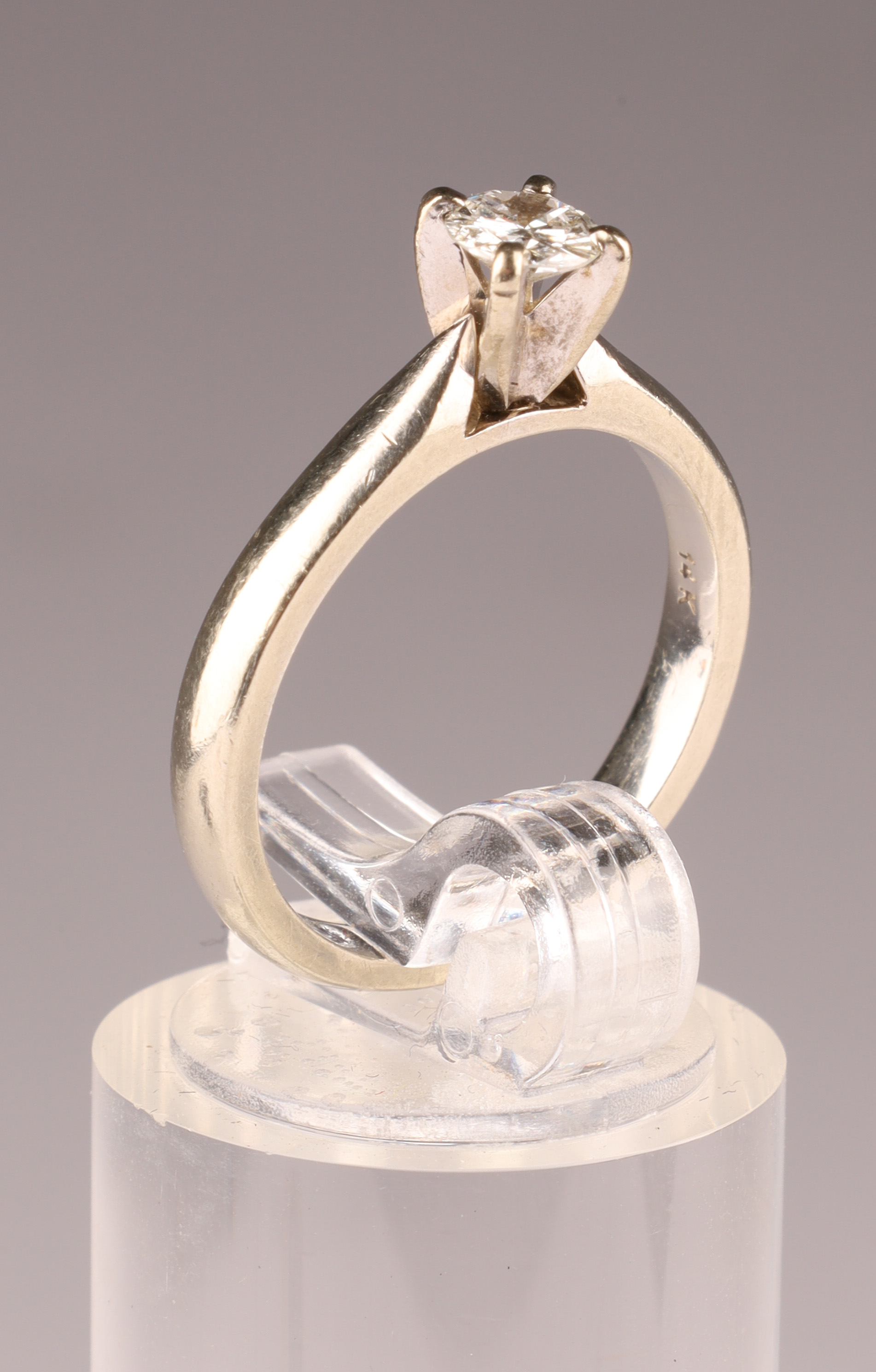 A vintage, signed 14kt, white gold 4-pronged diamond solitaire ring. Set with a central round brilliant cut measuring approximately 4.1 mm across and weighing approximately 0.25 carats. The ring weighs 3.3 grams and is approximately a size 6.
