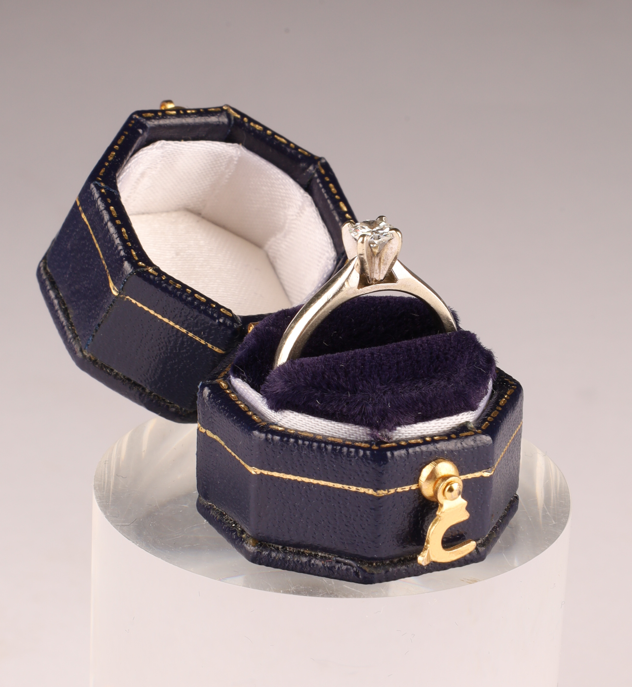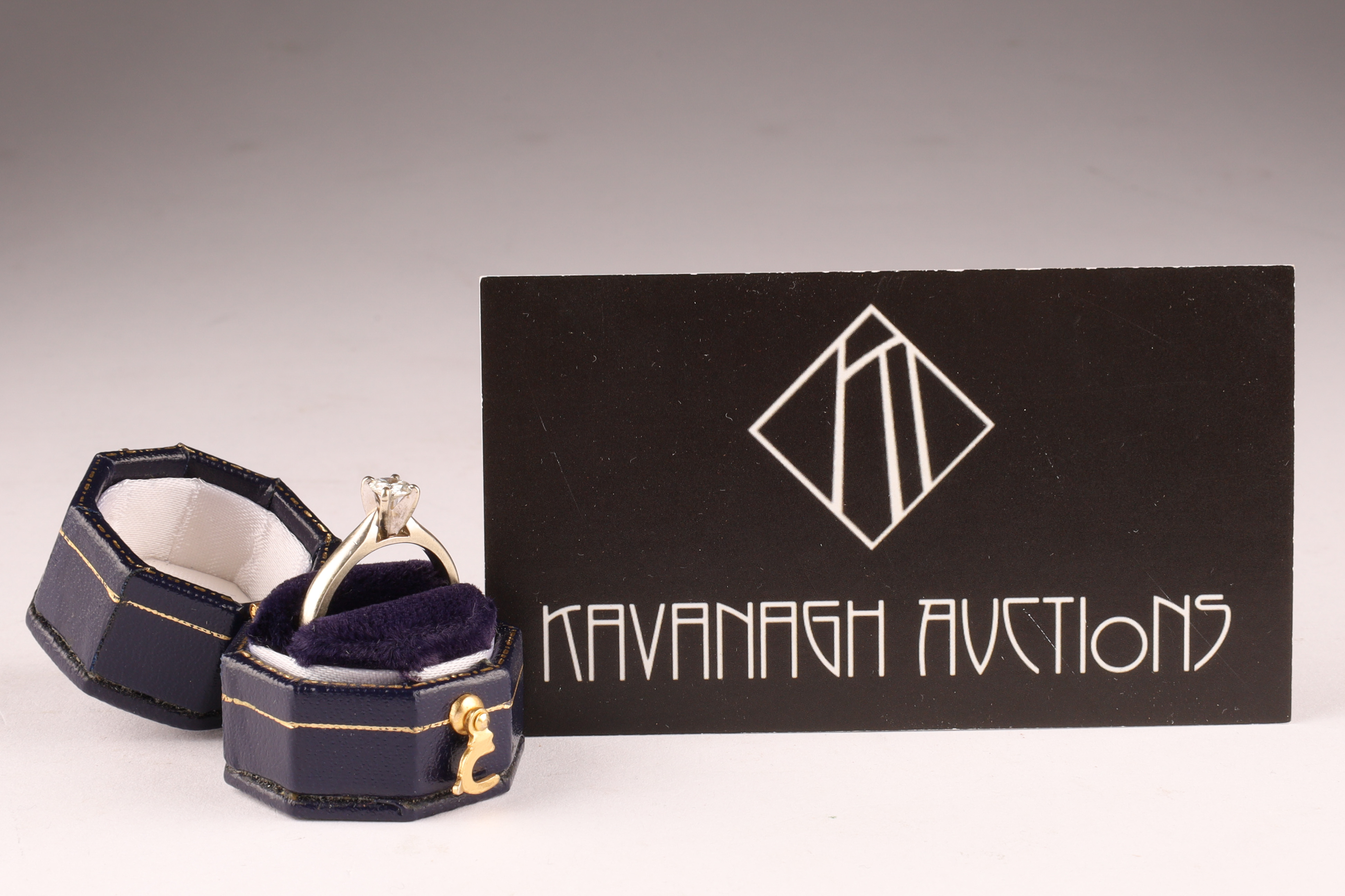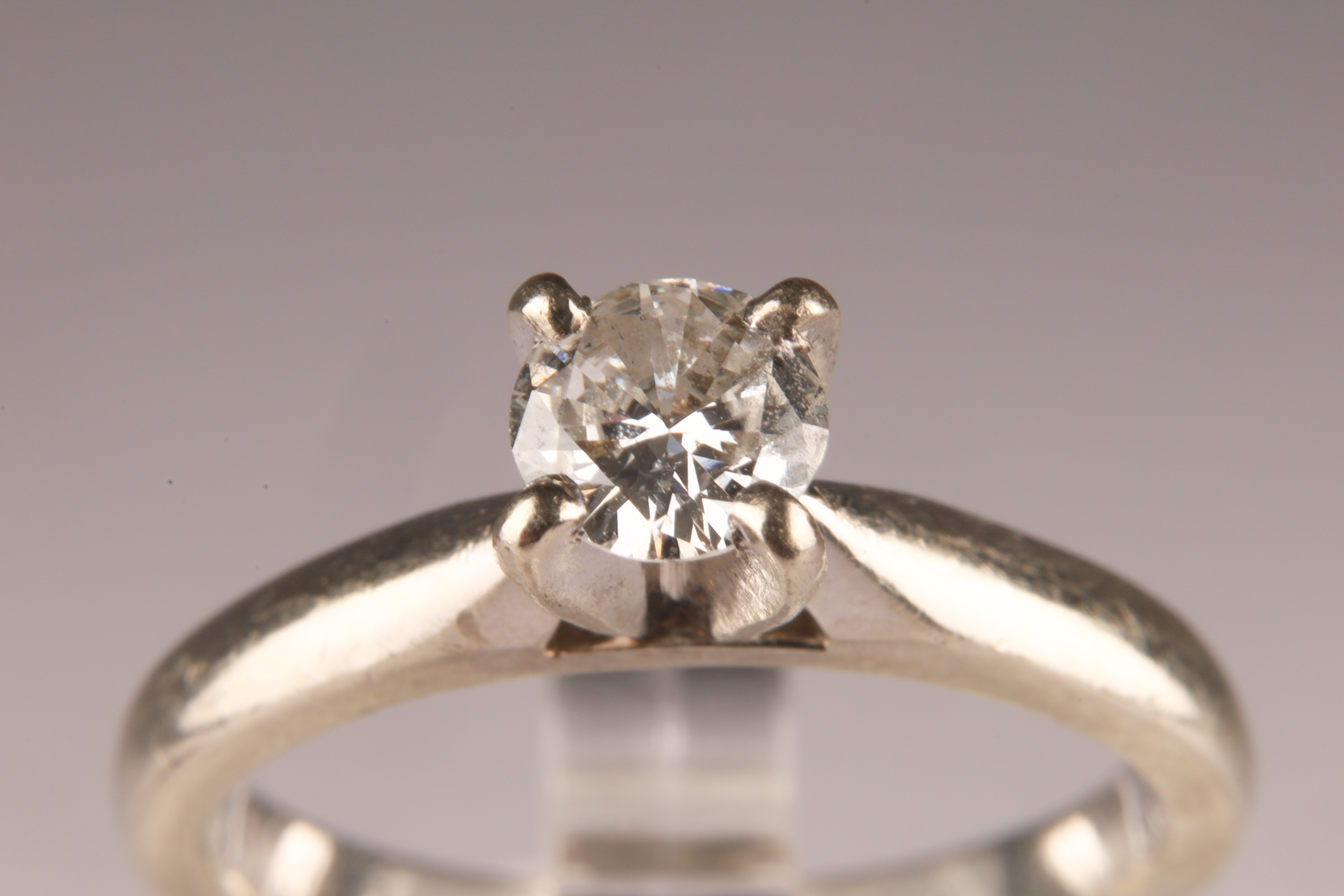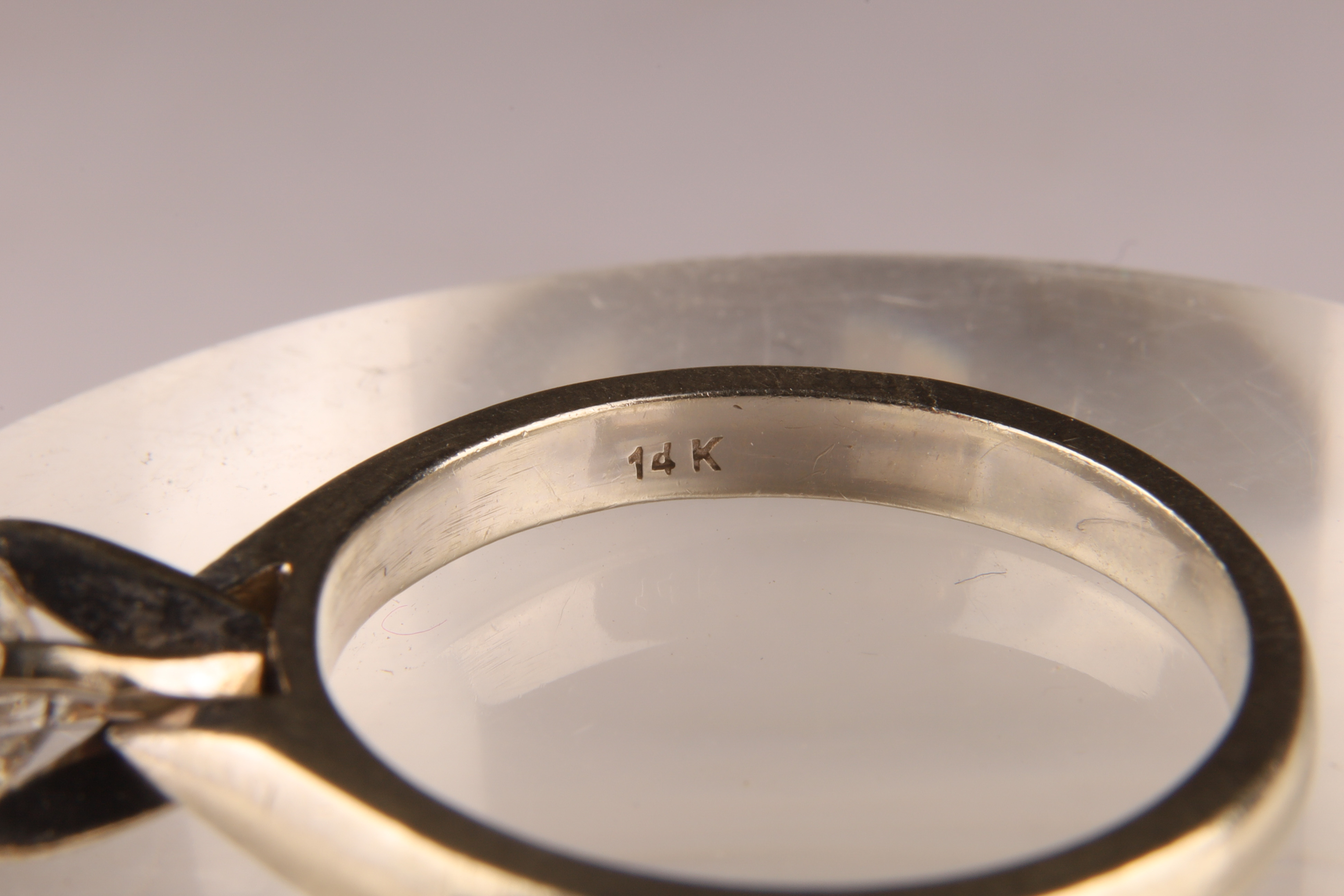 A vintage, signed 14kt, white gold 4-pronged diamond solitaire ring. Set with a central round brilliant cut measuring approximately 4.1 mm across and weighing approximately 0.25 carats. The ring weighs 3.3 grams and is approximately a size 6.