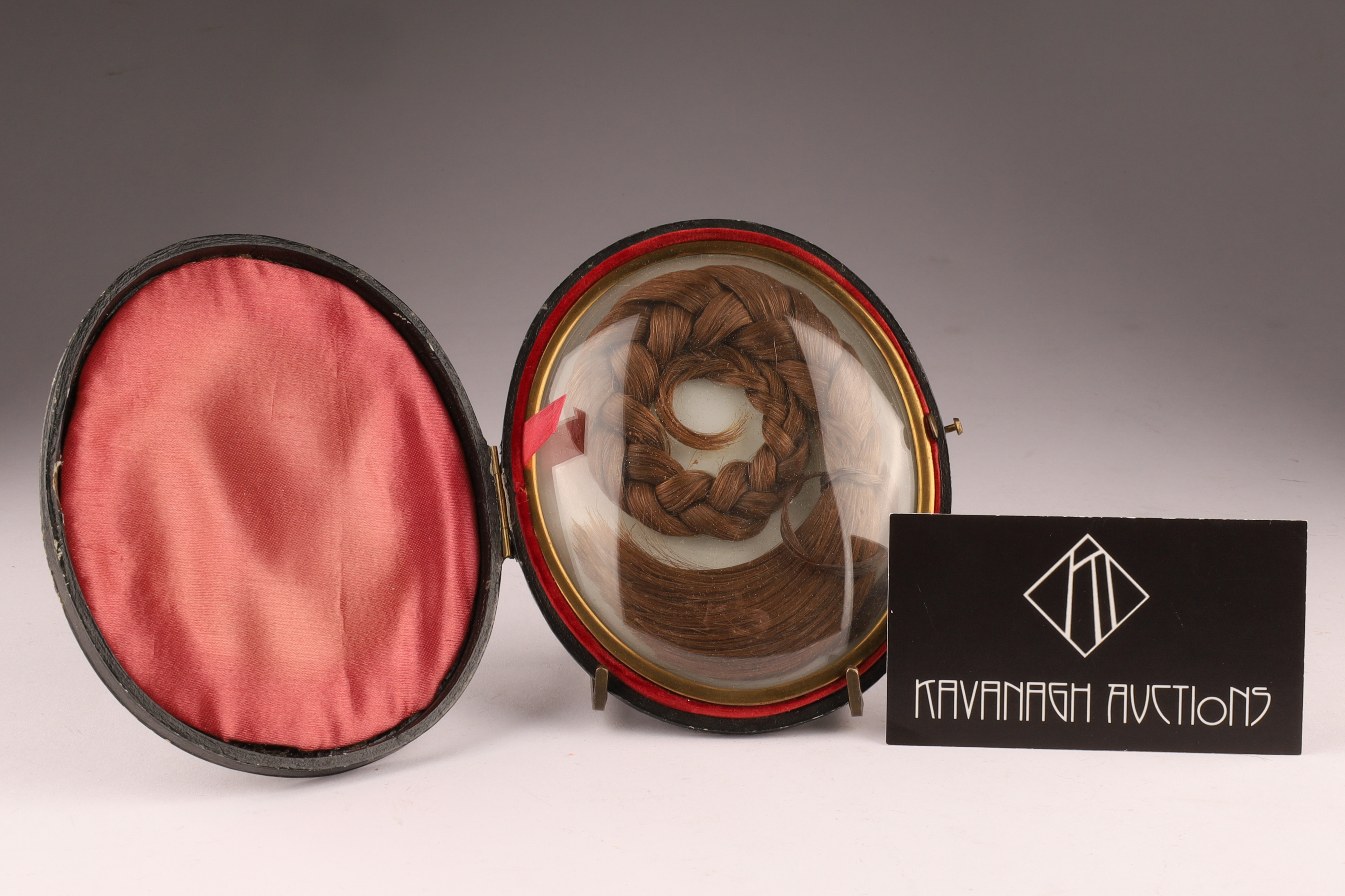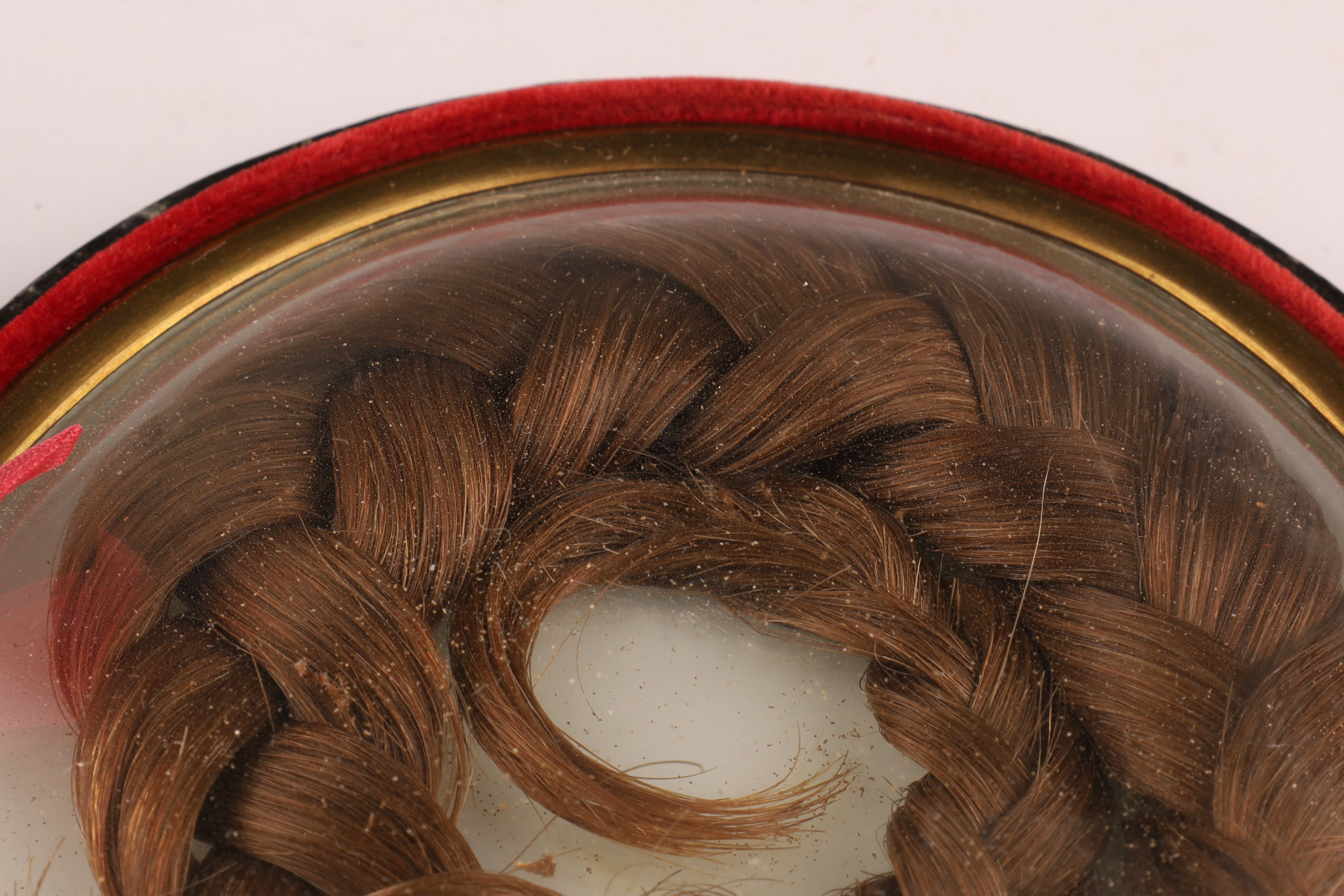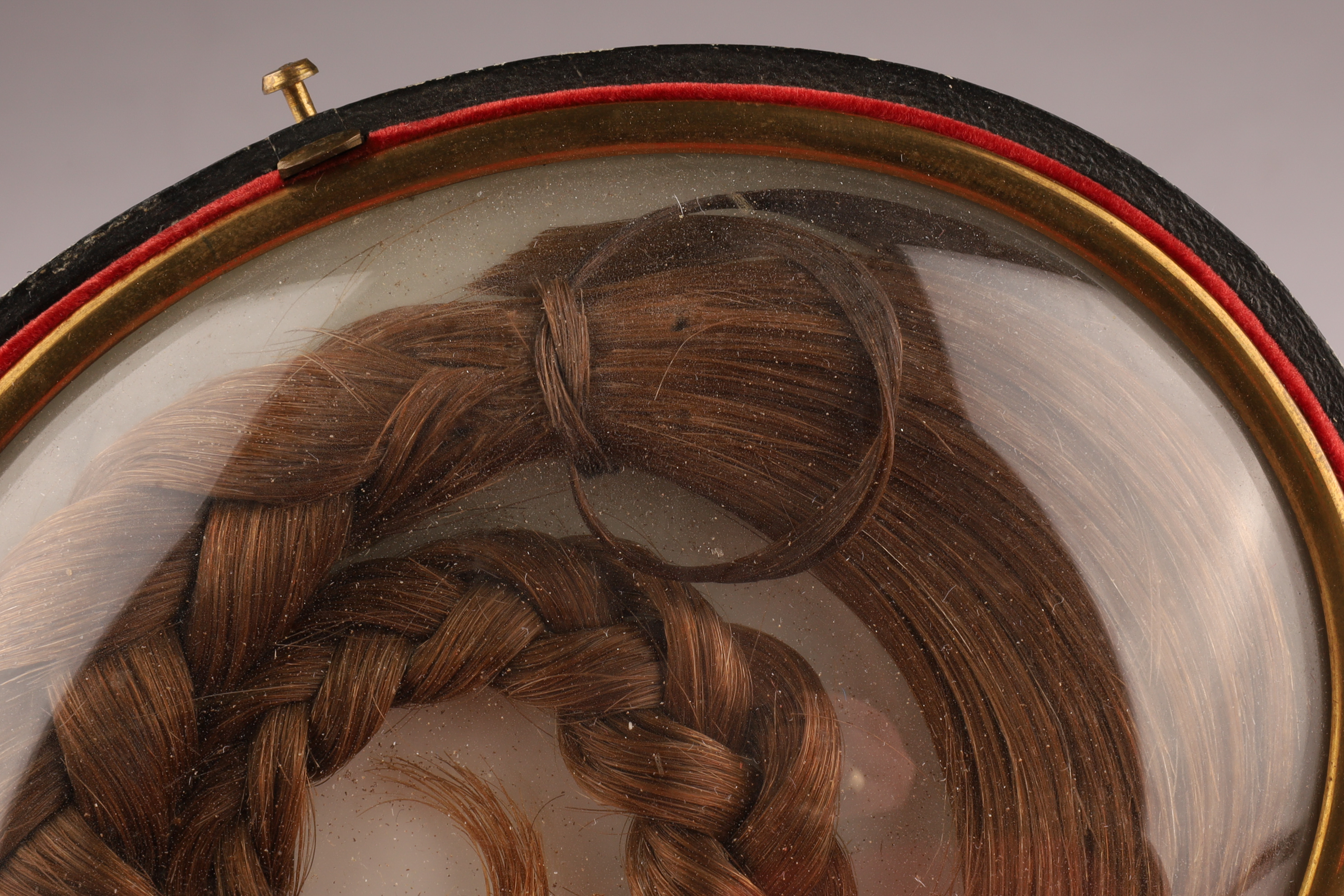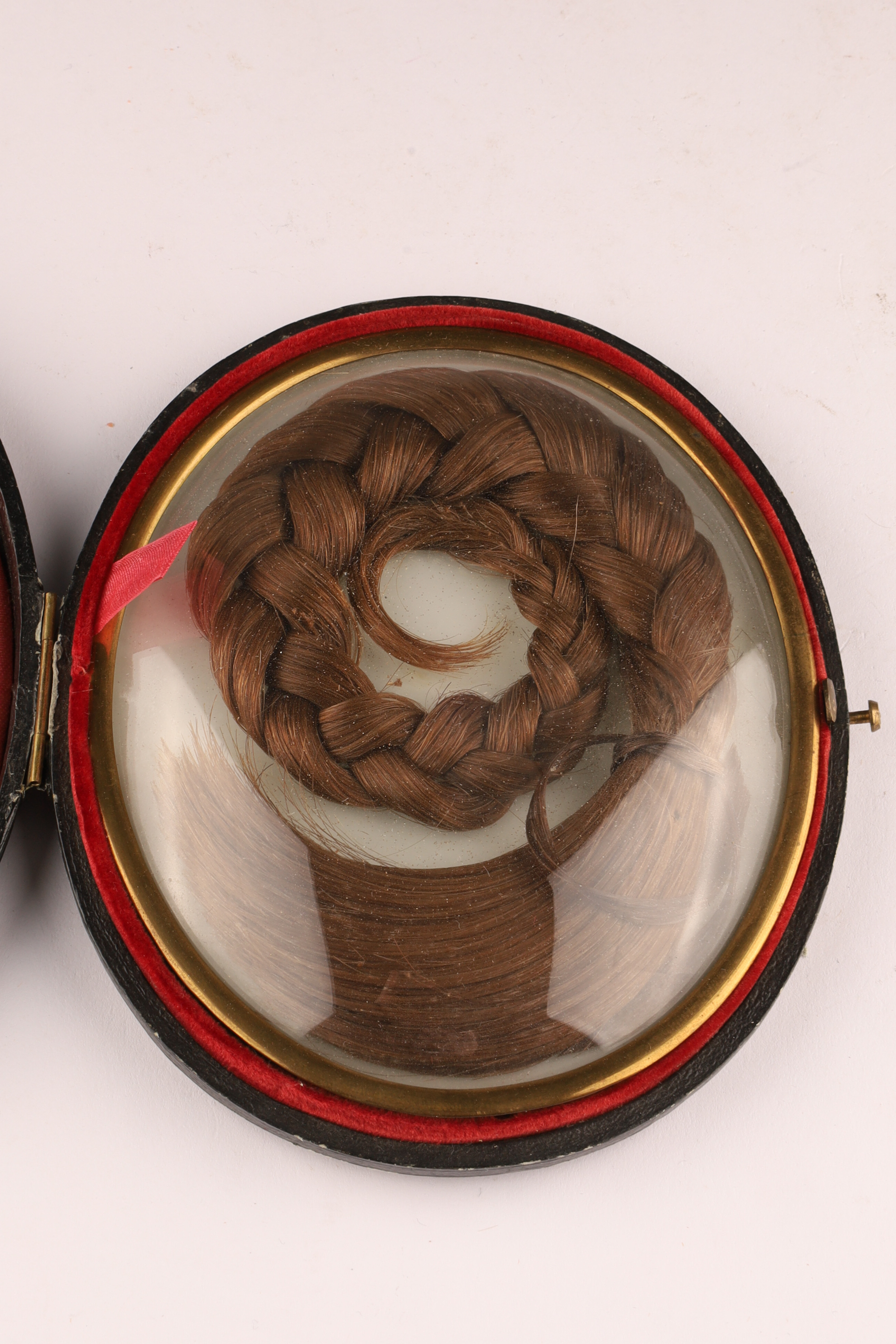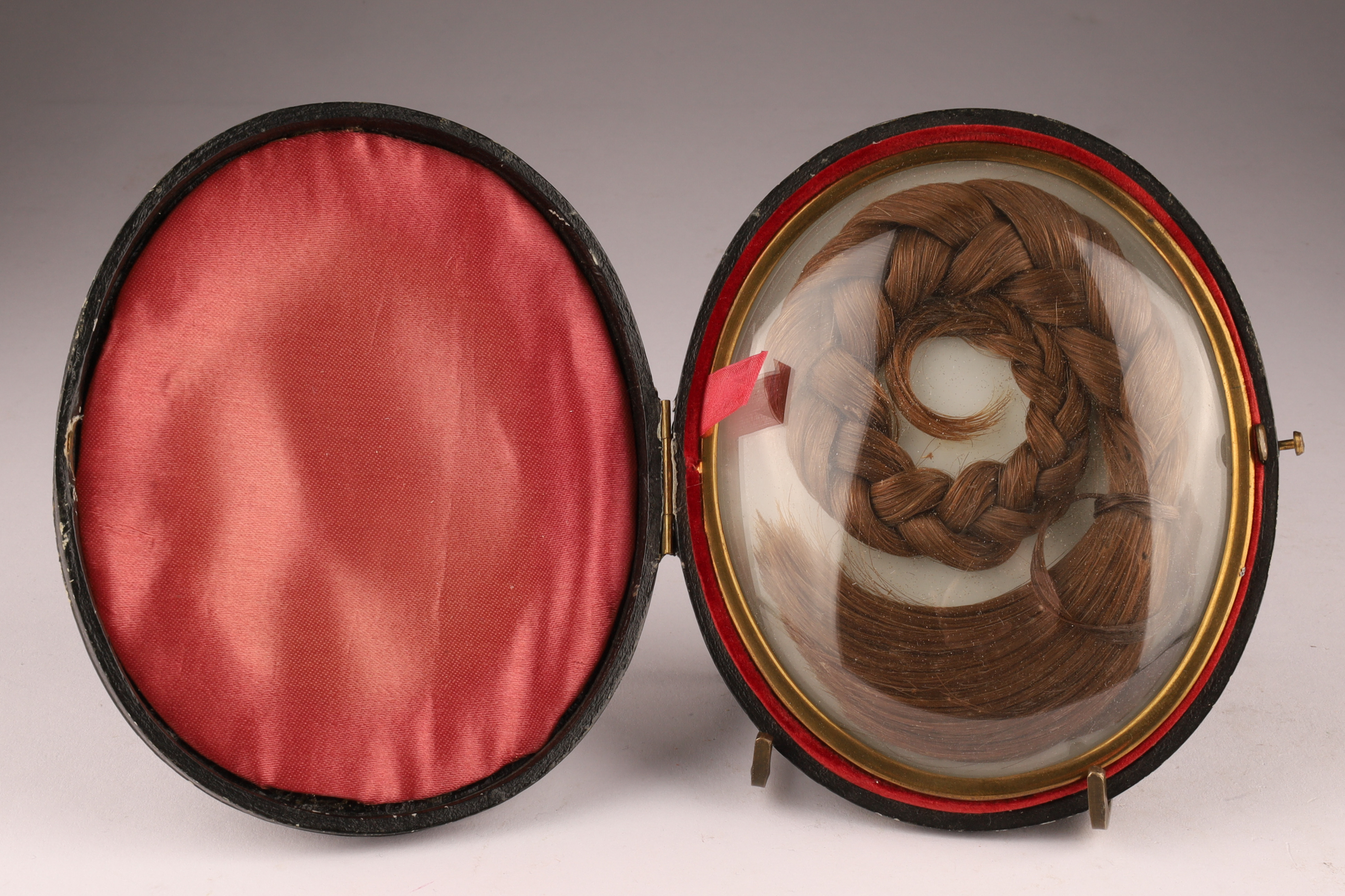 An oval domed-glass keepsake containing a beautifully braided lock of human hair, preserved in its original leather-covered case lined with pink silk.