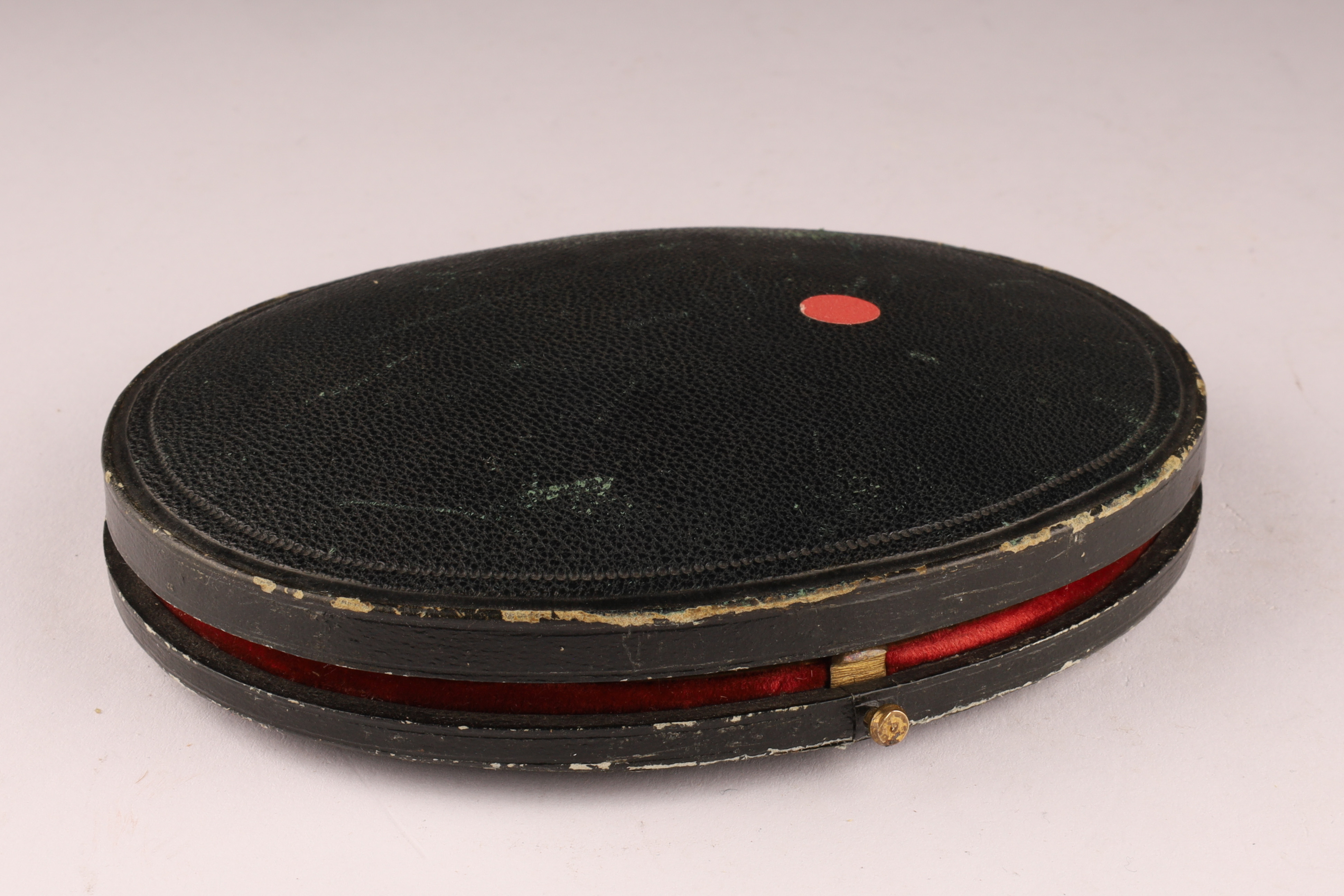 Finely worked Victorian hair memorial, featuring a tight braid coiled into a decorative wreath under convex glass. Housed in the period’s original black leather oval case, fitted with silk interior and maker’s label remnants. Typical of mid-late 19th-century mourning or sentimental mementos. Approx. 5 × 4 inches overall. Case shows expected wear; hairwork remains intact and well preserved.
