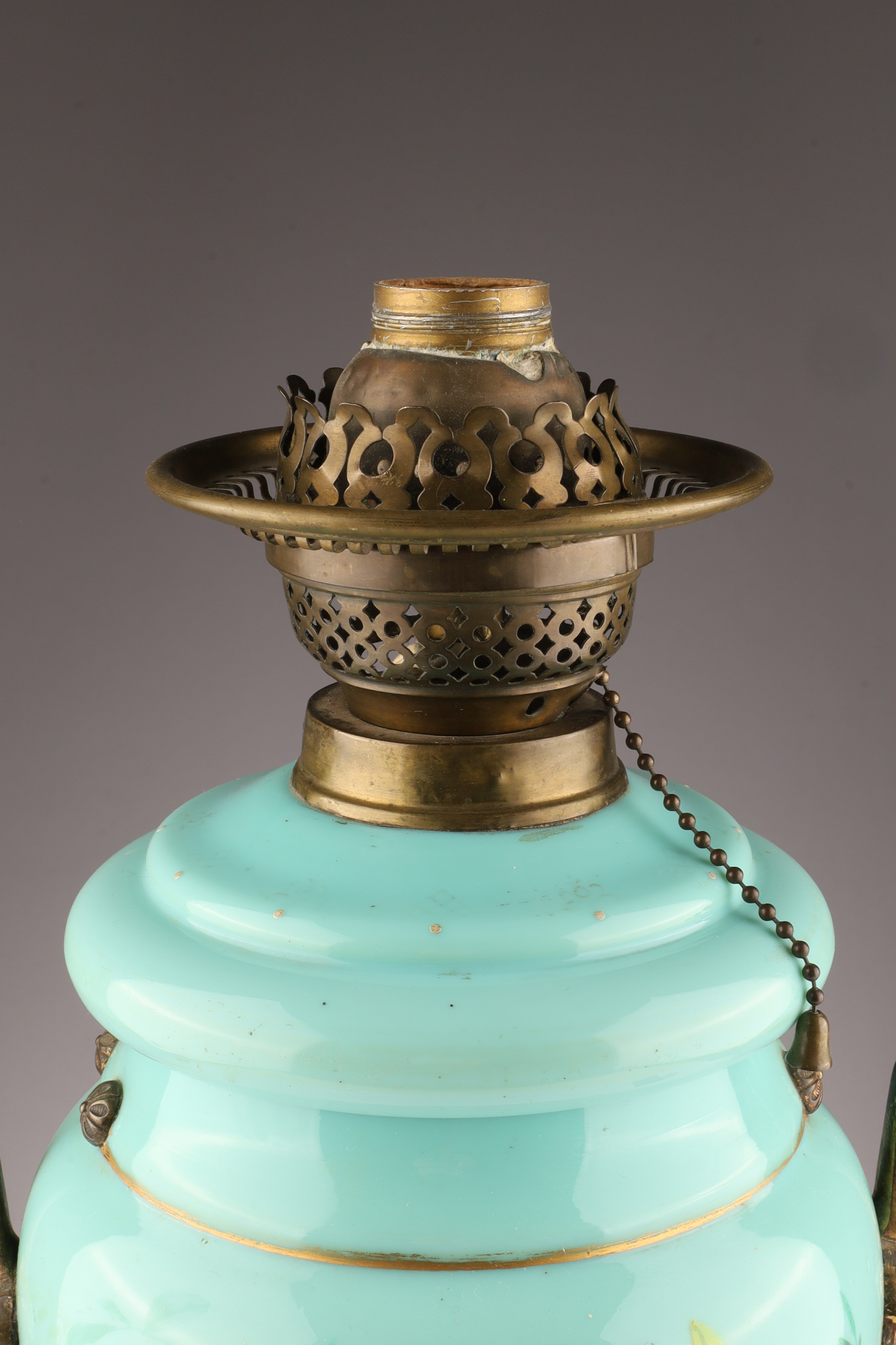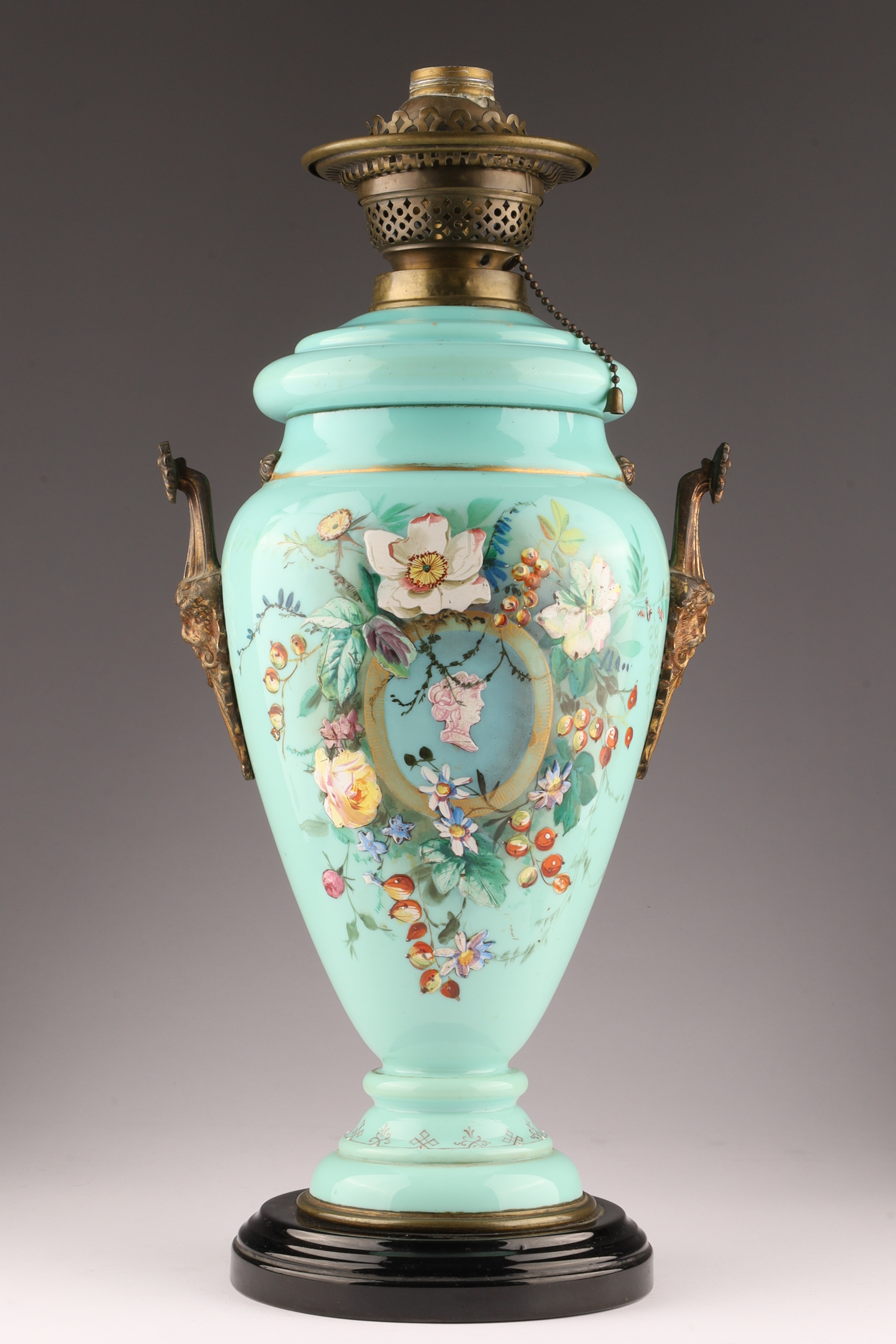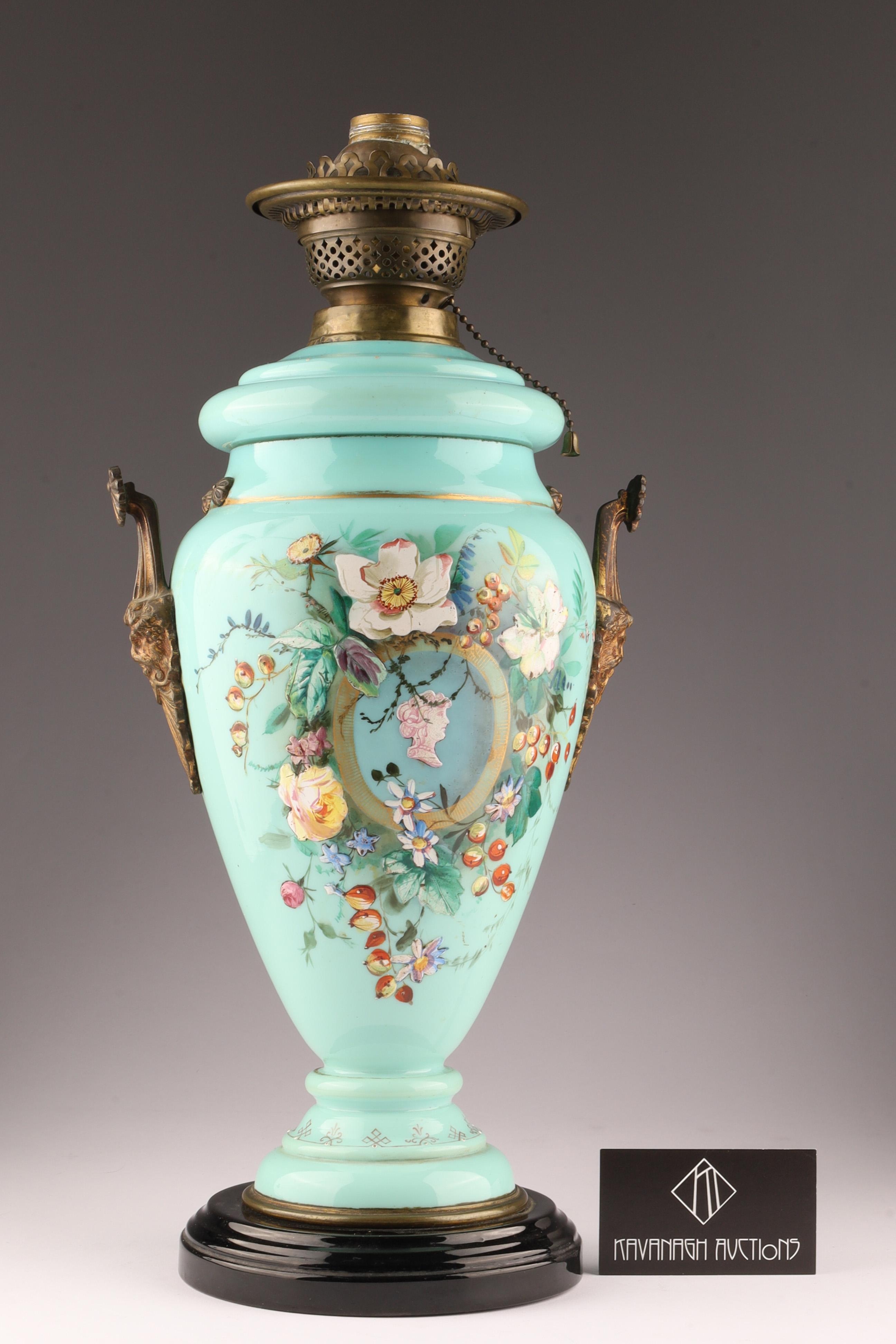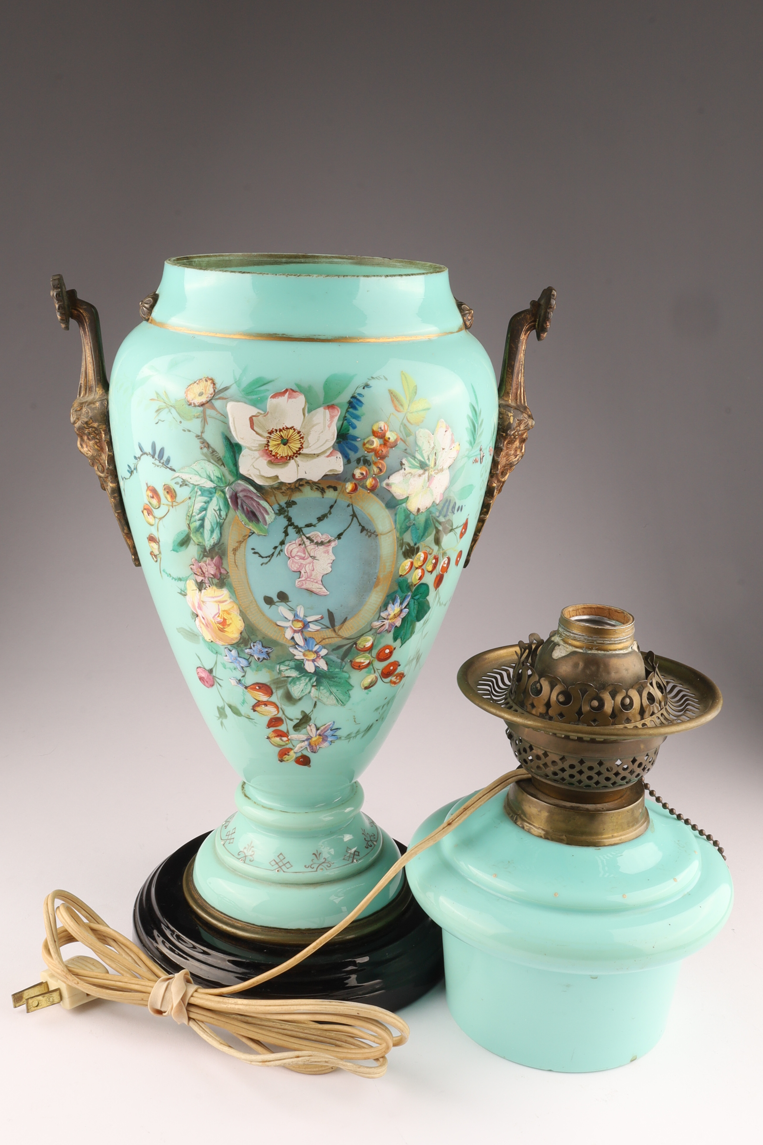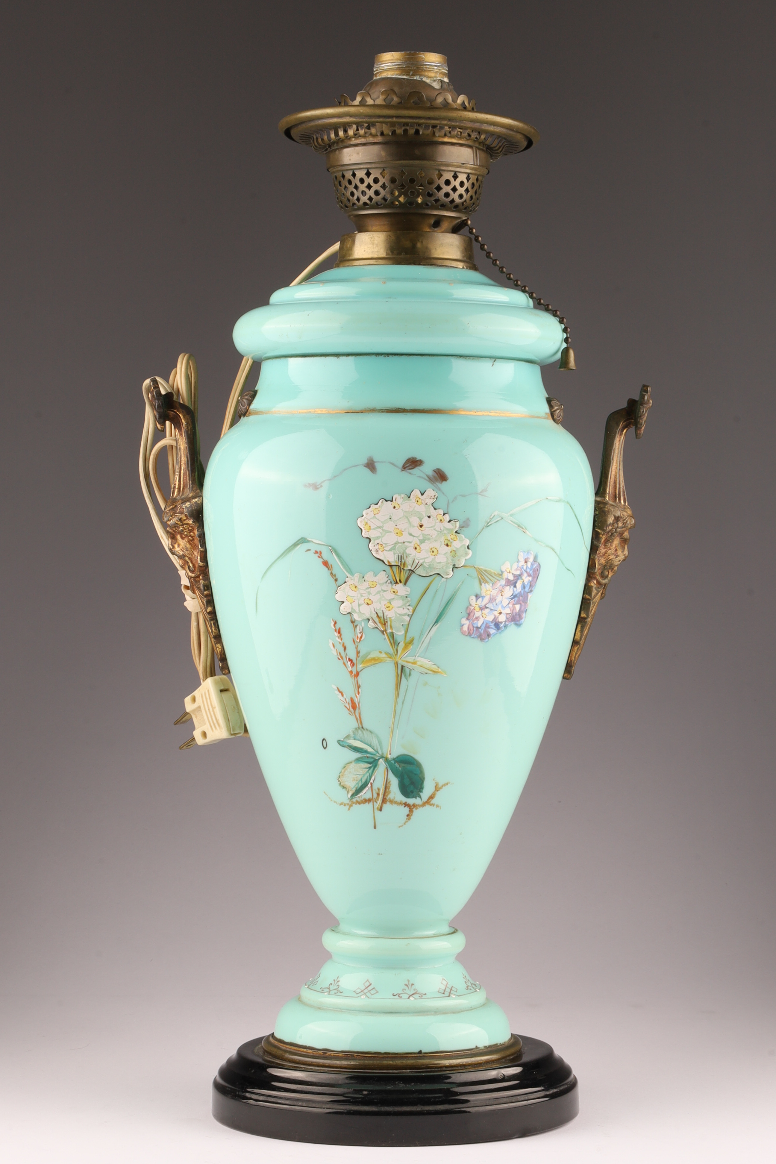 Antique Victorian Glass Oil Lamp Converted to Electricity, hand painted floral decoration with gilt brass fittings, measuring 18.5 inches H x 8.5 W.