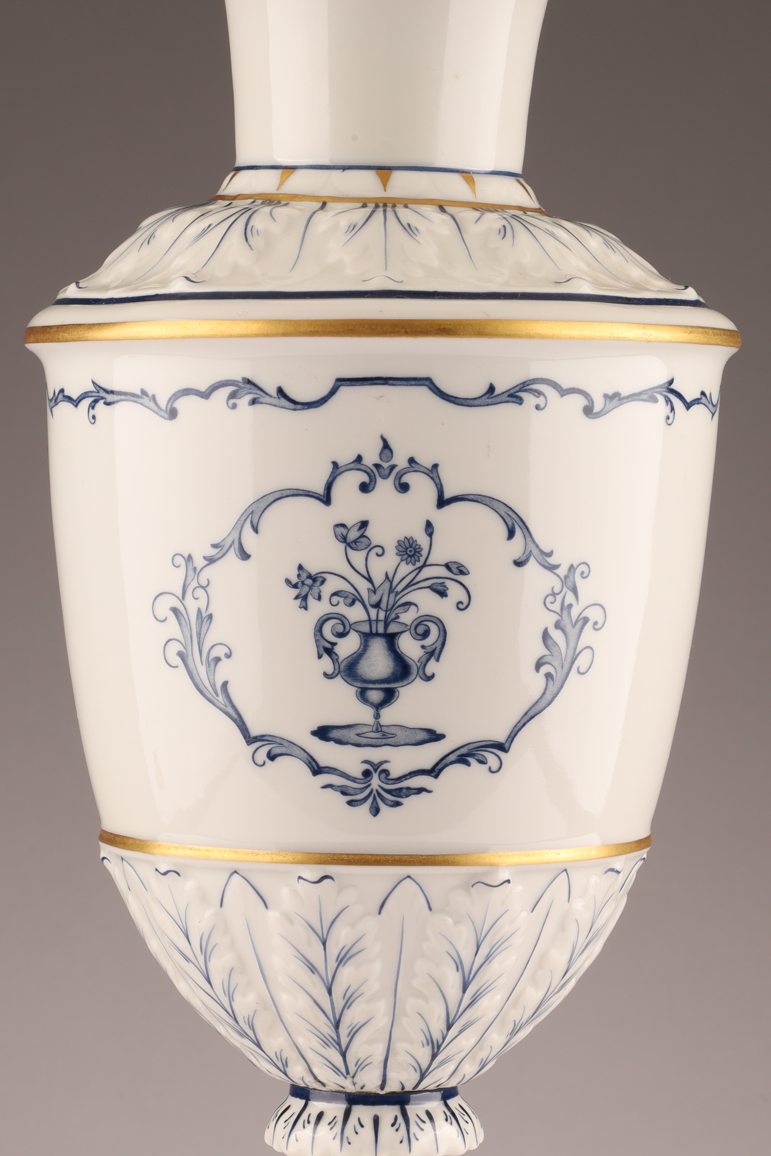Richard Ginori Italy Porcelain Lamp Blue and White Decoration with gilt highlights. 15 inches H, 28 inches H with harp.