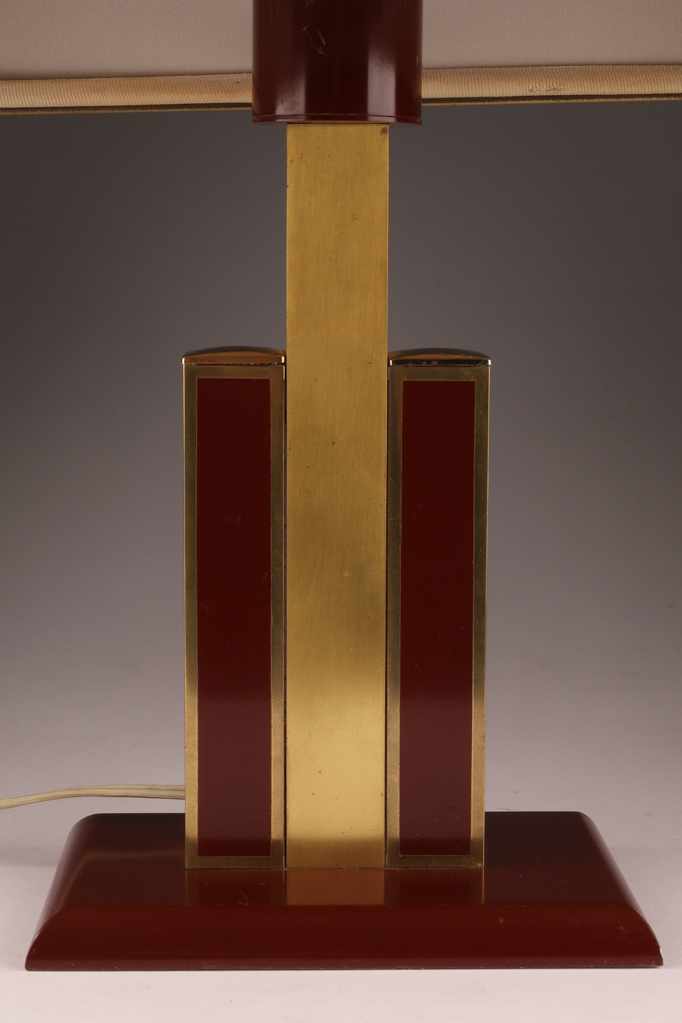 1960s Mid Century Romeo Rega Red Lacquered Brass Italian Table Lamp. Base measures 12 inches H x 7 W x 4.5 deep, shade measures 16.5 inches L x 11 H x 10 W.