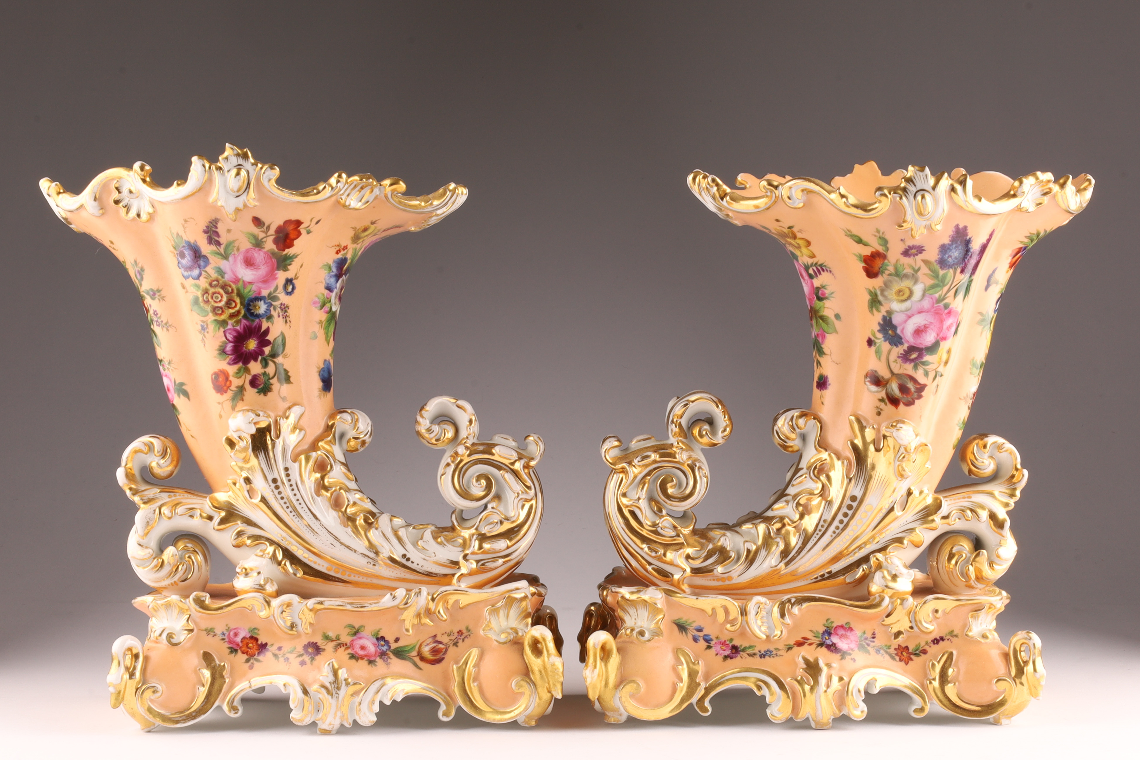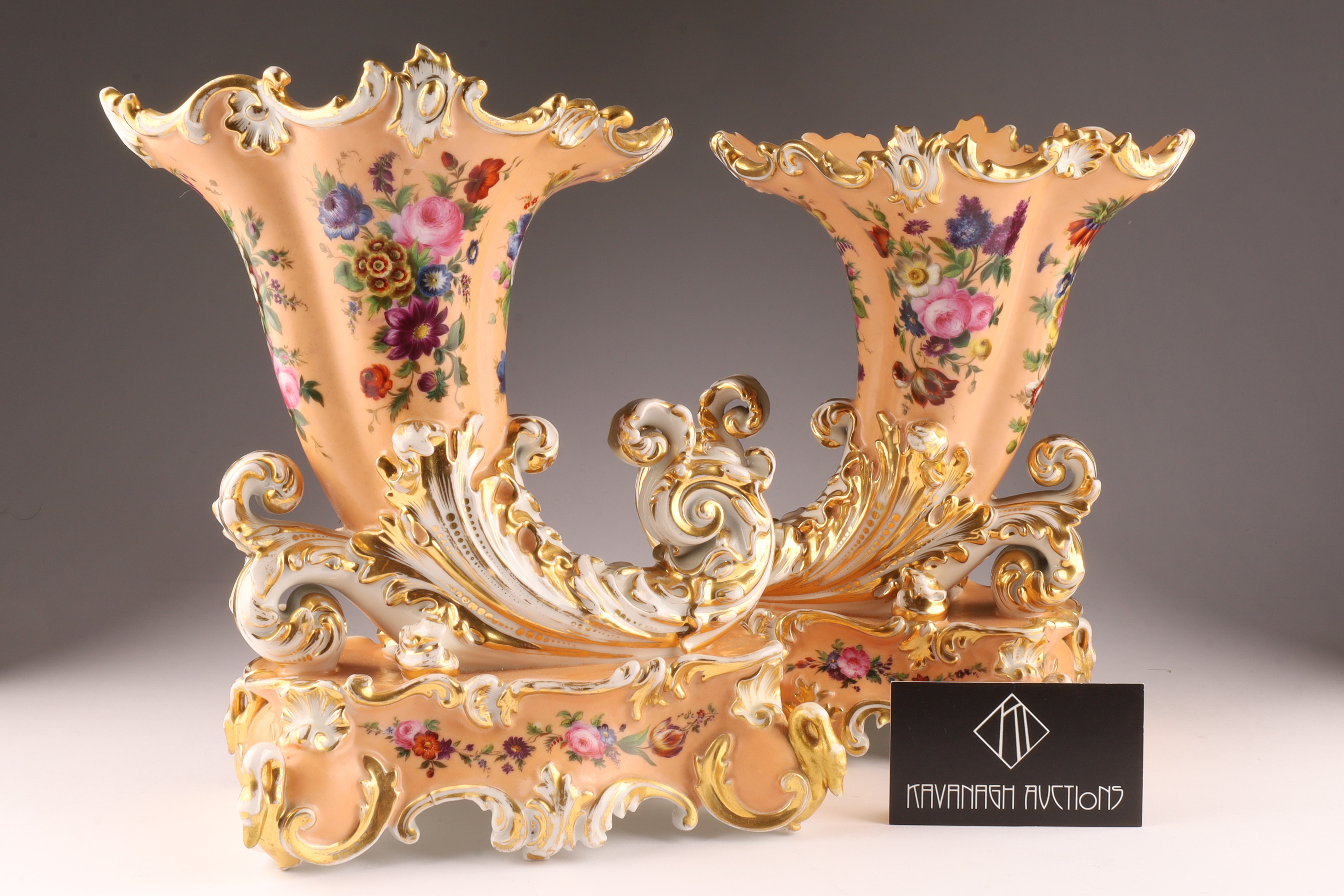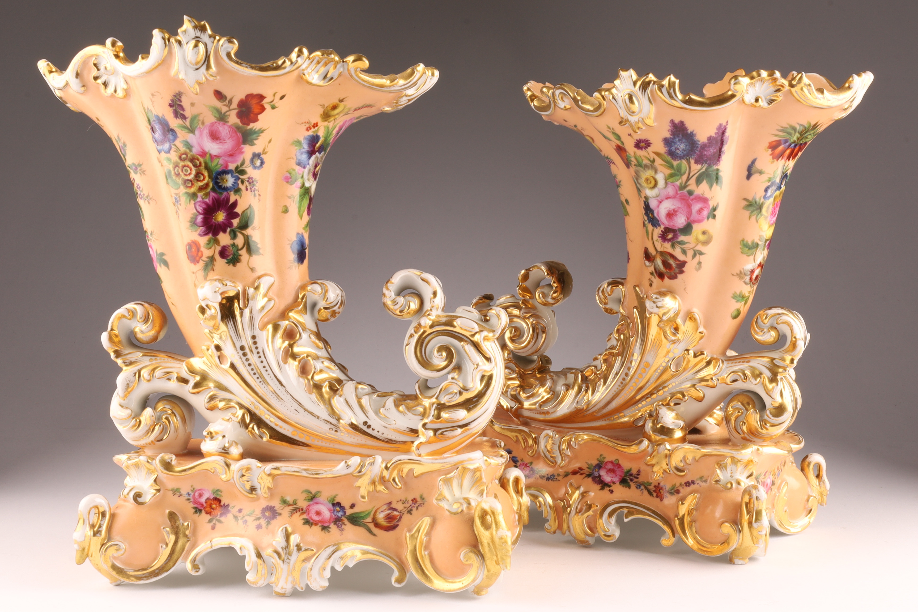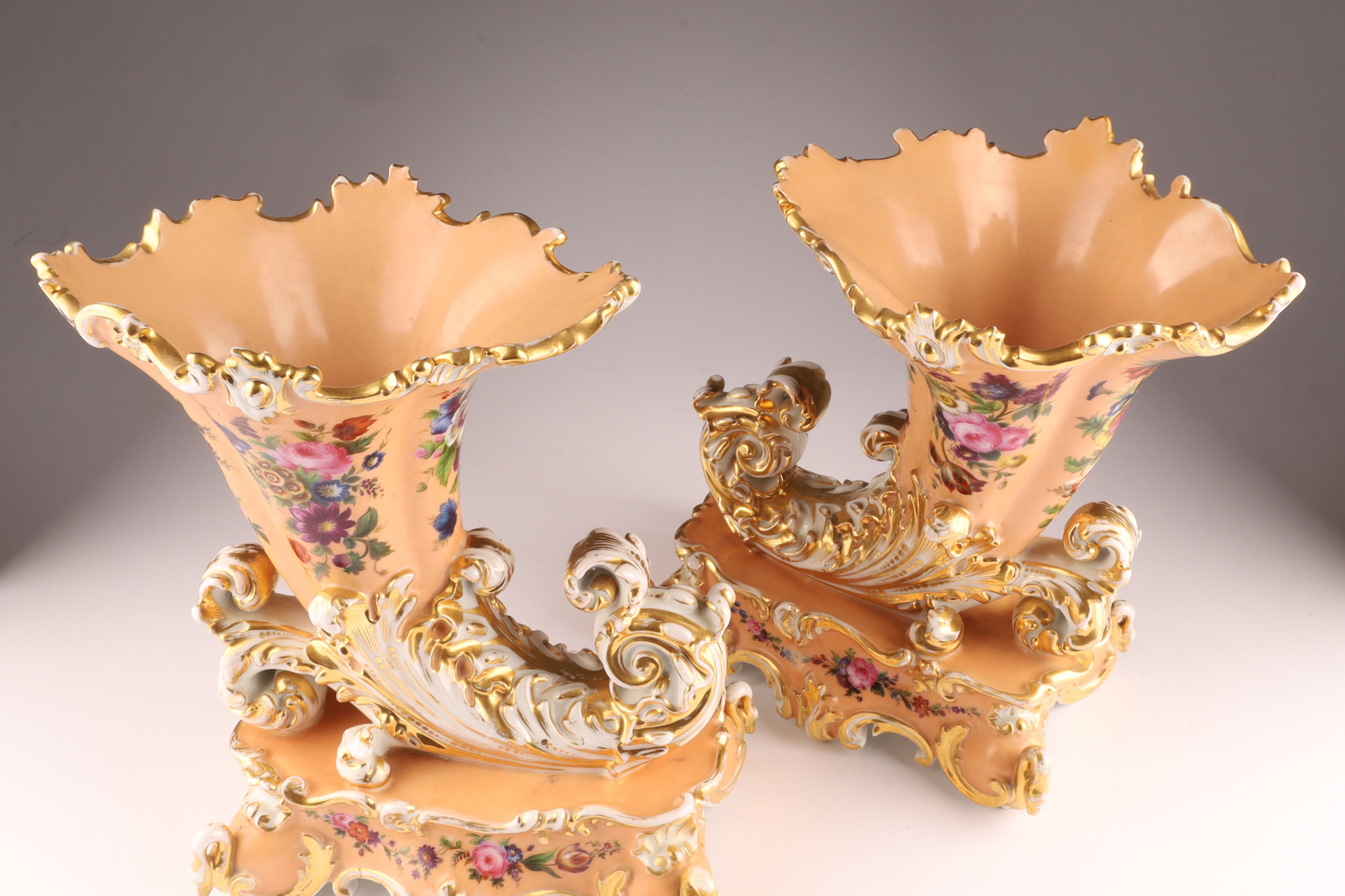 Pair Antique French Jacob Petit Porcelain Cornucopia Rhyton Vases, peach ground with floral decoration and gilt embellishments. Measuring 10 inches W x 9 H x 5 deep. Marked on underside. Some loss to gilding.