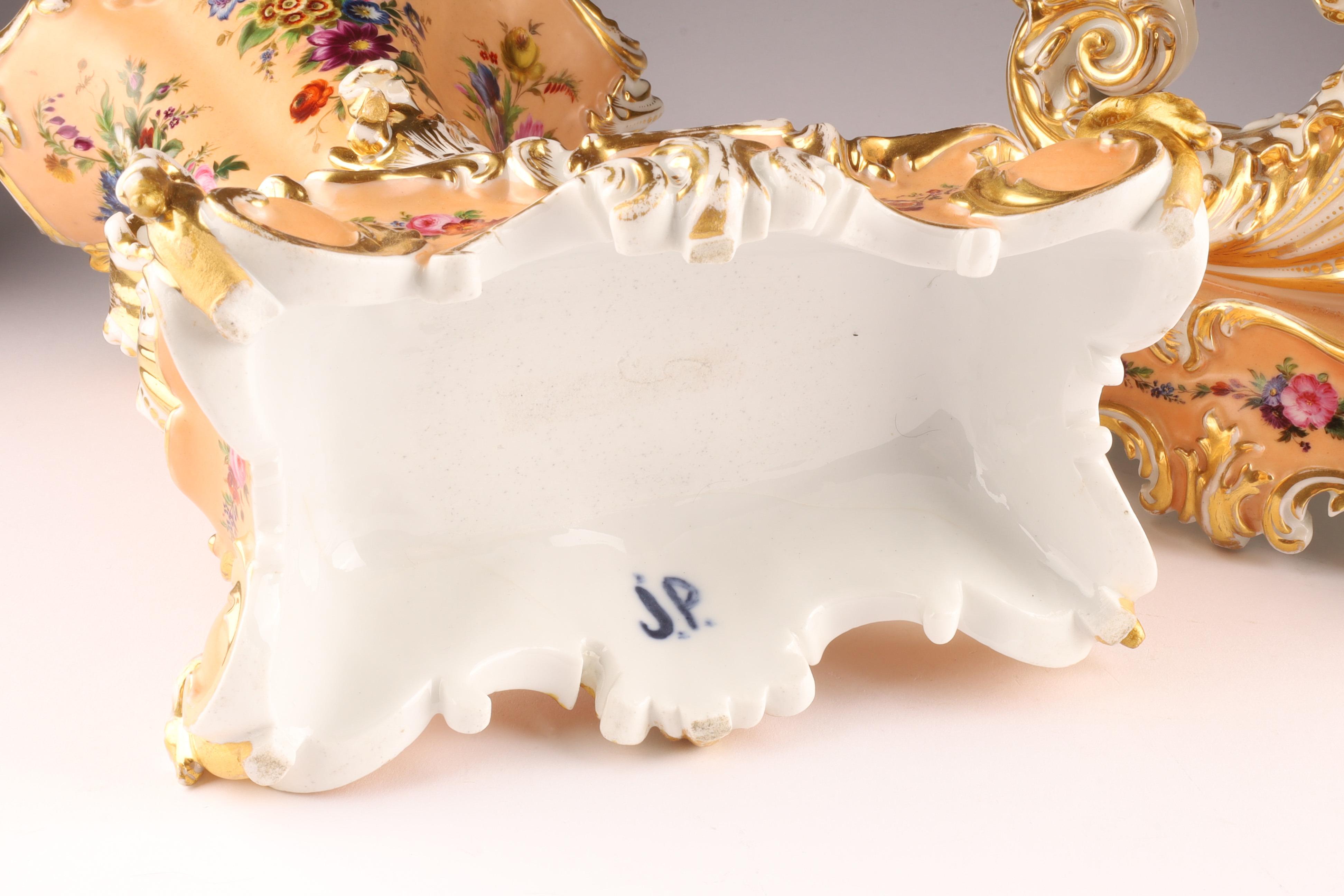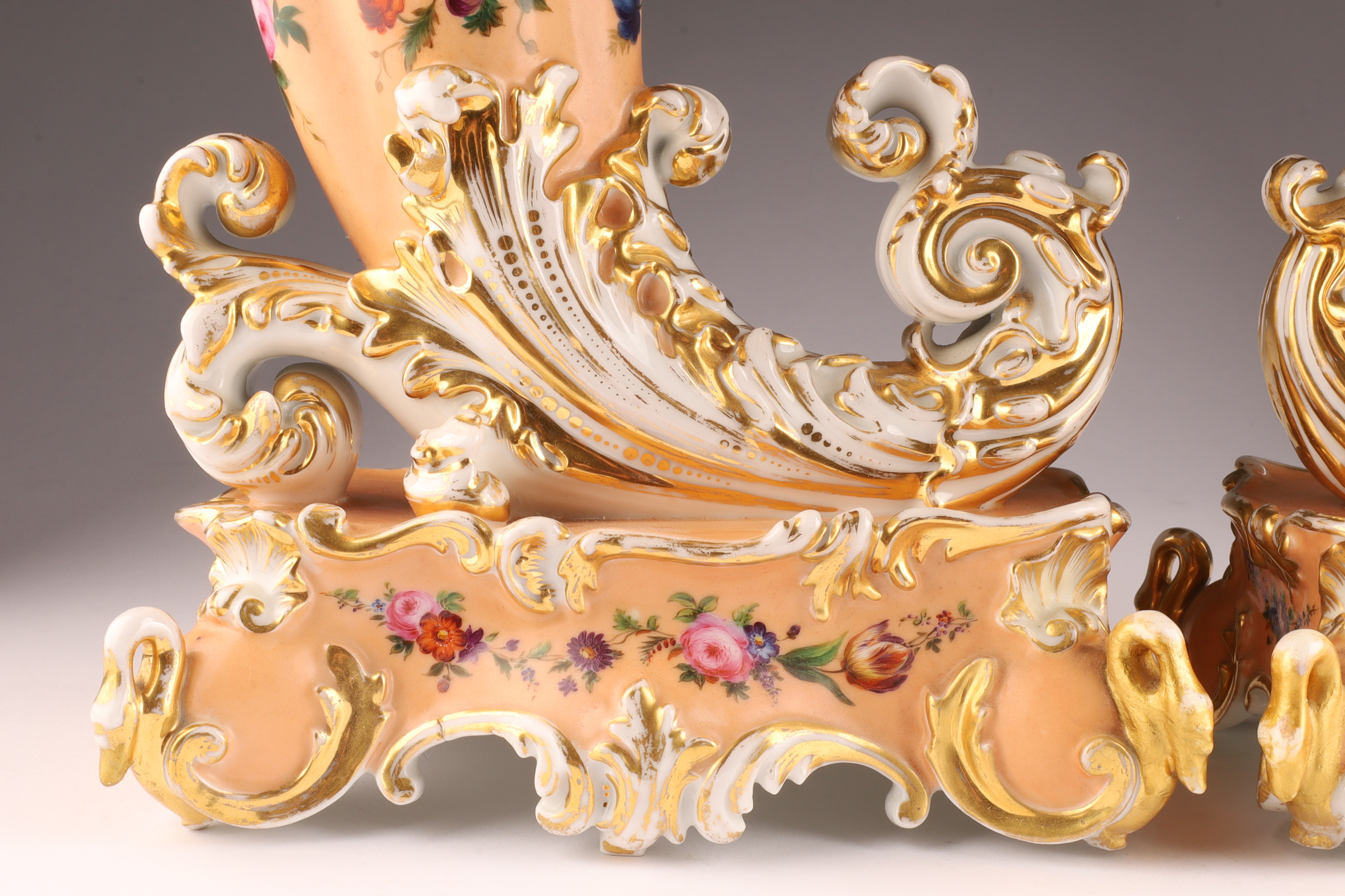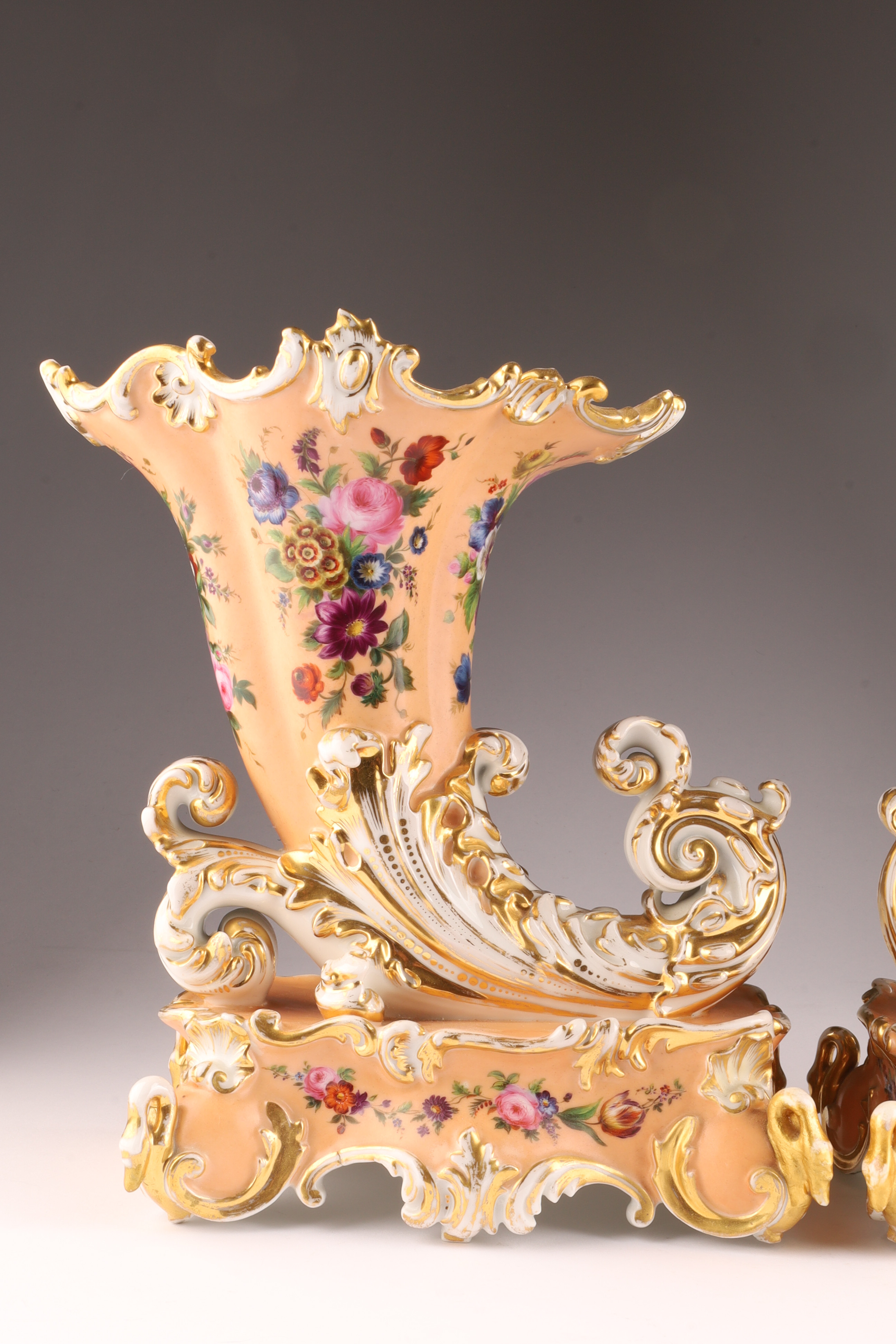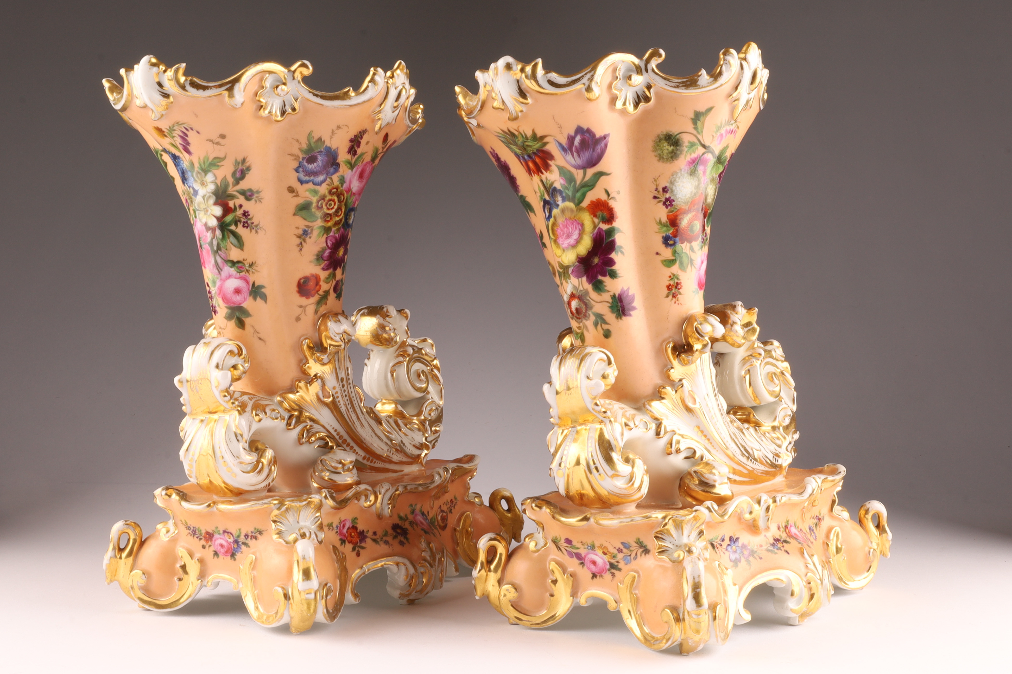 Pair Antique French Jacob Petit Porcelain Cornucopia Rhyton Vases, peach ground with floral decoration and gilt embellishments. Measuring 10 inches W x 9 H x 5 deep. Marked on underside. Some loss to gilding.