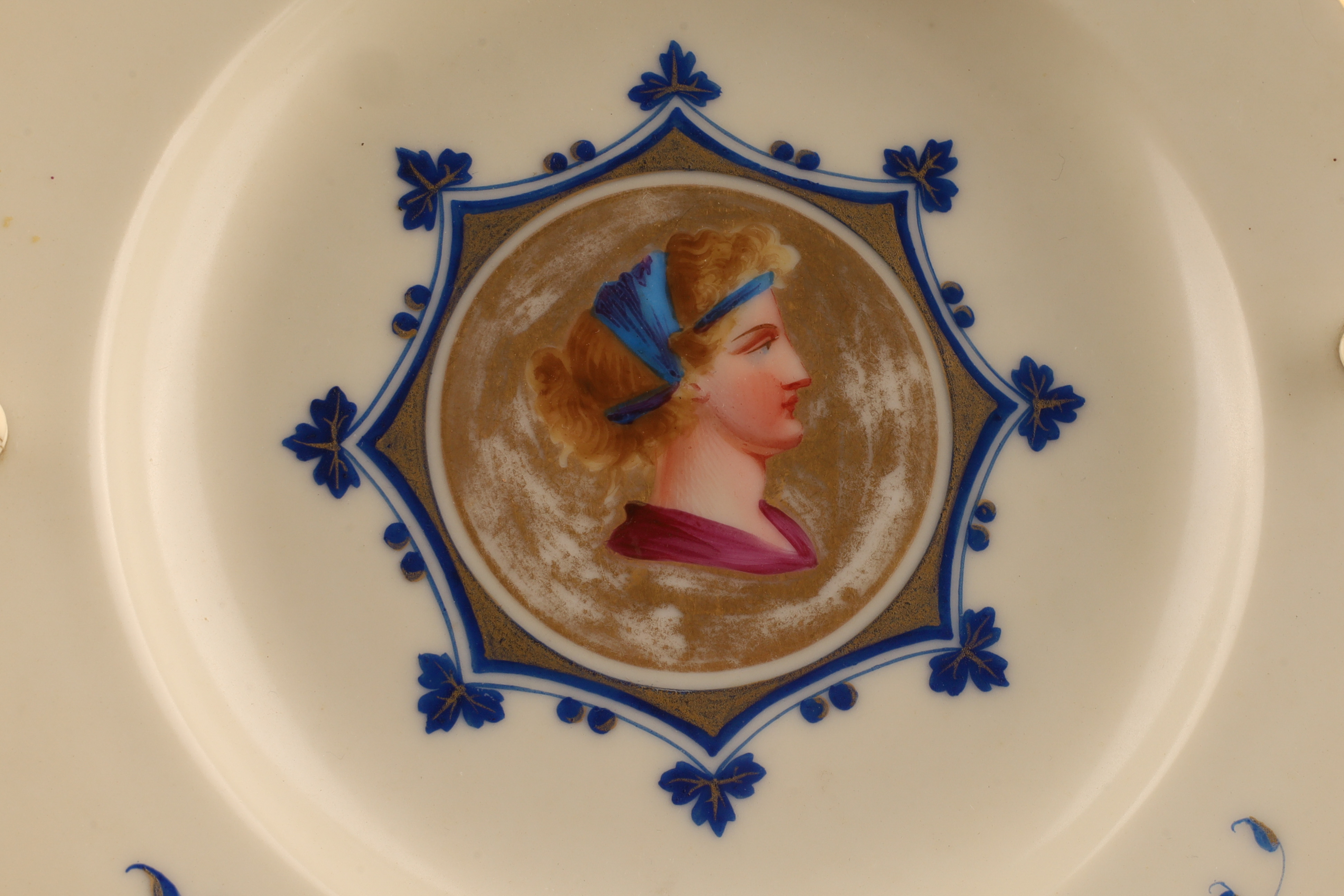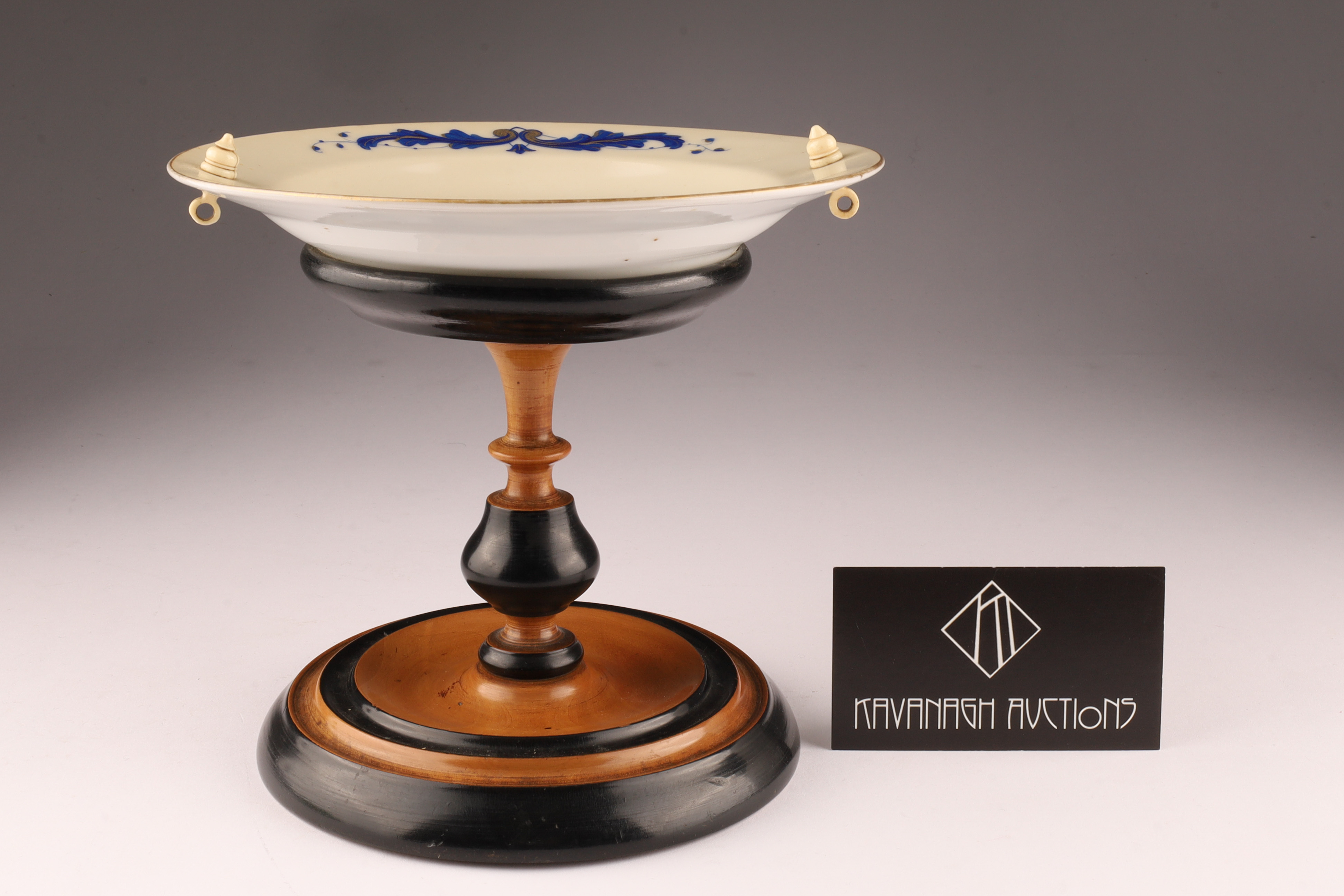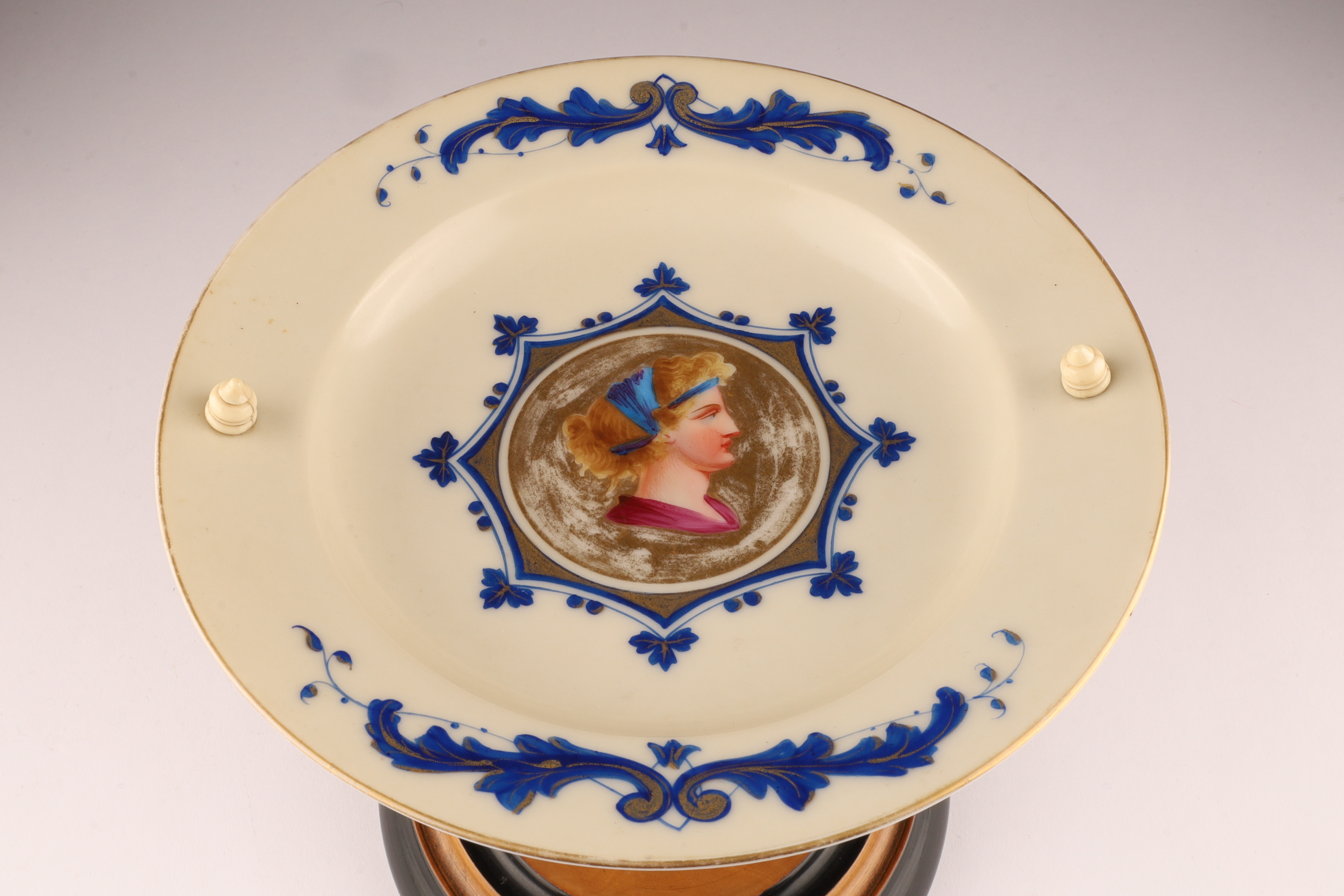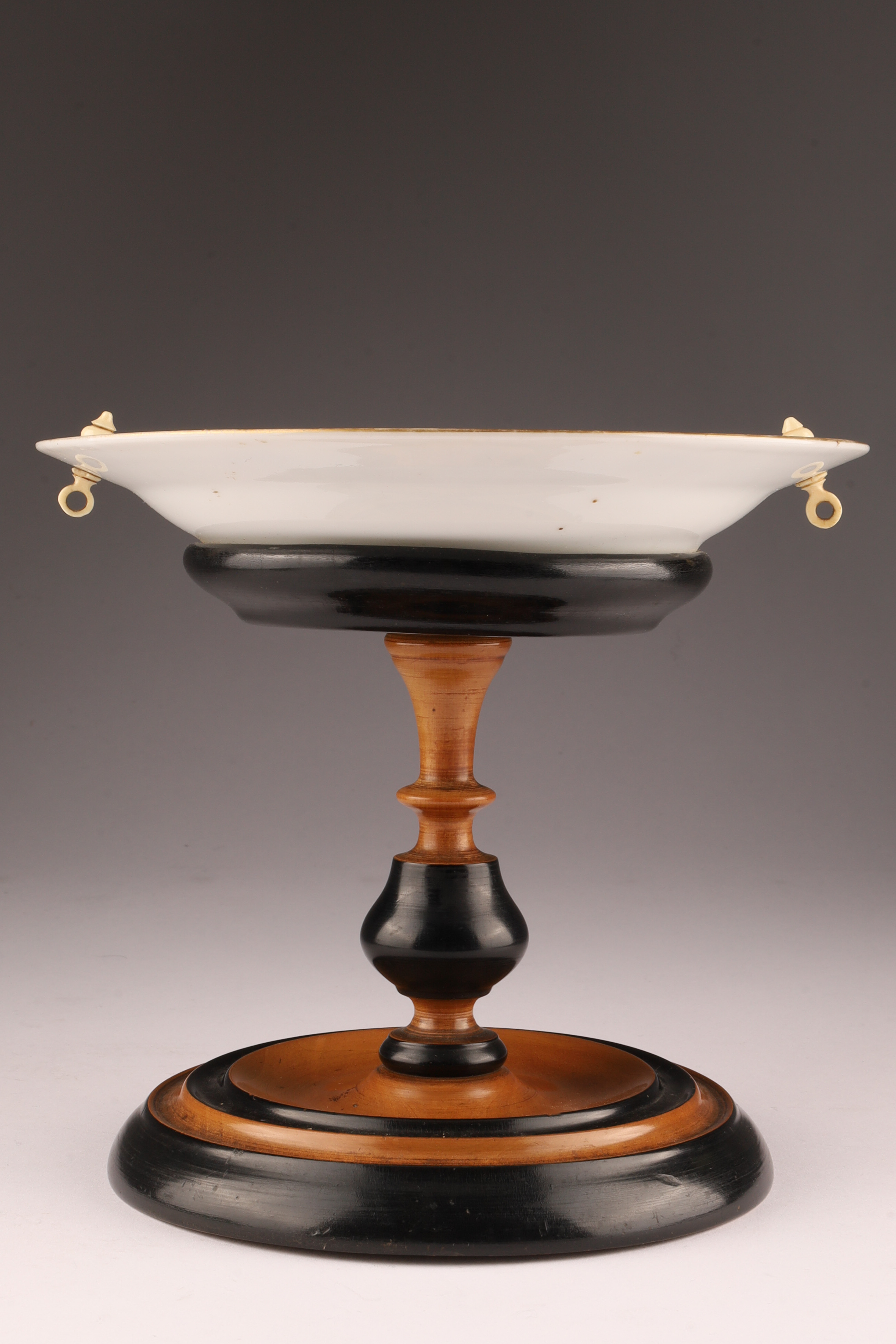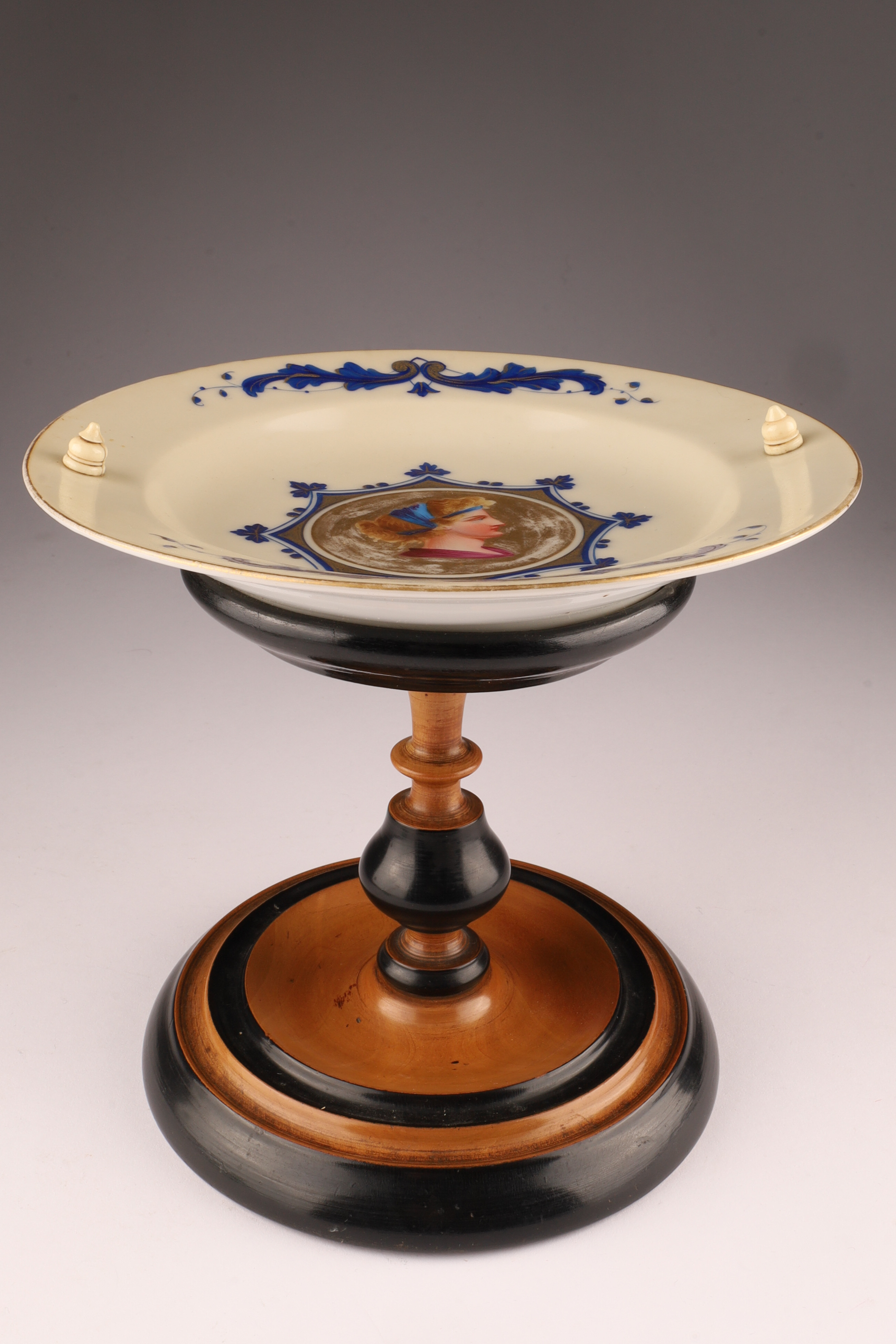 Antique Porcelain Portrait Compote on Turned Wood Base, Biedermeier Style