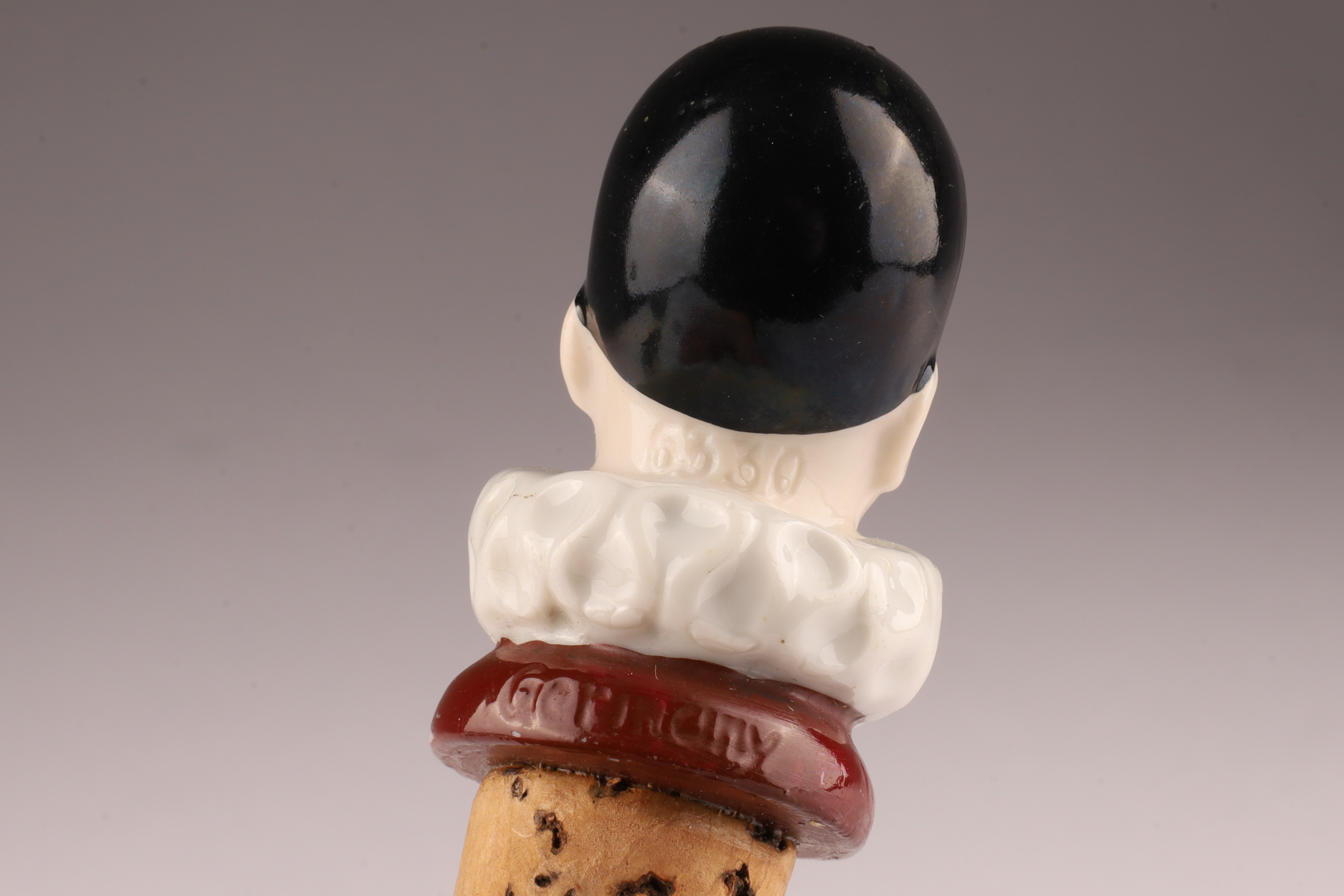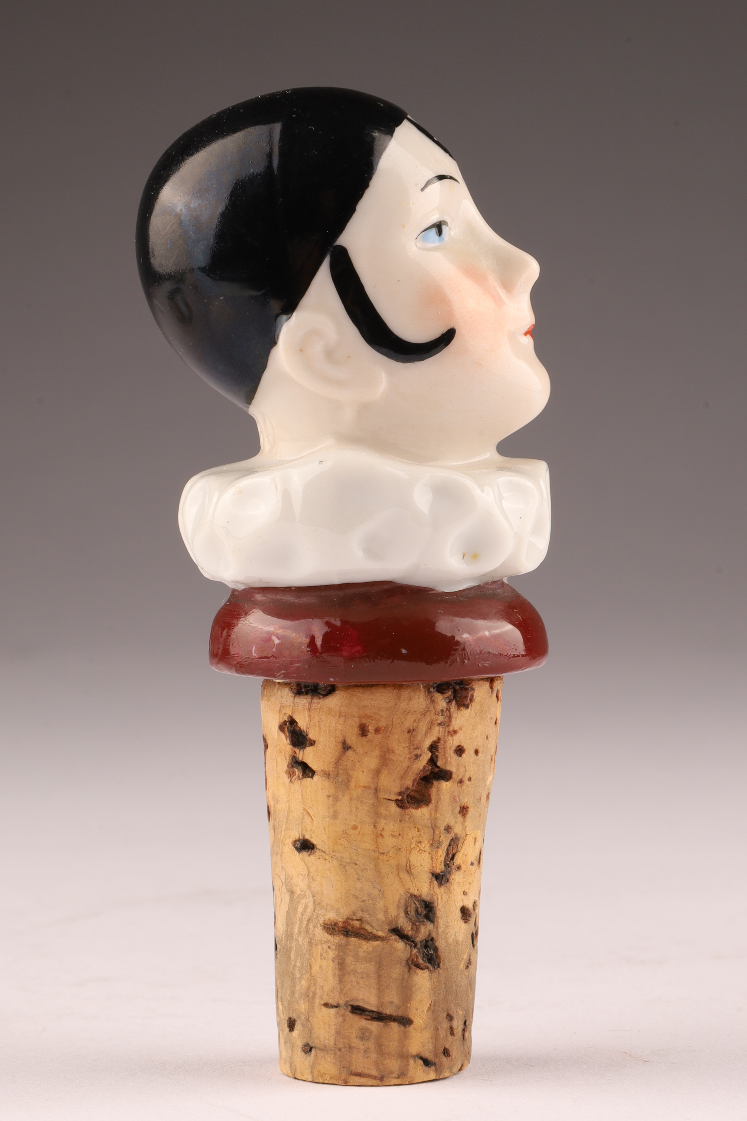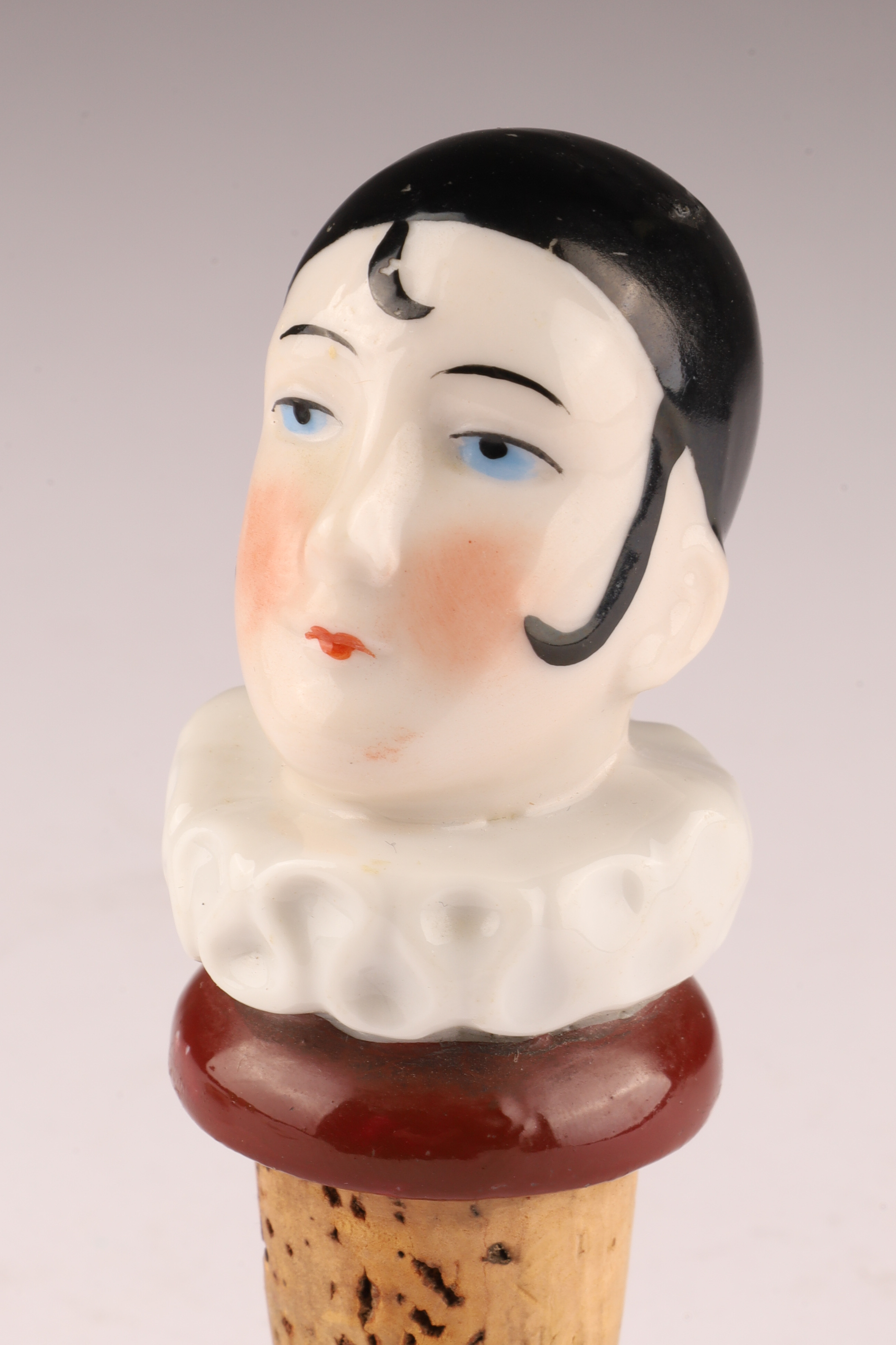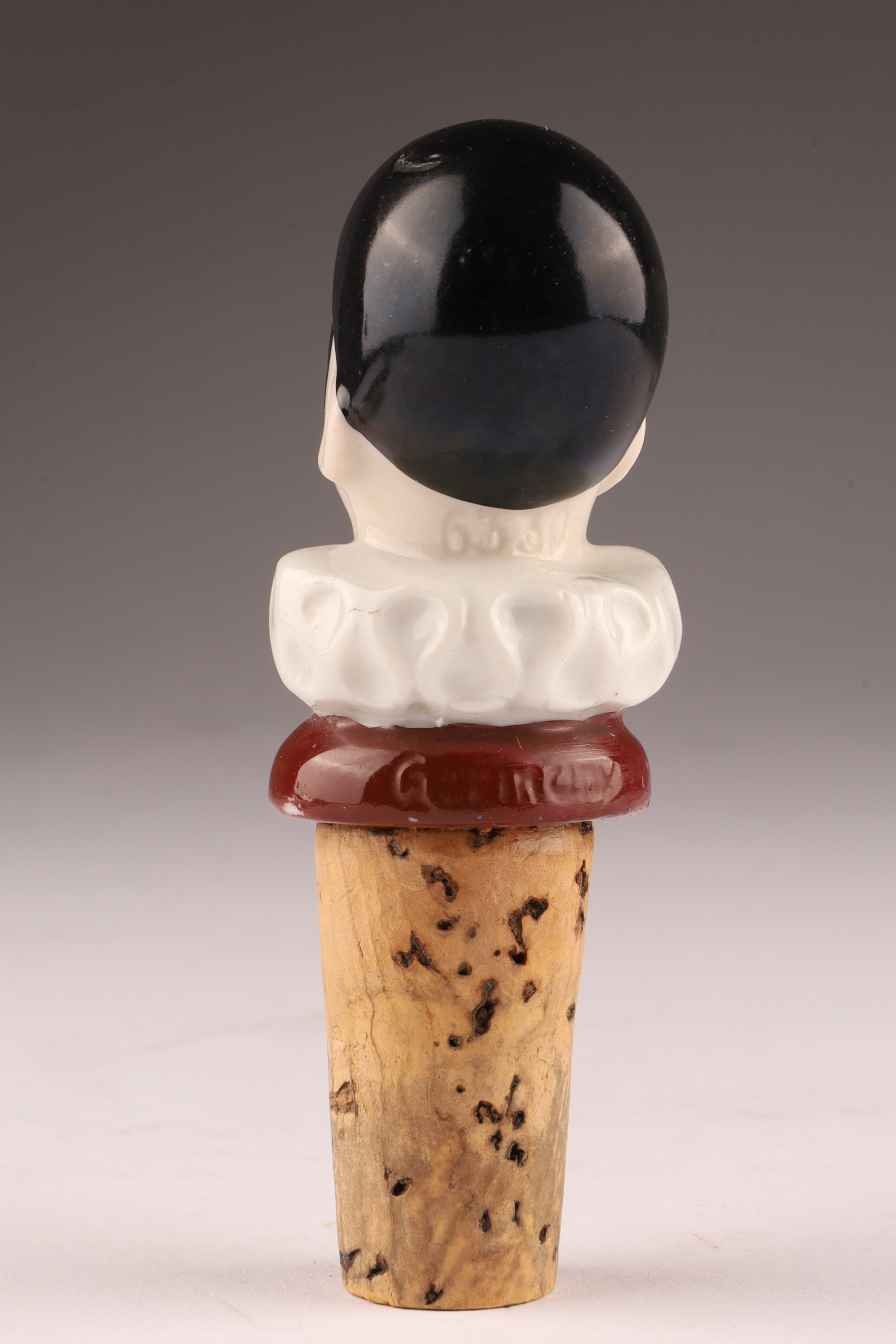 Porcelain Germany Pierrot Flapper Girl Cork Stopper, measuring 2 inches.