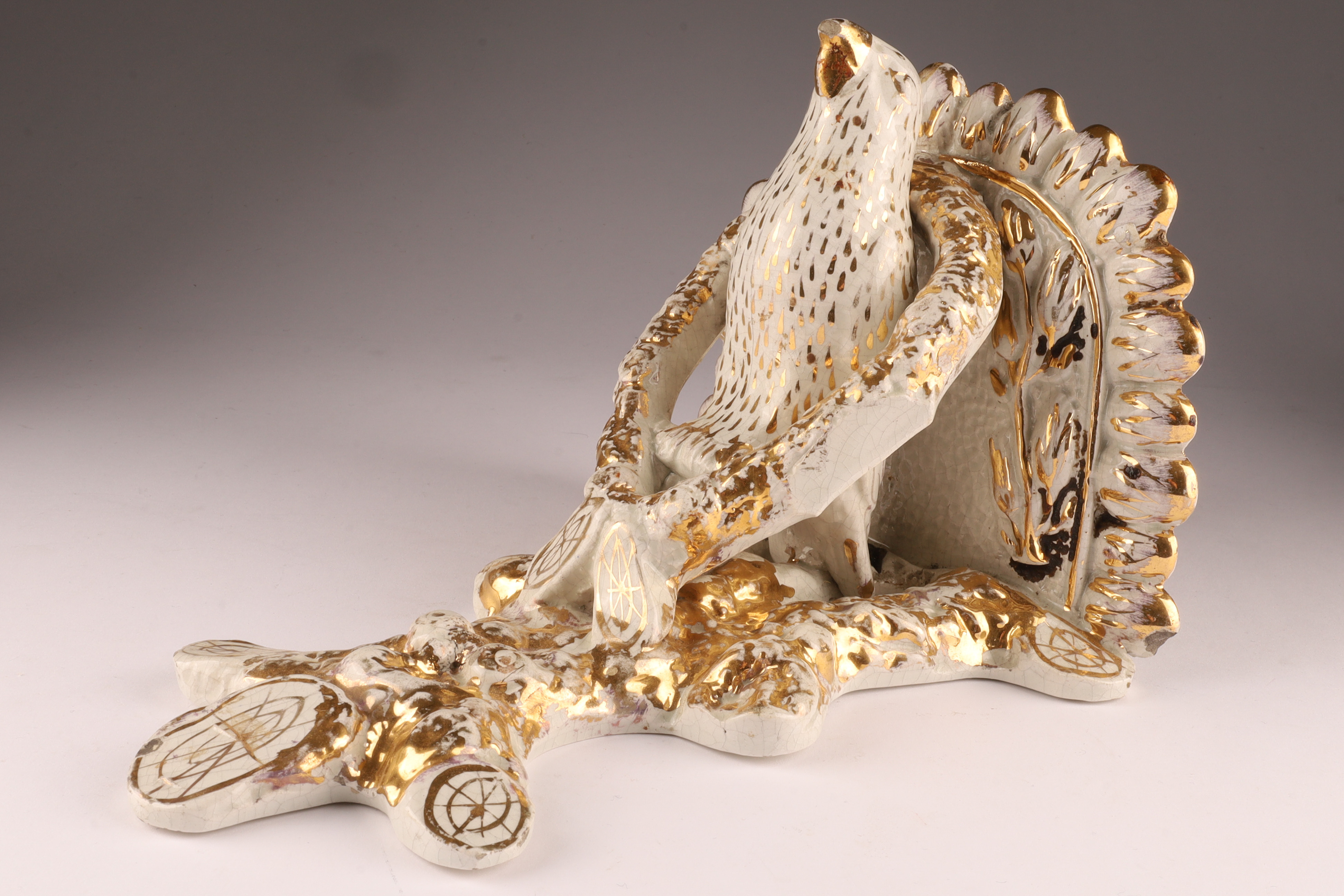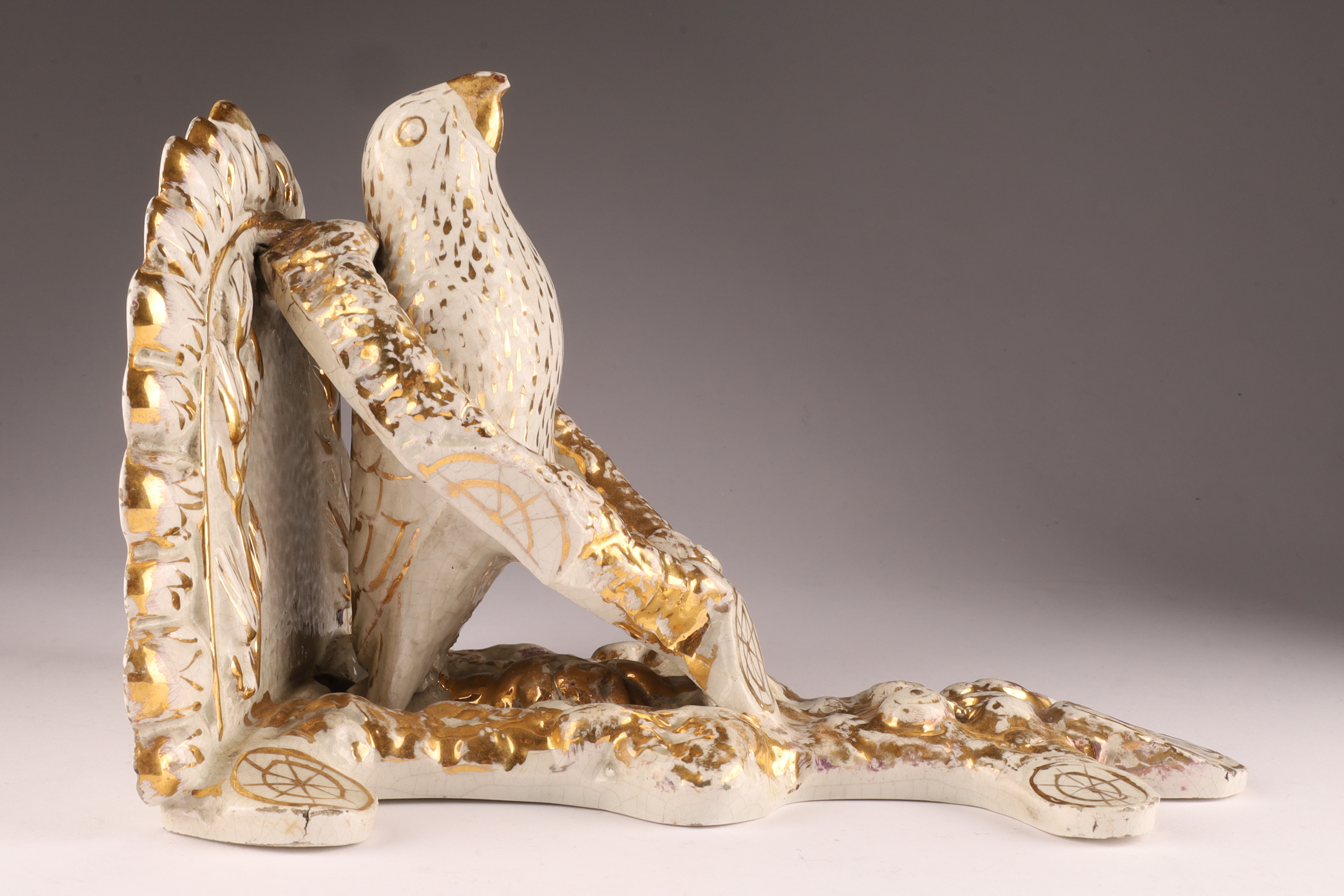 Chips to beak, some loss to gold. 10 inches H x 8 W x 7 deep.