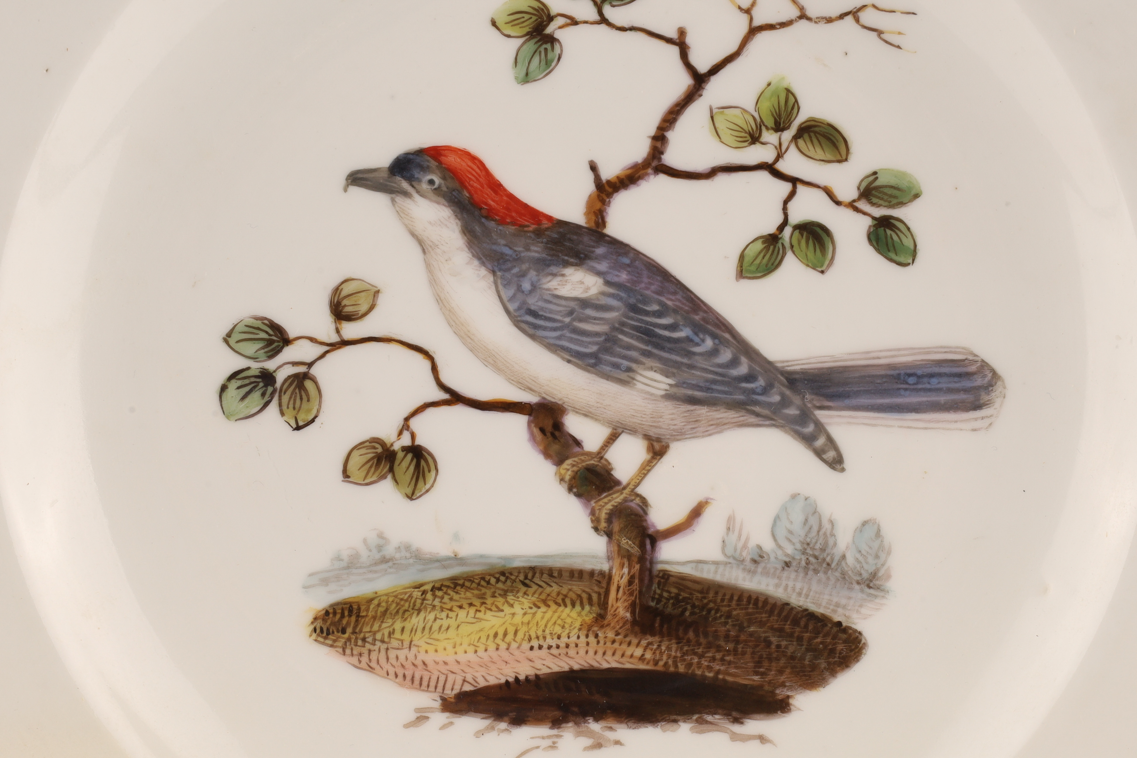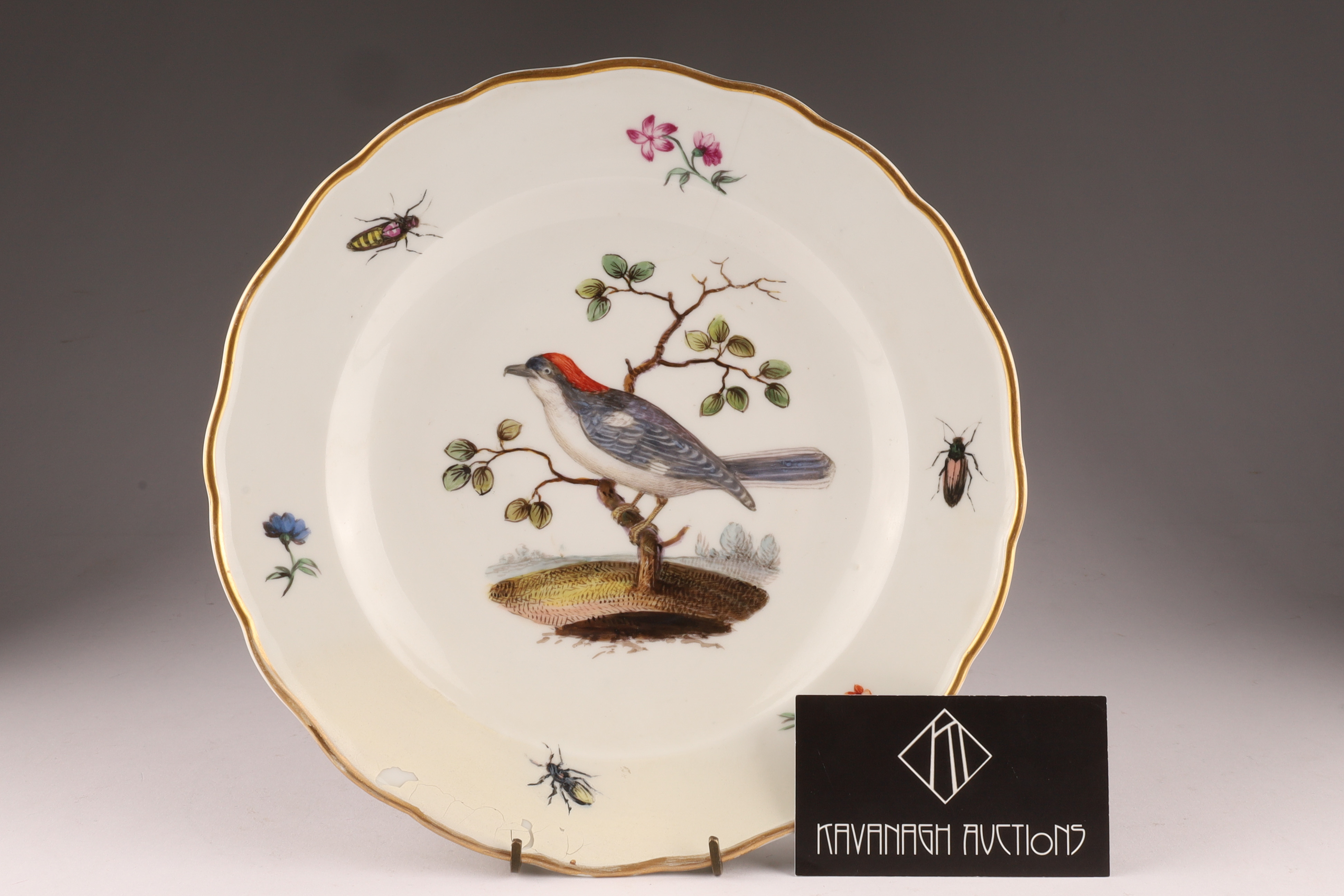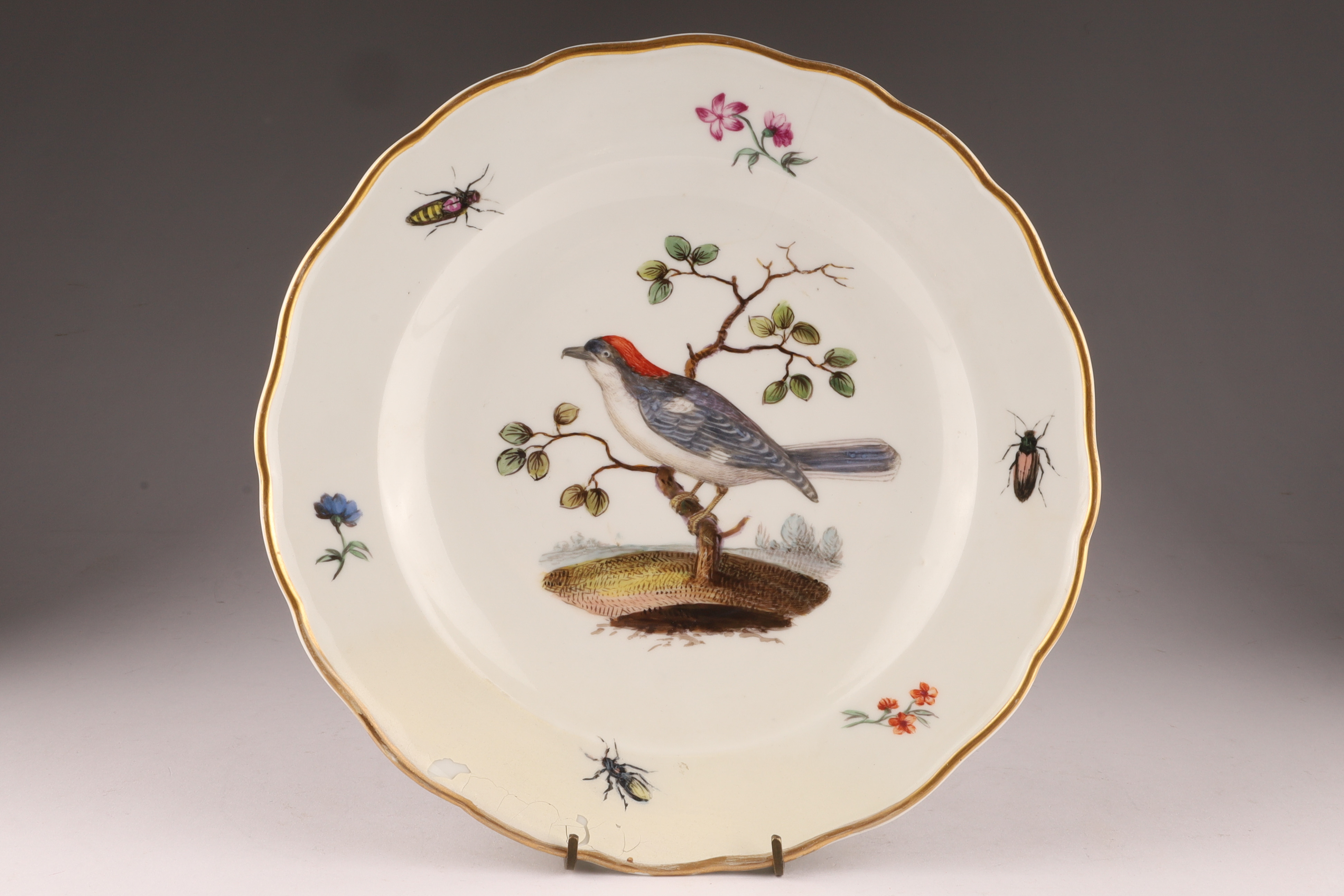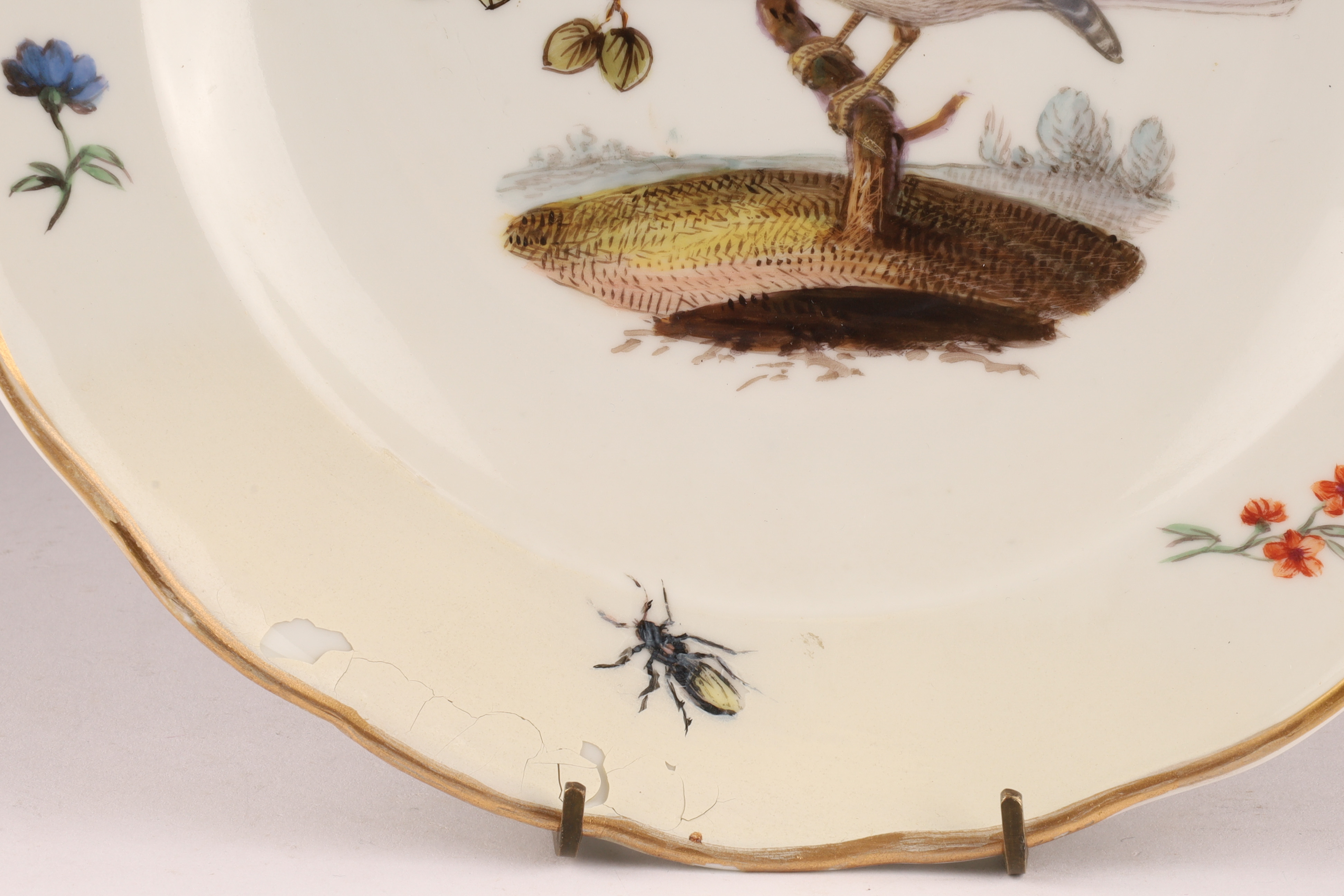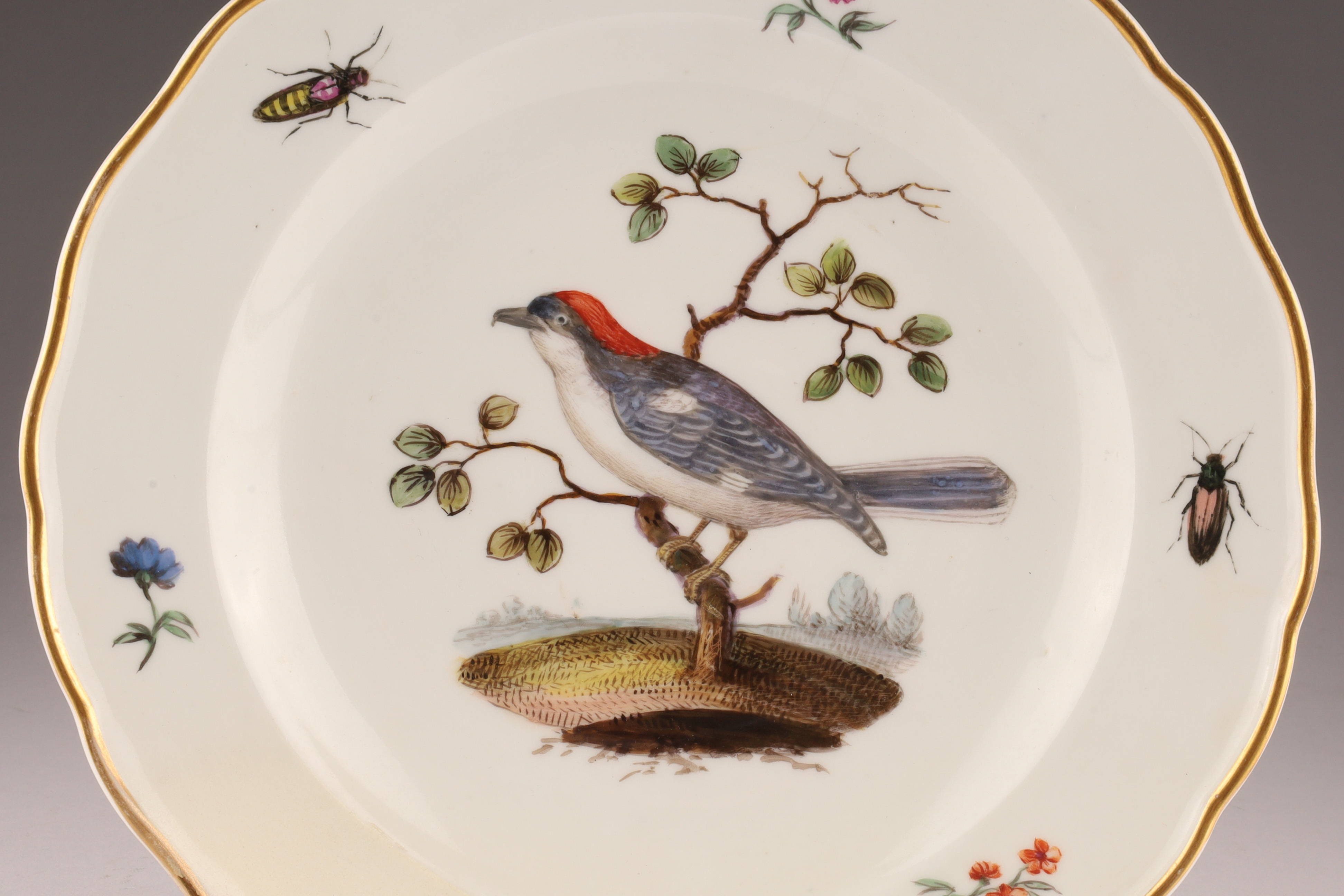 A hand-painted German Meissen porcelain plate decorated with a naturalistic bird and scattered insects. The underside bears crossed-swords-type marks and impressed numerals.