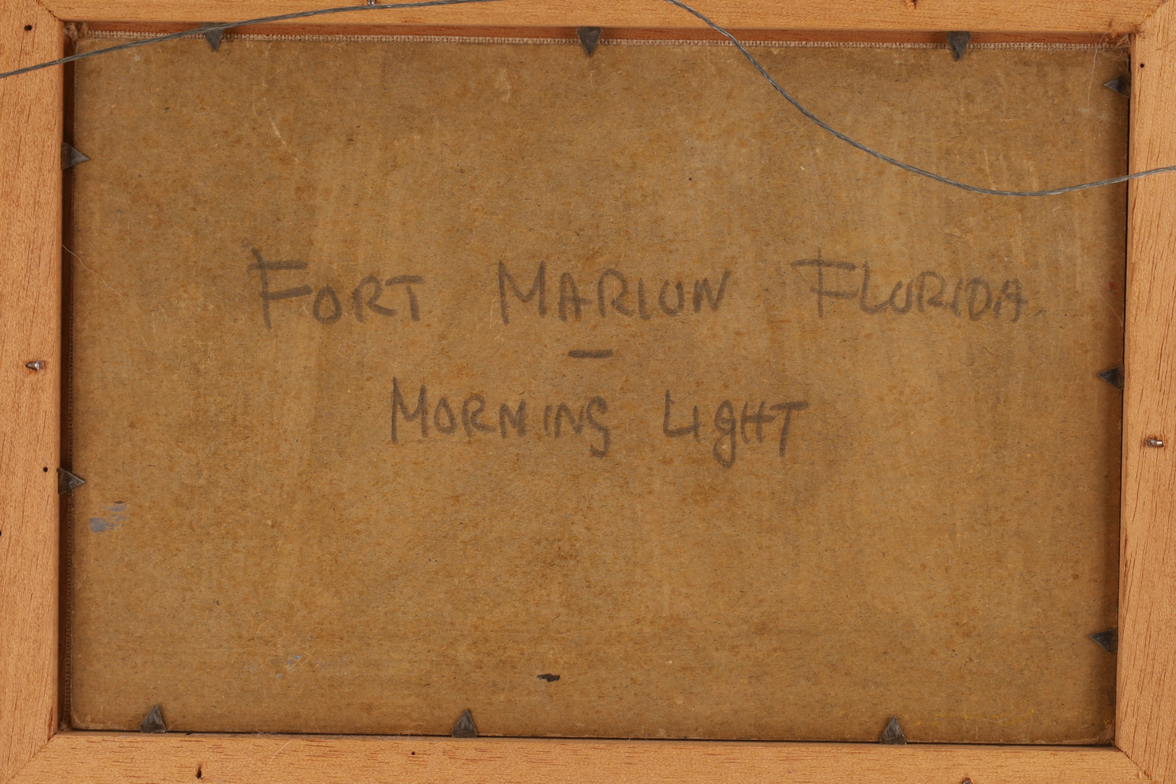 Signed C. Hauser American Impressionist Oil on Panel Beach Landscape, Titled on verso Fort Marion Florida, Morning Light. Panel measures 6 inches H x 9 W, frame measures 12 x 15 inches.