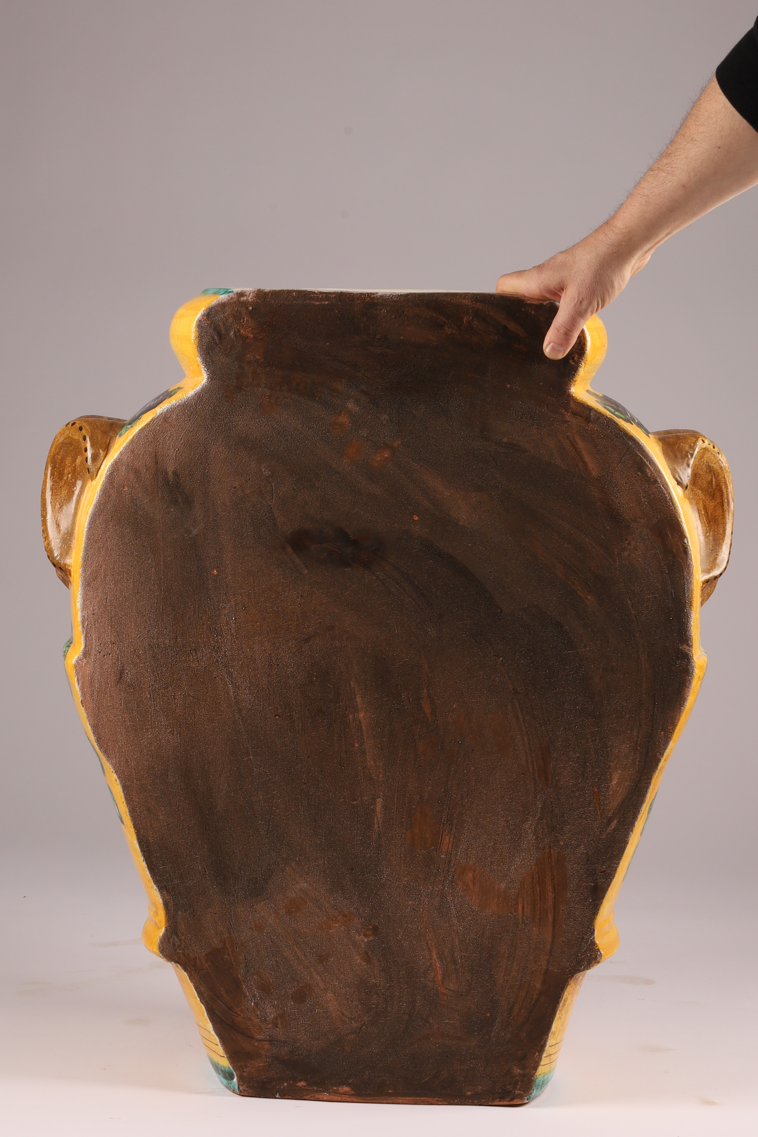 Large Italian Terracotta Majolica Glazed Acqua Fortis Jar Planter Urn. Flat on one side, measuring 28 inches H x 22 W x 14 deep.