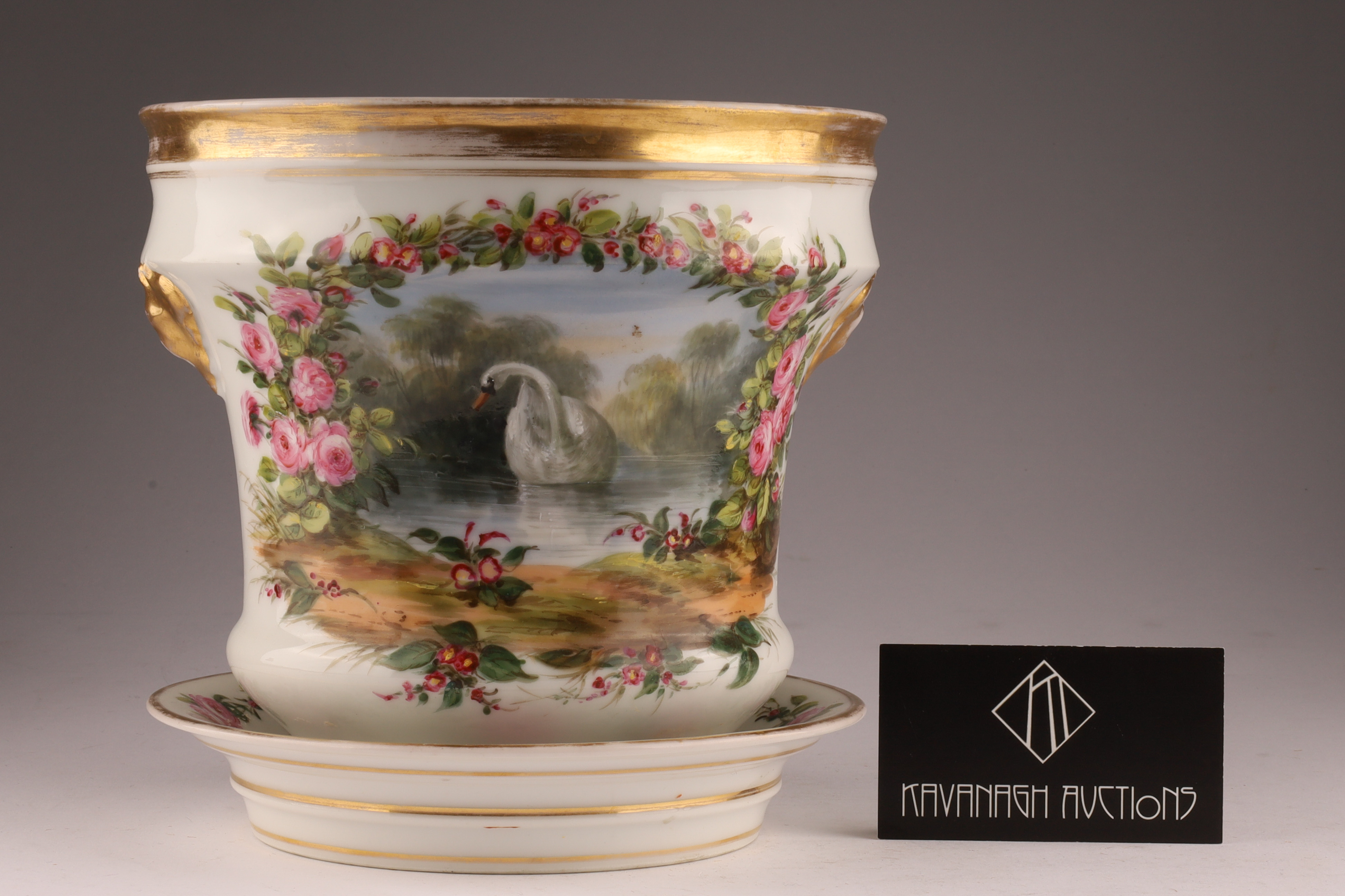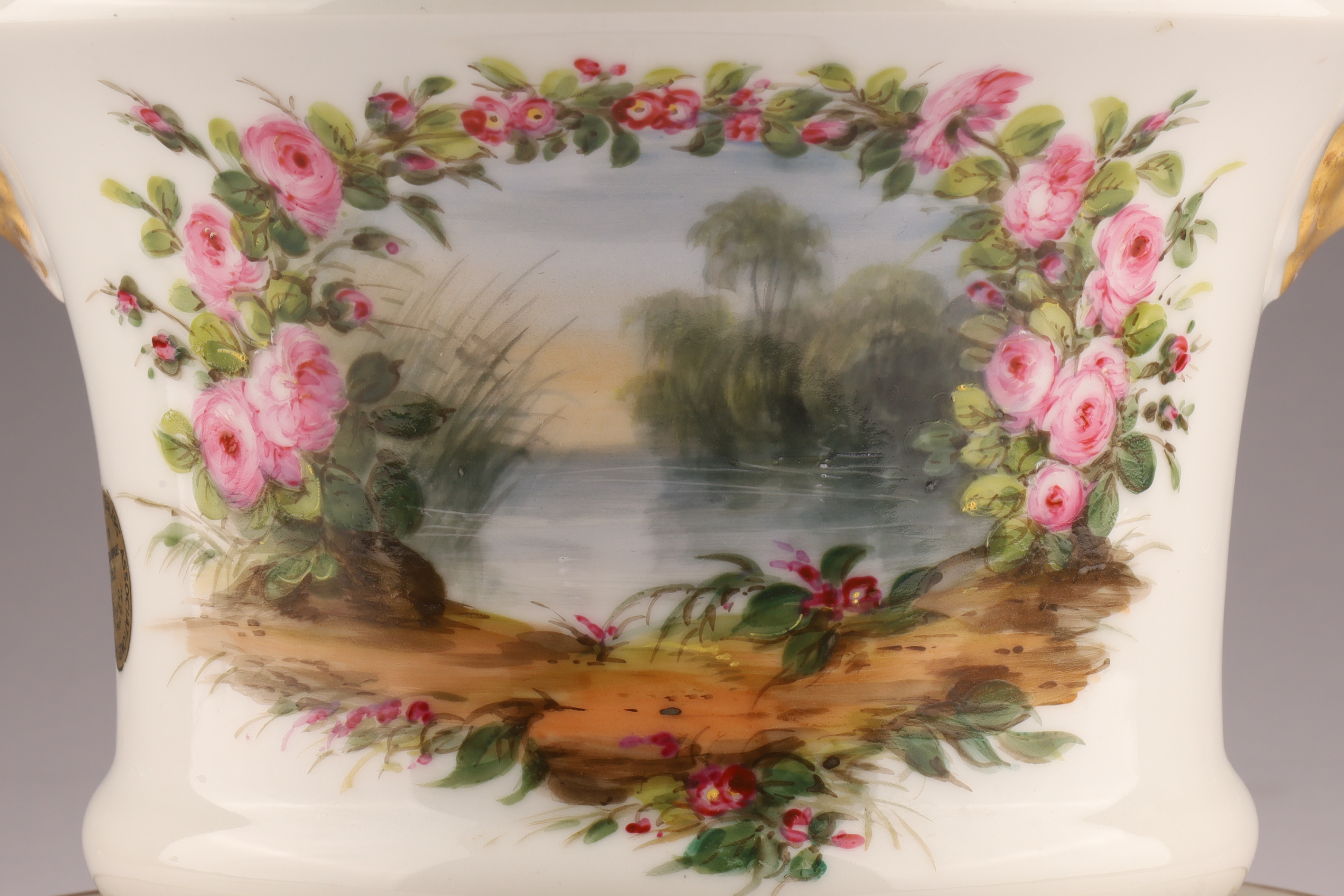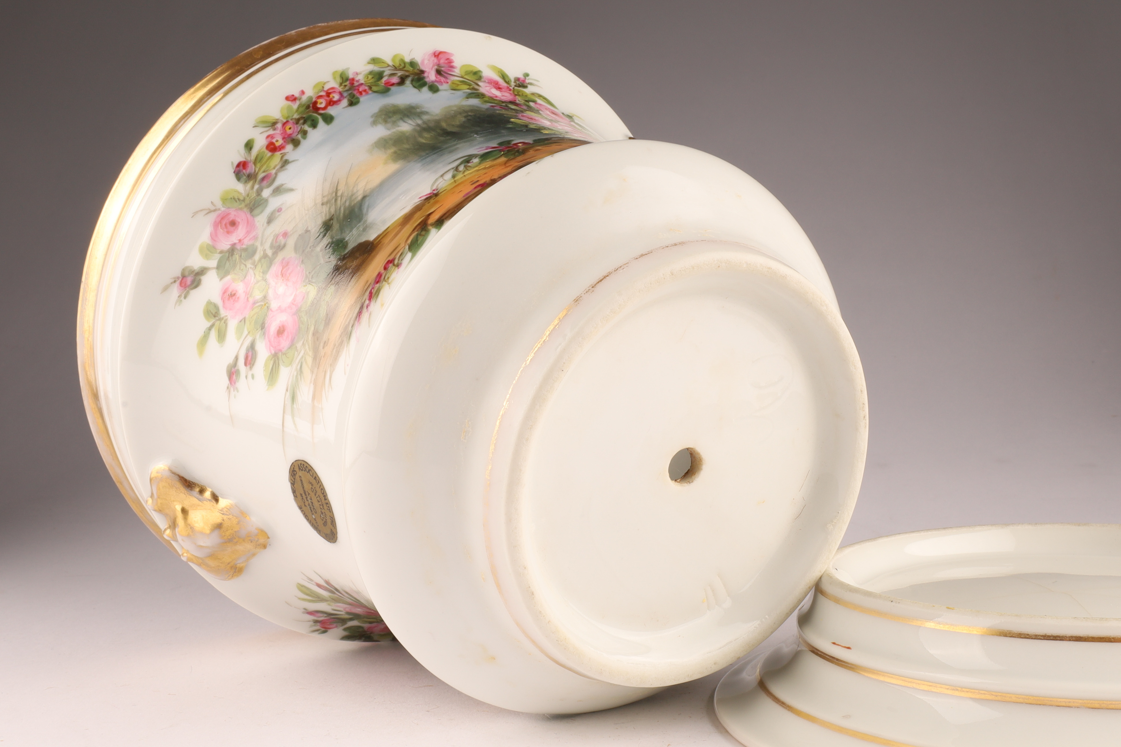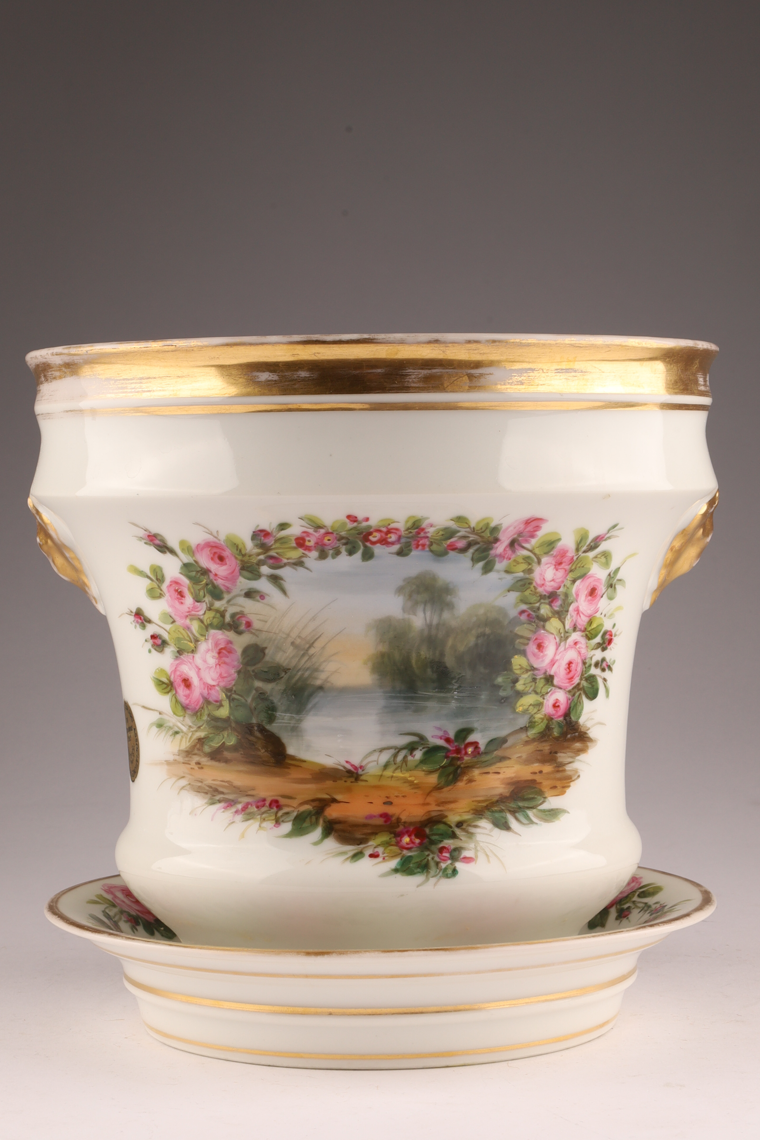 Porcelain cachepot finely hand-painted with a landscape cartouche framed by garlands of pink roses and accented with gilt bands. Includes matching undertray; certified by the British Antique Dealers Association as pre-1914.