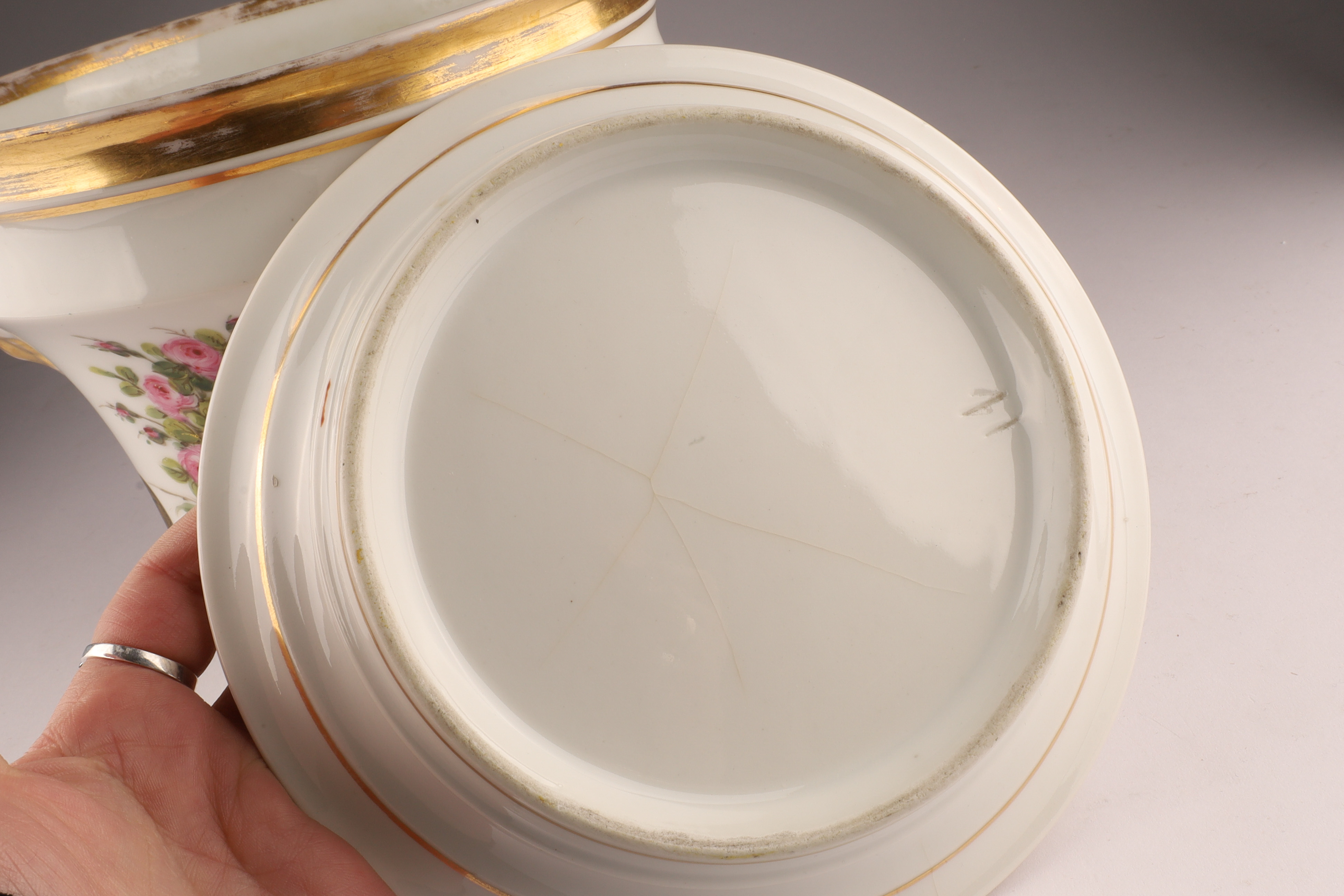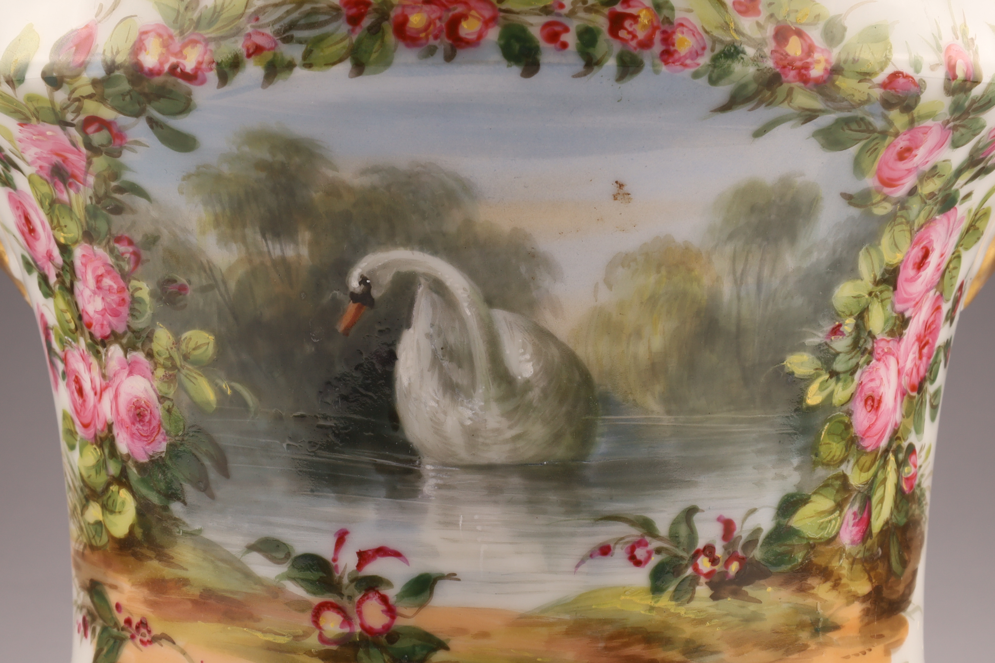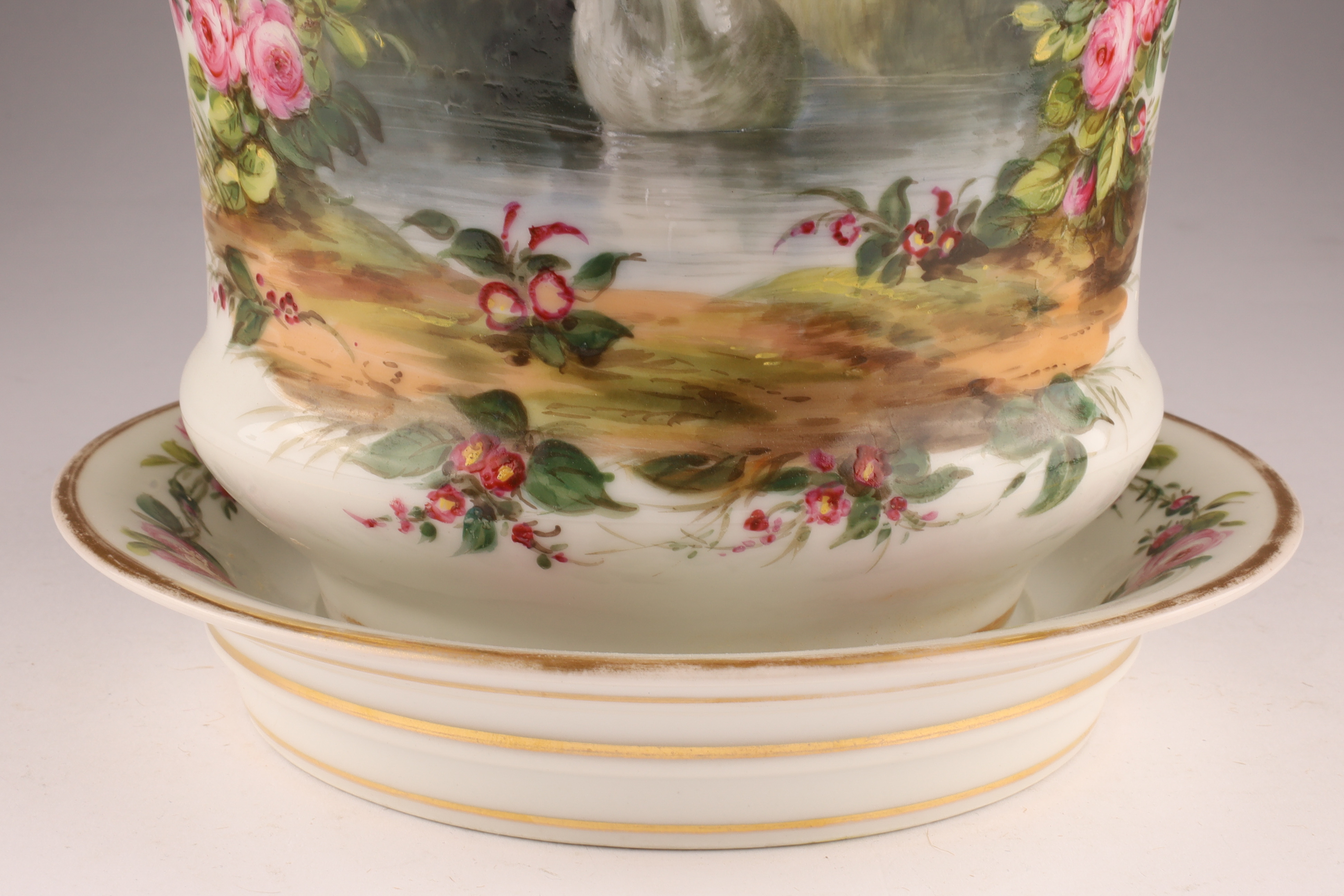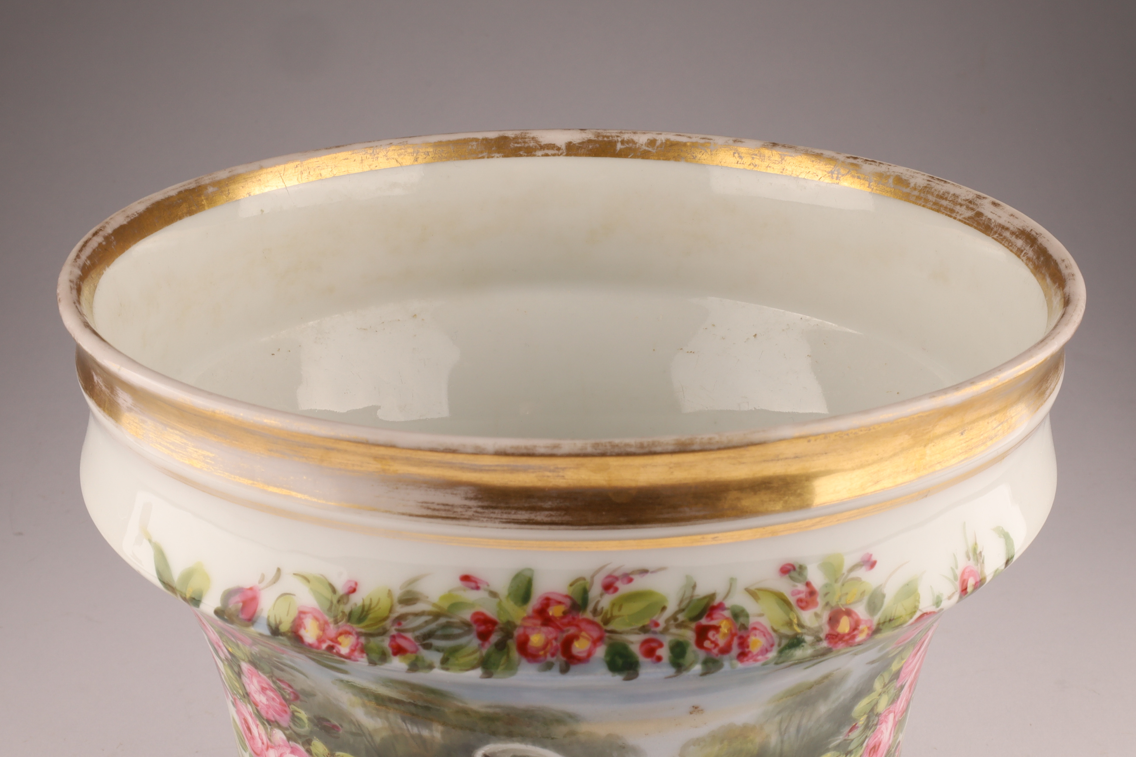 Porcelain cachepot finely hand-painted with a landscape cartouche framed by garlands of pink roses and accented with gilt bands. Includes matching undertray; certified by the British Antique Dealers Association as pre-1914.