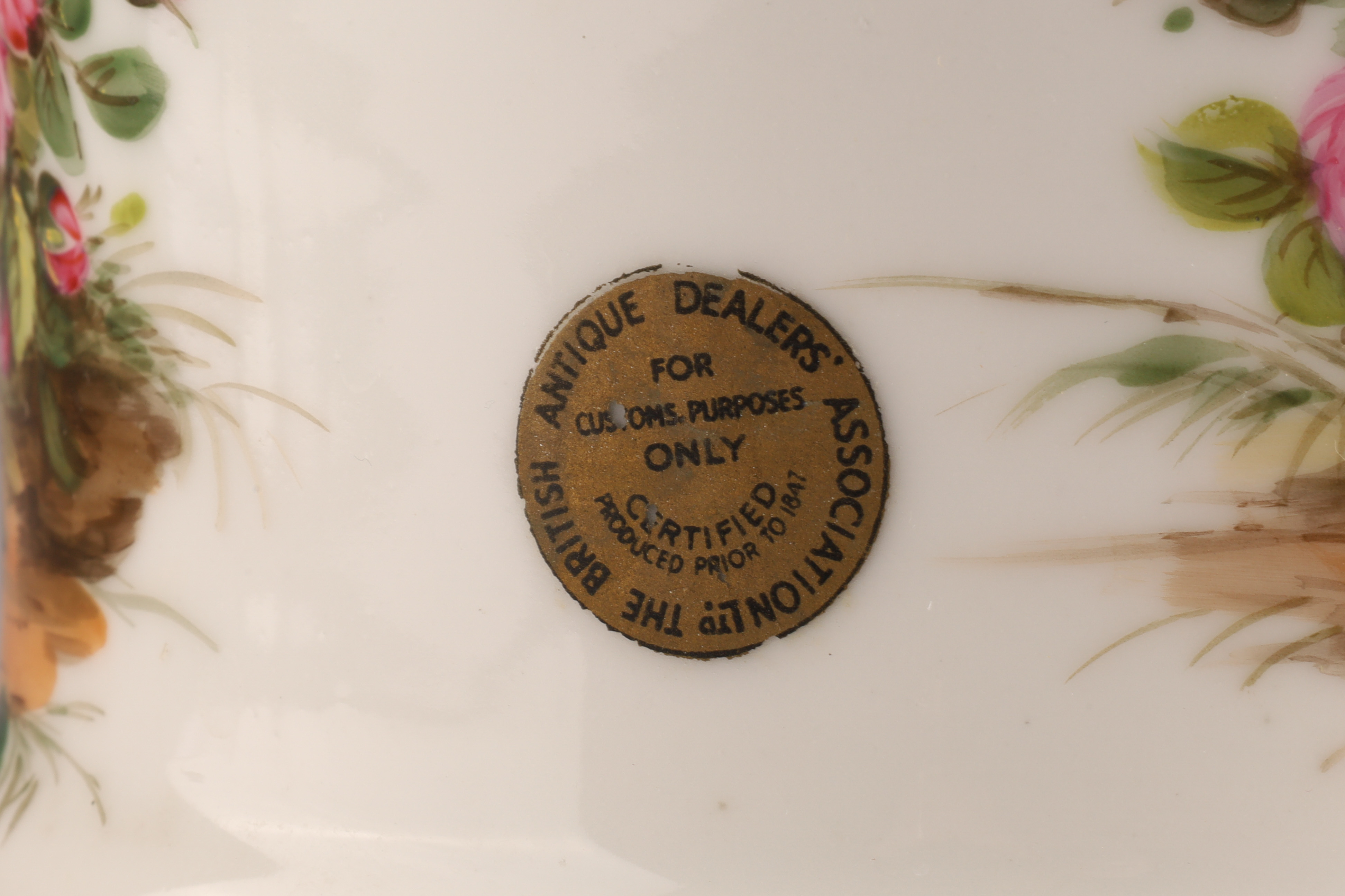 Continental porcelain; hand-painted floral and landscape decoration with gilt rim and molded body. Matching saucer included. Retains B.A.D.A. customs certification sticker (“Produced prior to 1914”). Approx. 7.5 inches tall. Light age-related wear; base with old firing lines.