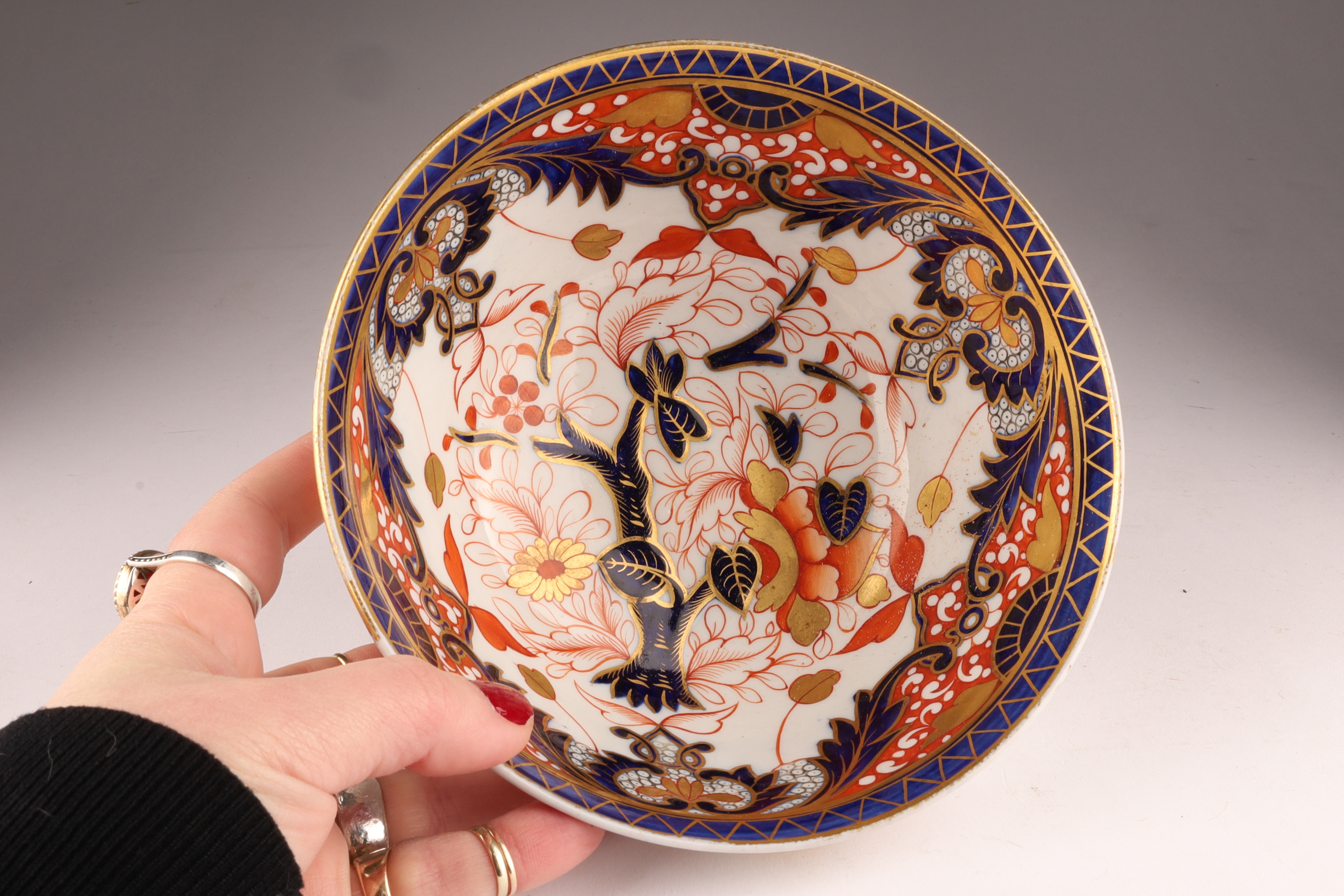Finely decorated English porcelain bowl in the classic Imari palette of cobalt, iron-red and gilt, featuring a central flowering tree framed by rich border ornament.