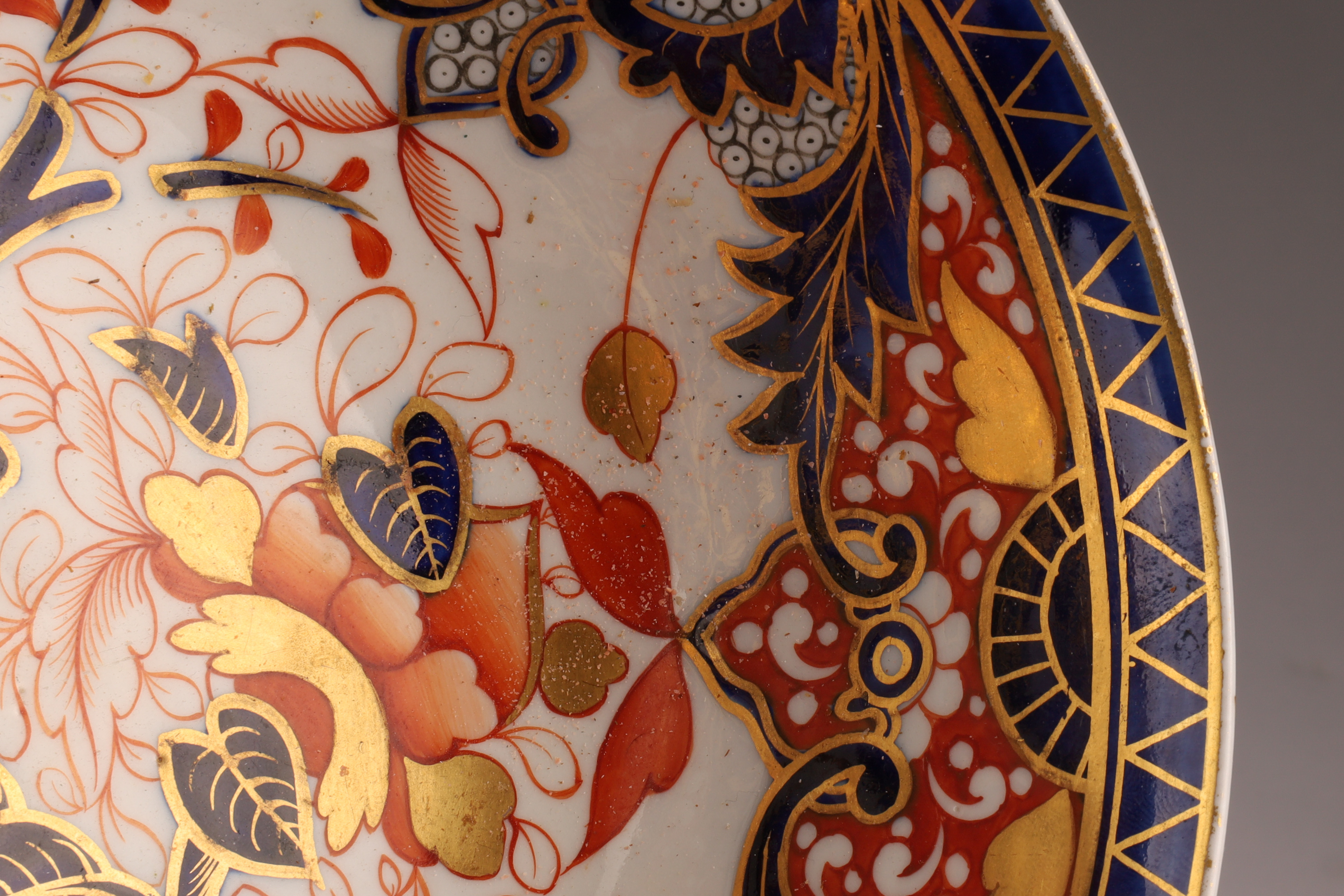 Hand-painted porcelain with gilt accents; exterior decorated with stylized floral sprigs. Traditional “King’s Pattern” palette and layout, inspired by early Imari Japanese ware but executed in an English 19th-century factory (possibly Coalport or Worcester). Diameter 6.5 inches; height 3 inches. Minor age wear consistent with period.