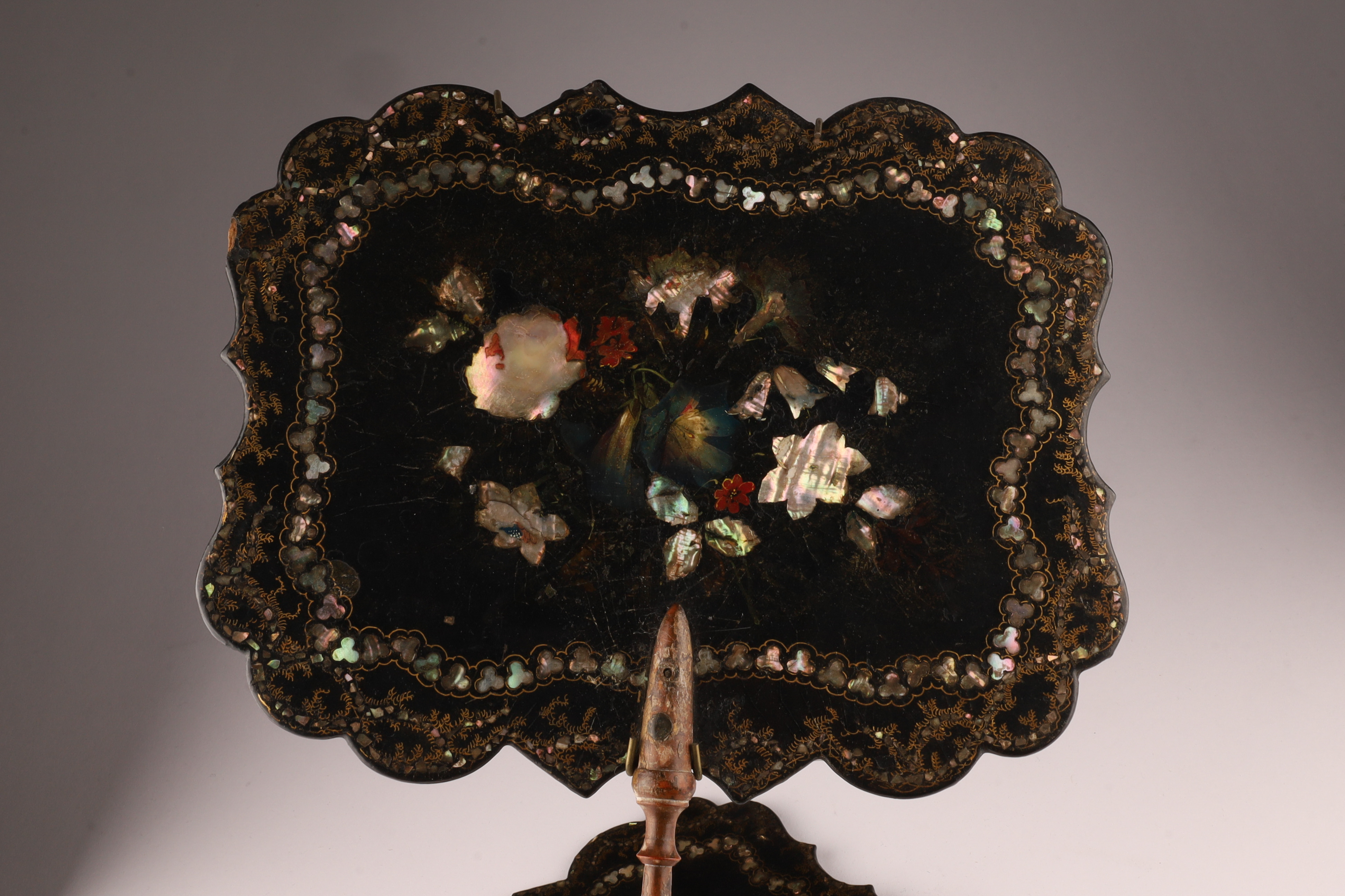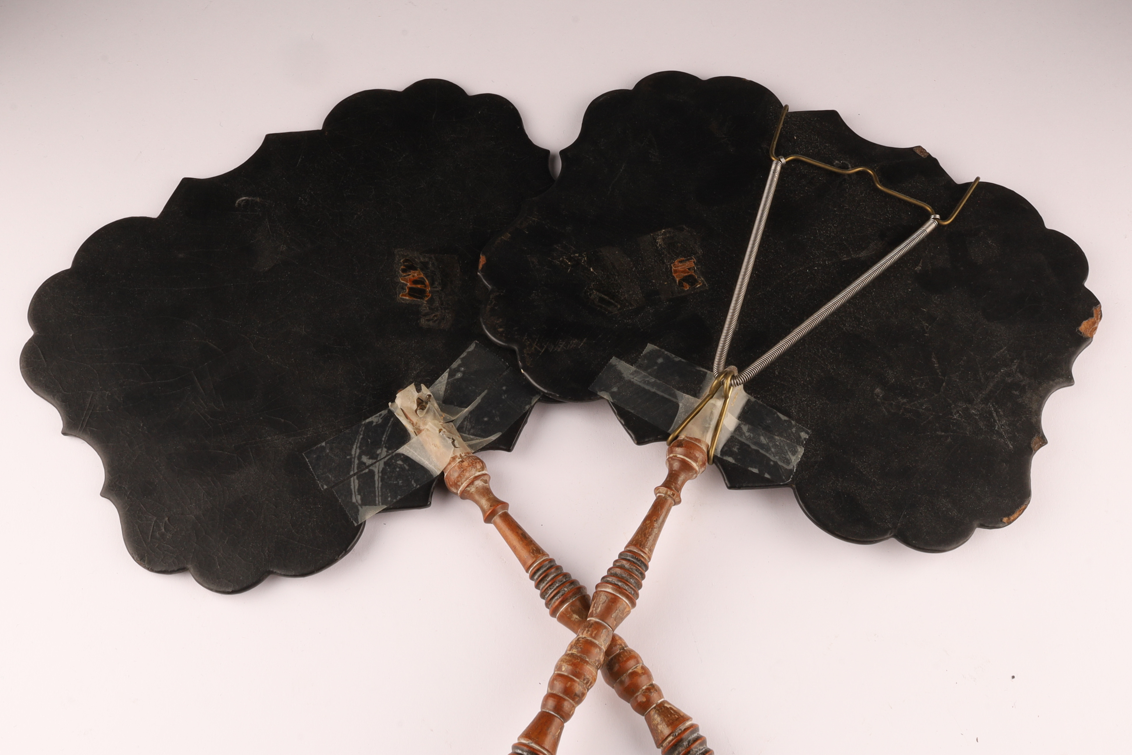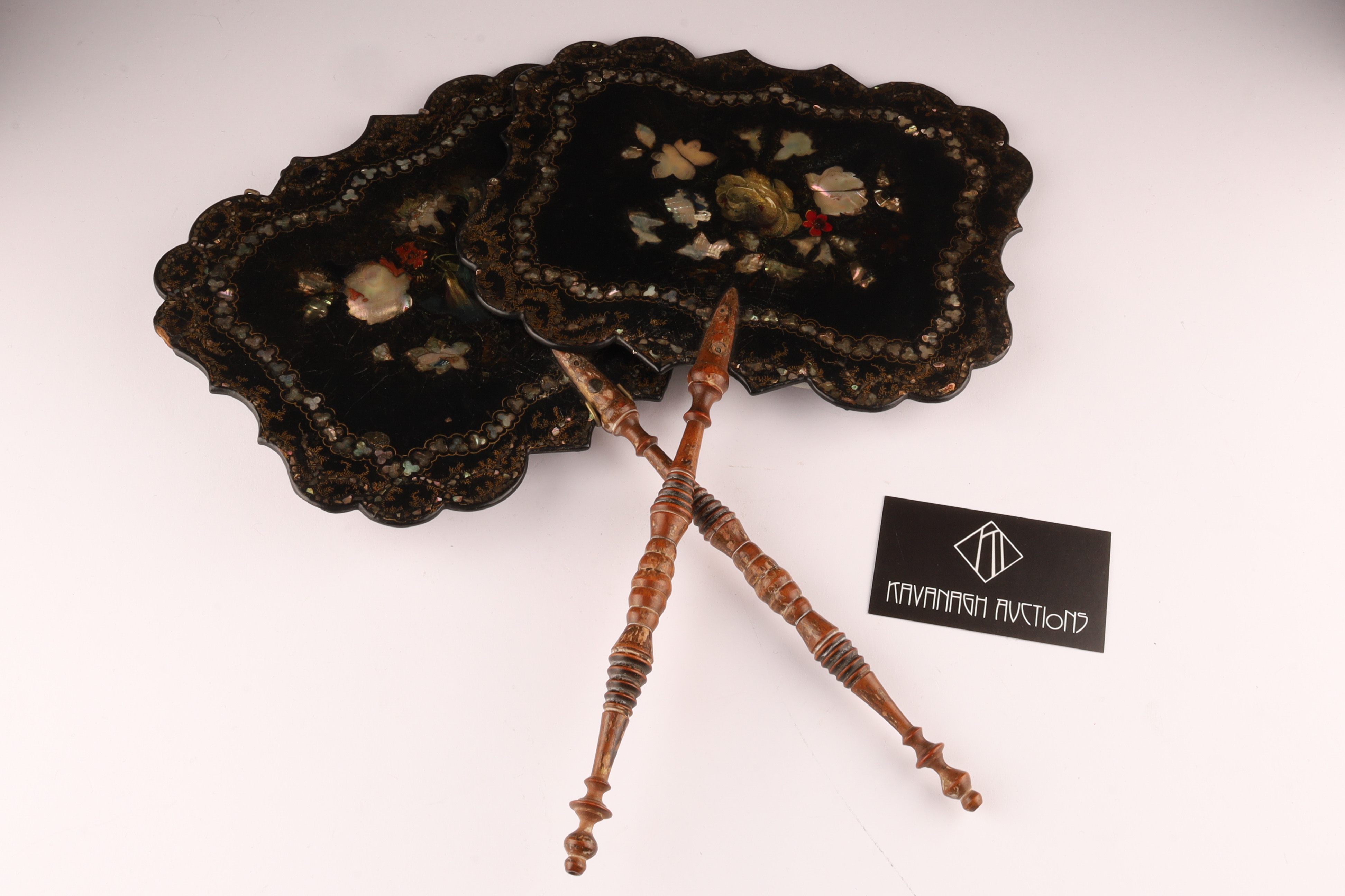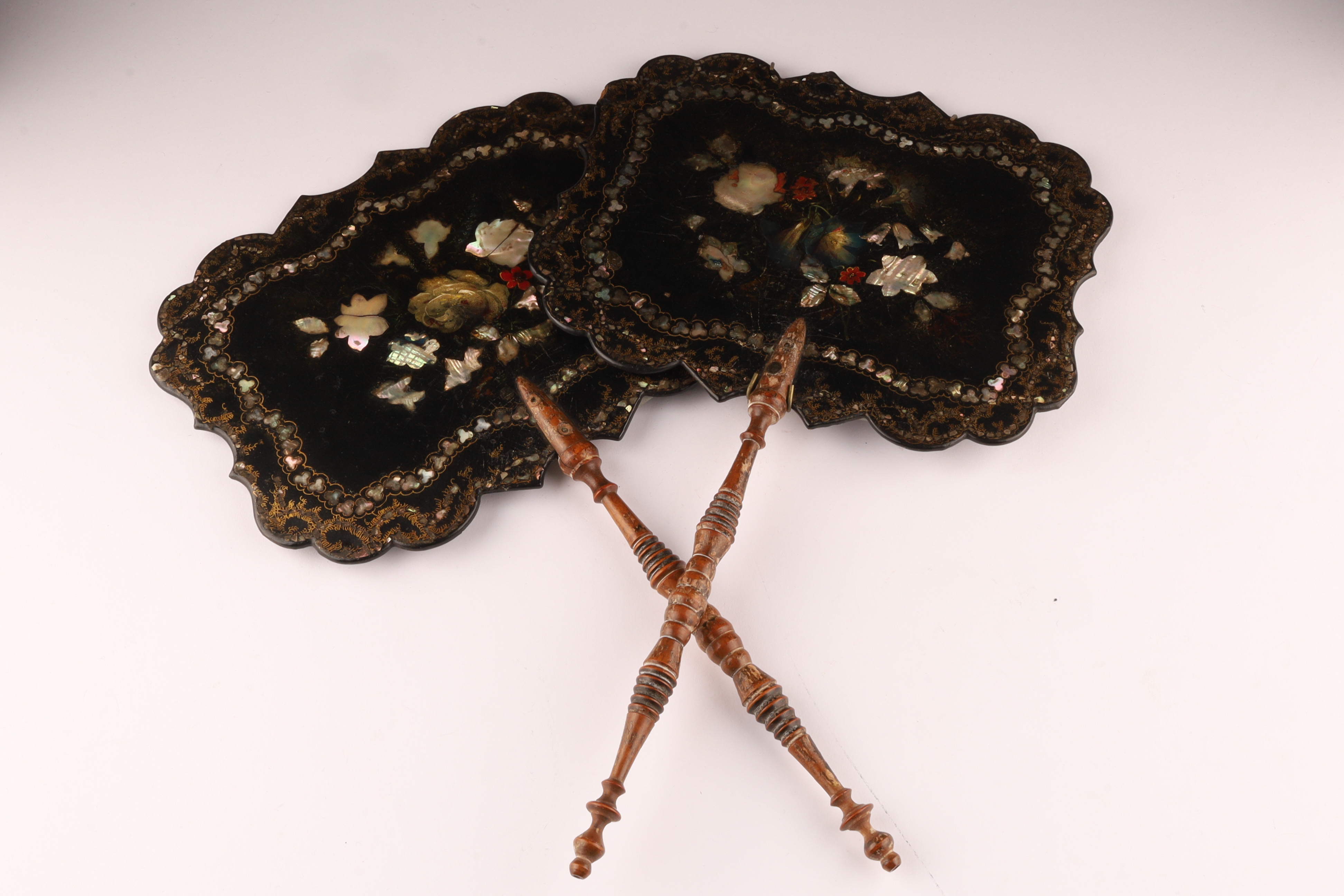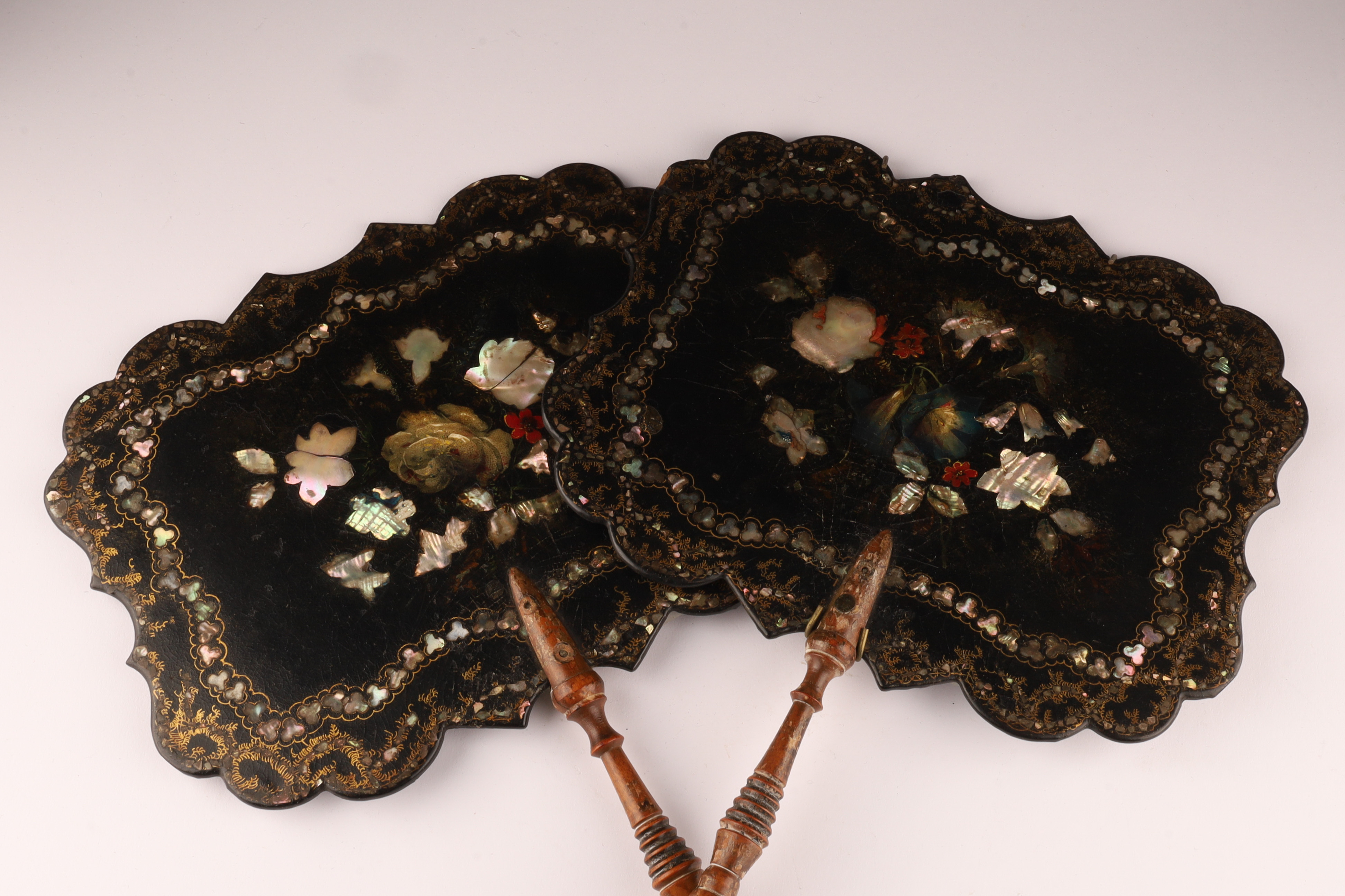 Pair of Victorian Abalone Inlaid Papier Mache Face Screens