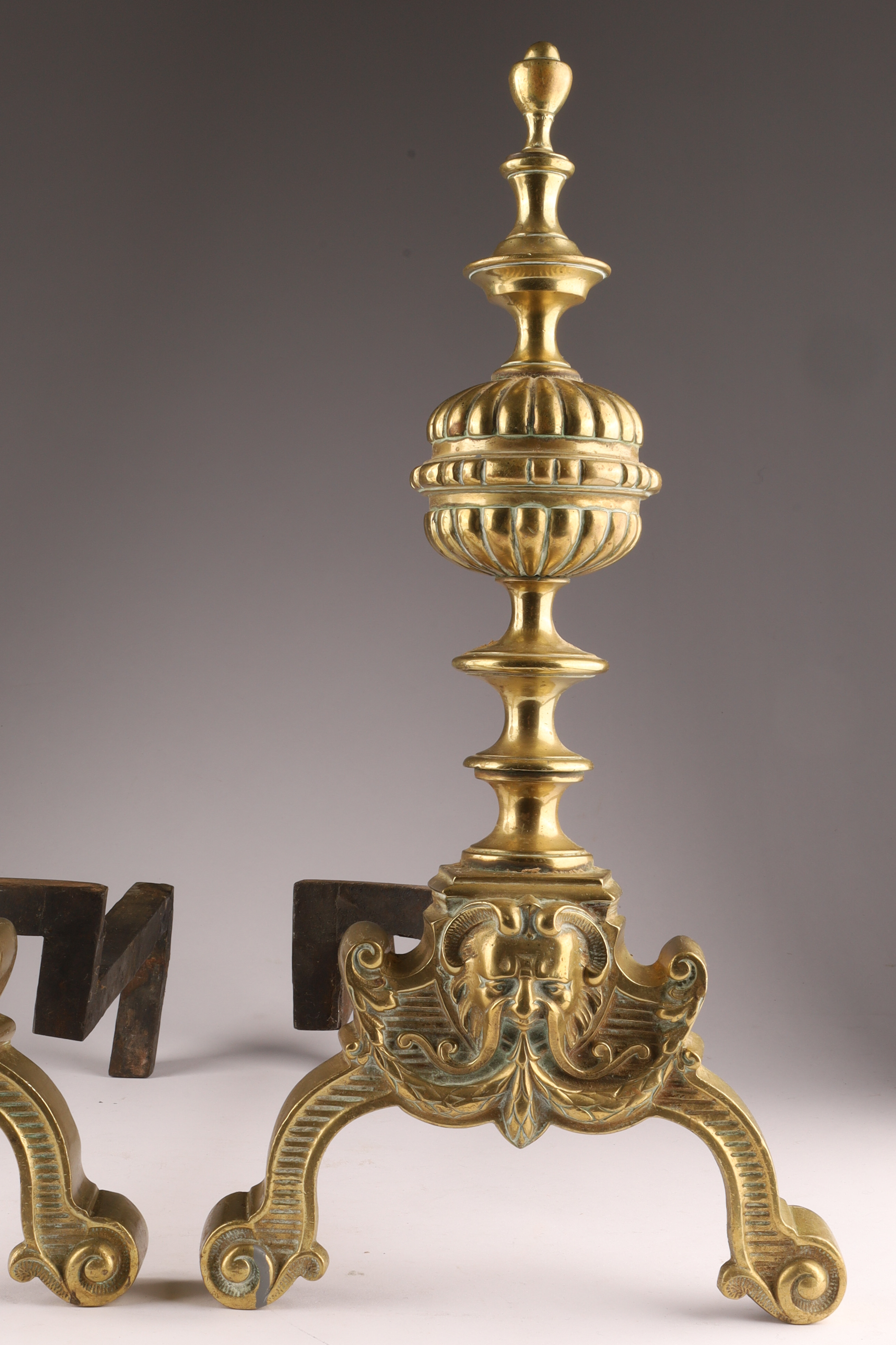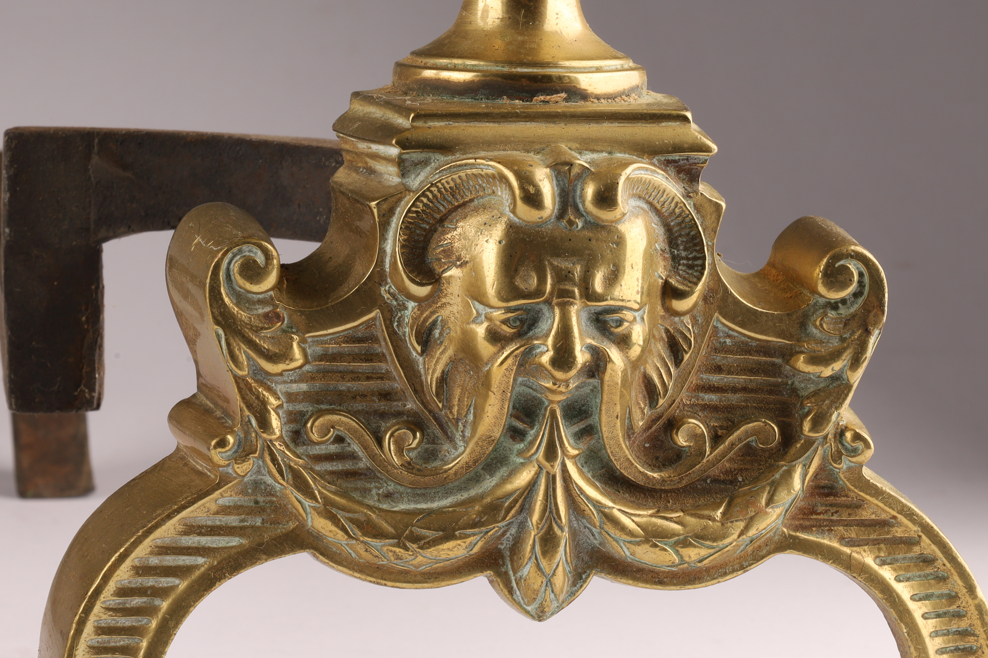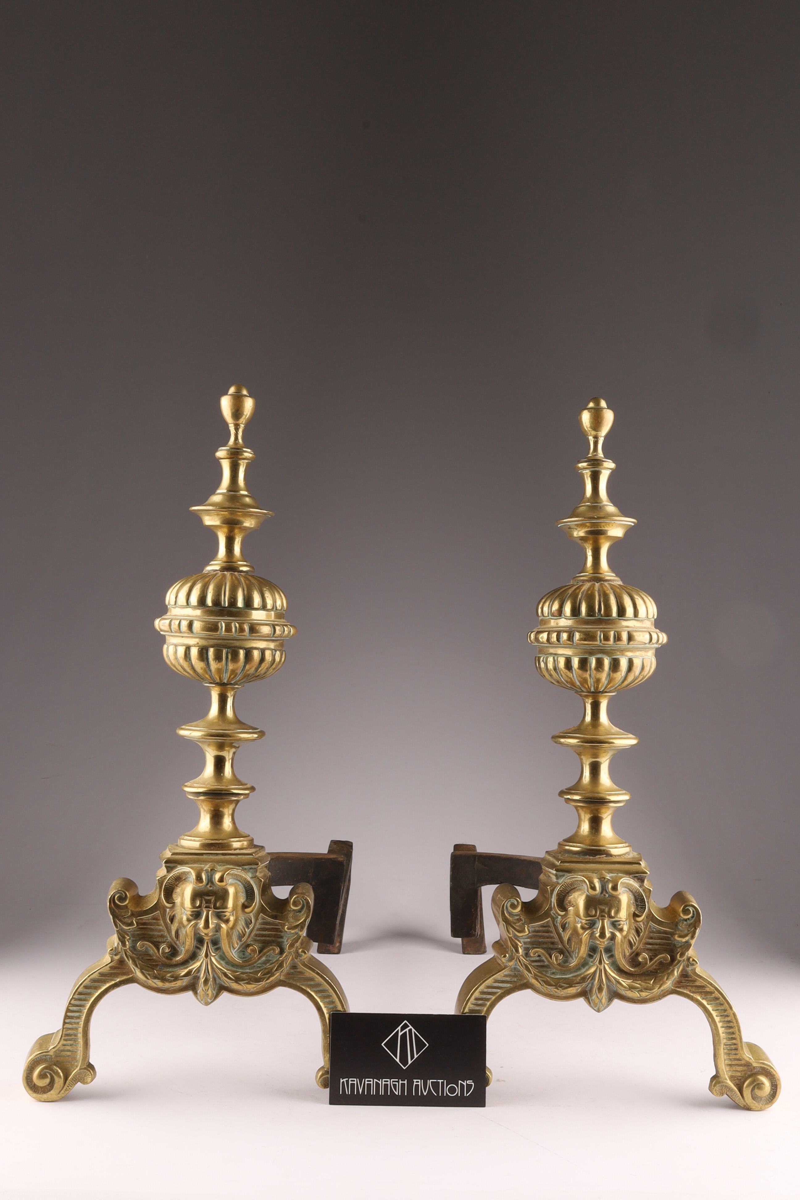 Pair Antique English Brass Andirons With Masks