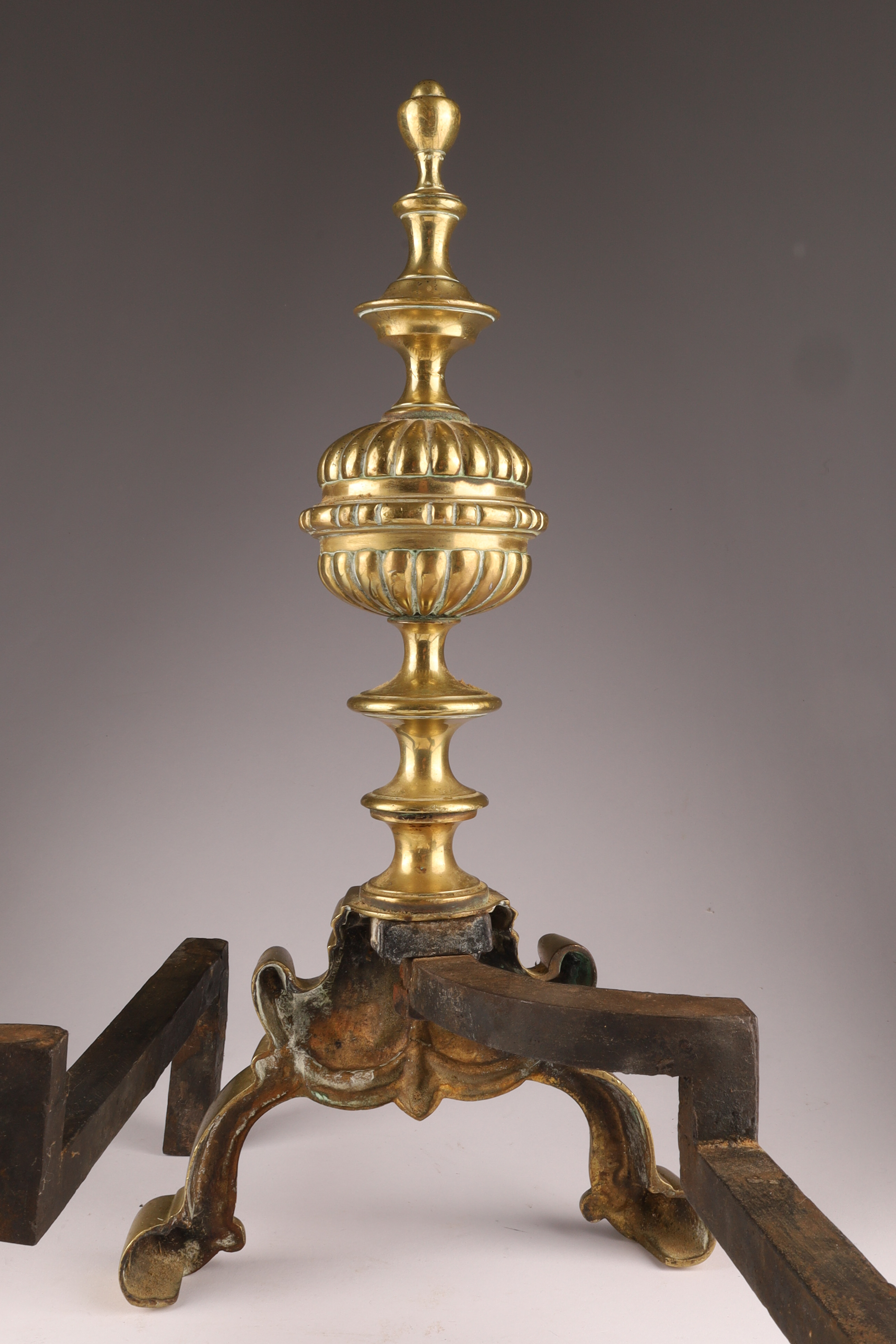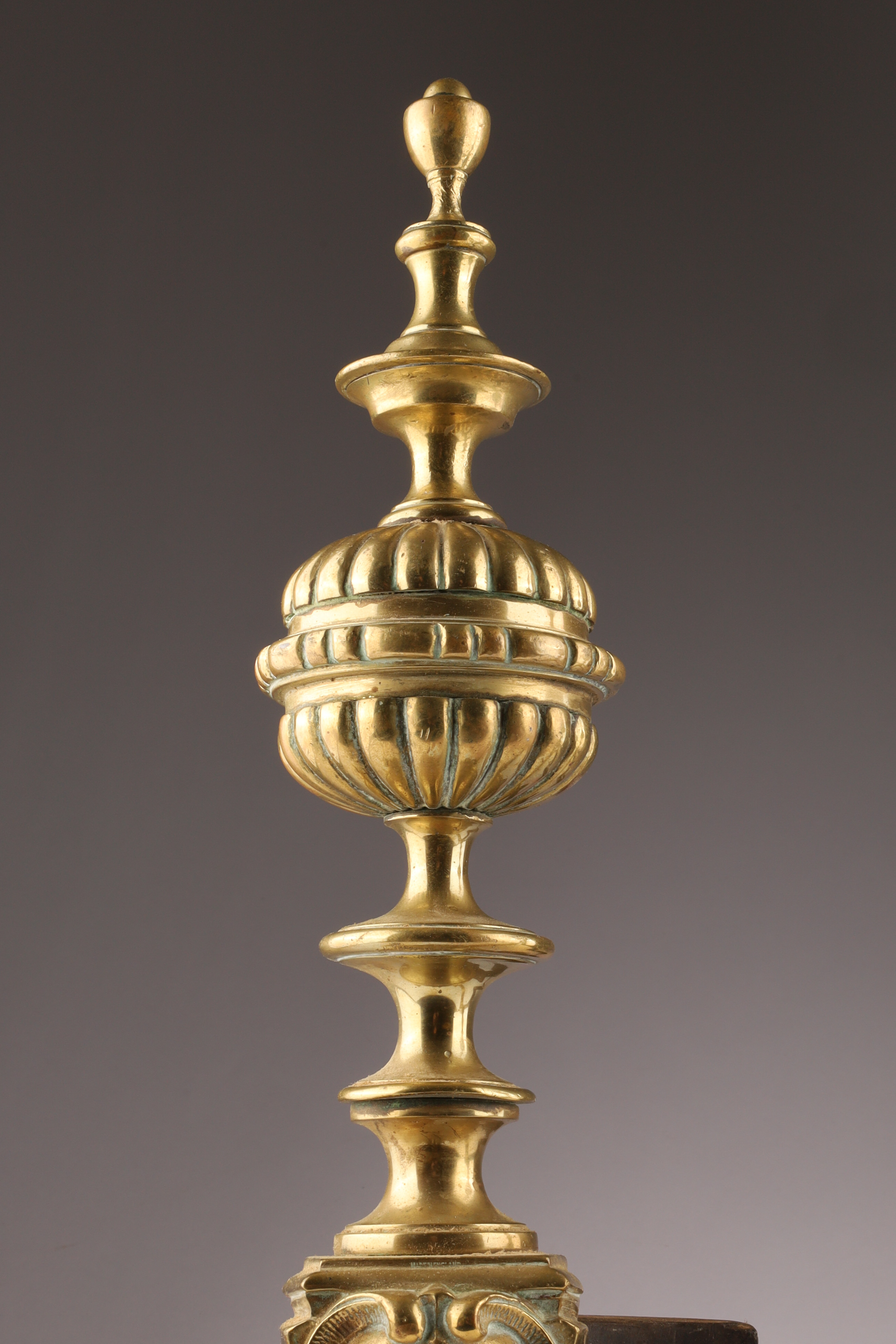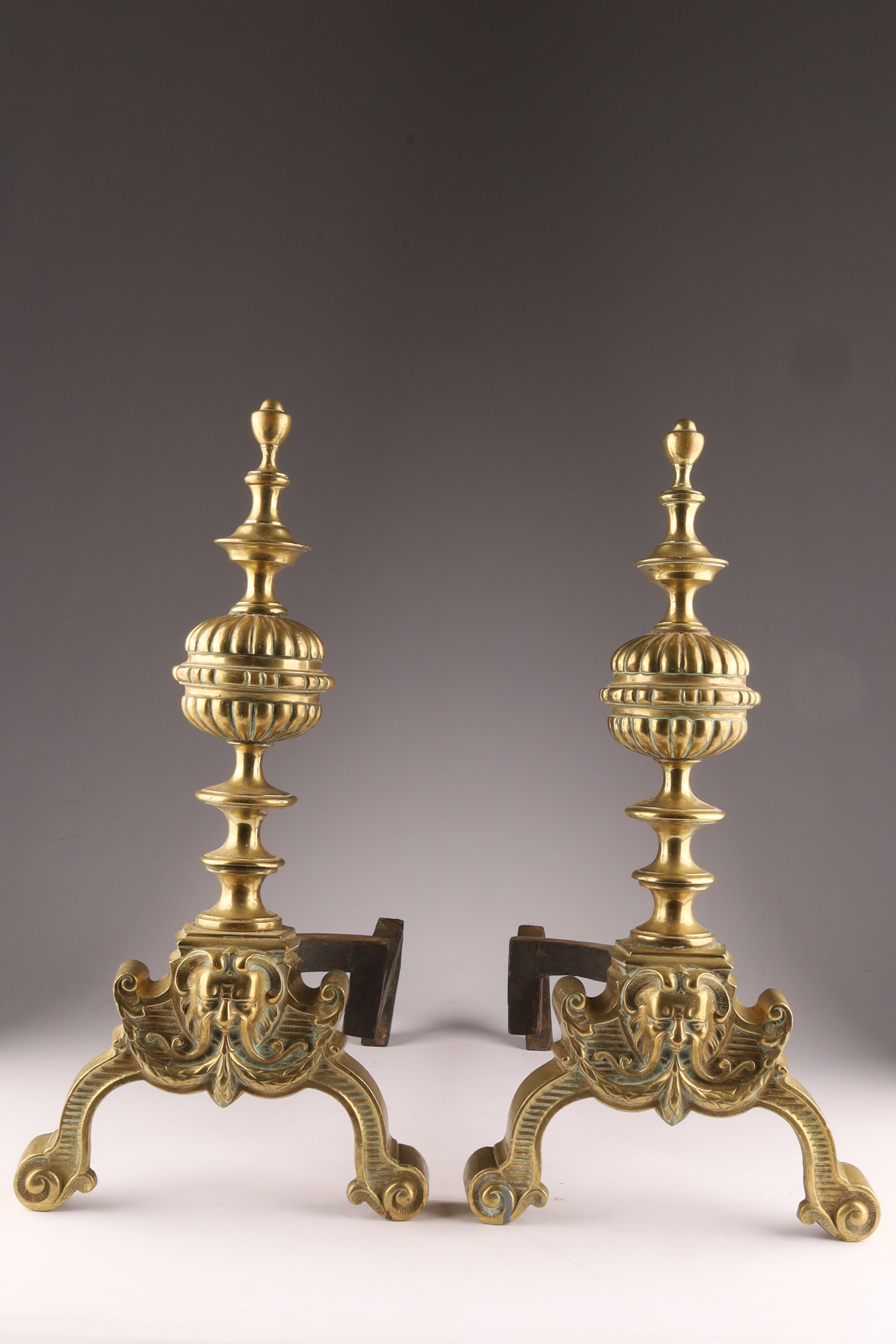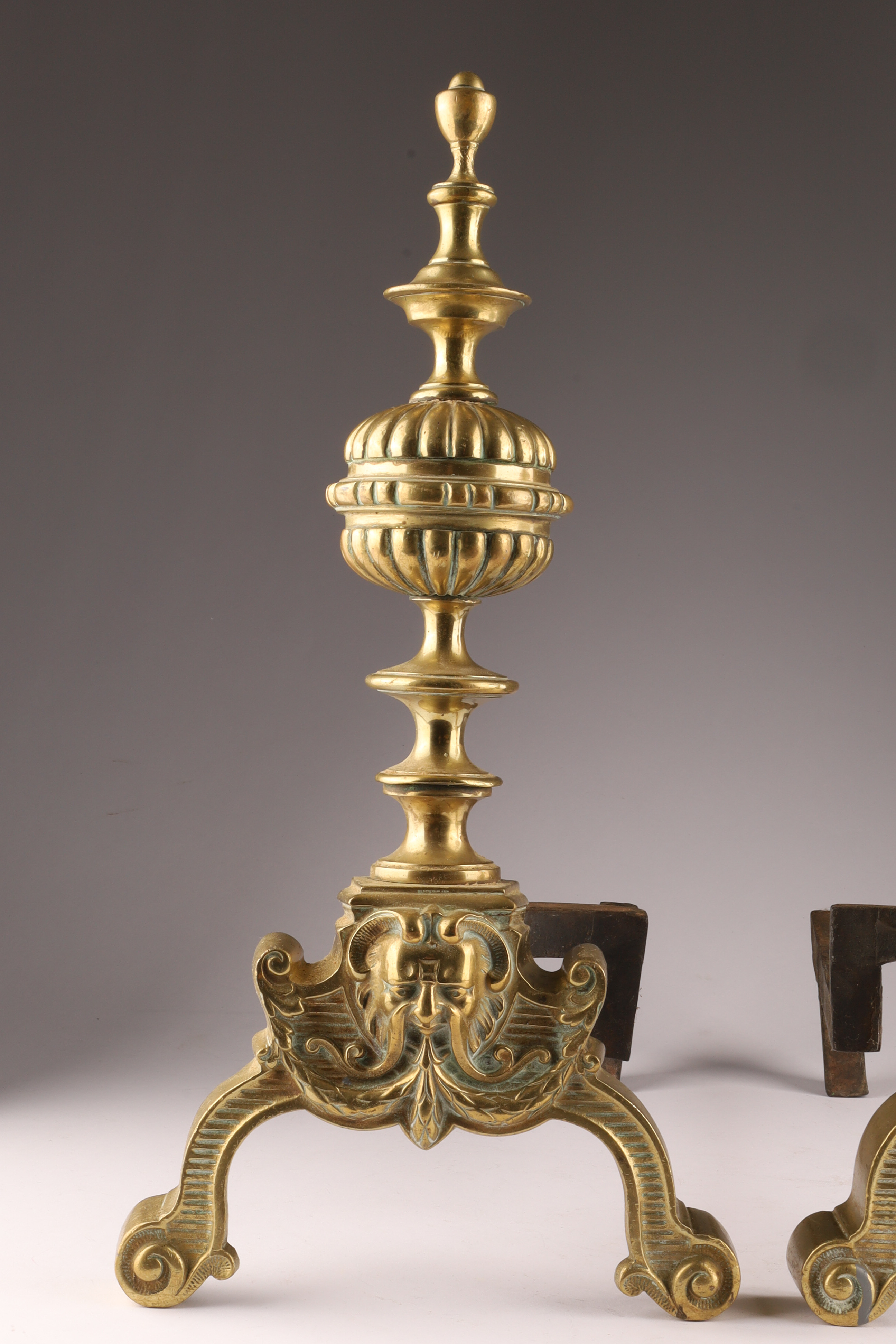 Pair Antique English Brass Andirons With Masks