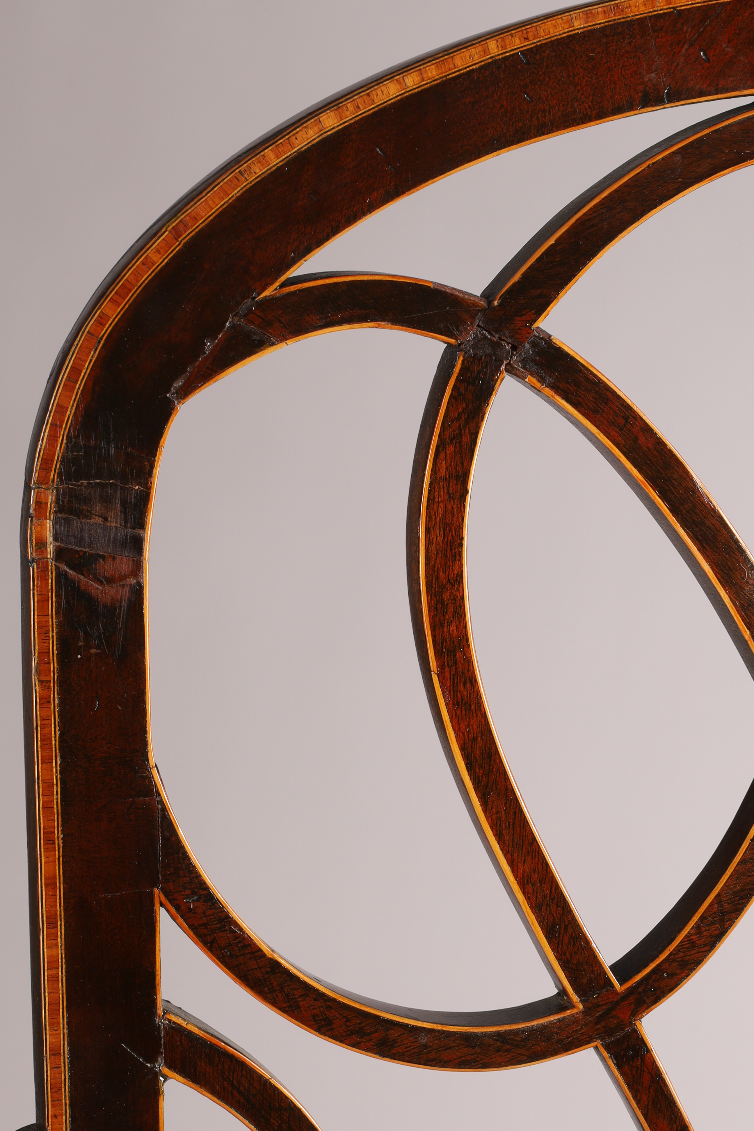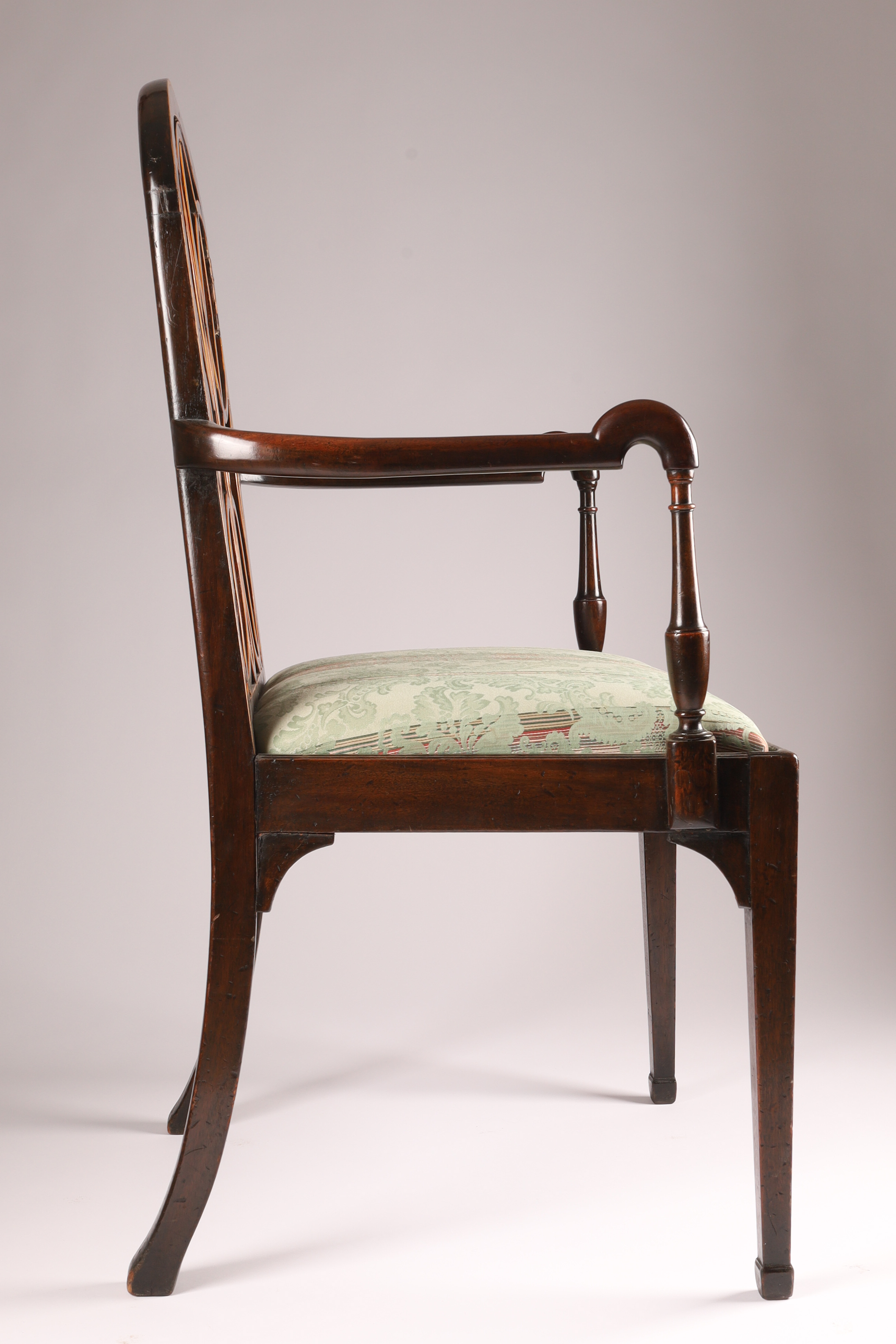 Antique Georgian Shepherd’s Crook Armchair with Inlaid Splat, Hepplewhite or Sheraton. Some restoration to inlay, as shown. 38 inches H x 24 W x 18 deep, 18 inches seat height.