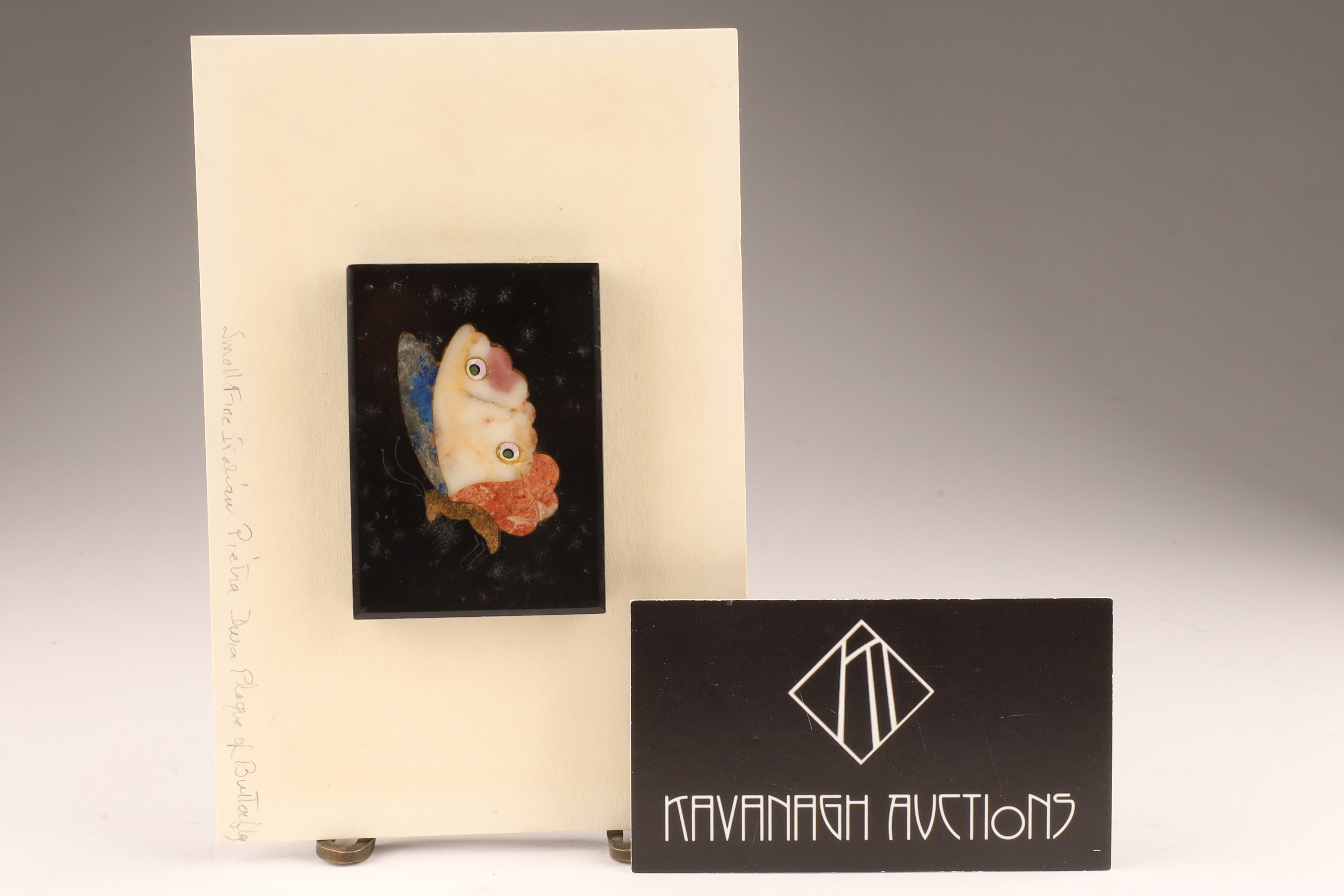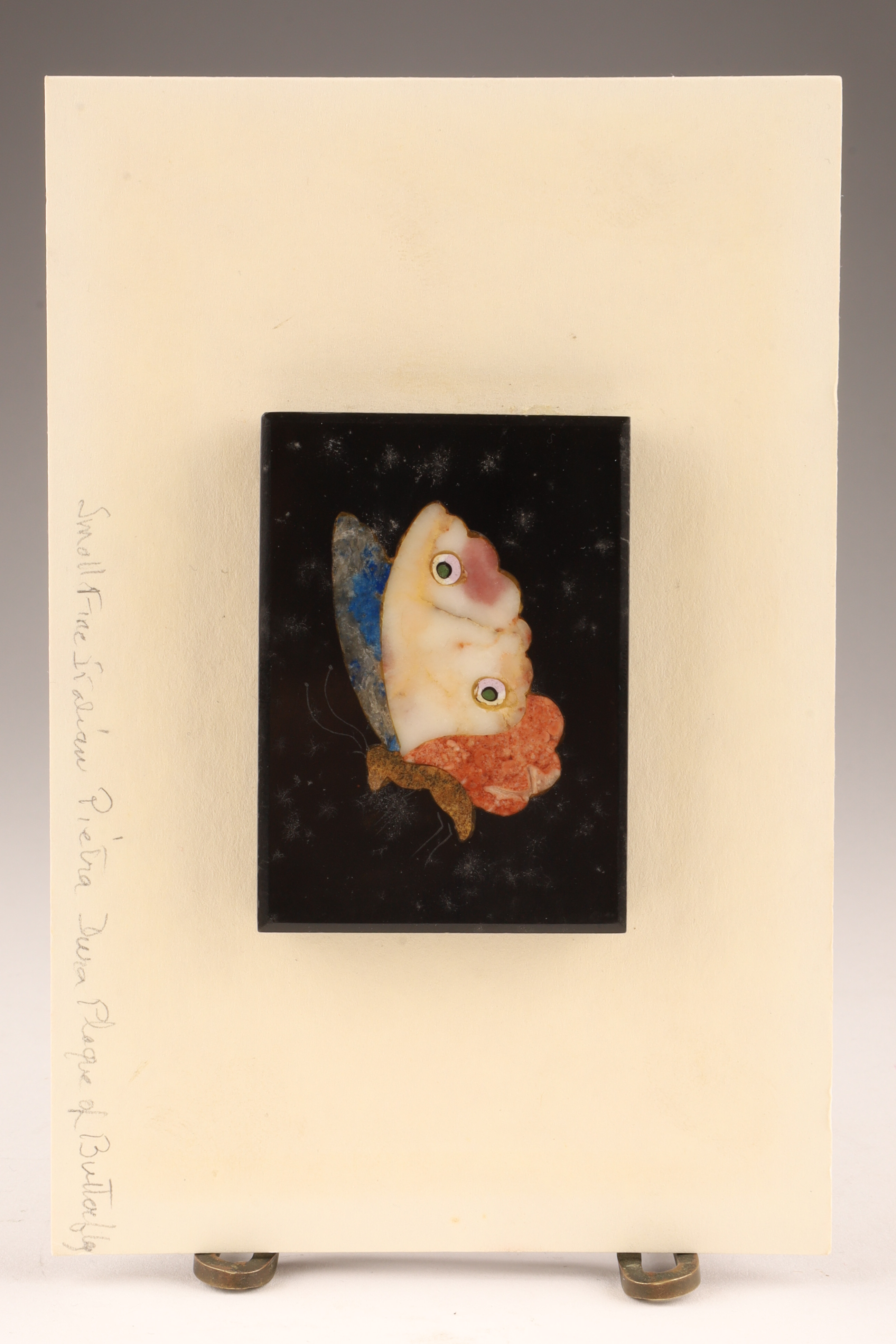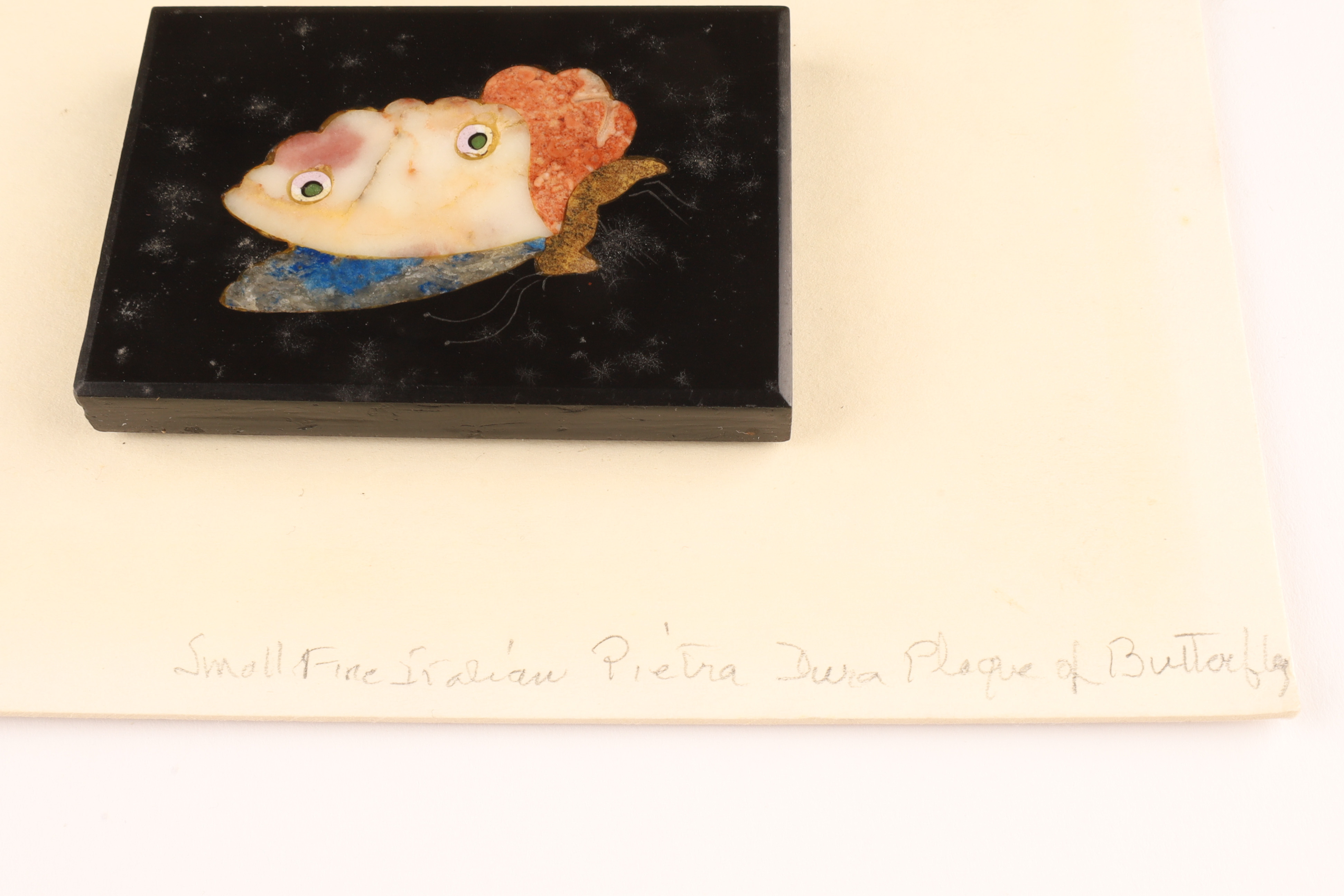 Antique Italian Mosaic / Pietra Dura Butterfly Plaque. Mounted onto card stock, plaque measures 2 inches x 2.5.Card measures 4 x 6 inches W.