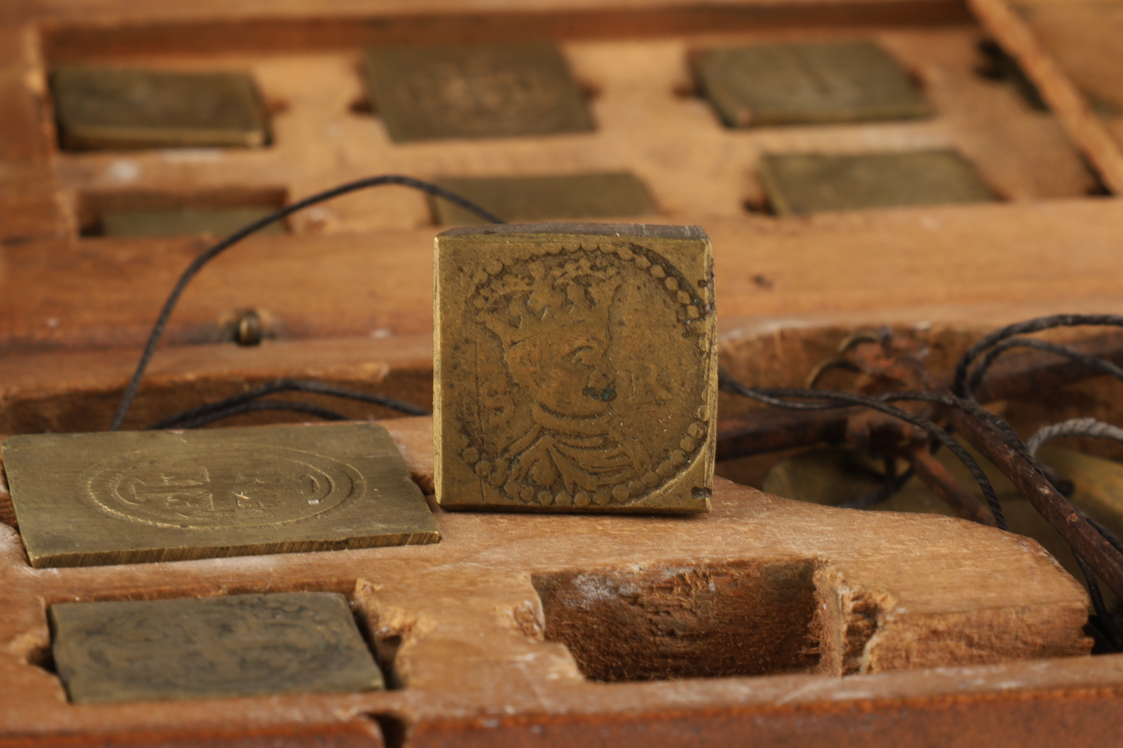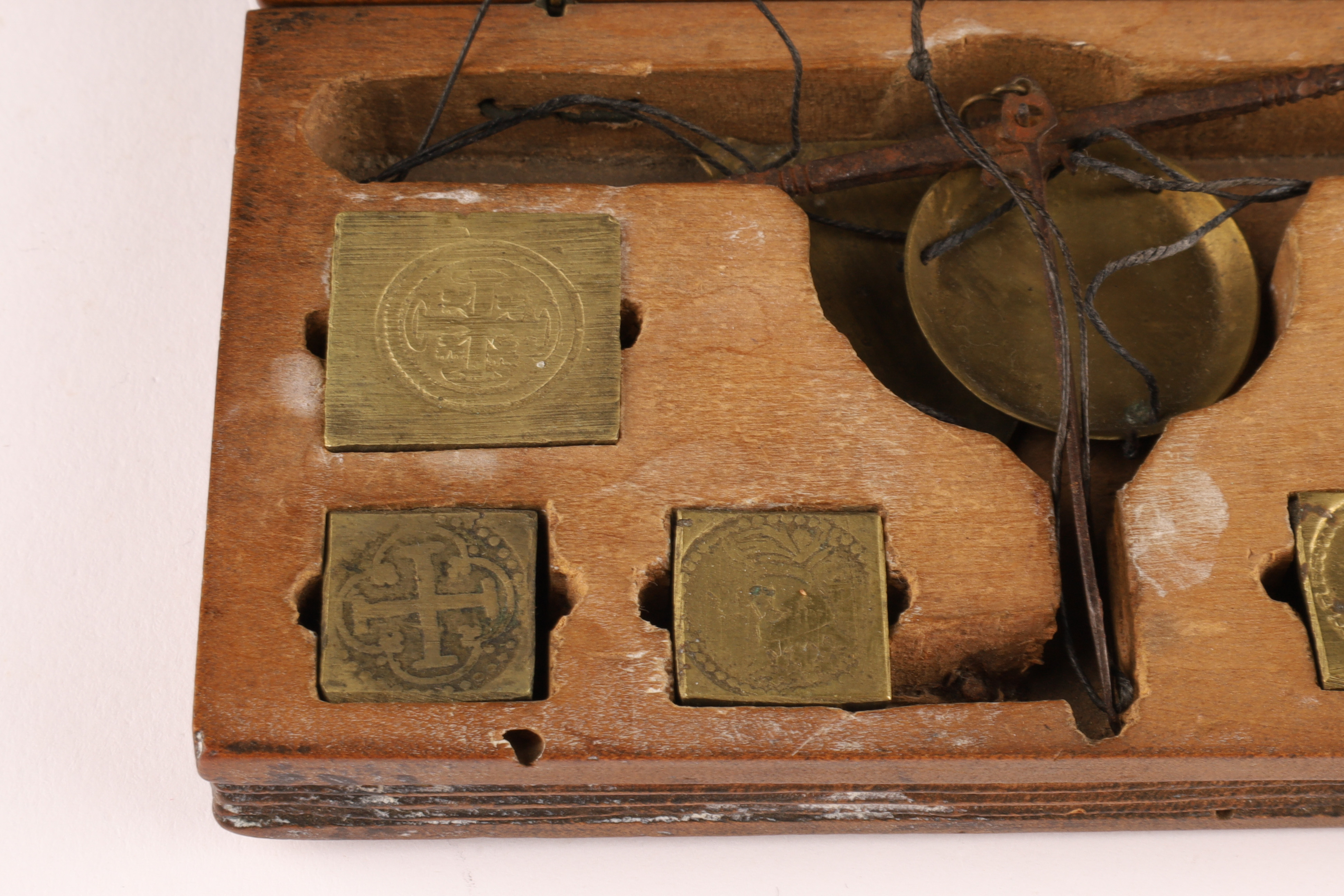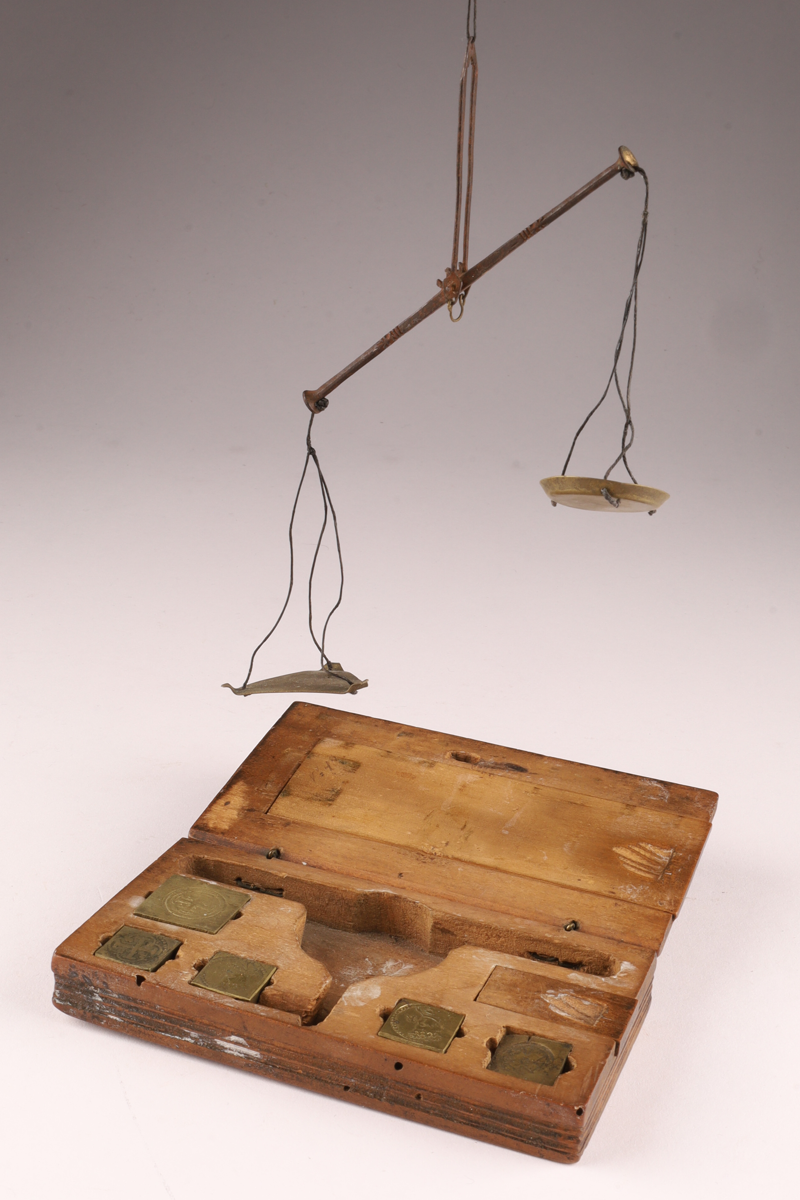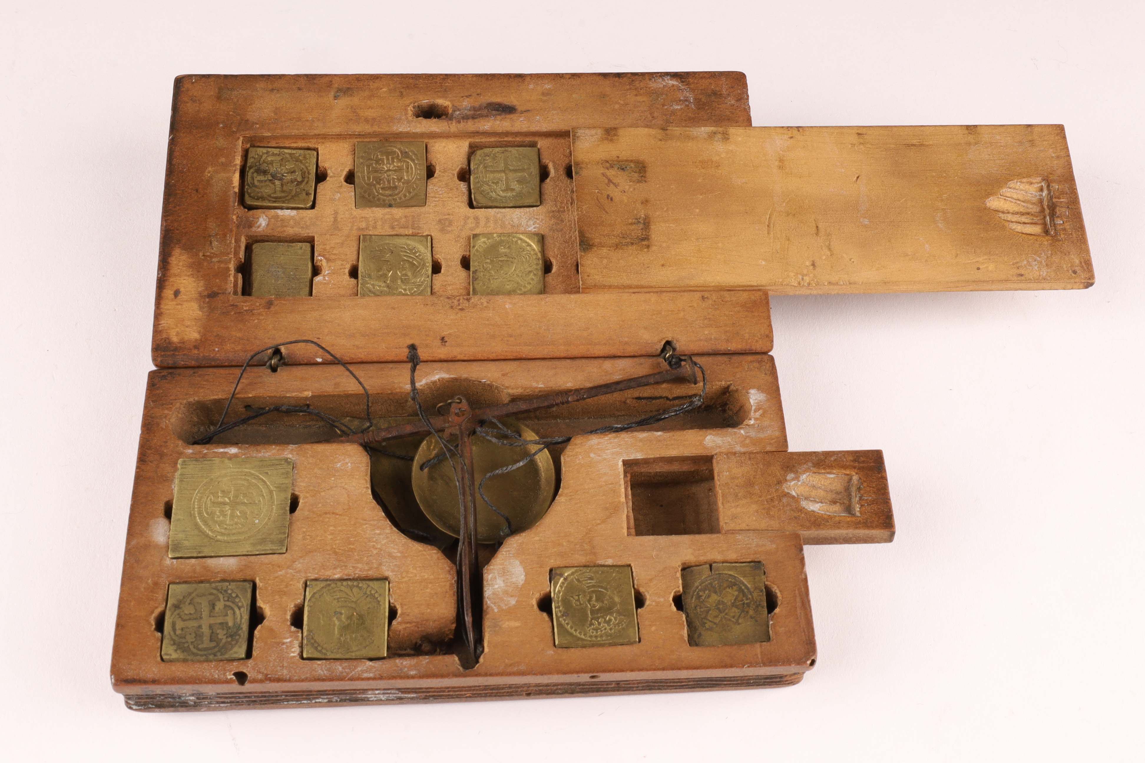 Antique French Boxed Scale Set, measuring 5 inches L x 2.5 x 1 inch H.