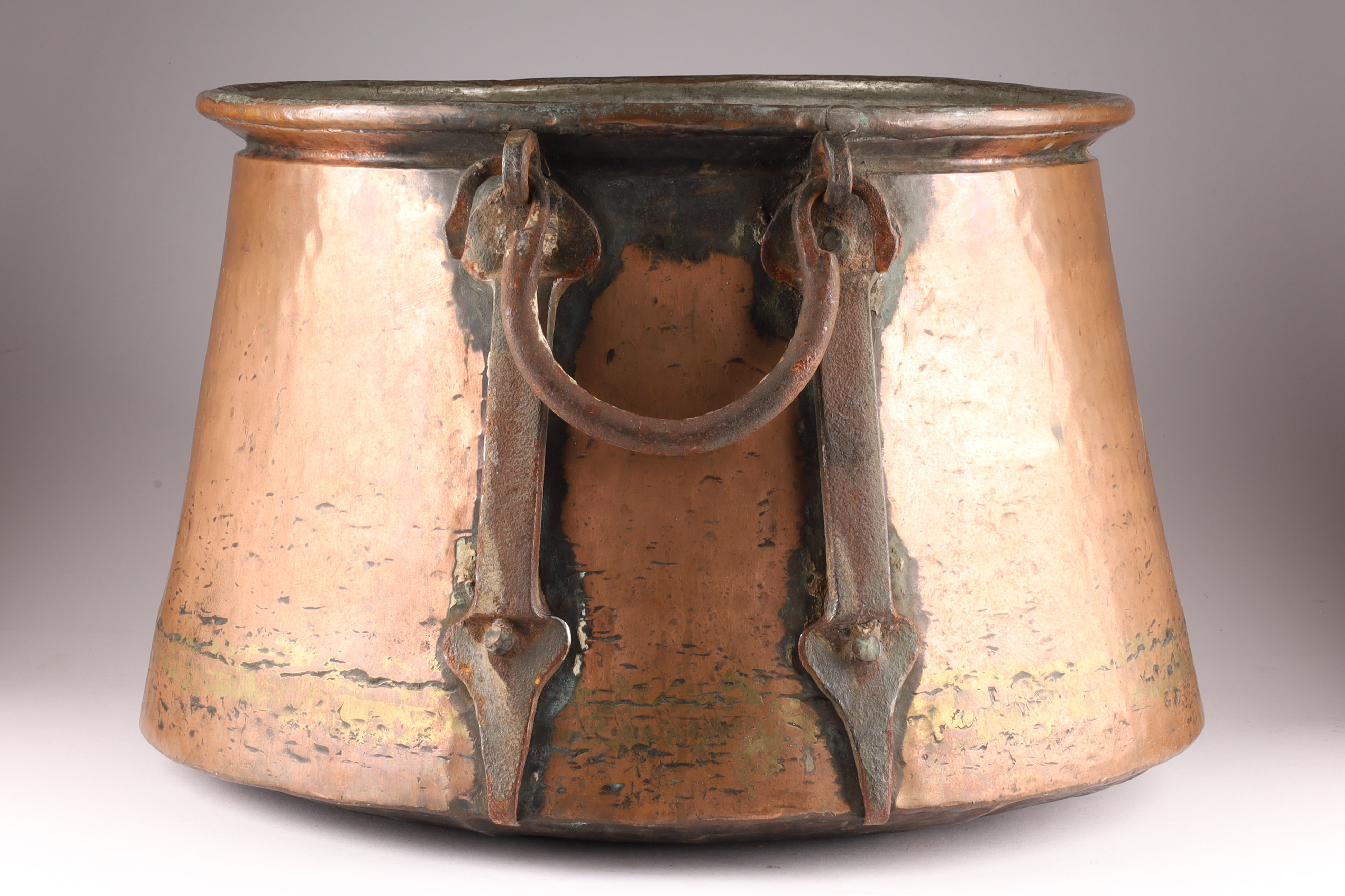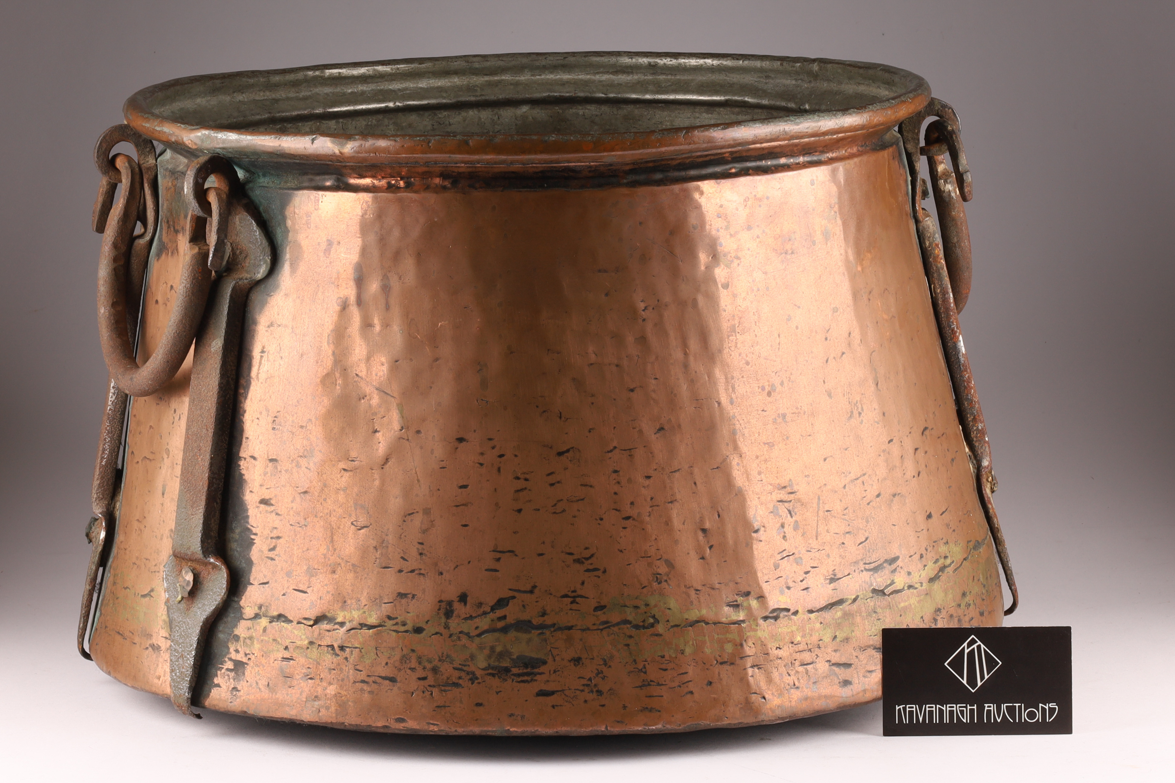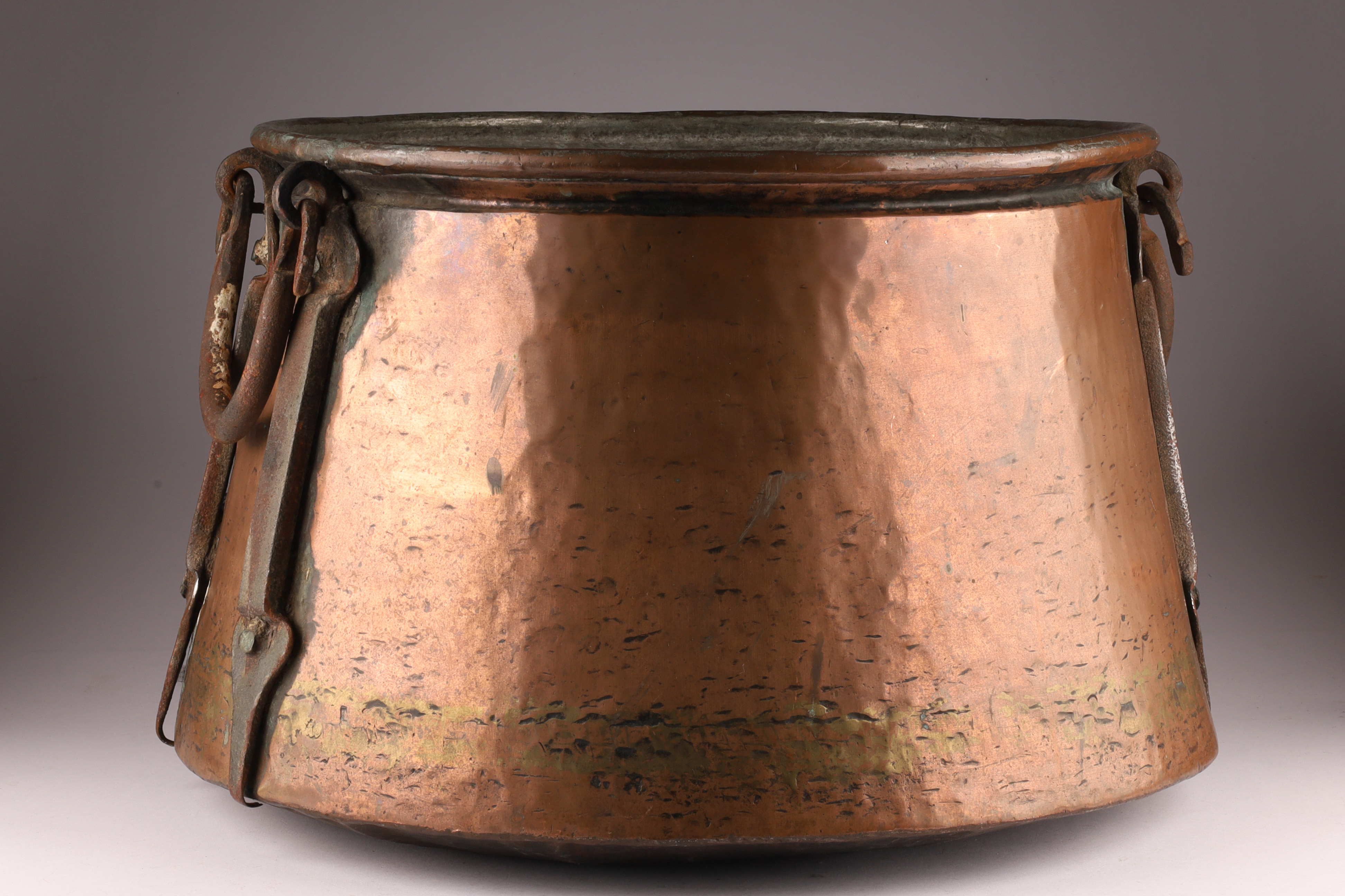Large Antique Hand Hammered Copper Cauldron with Iron Strapping. 11.5 inches H x 17.5 W.