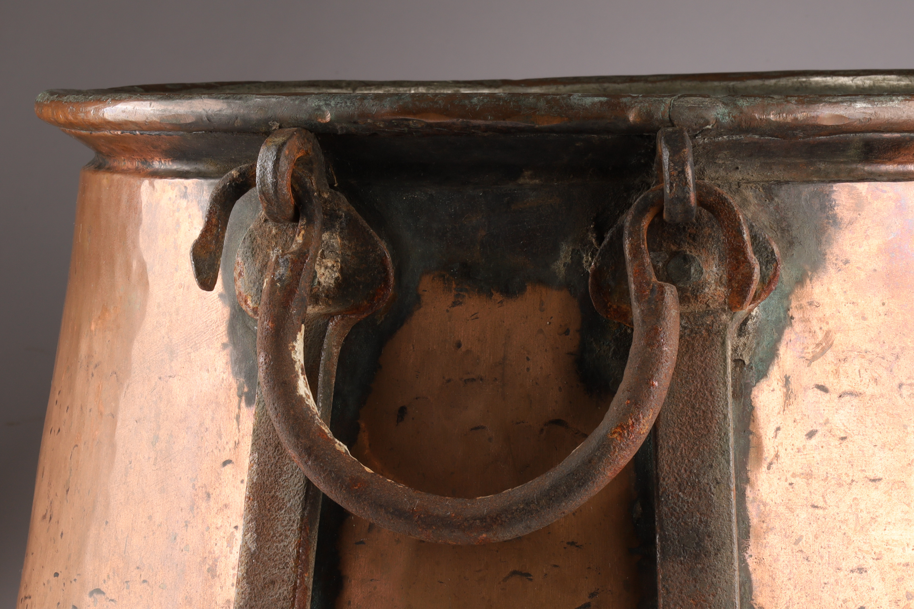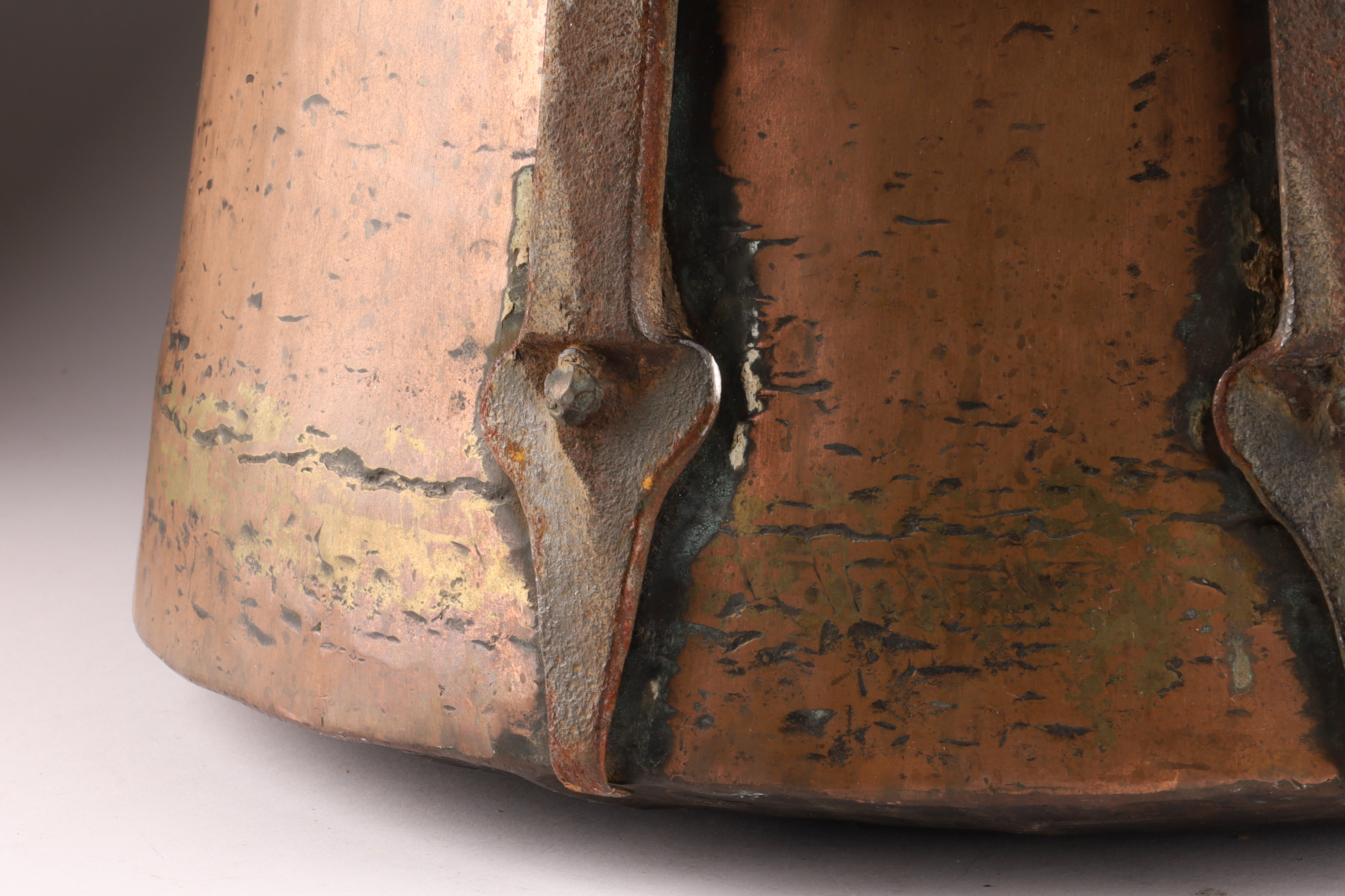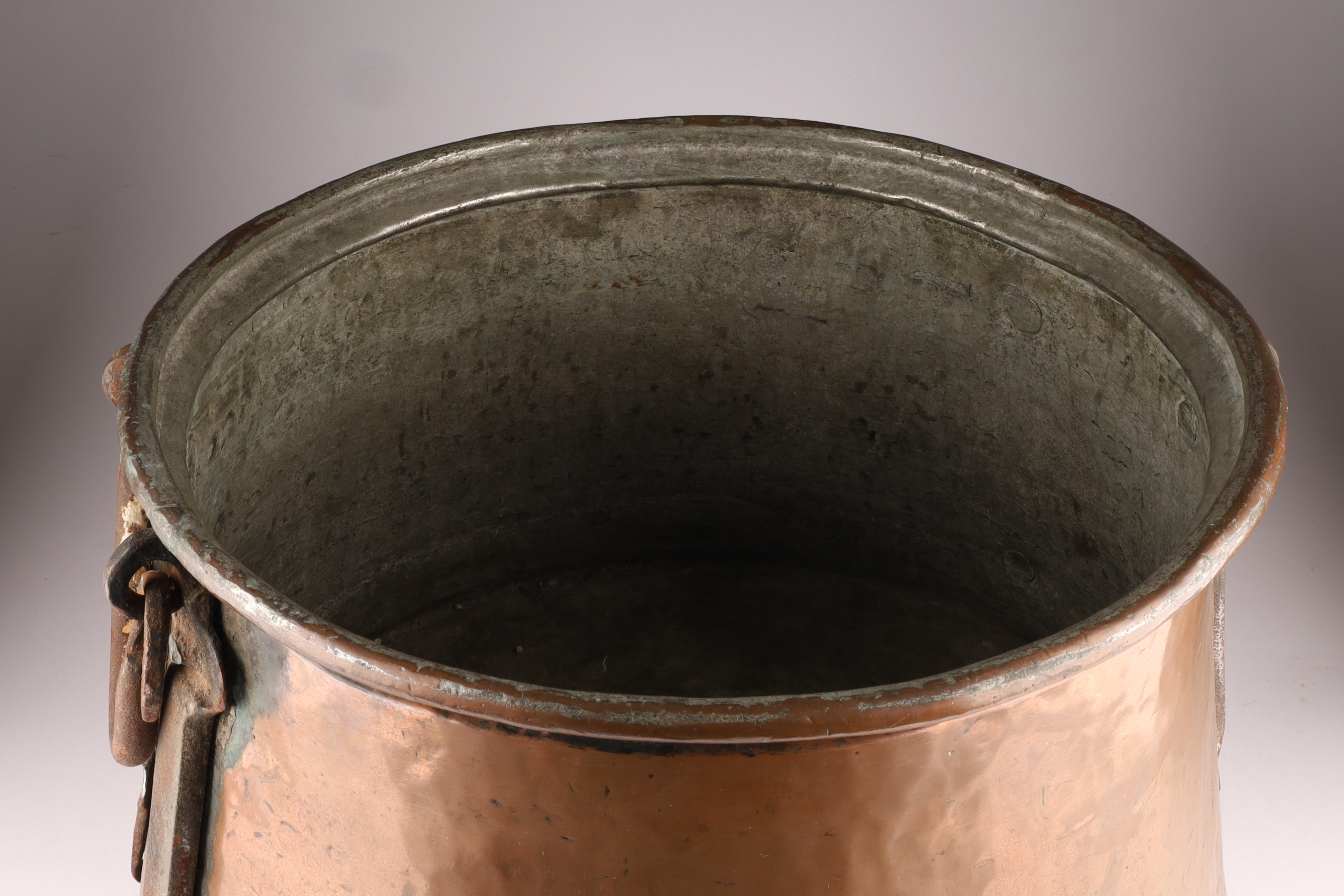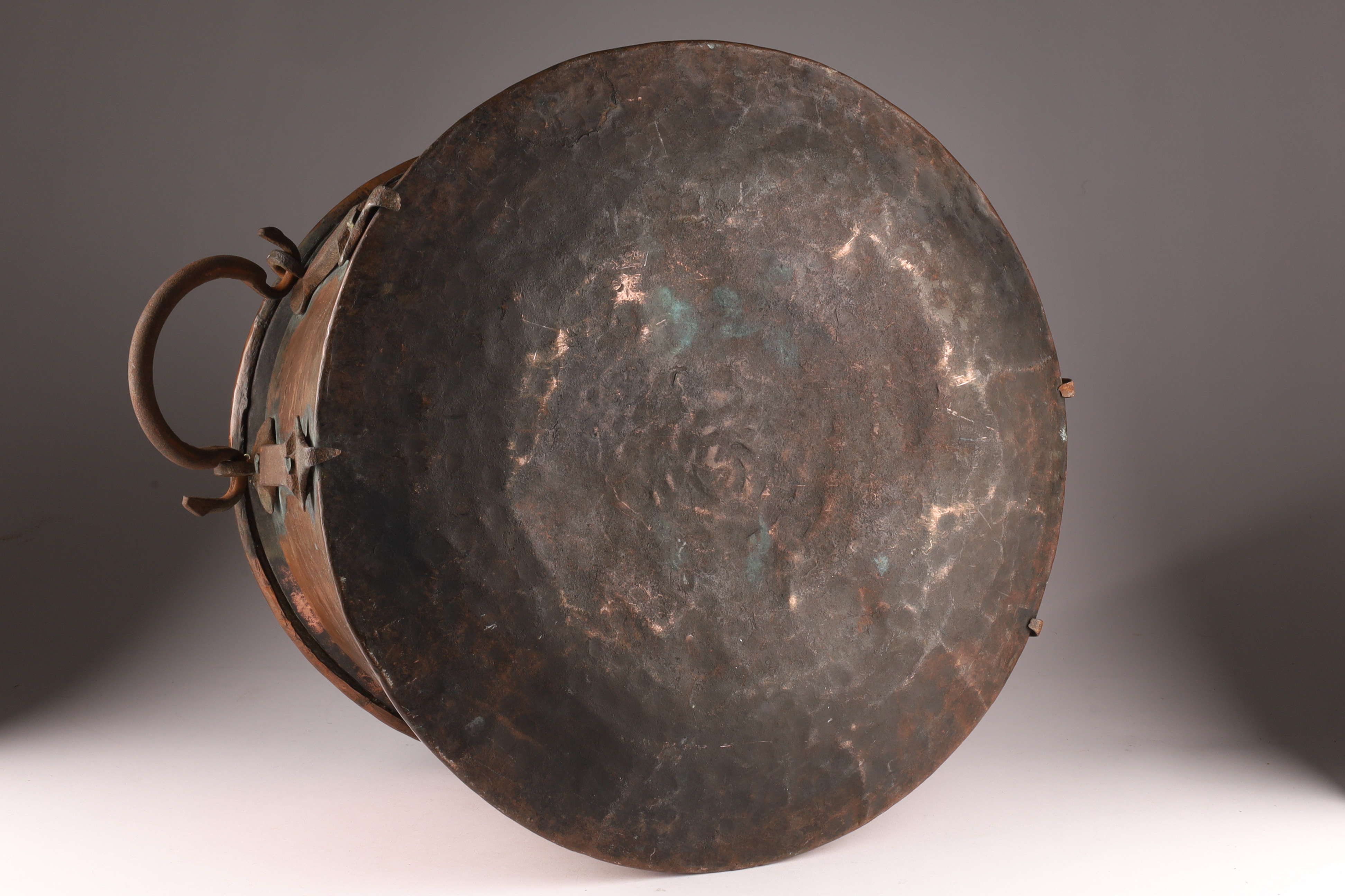 Large Antique Hand Hammered Copper Cauldron with Iron Strapping. 11.5 inches H x 17.5 W.