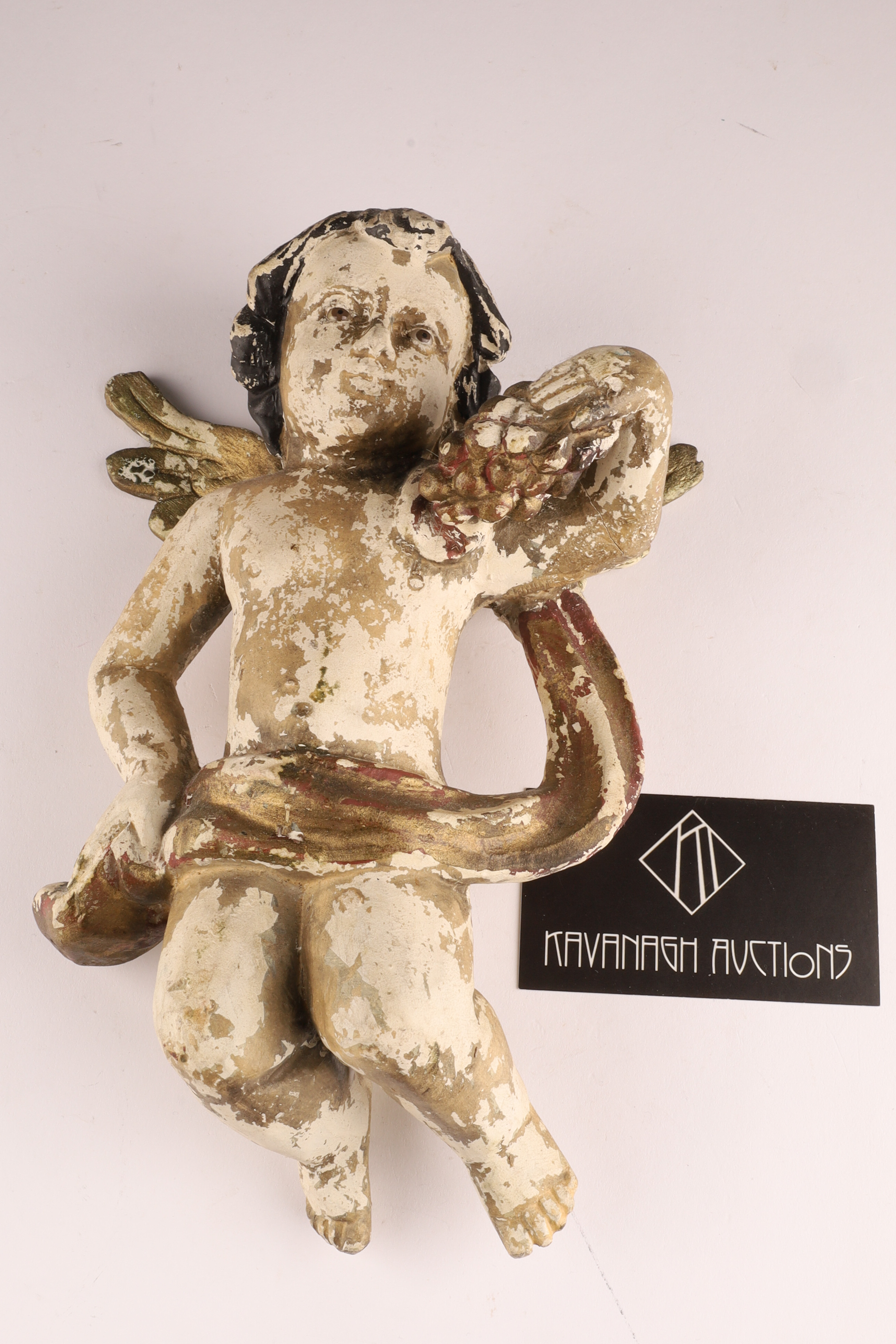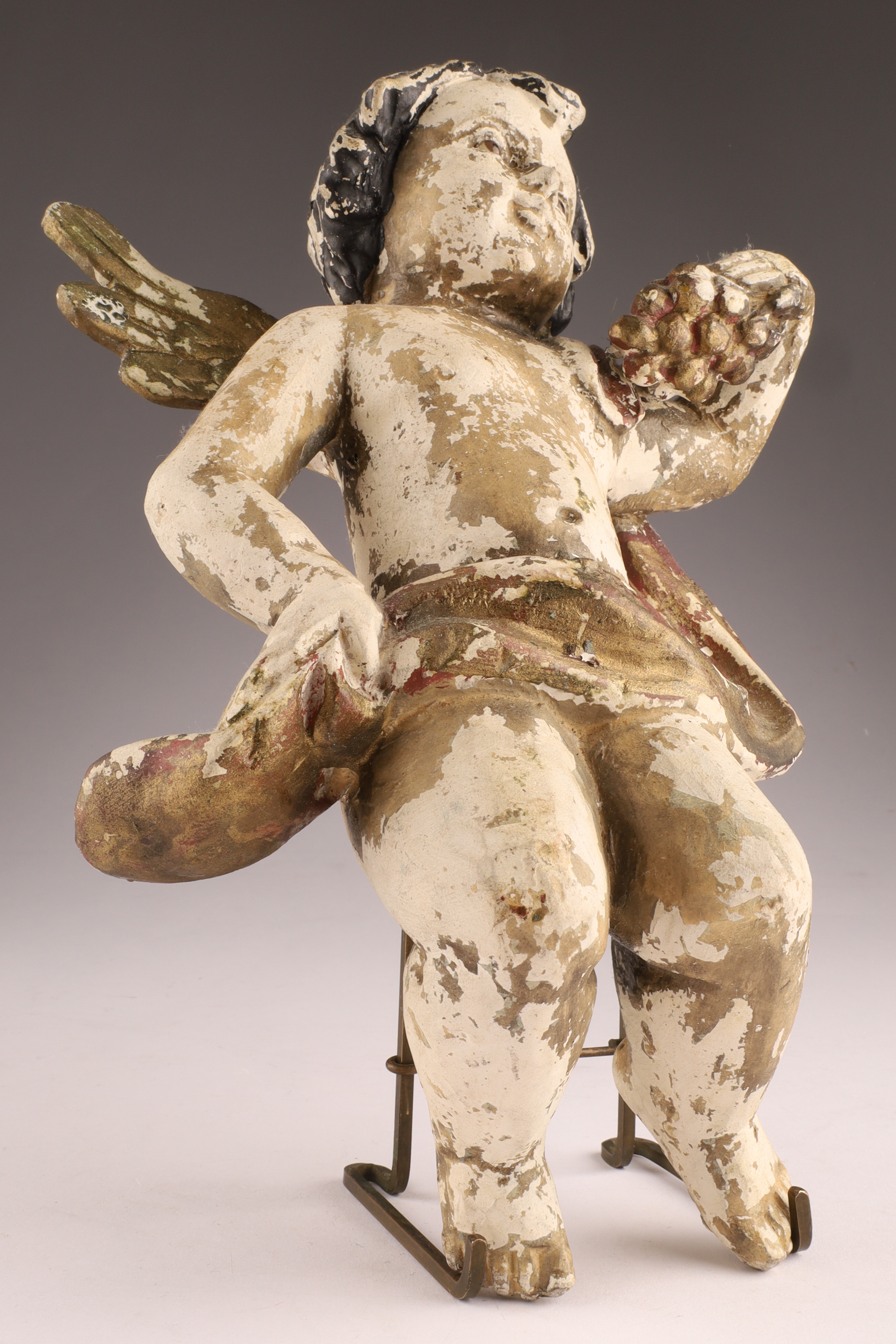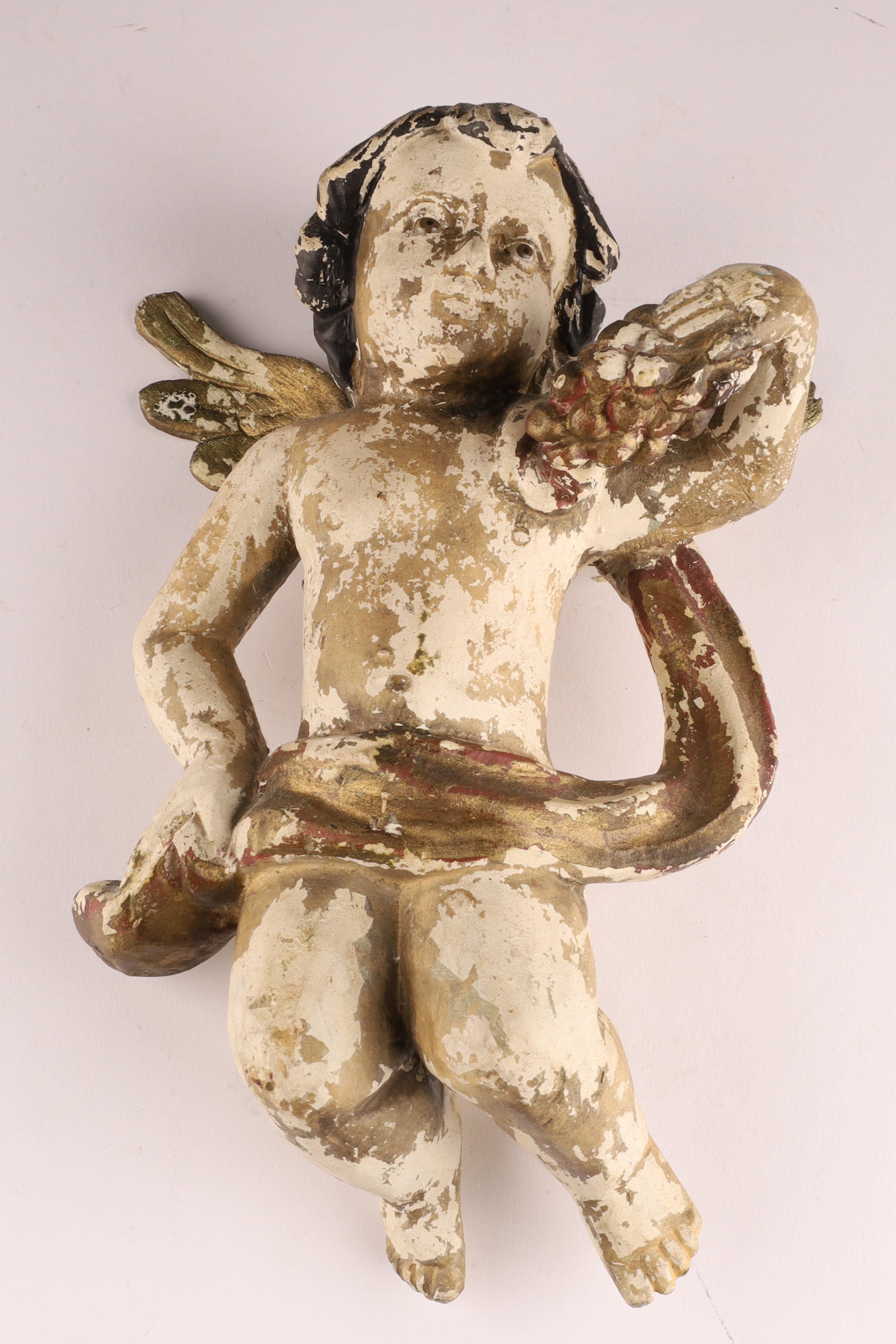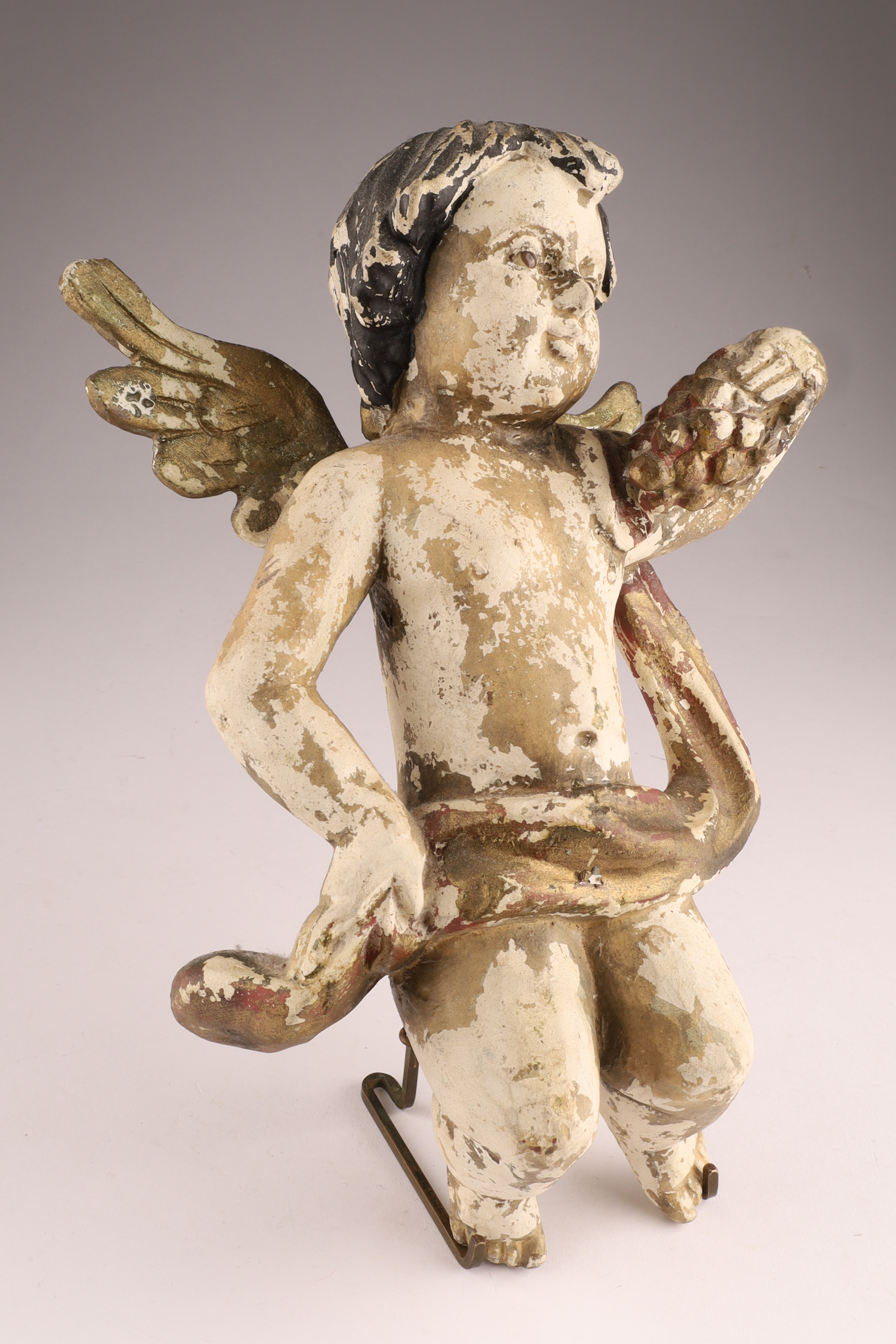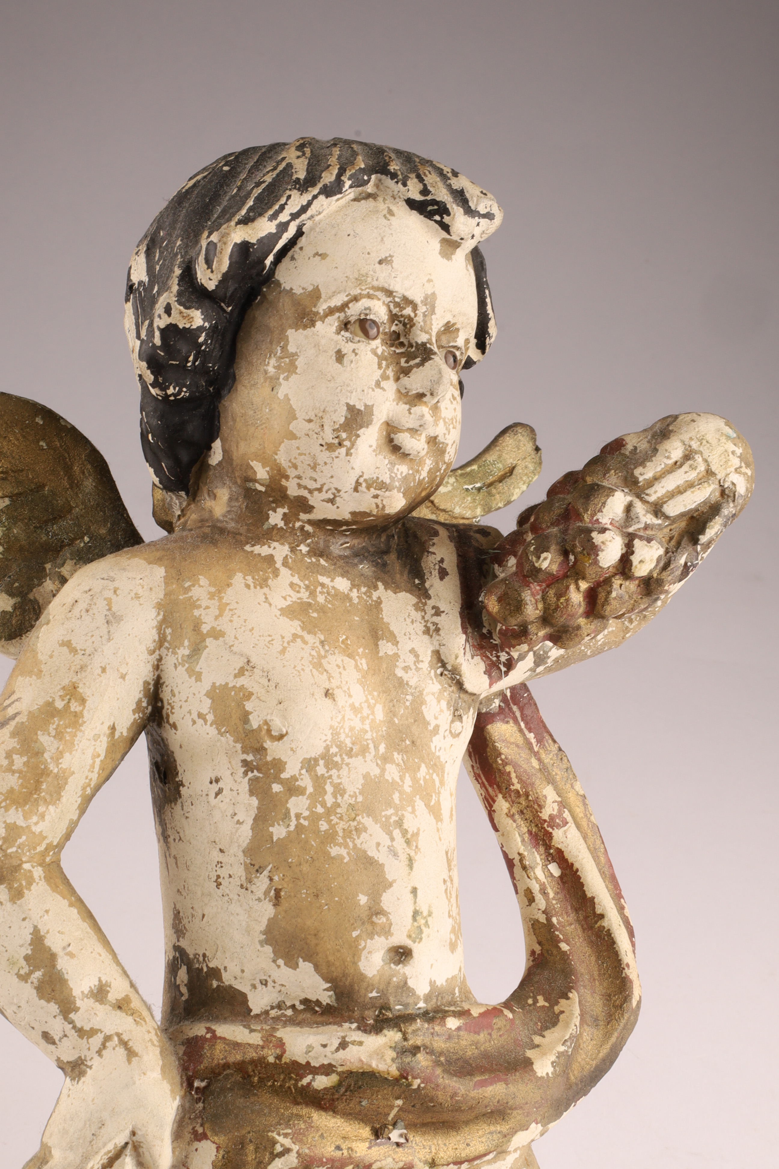 Antique Spanish Santos Wood Hand Carved Polychrome Putti Cherub holding grapes and garment with glass eyes. Restoration to wings, loss to paint as shown. Measuring 10 inches H x 7 W.