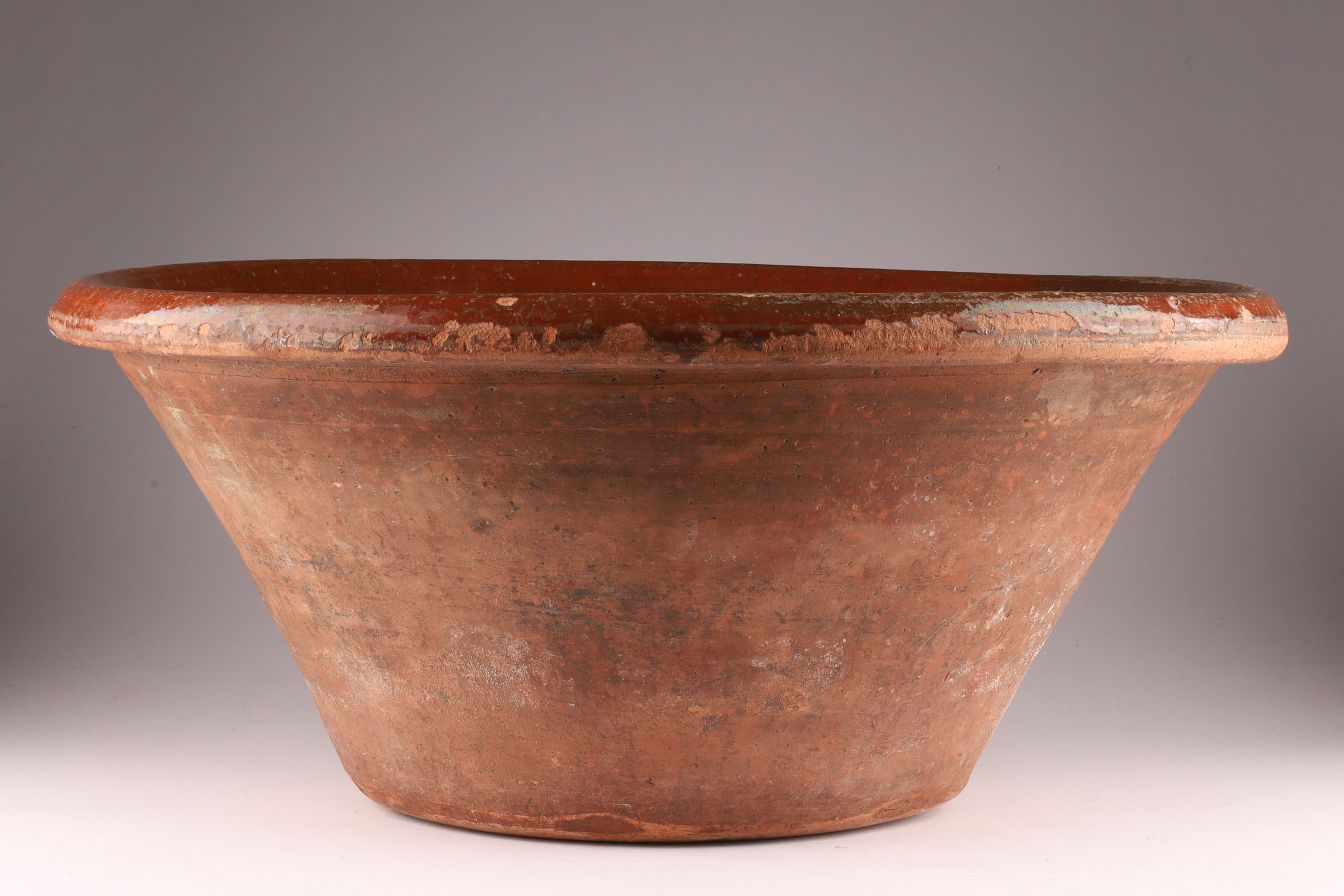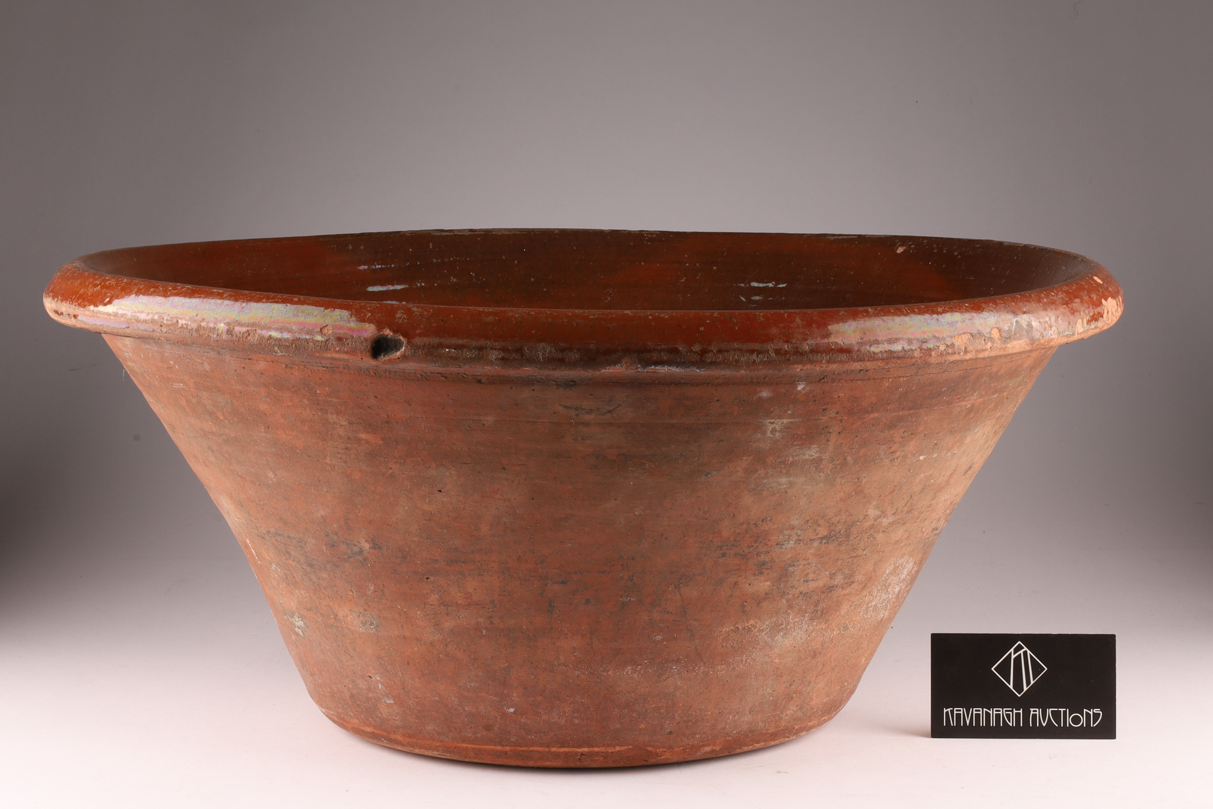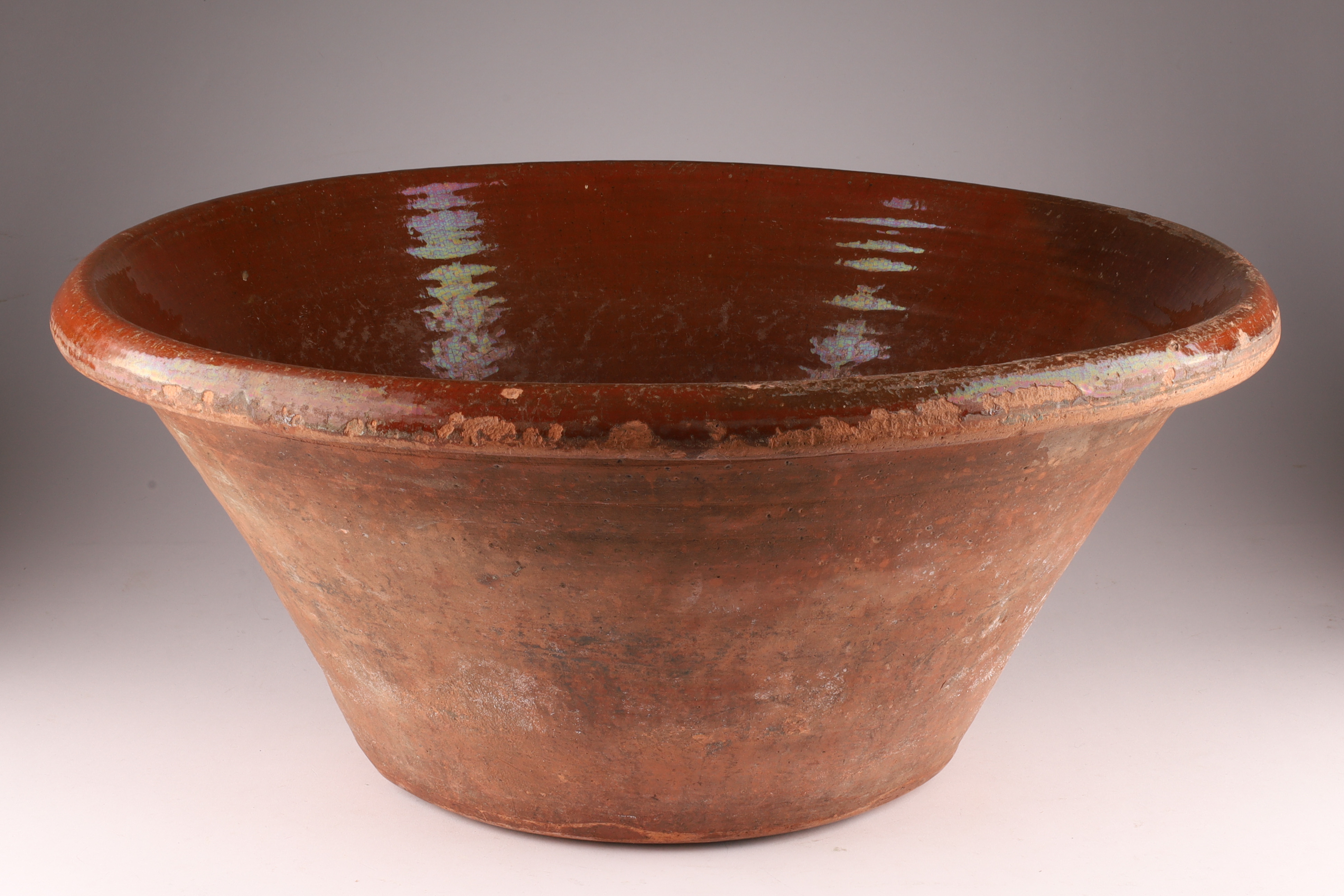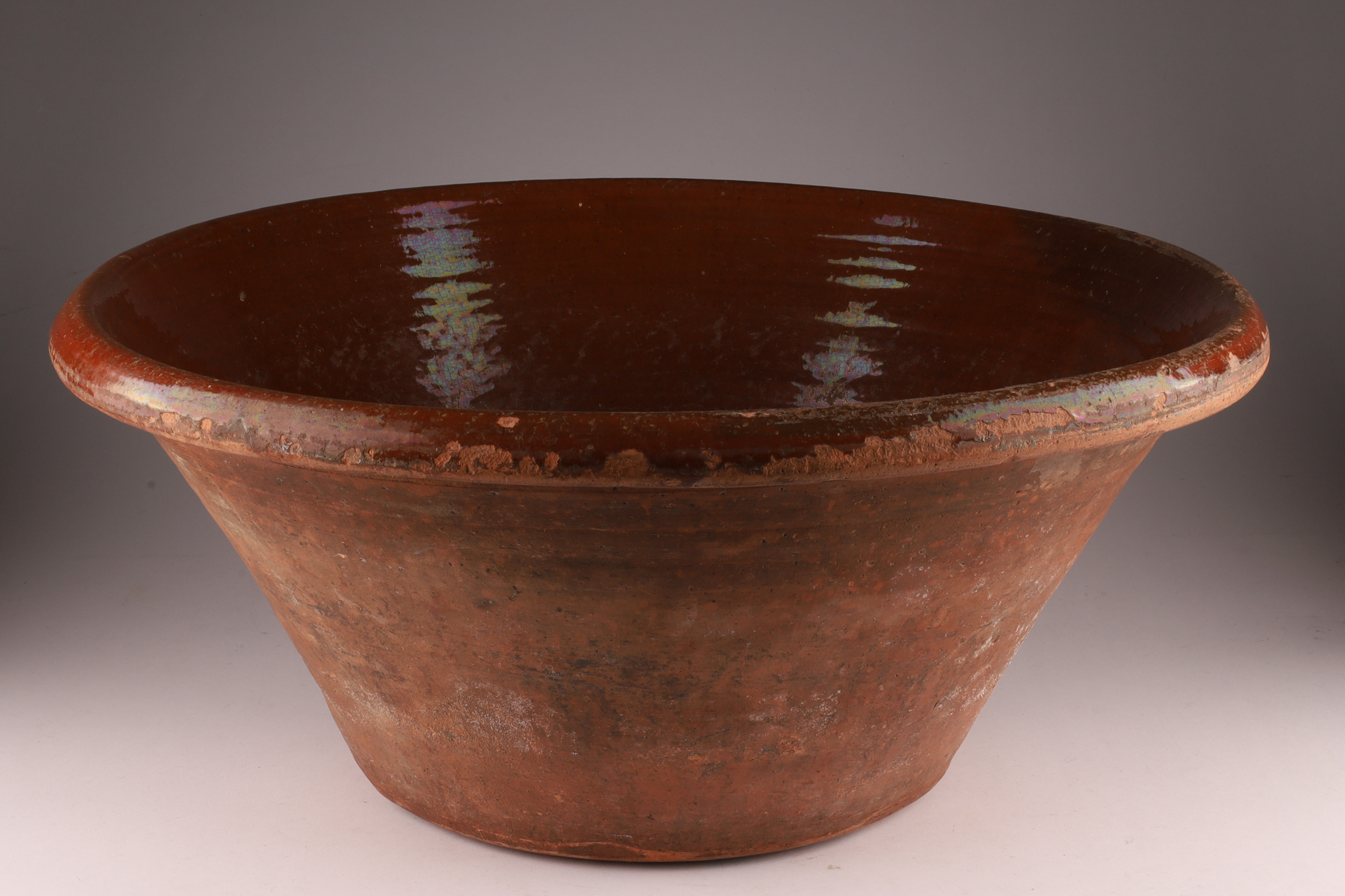 Monumental 19th C. French Glazed Terracotta Dairy Bowl, measuring 9 inches H x 21 W.