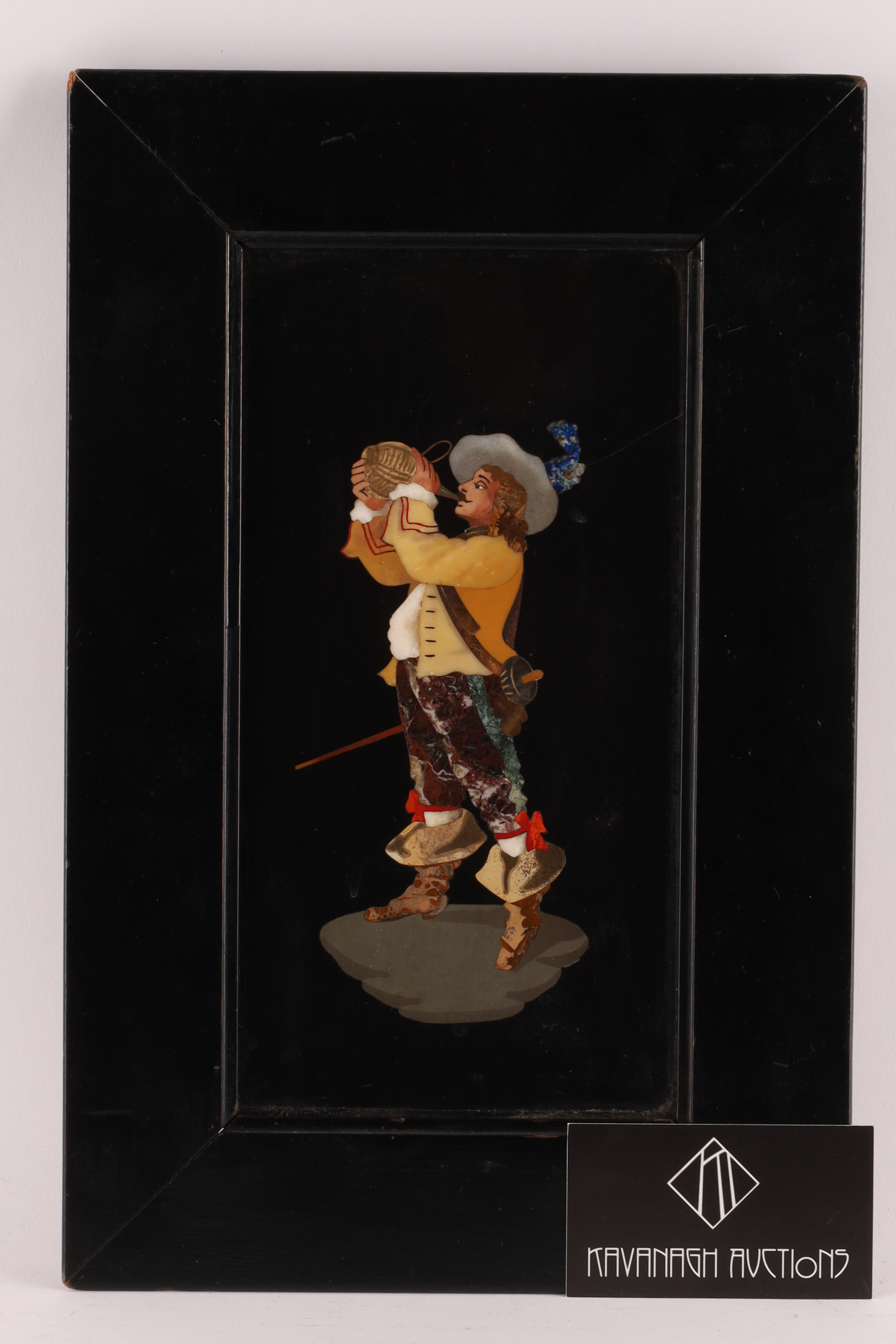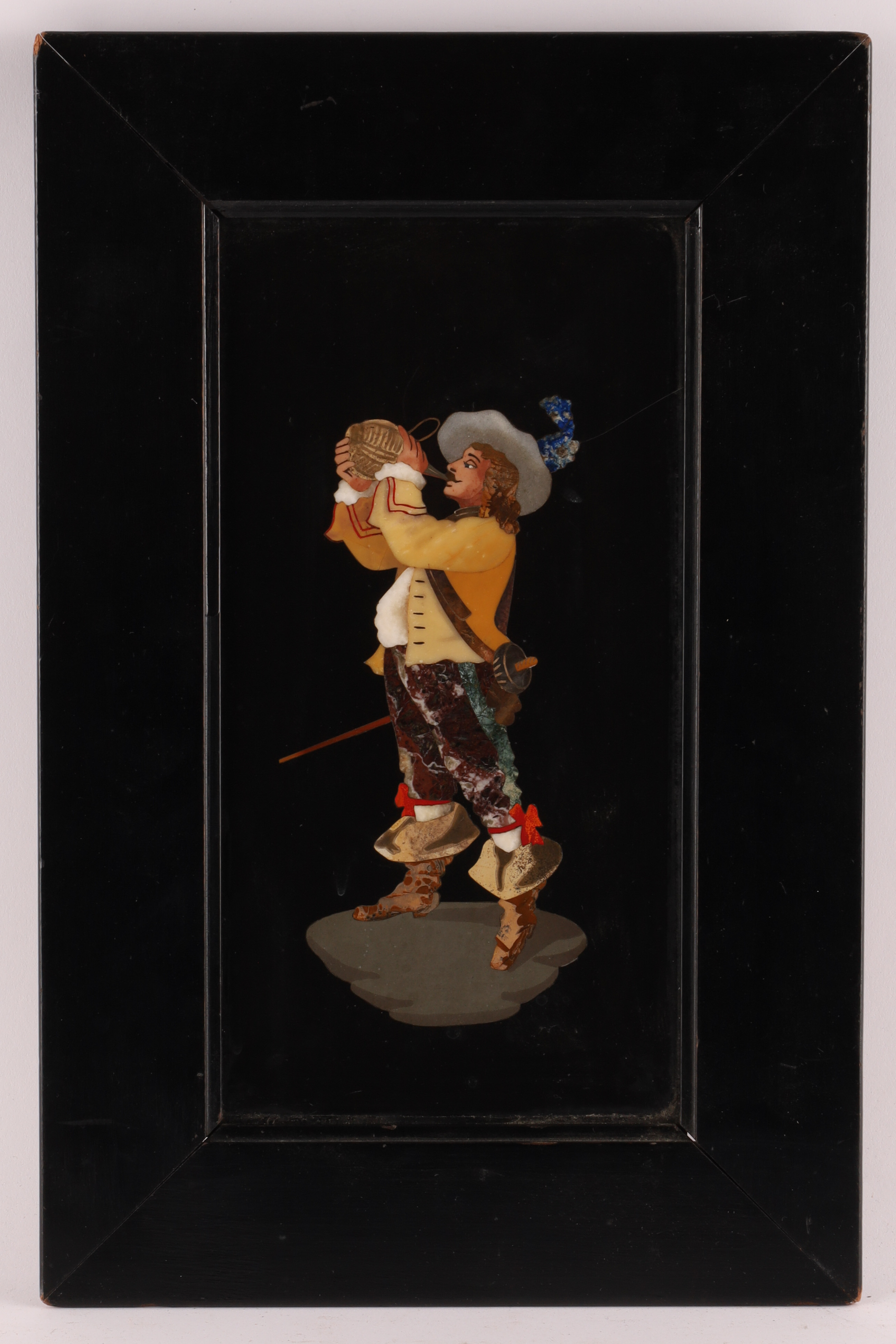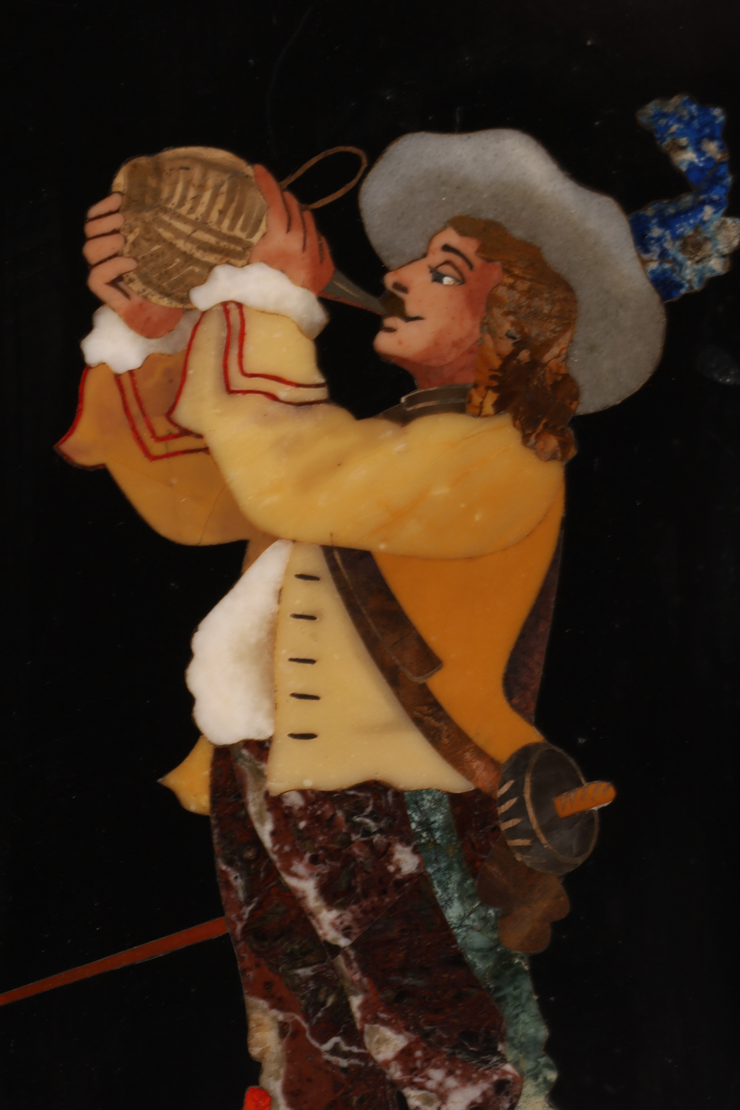 A finely composed Florentine pietra dura hardstone inlay depicting a cavalier drinking from a flask, set against a black slate ground. Richly colored marbles and hardstones form the trousers and accessories, with painted stone highlights typical of late 19th-early 20th century workmanship.