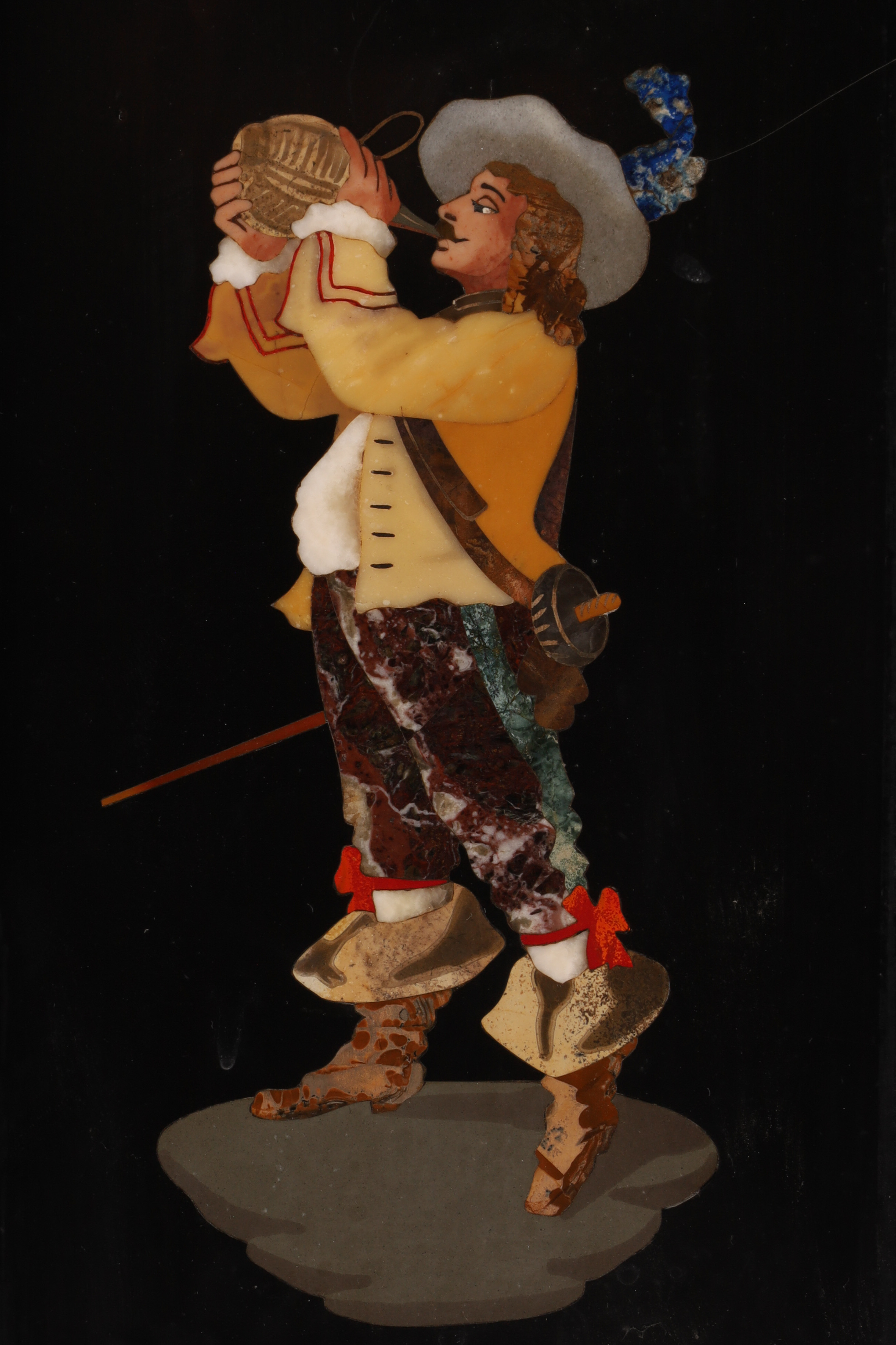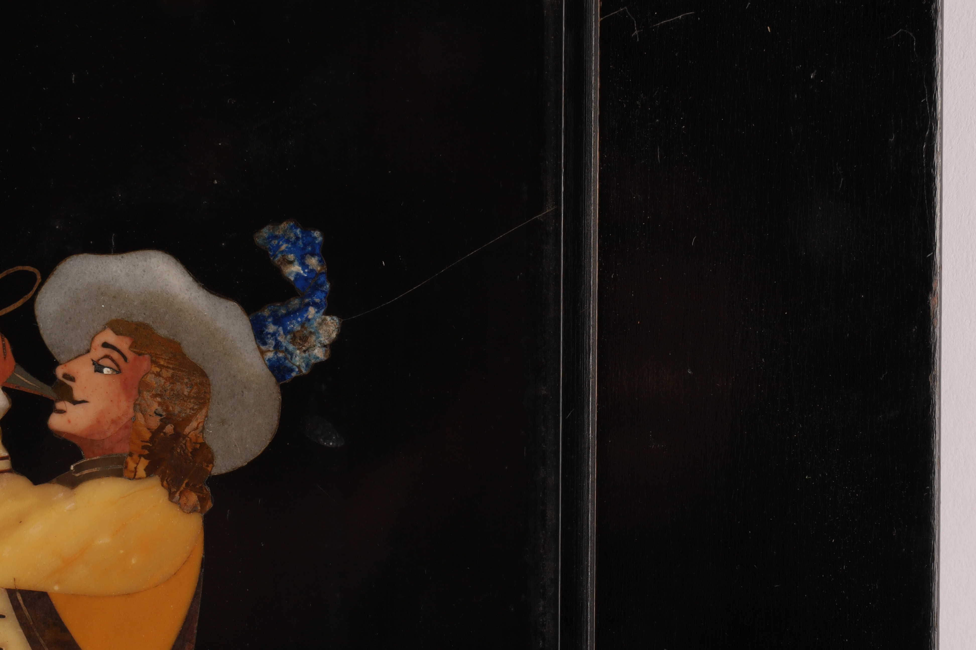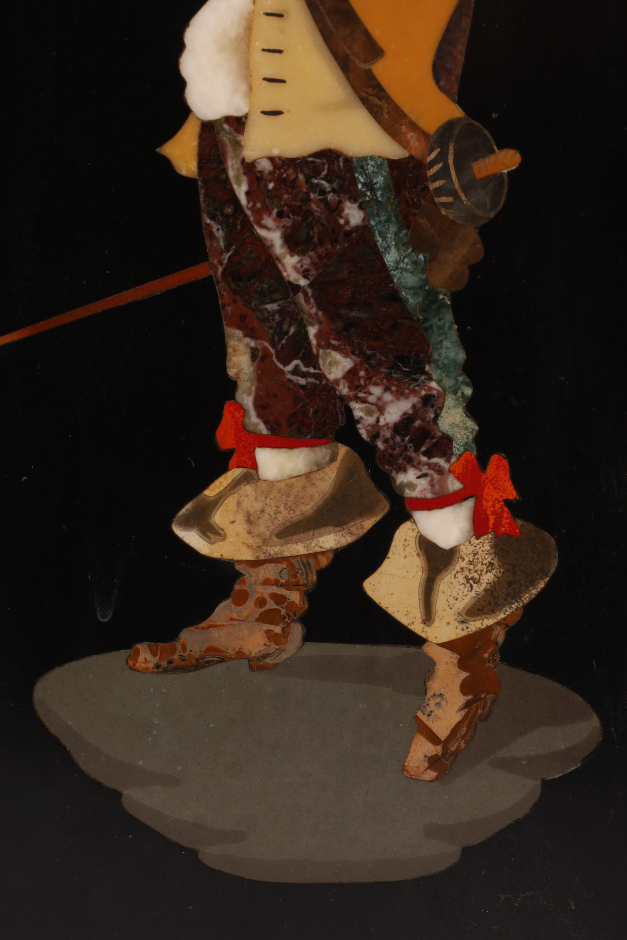 A finely composed Florentine pietra dura hardstone inlay depicting a cavalier drinking from a flask, set against a black slate ground. Richly colored marbles and hardstones form the trousers and accessories, with painted stone highlights typical of late 19th-early 20th century workmanship.
