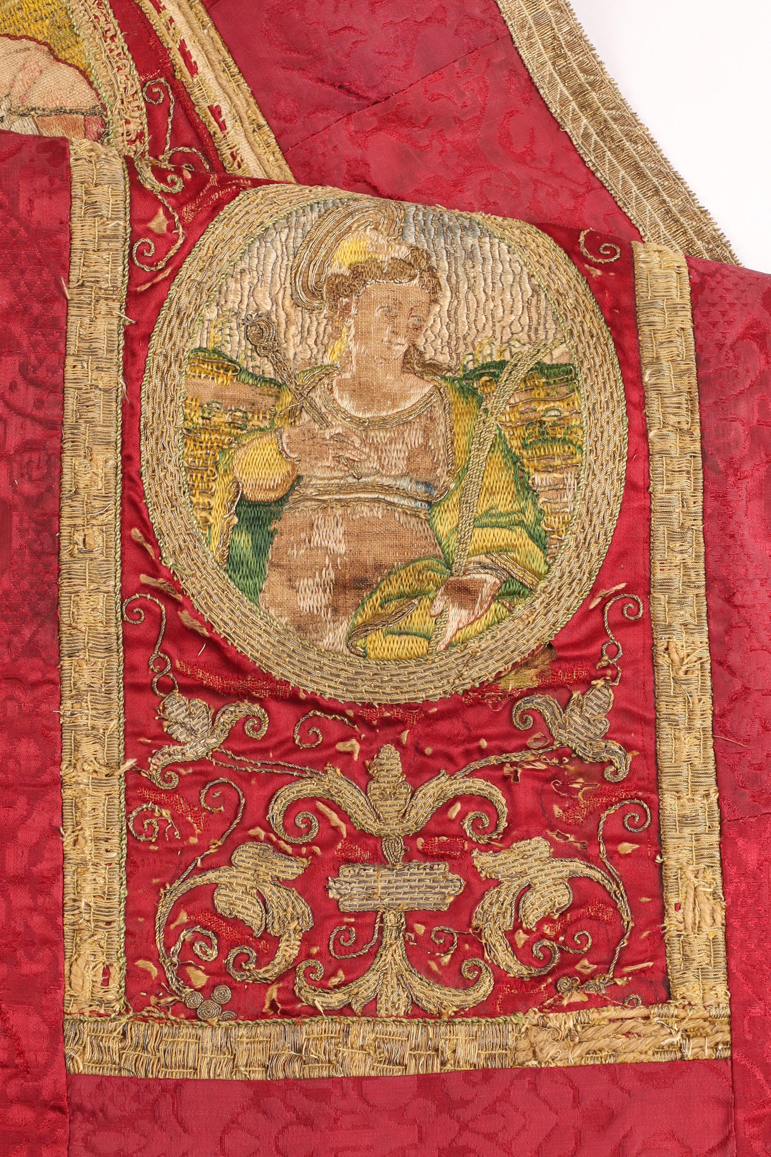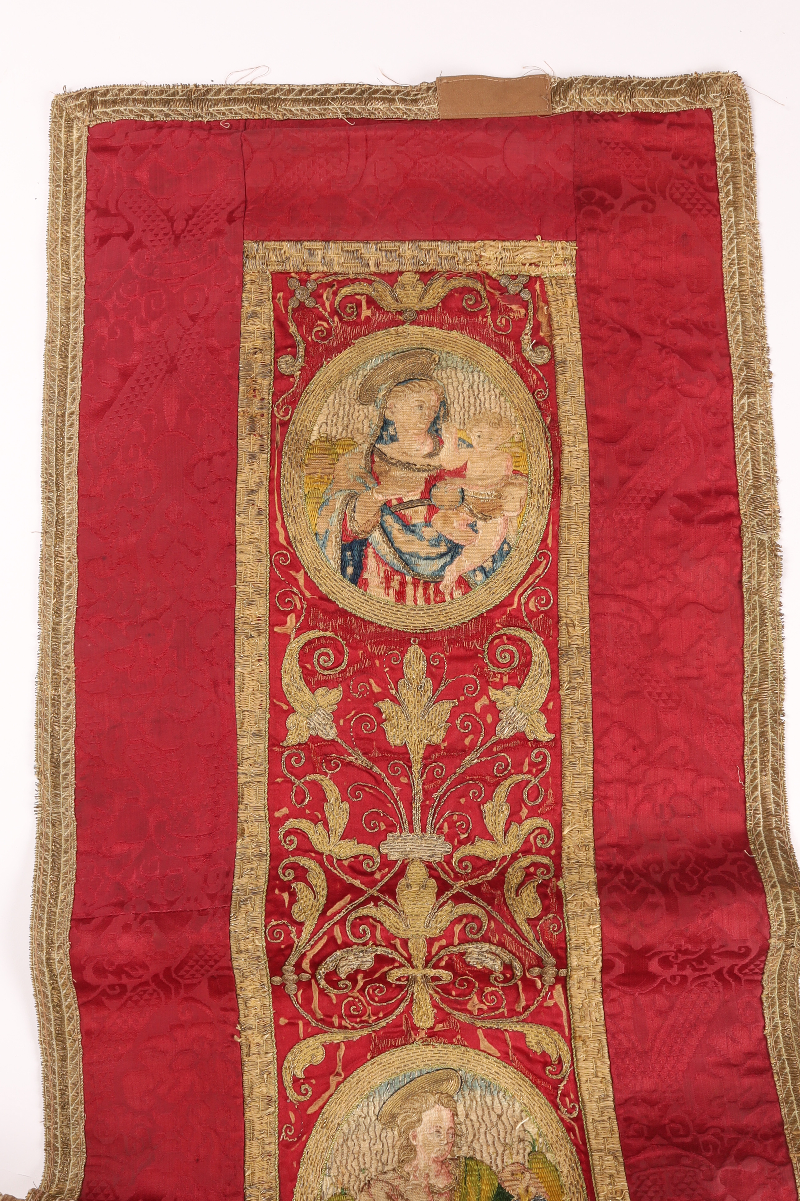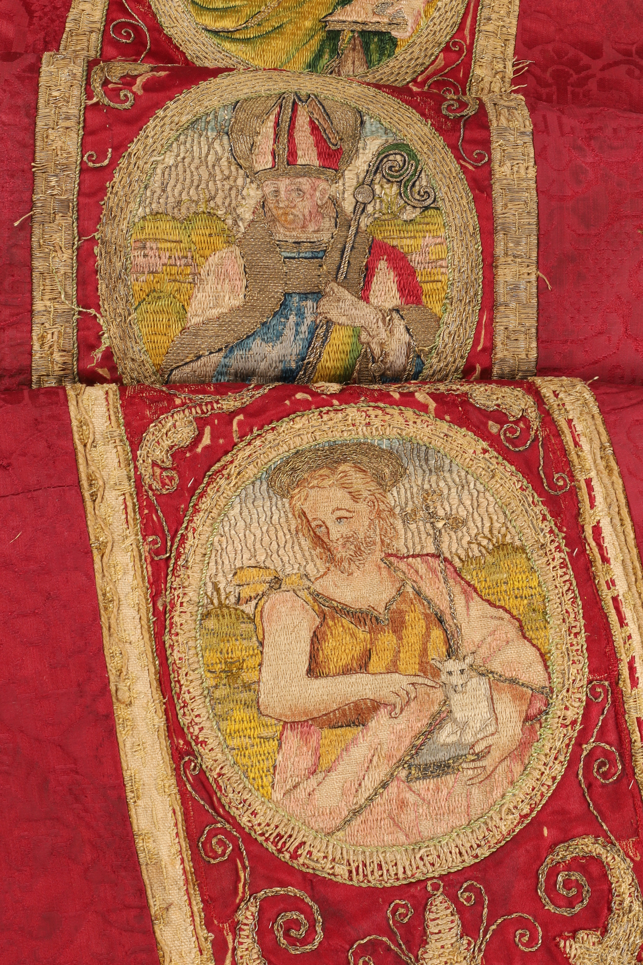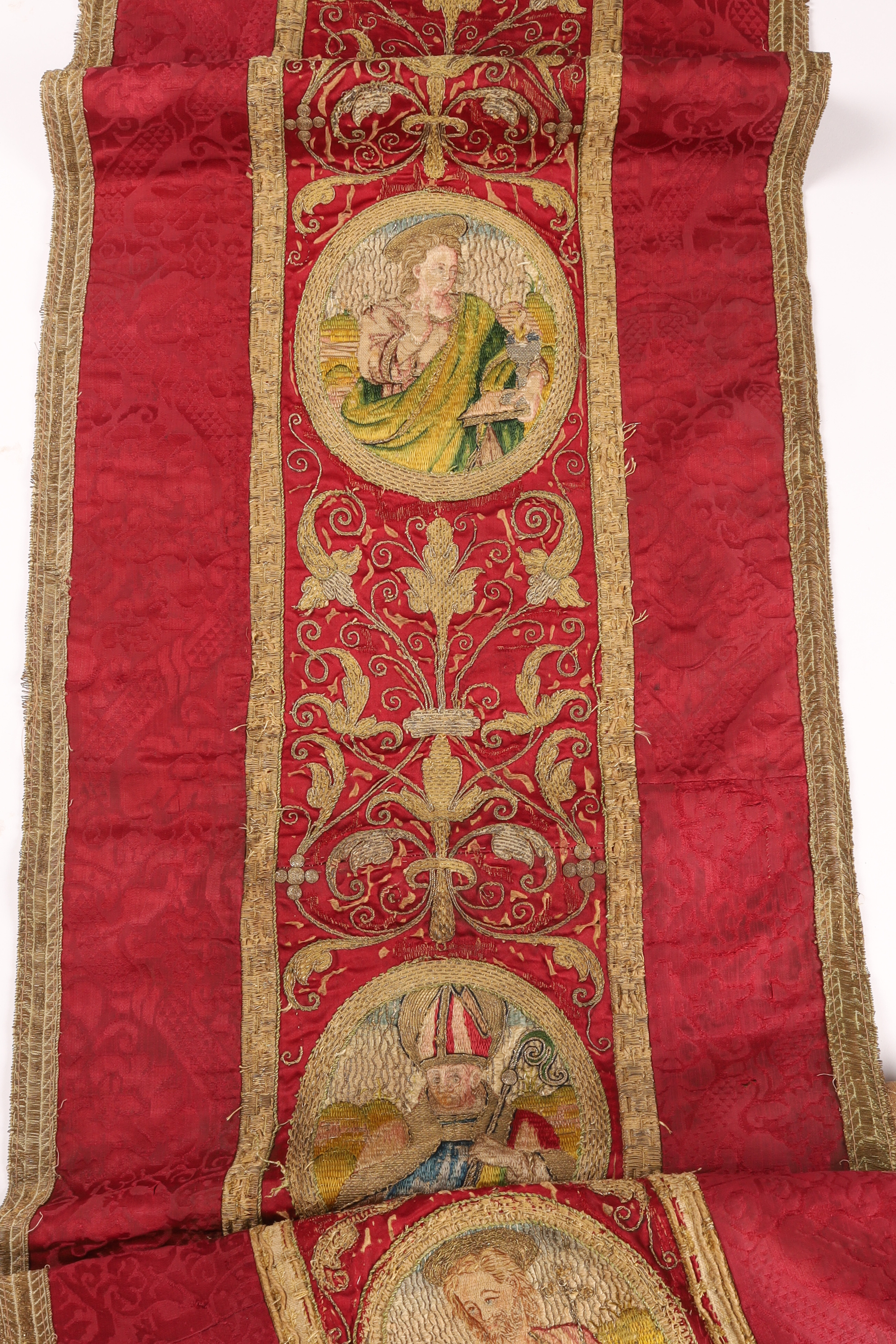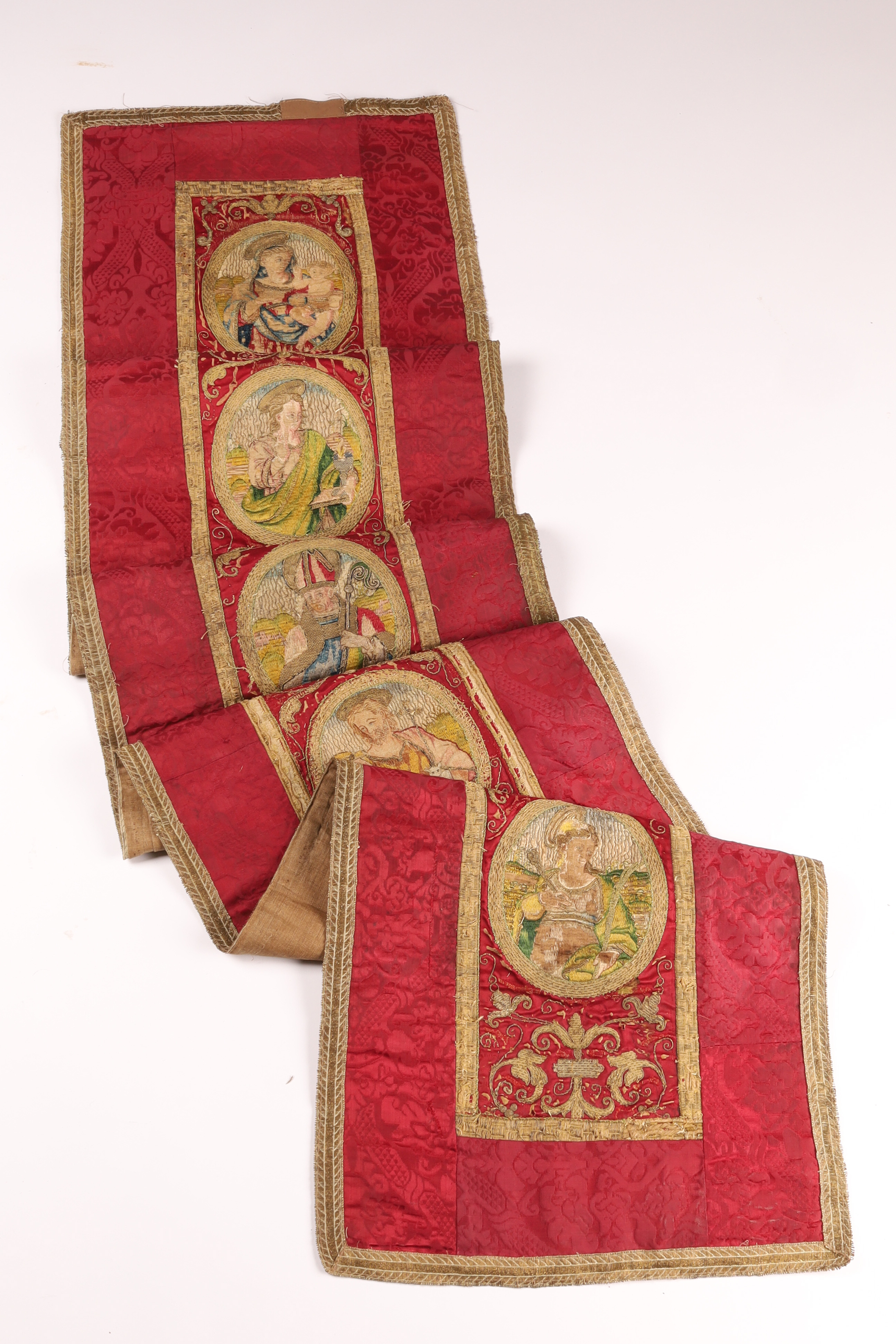 Crimson silk liturgical embroidery with gold metallic thread and a sequence of figural medallions, likely from a 19th-century altar frontal or processional banner. Rich giltwork scrolls and woven borders; scattered wear and small restorations.