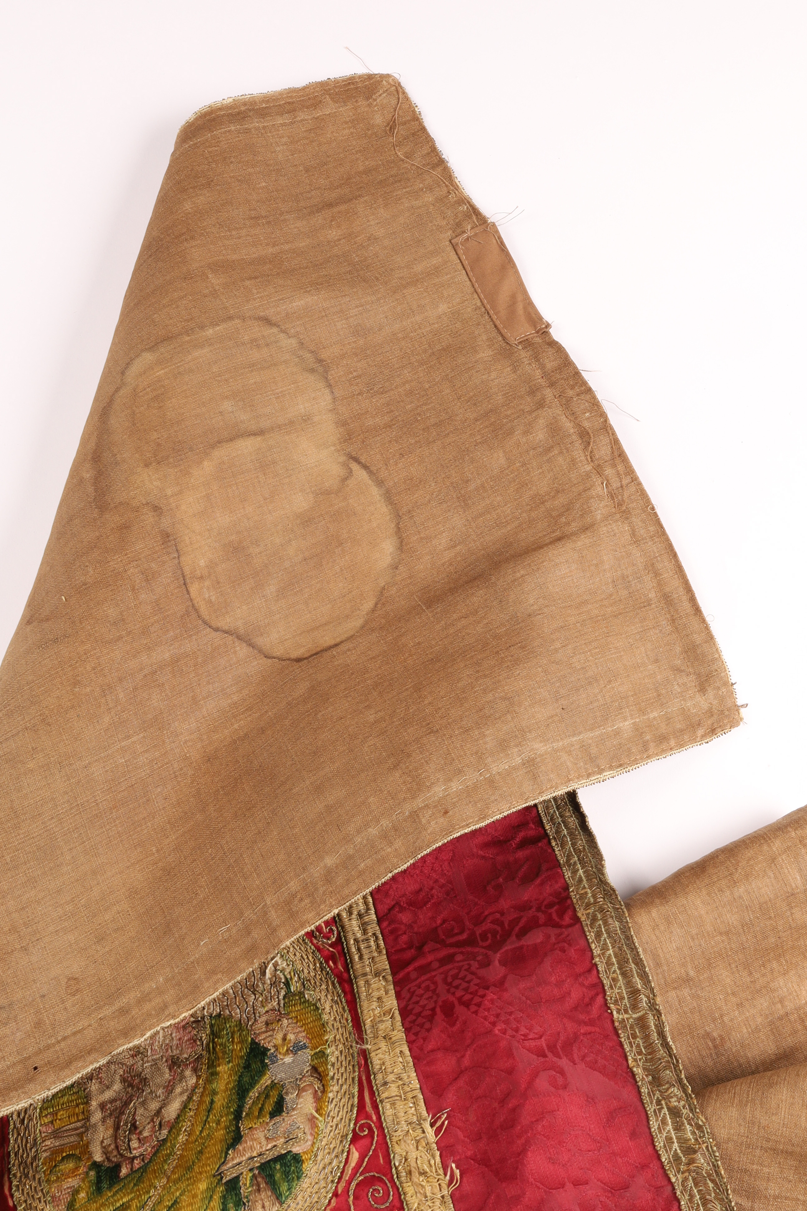Embroidered silk band with gilt-metal couching, raised work, and polychrome figural medallions. Originally part of a larger ecclesiastical textile (altar frontal or banner border). Mounted on later backing; expected age-related losses and minor stitched repairs. Approx. 16 × 88 inches overall. 19th-century Continental.