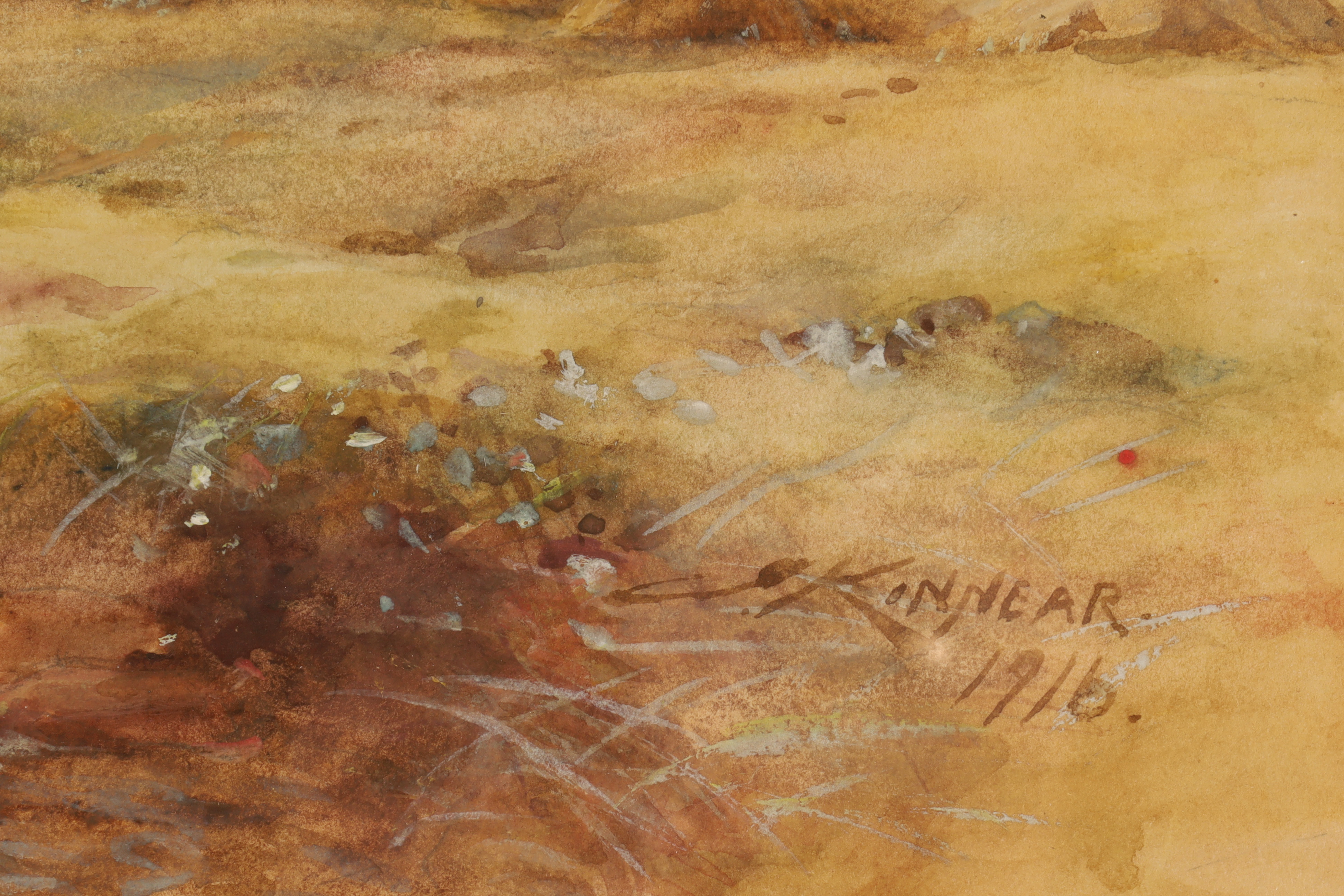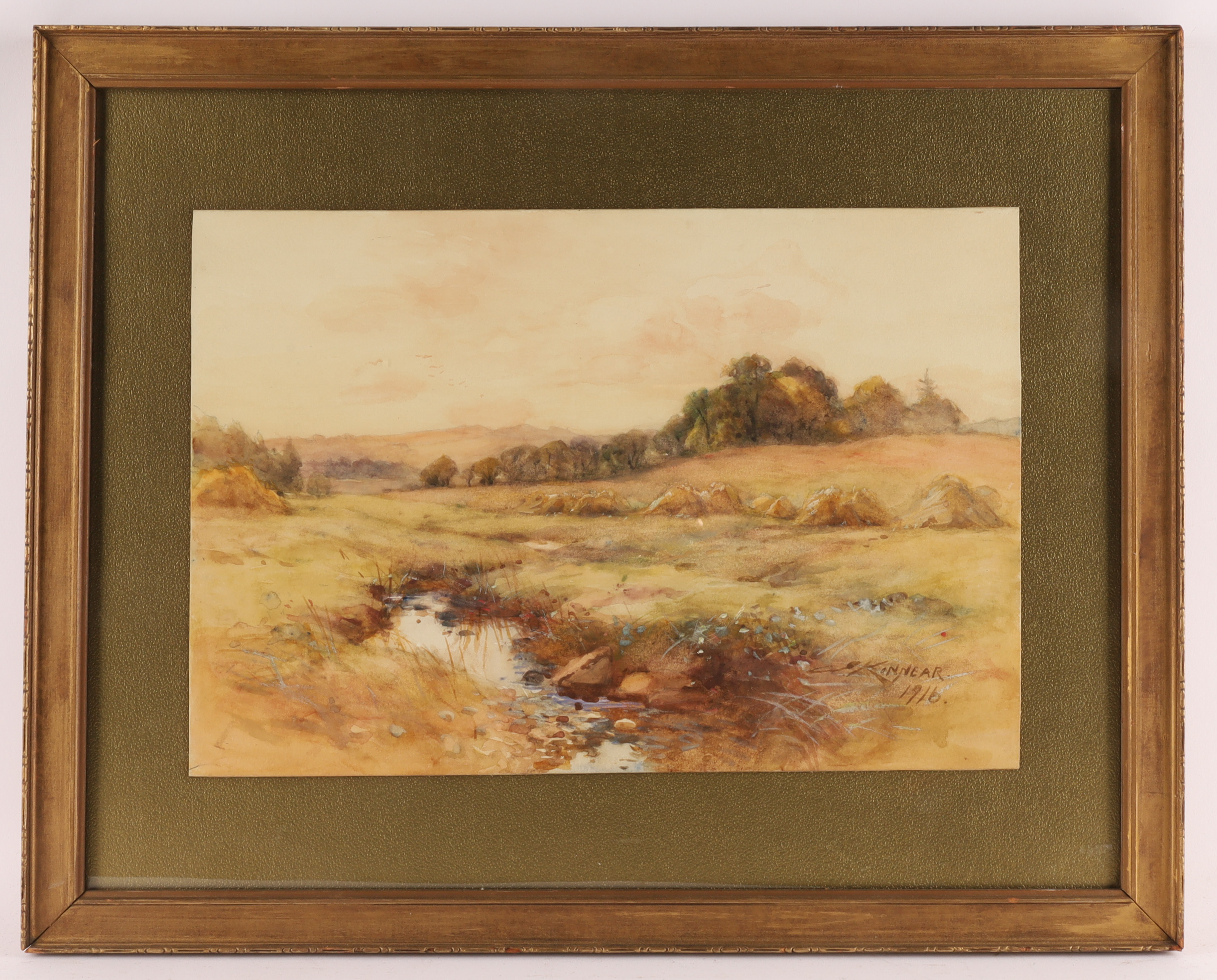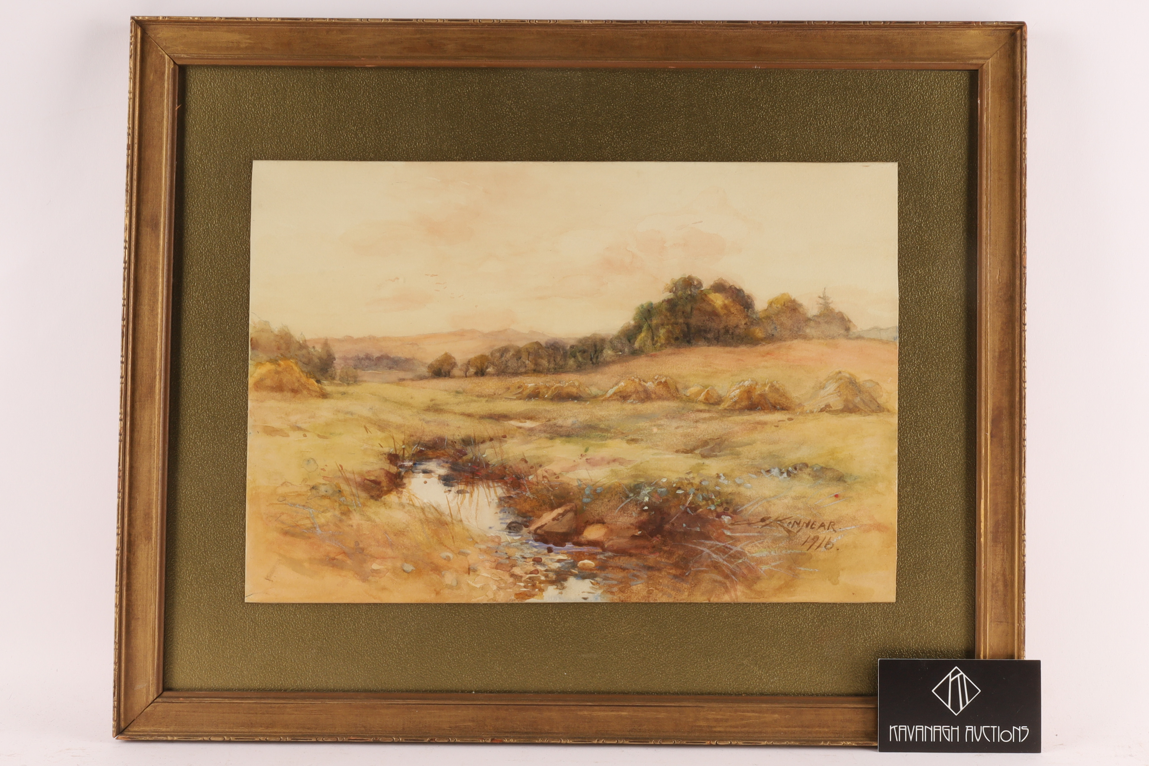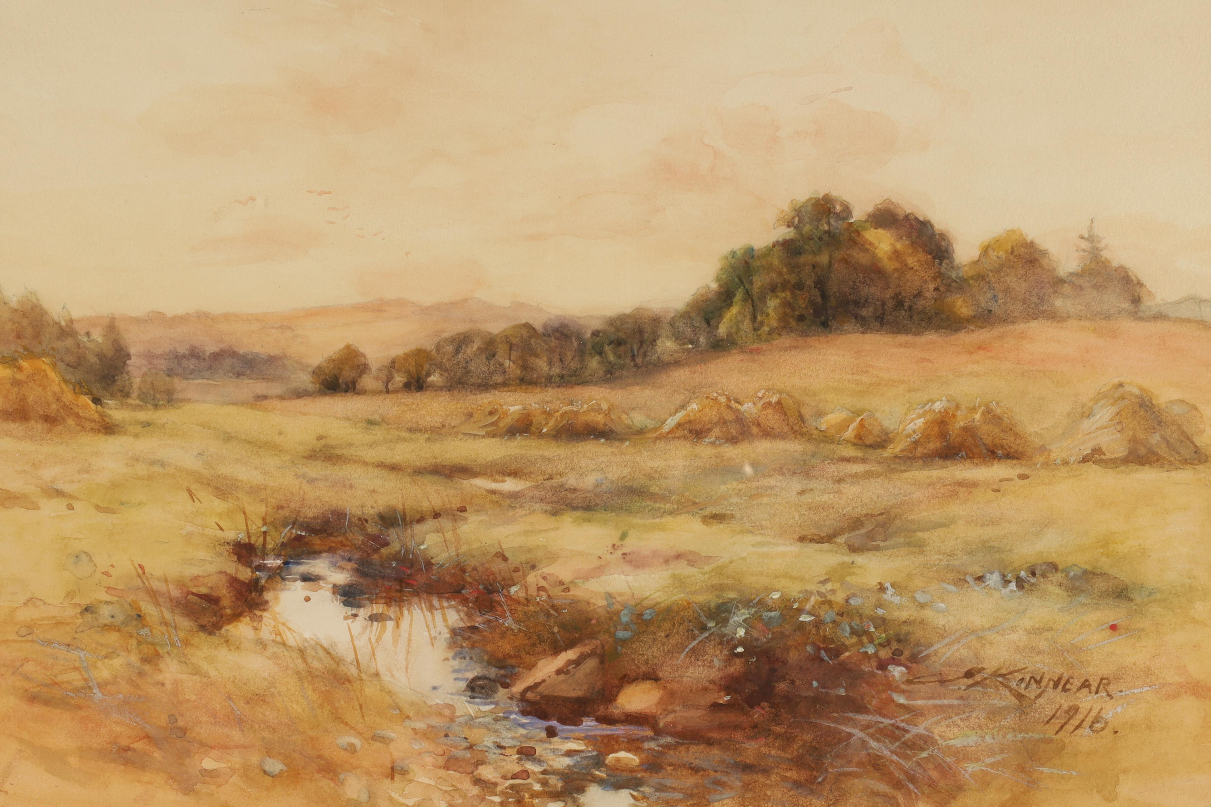 James Scott Kinnear (Scottish, 1846-1917) Watercolour Landscape of a Field, signed and dated 1916. Image measures 10 inches H x 14 W, frame measures 16 x 20 inches.