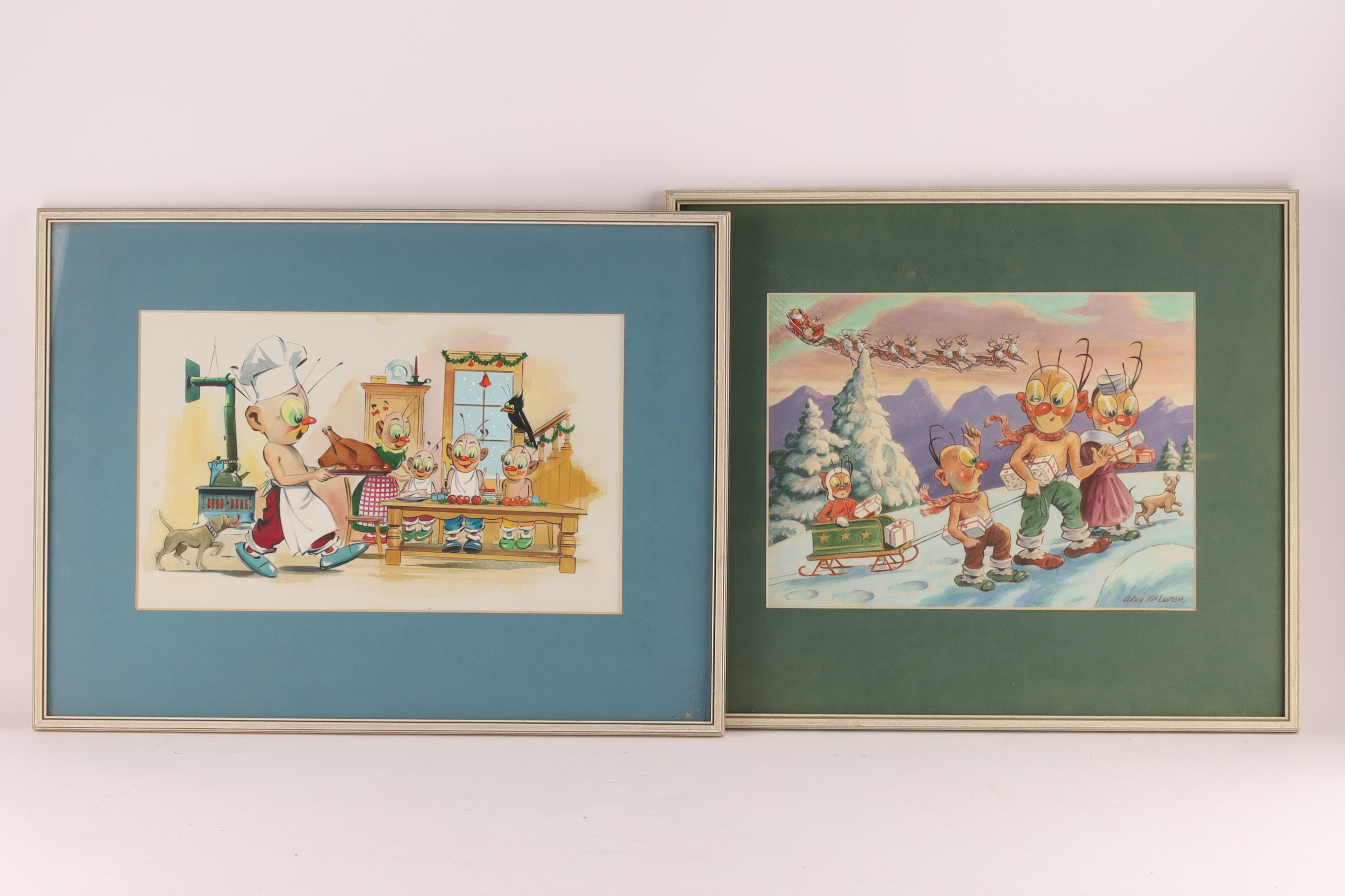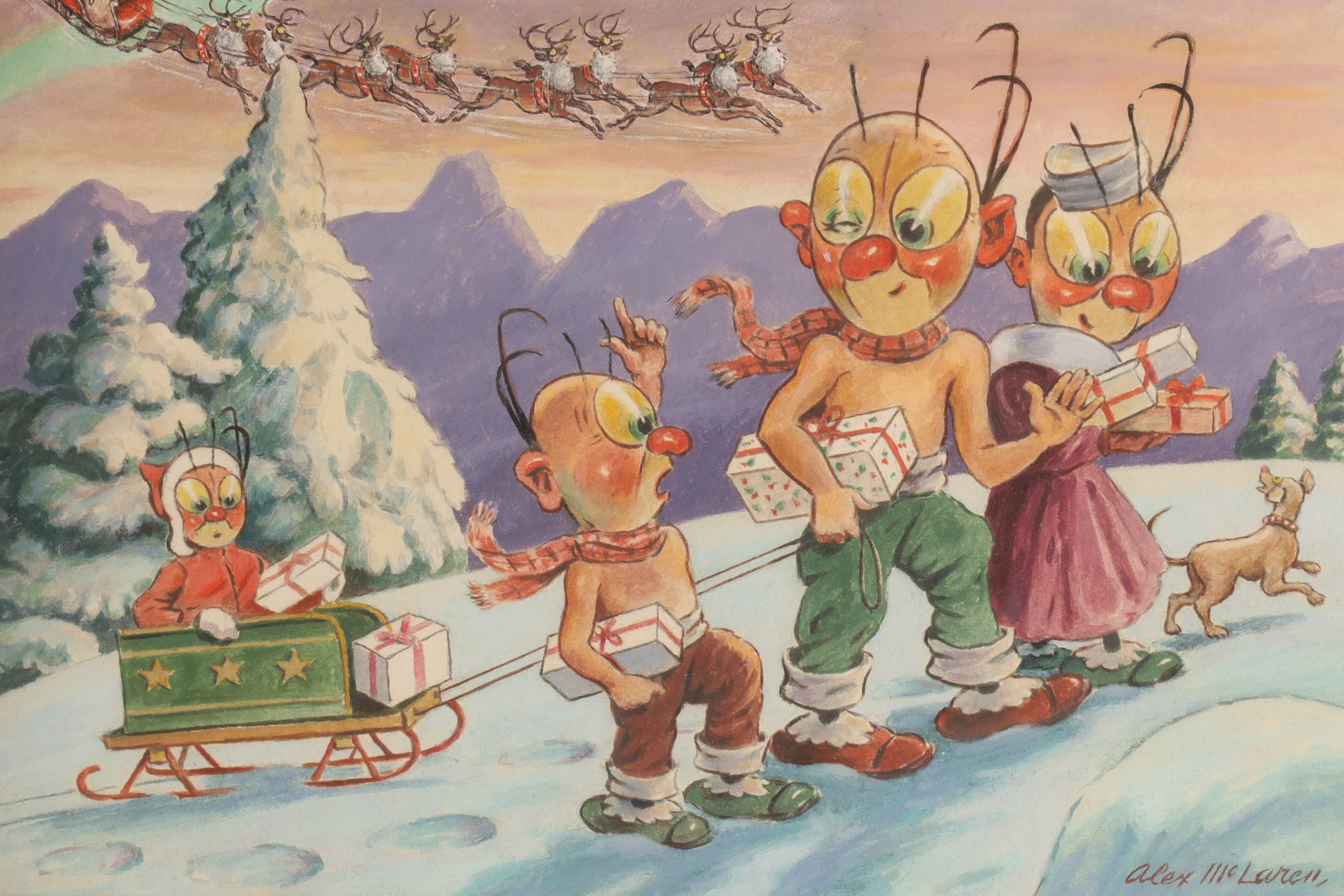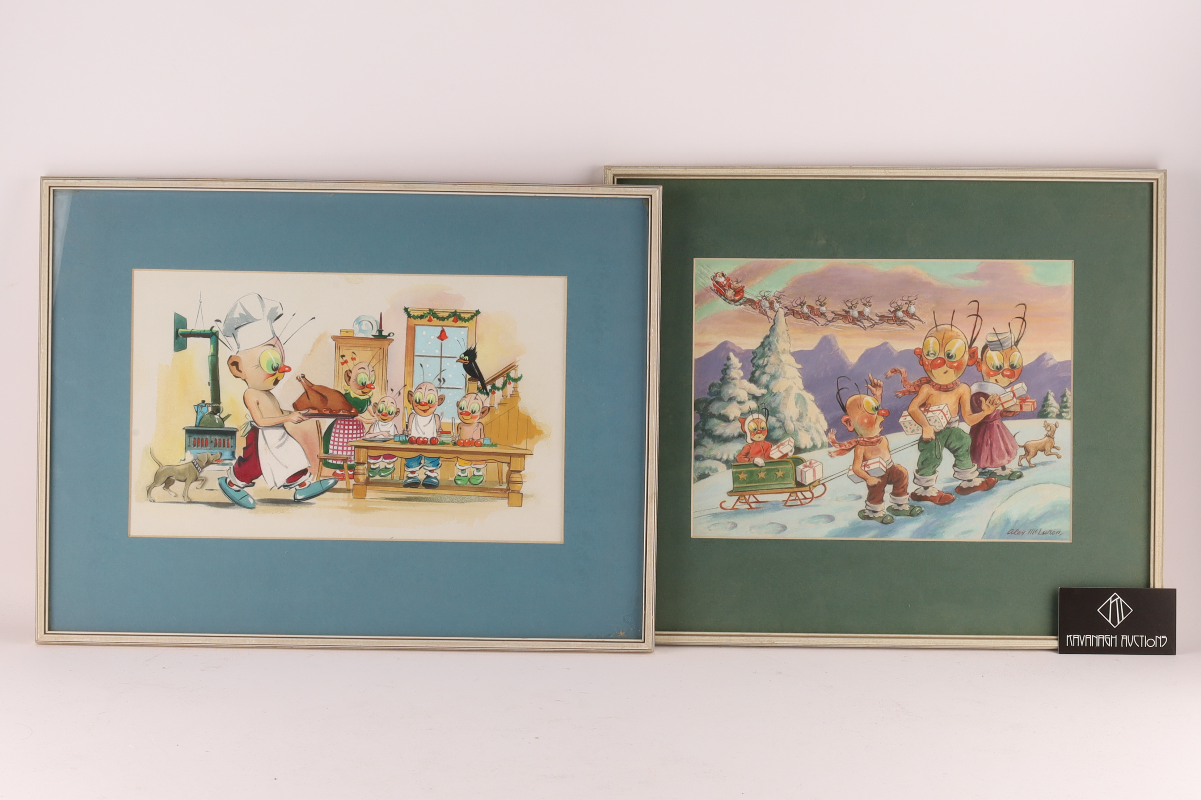 Pair of Alexander Lithgow McLaren (1892-1978) Paintings of Dingbats in Christmas scenes. In 1915, Ward was commissioned by Montreal-based businessman Charles E. Frosst to create a promotional calendar for his pharmaceutical company, Charles E. Frosst and Co. (later Merck Frosst Canada Inc.).