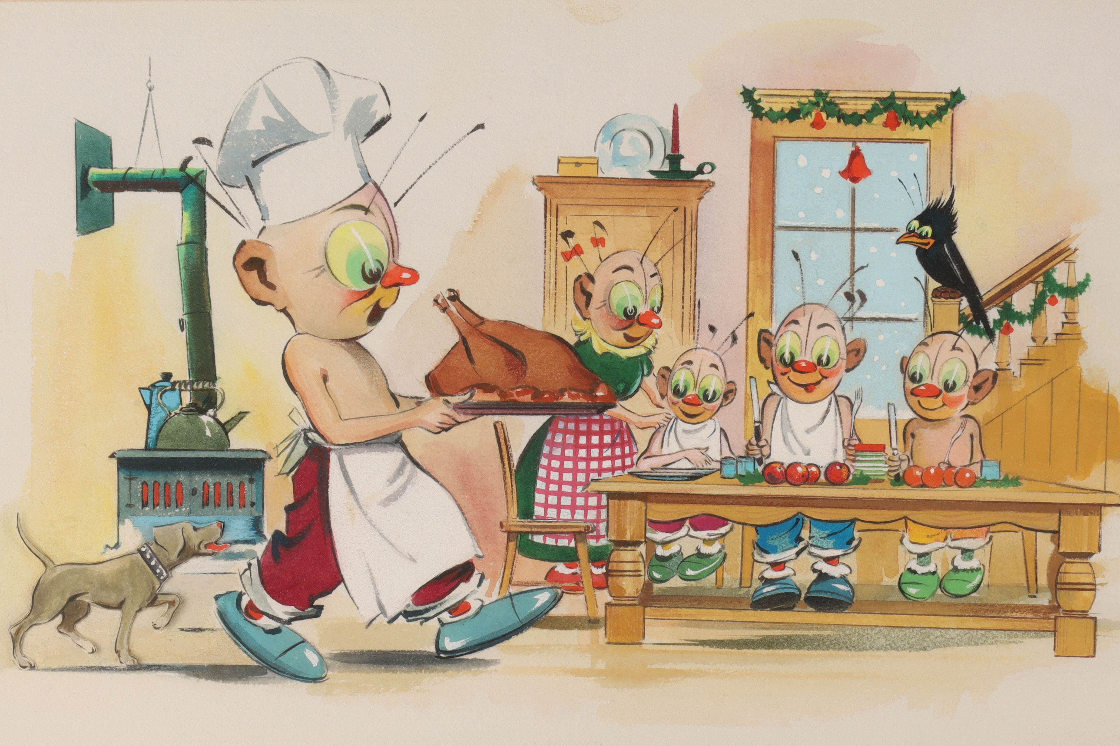 The resulting calendars, known as Dingbat Calendars, featured Ward’s characters in humorous, whimsical scenes depicting science, medicine, and health. The characters were often shown busy at work performing medical research or tending to patients in a land called "Dingbatland." Alex McLaren was the fourth illustrator to draw the dingbats. Images measure 8 inches H x 13 W, 8.5 inches H x 11.5 W, frames measure 14 x 18.5 inches and 14 x 17 inches. Outdoor Santa scene is signed lower right.