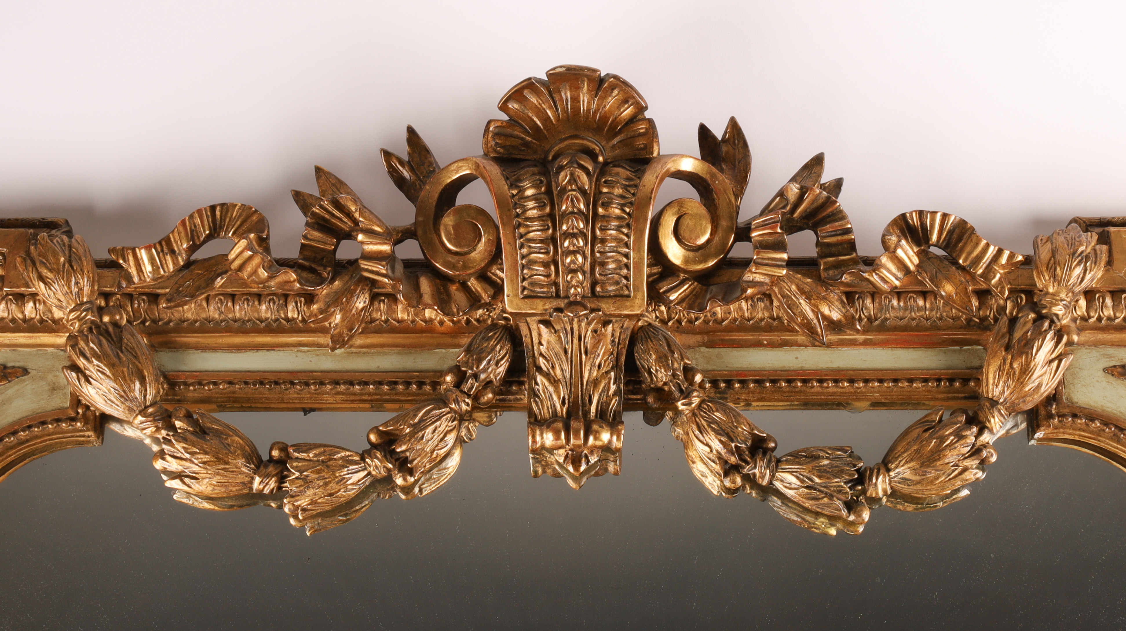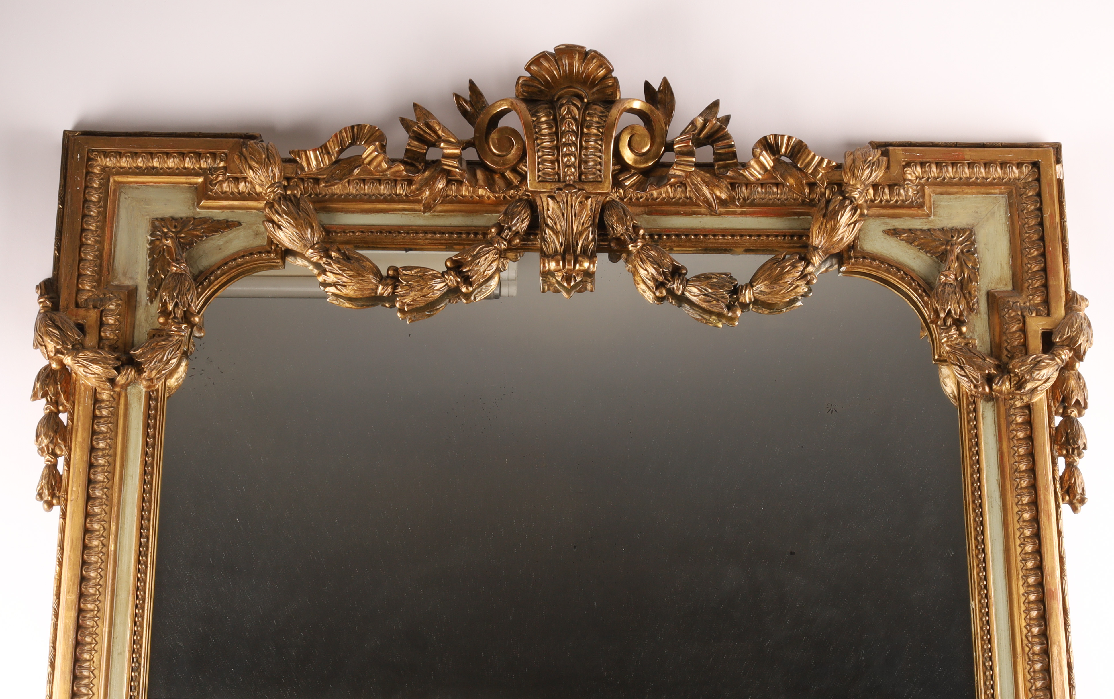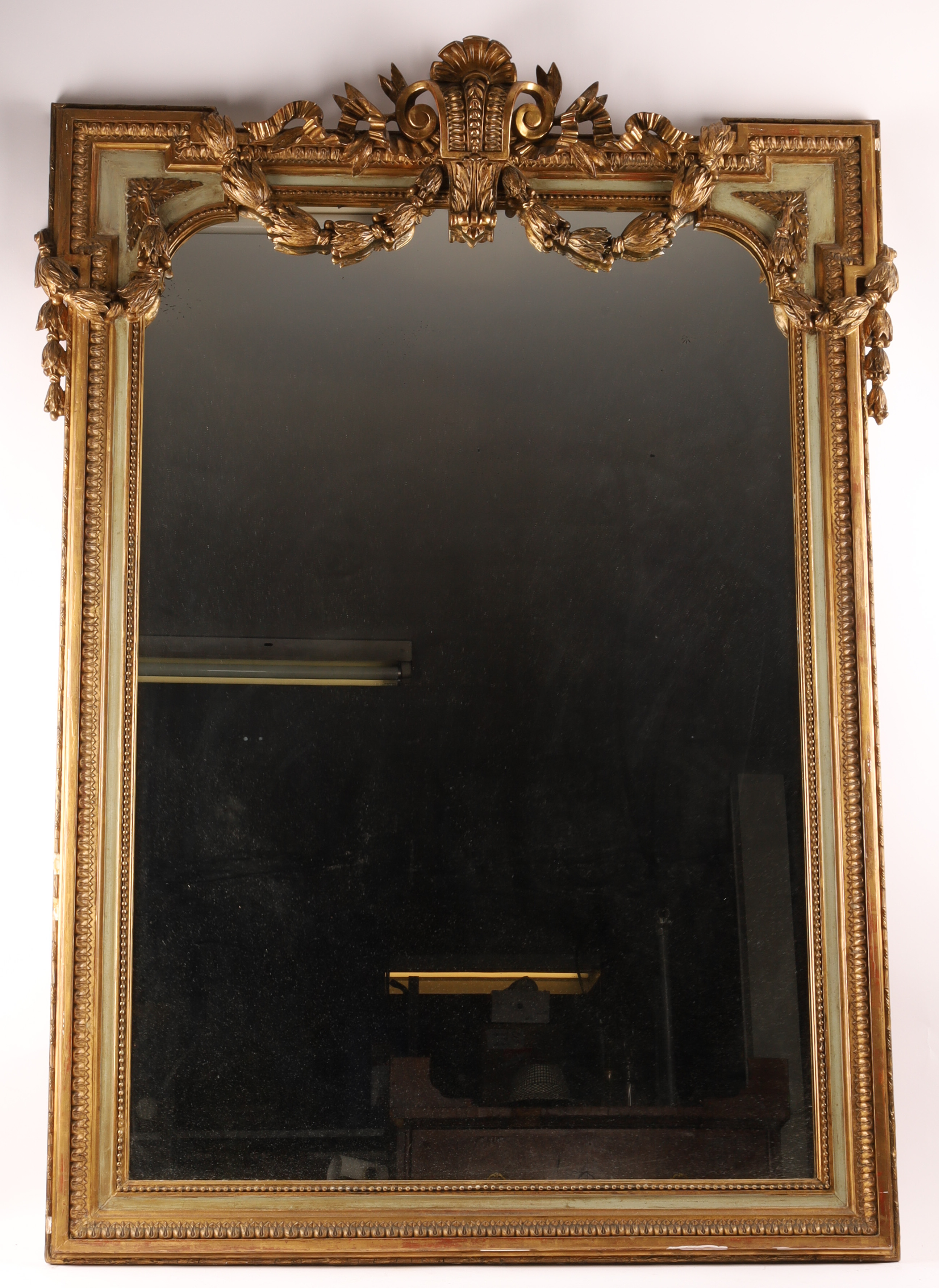 19th C French Napoleon III Gilt Overmantle Mirror with Celadon Trim, ribbons and floral swags. Measuring 56 inches H x 42 W.