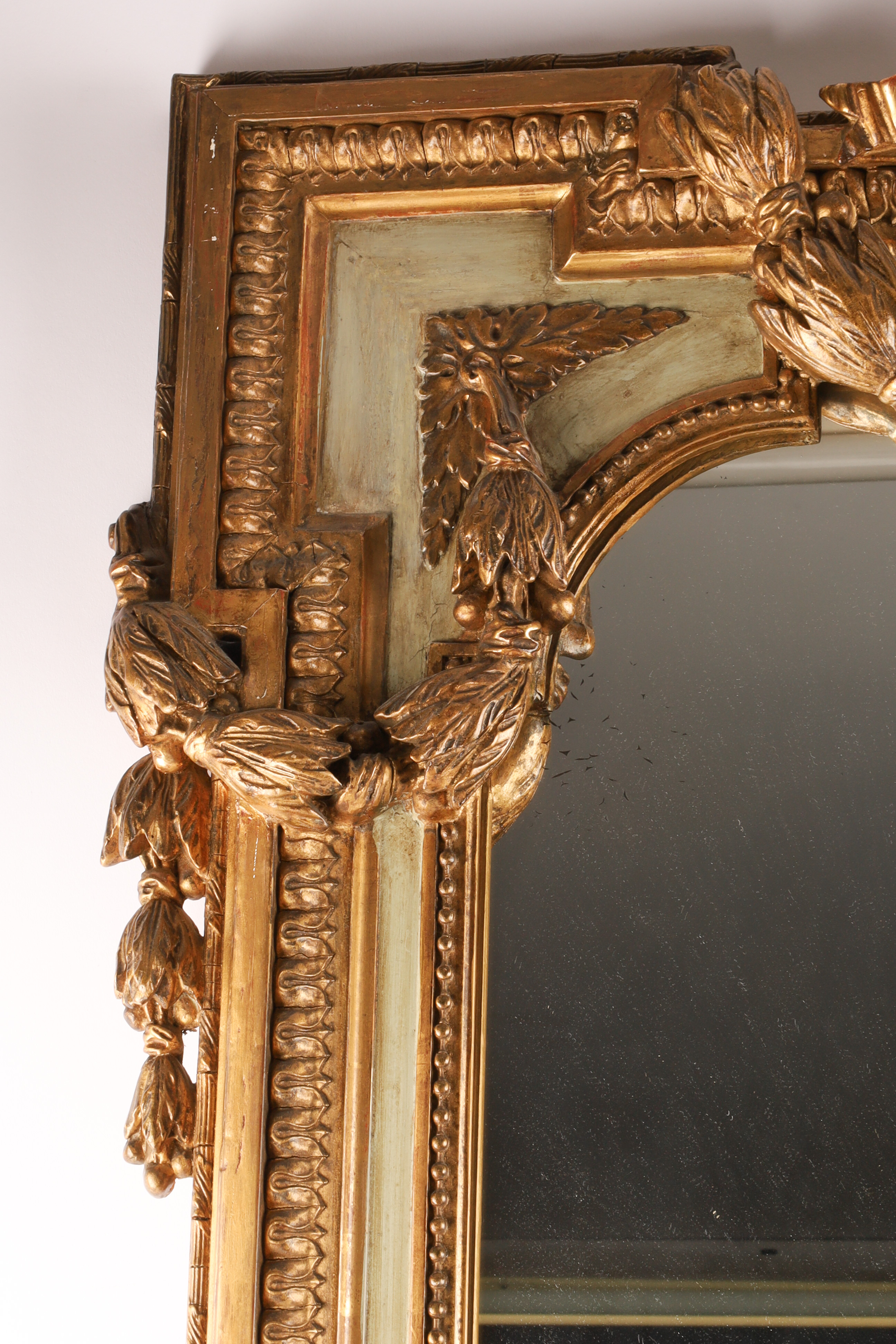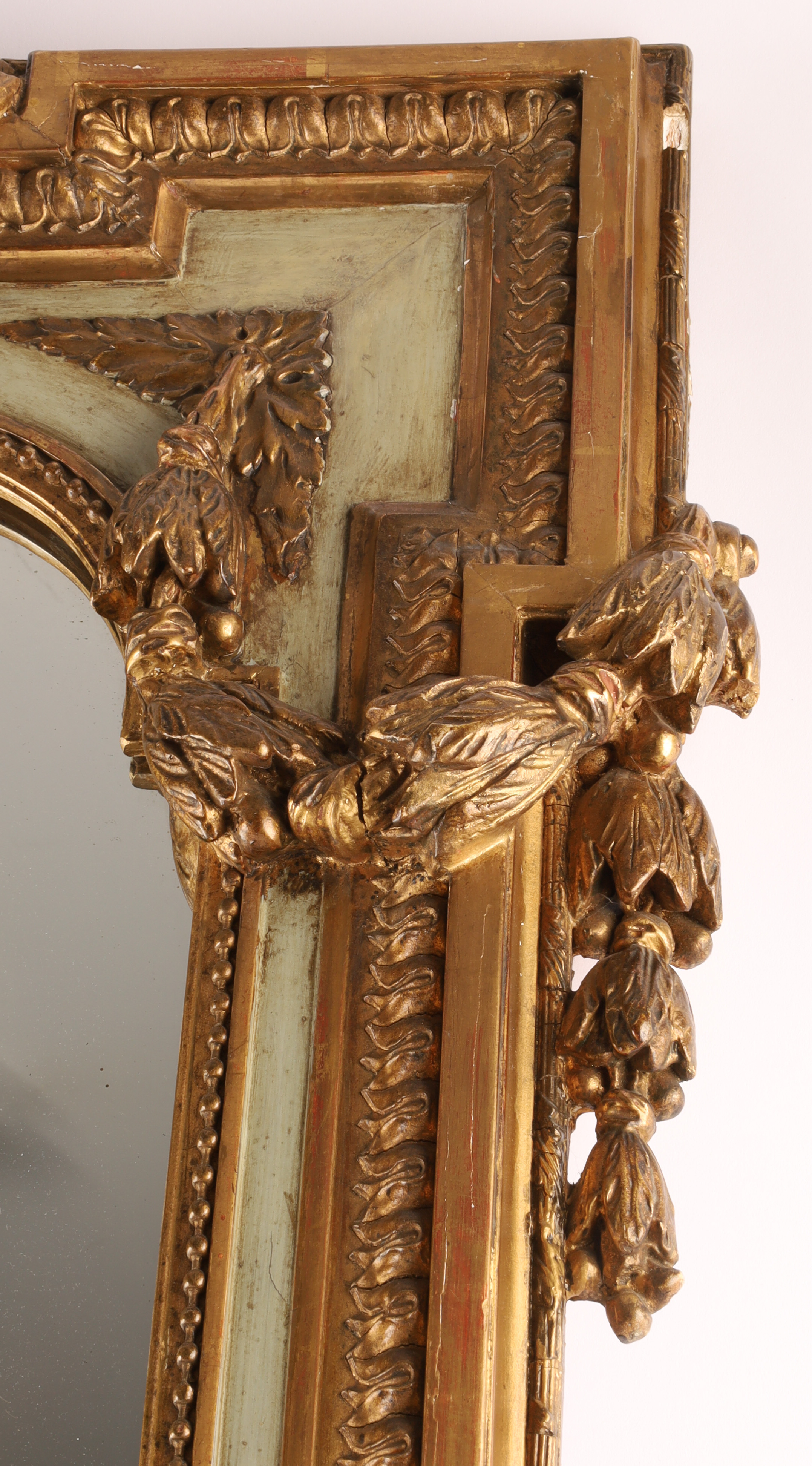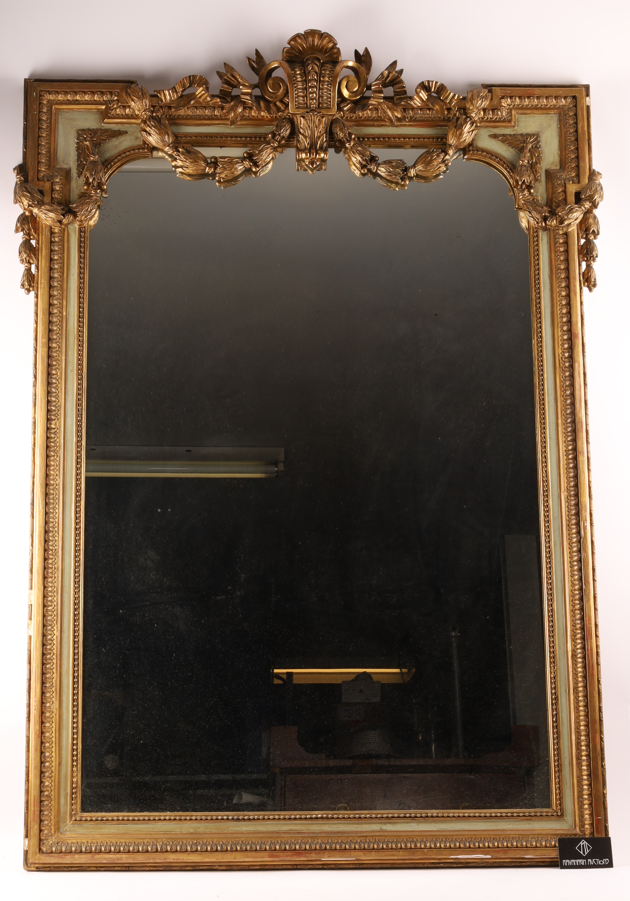 19th C French Napoleon III Gilt Overmantle Mirror with Celadon Trim, ribbons and floral swags. Measuring 56 inches H x 42 W.