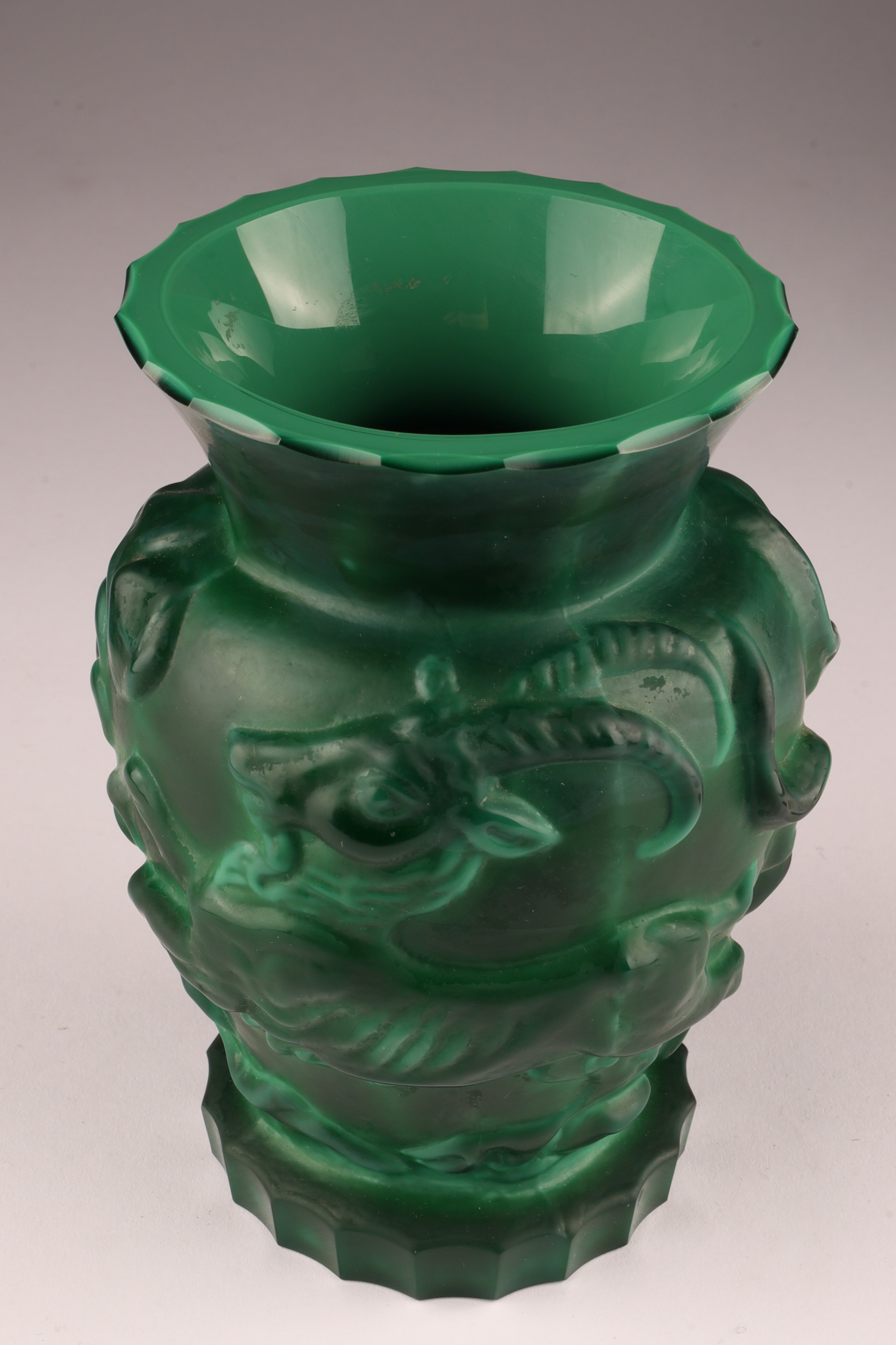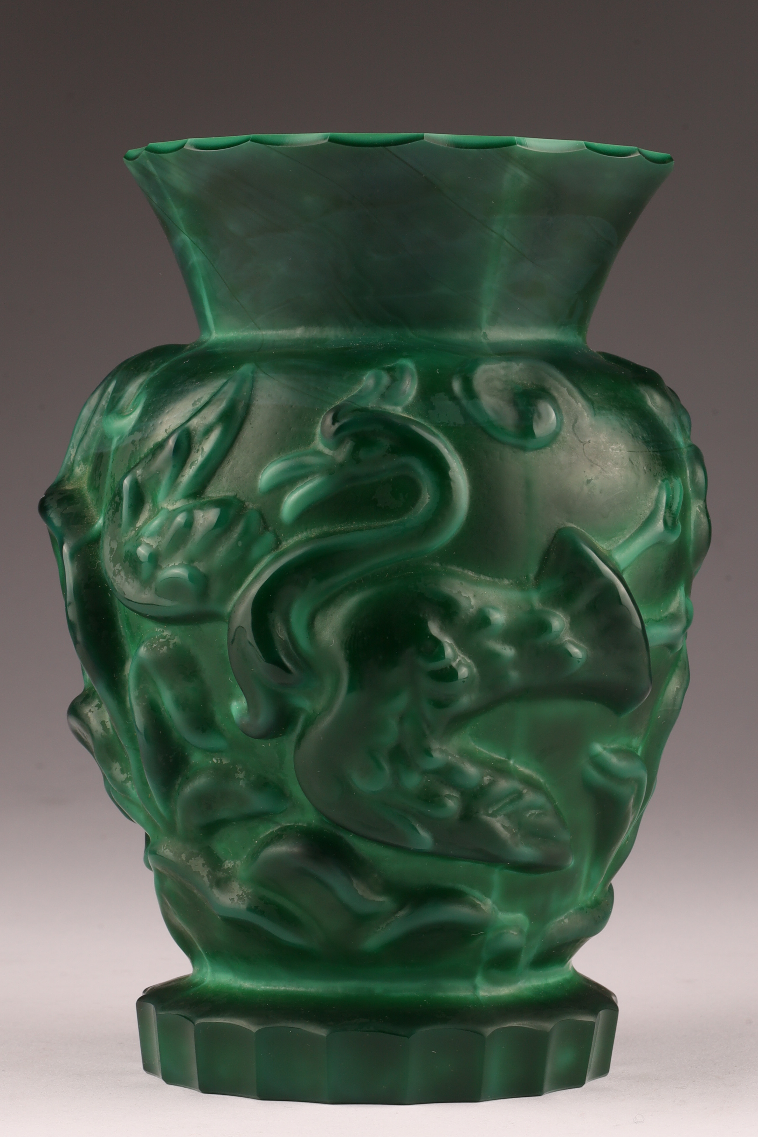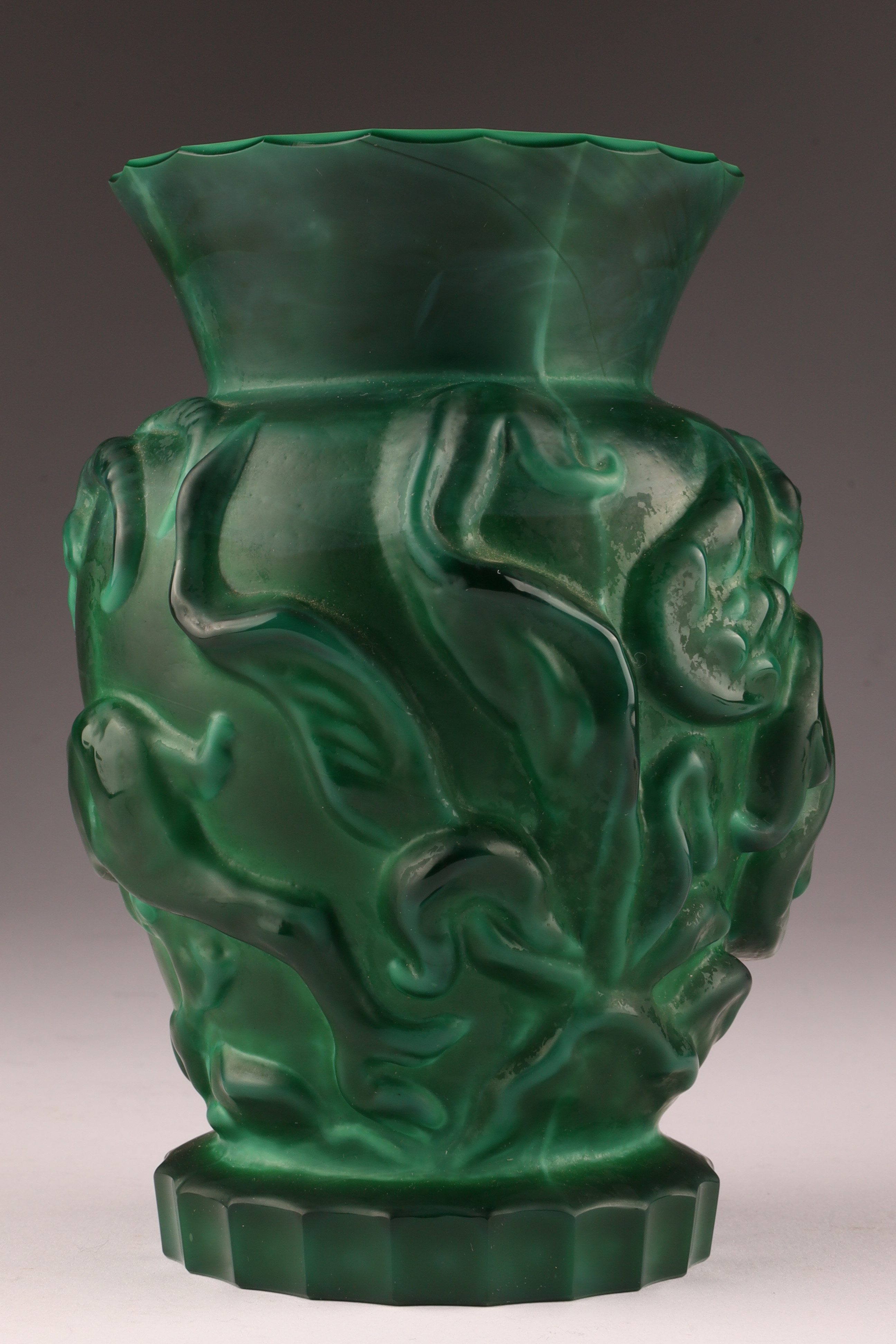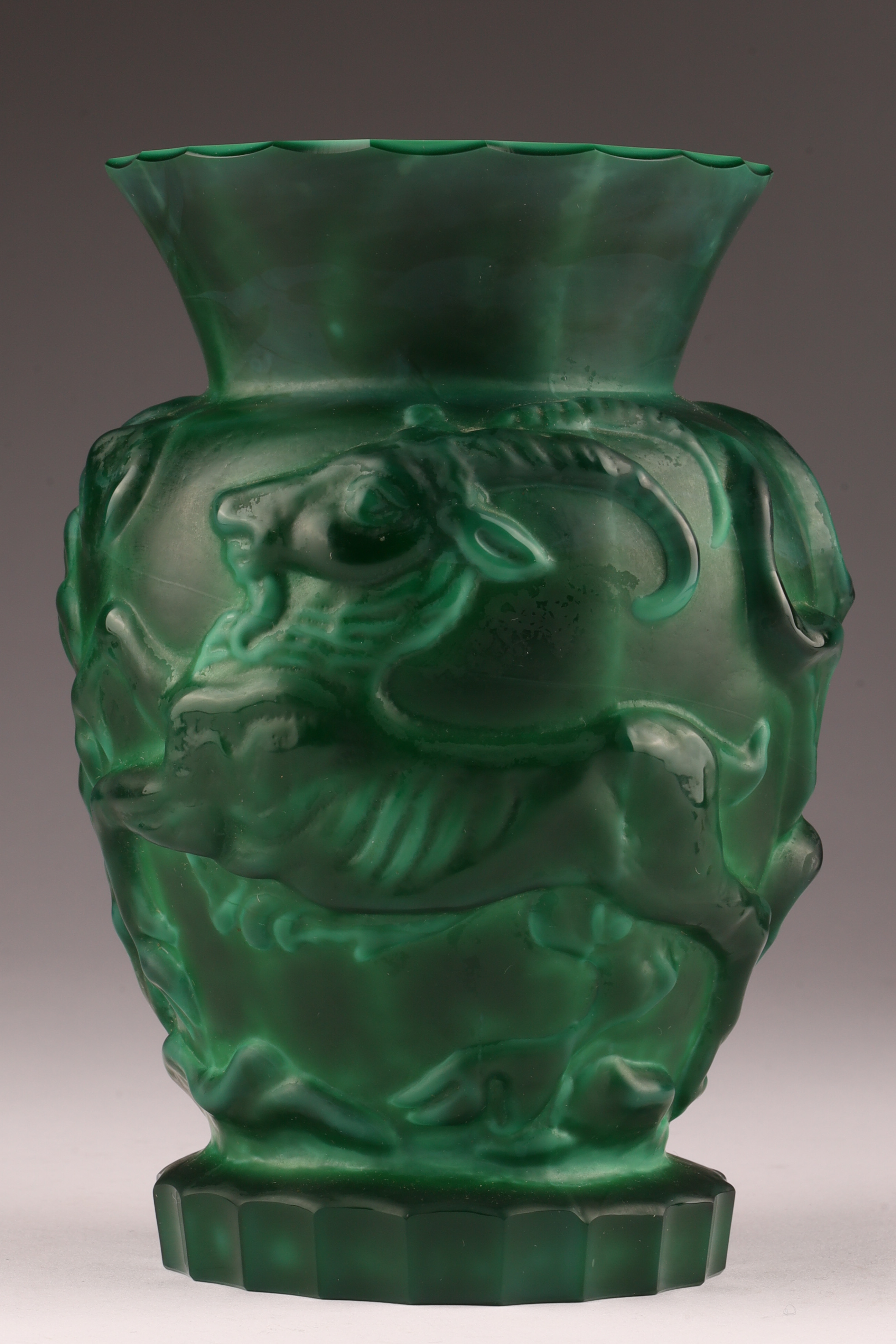 Czechoslovakian Art Deco malachite glass vase w/ gazelle & bird decor c.1930s. 6 inches H x 4 W.