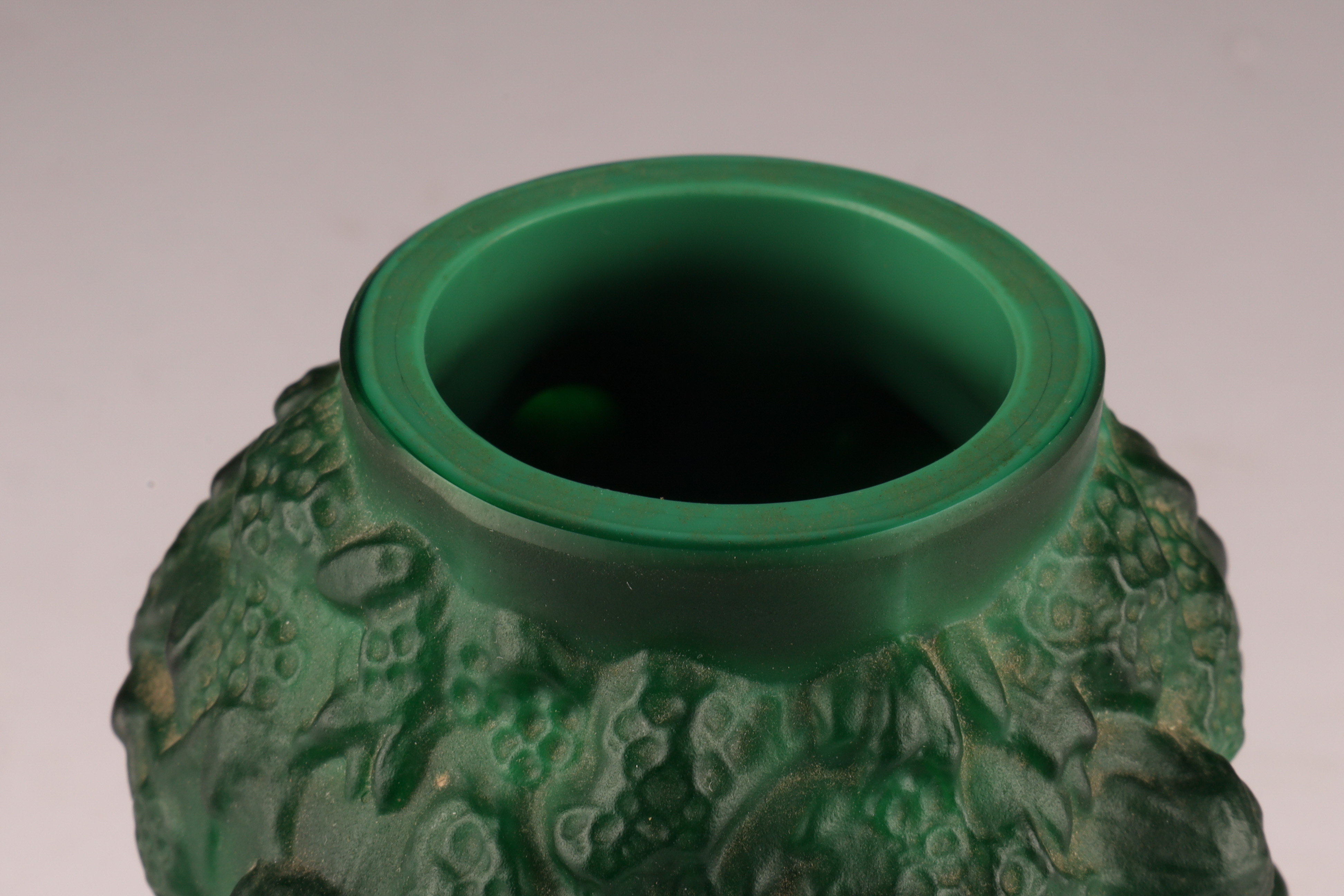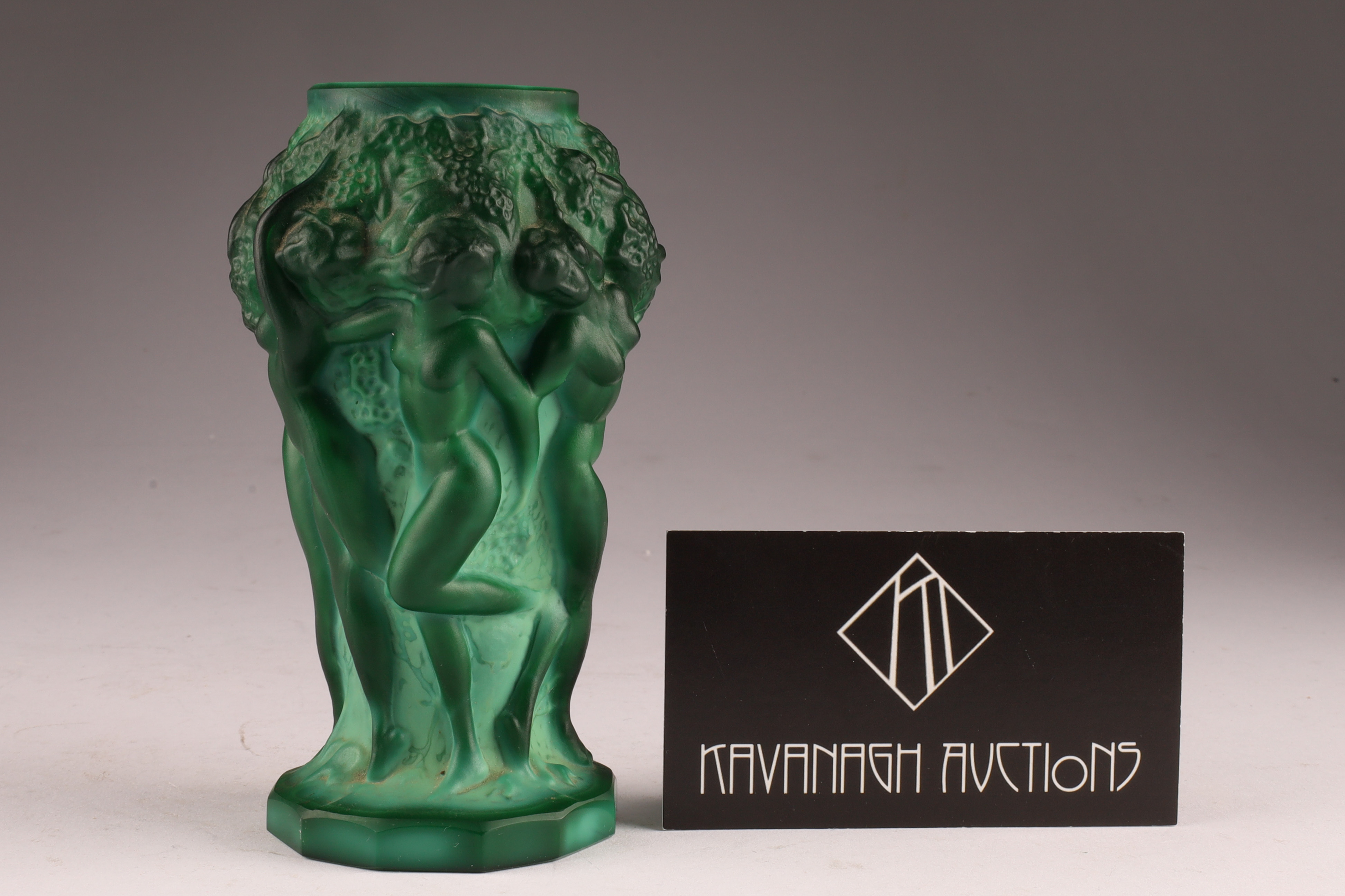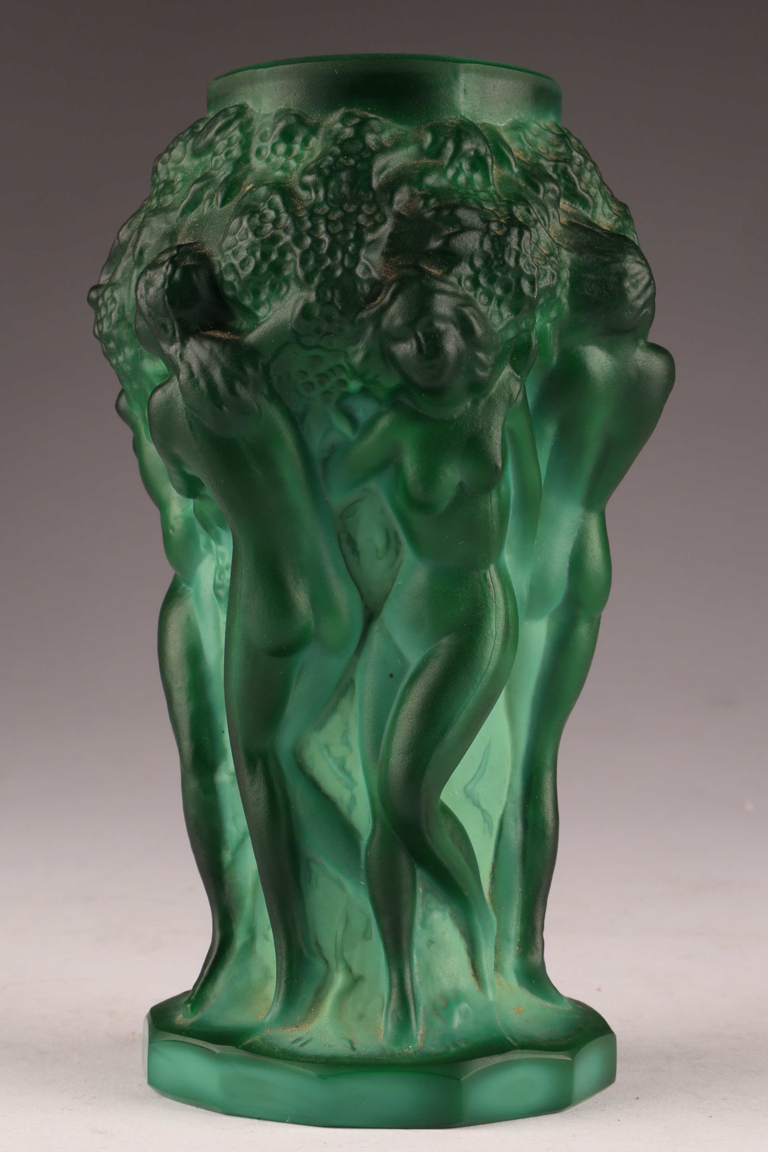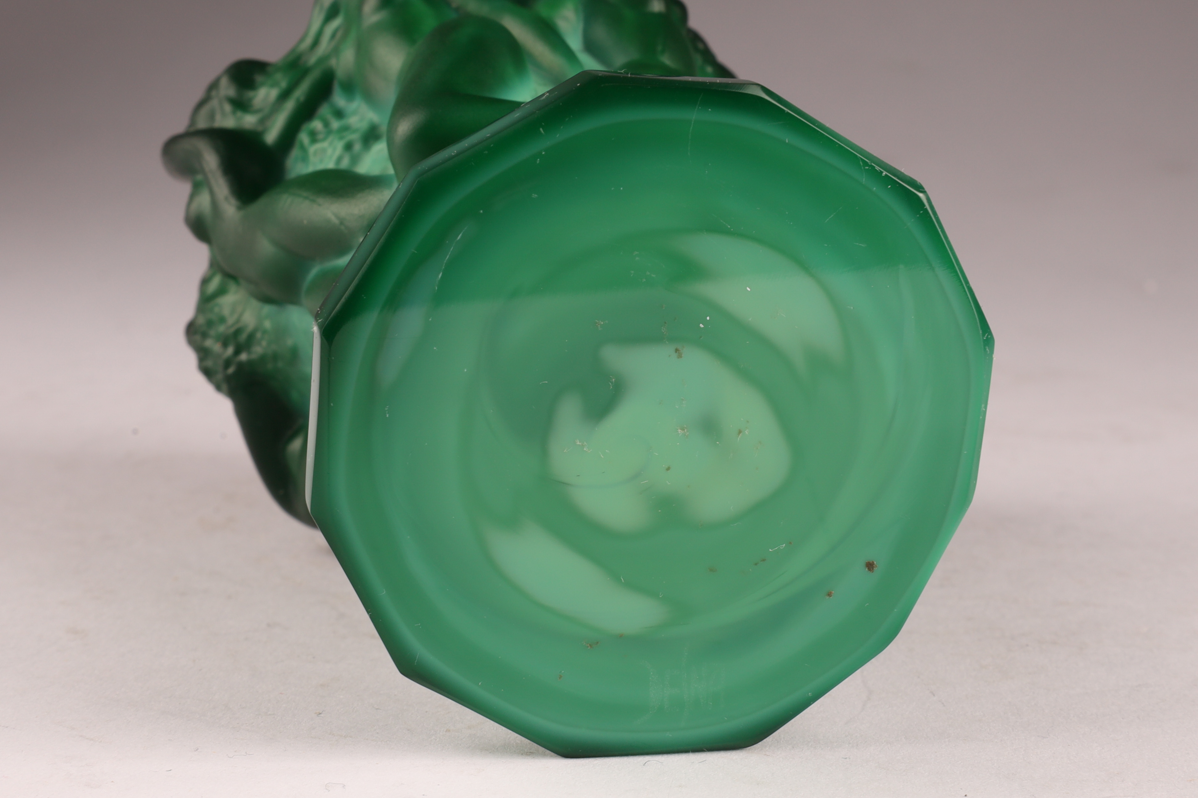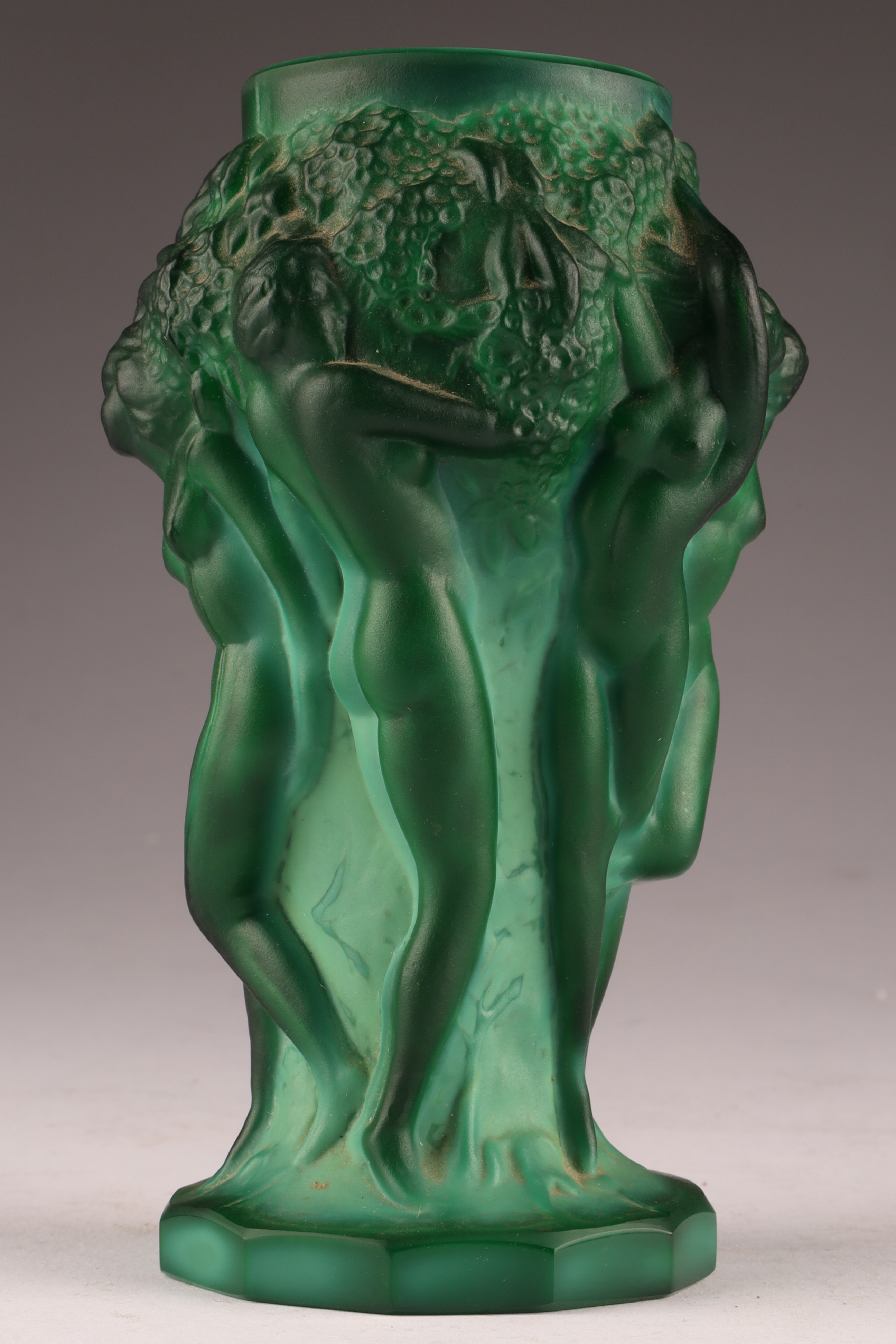 1930s Art Deco Malachite Glass Wood Nymphs Vase by Curt Schlevogt. Measuring 5 inches H x 3 W. Signed on underside.