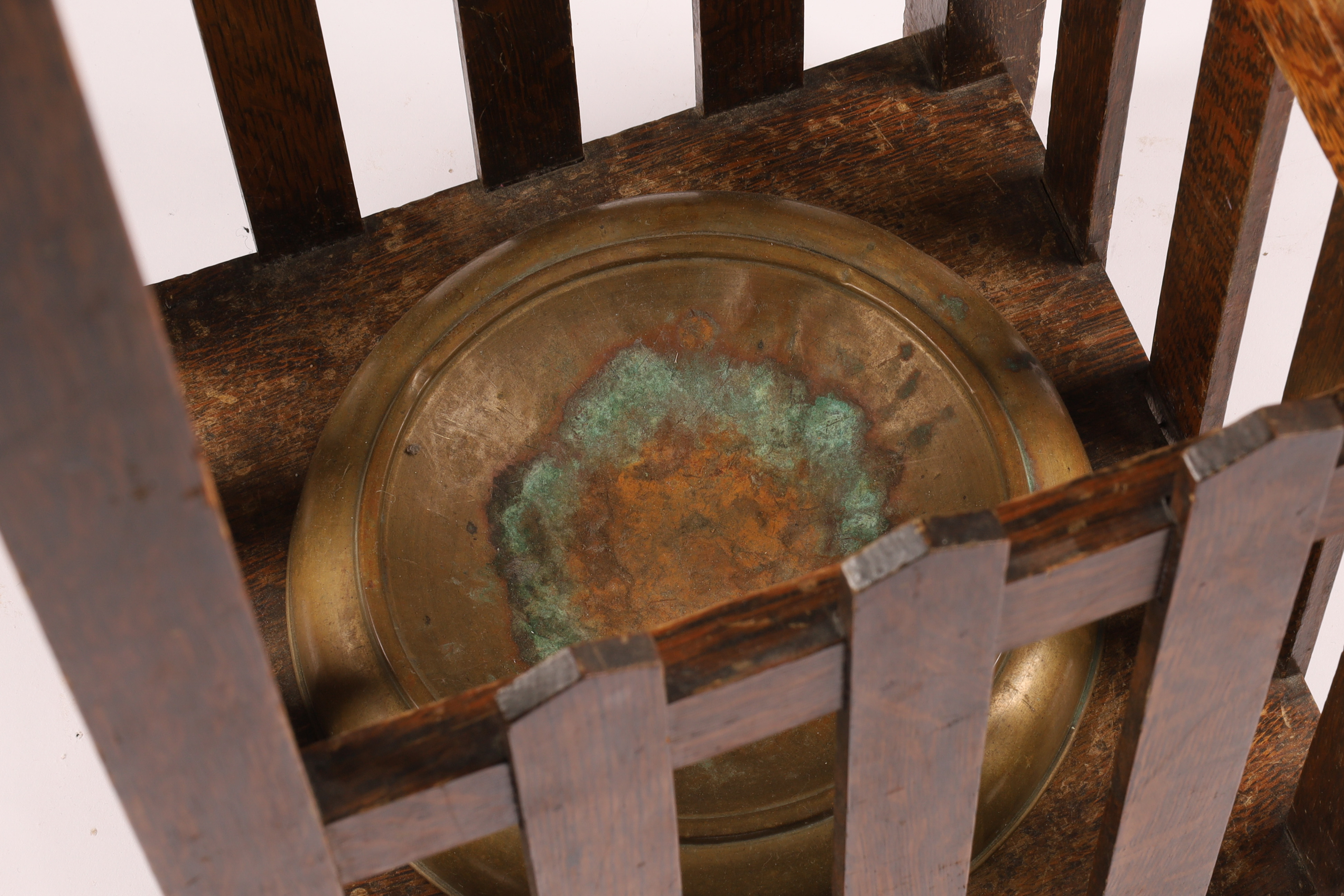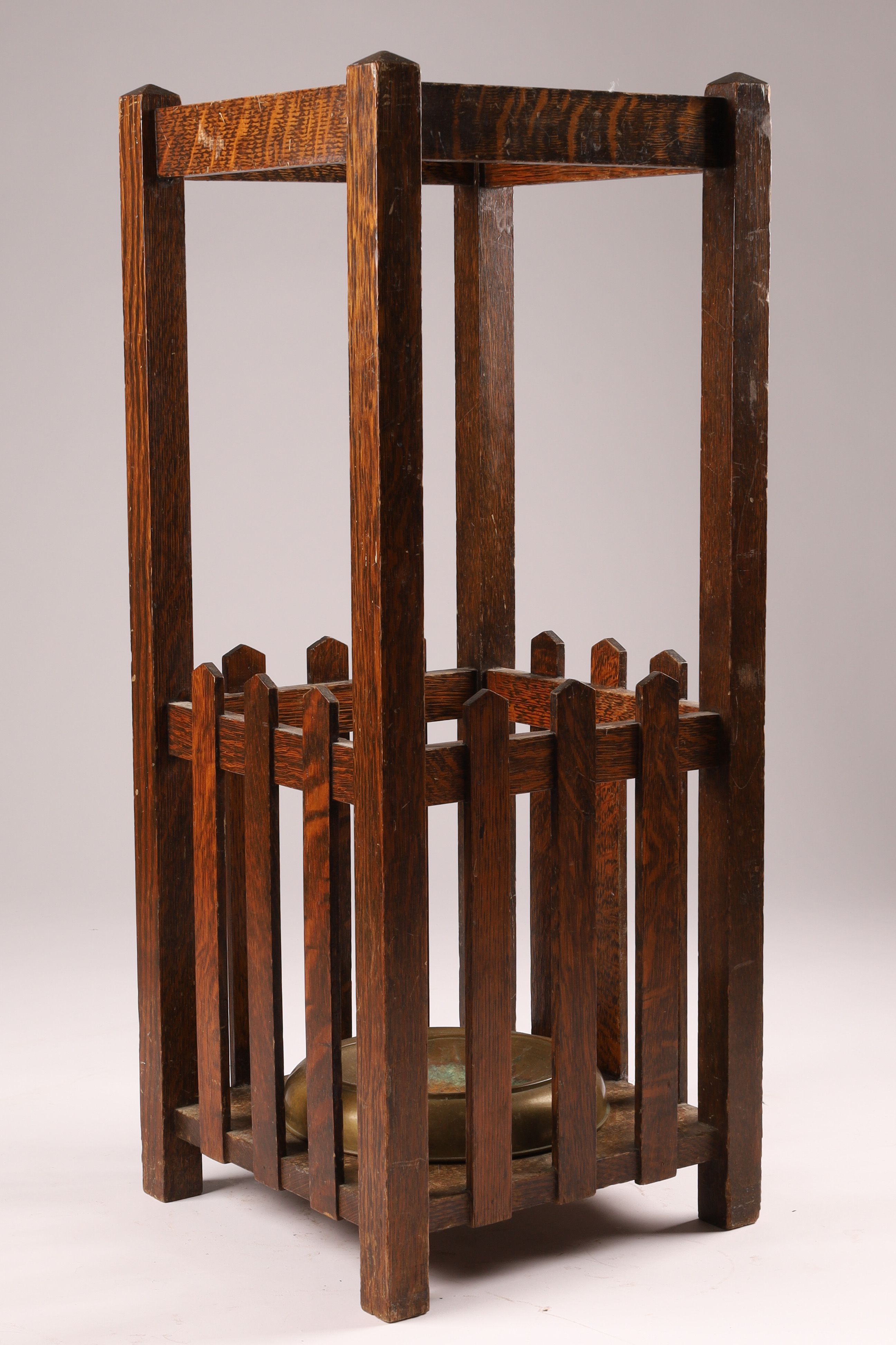 Antique Arts and Crafts Quarter Sawn Oak Umbrella Cane Stick Stand with brass drip tray. Measuring 30 inches H x 12 W x 12 deep.