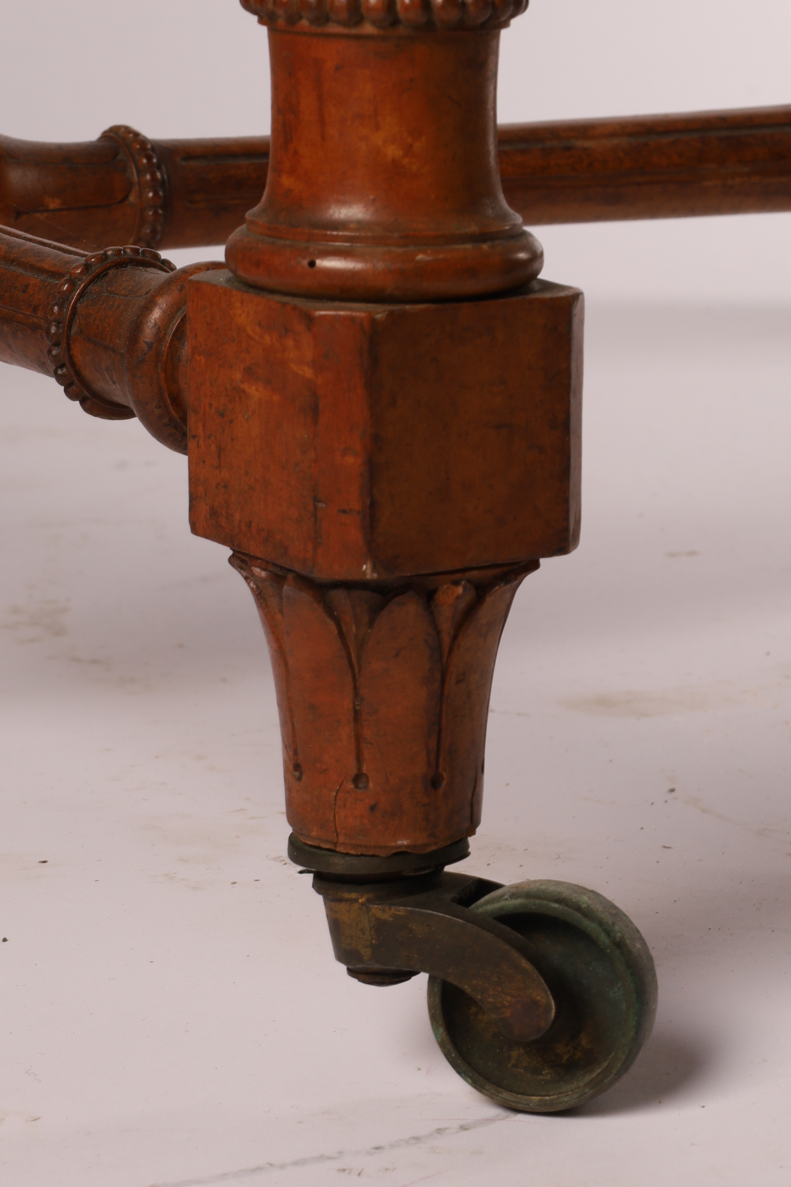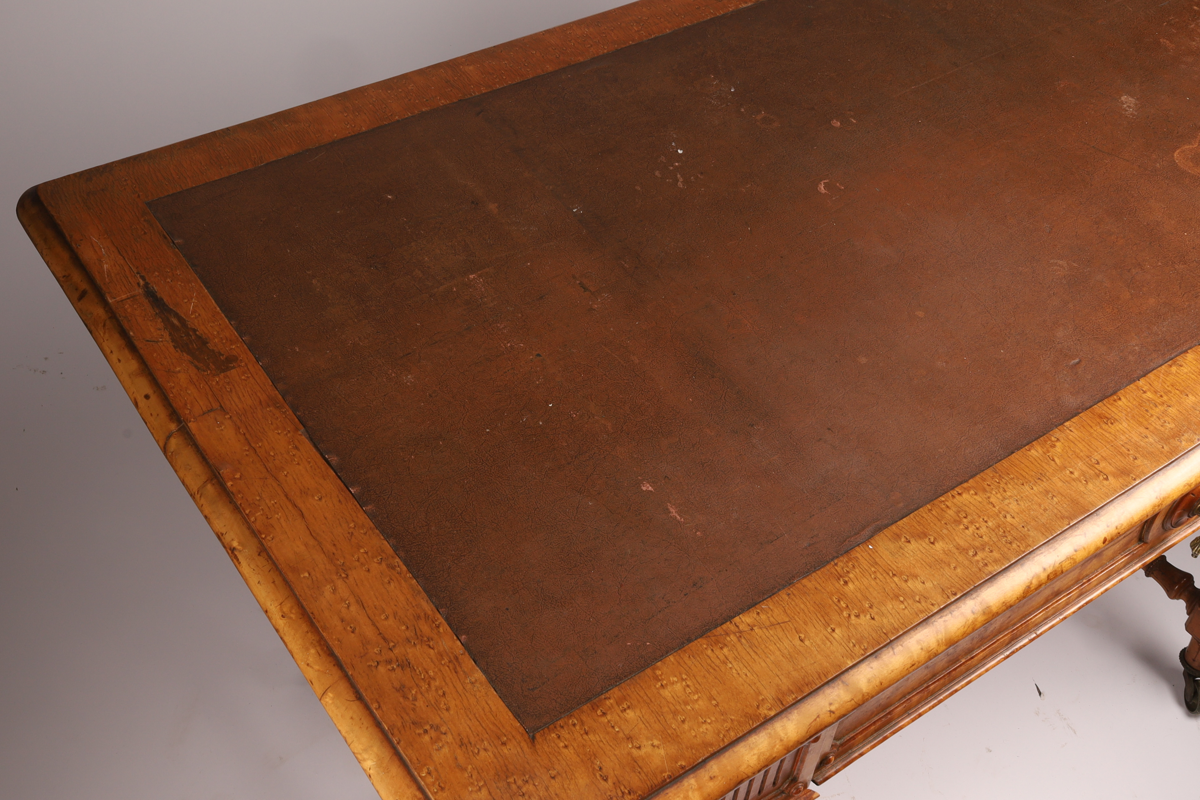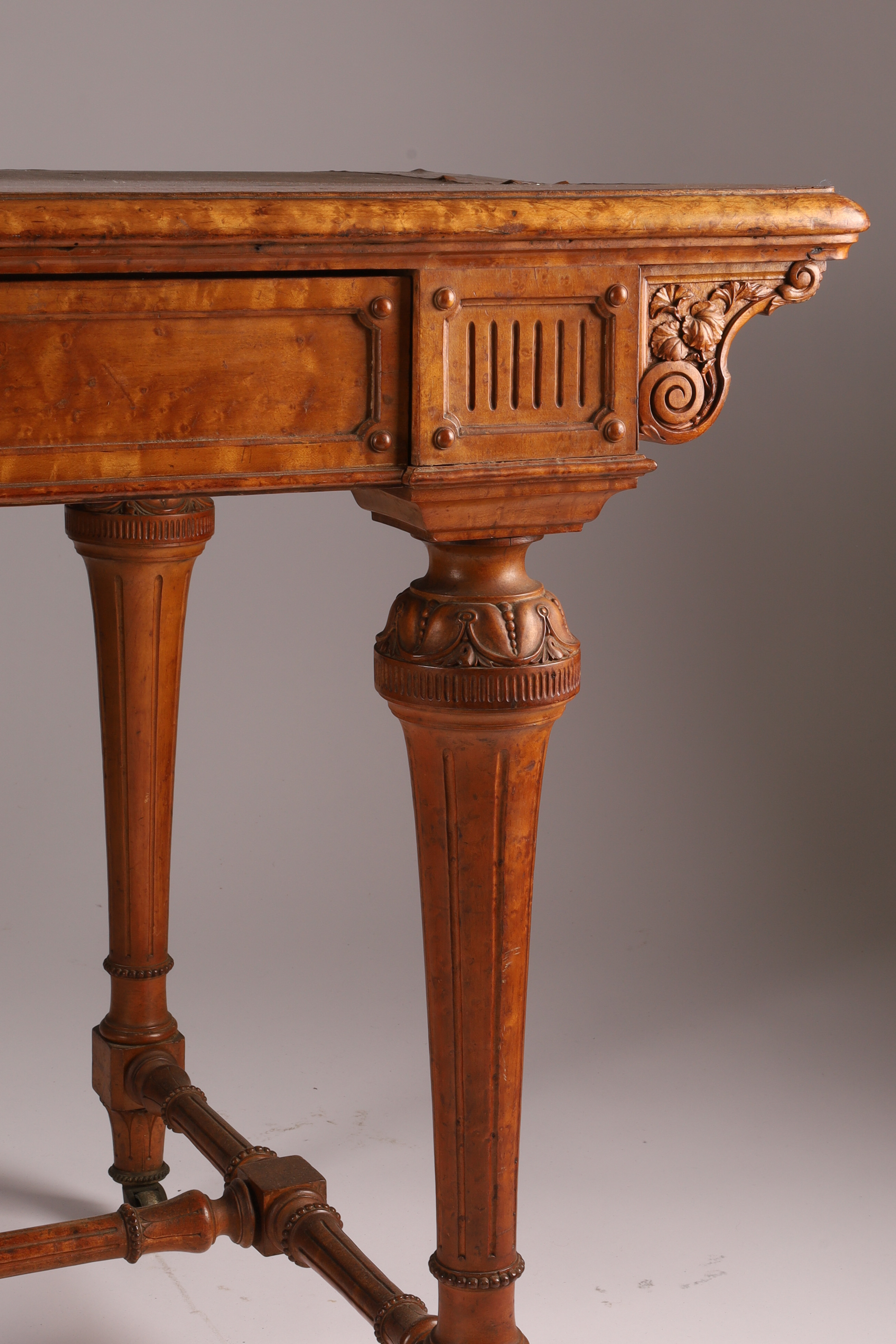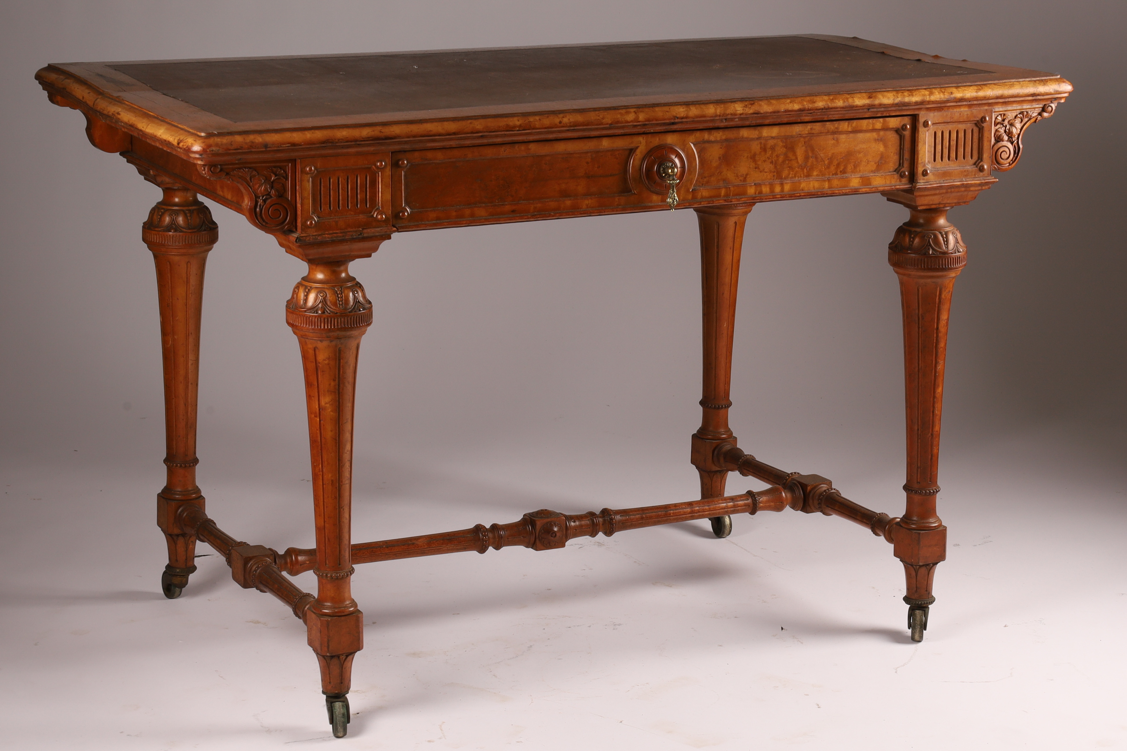 Antique English Regency Birds Eye Maple Carved Writing Desk with Carved Legs and Stretchers on Brass Casters. 29 inches H x 46 L x 25 inches. deep.