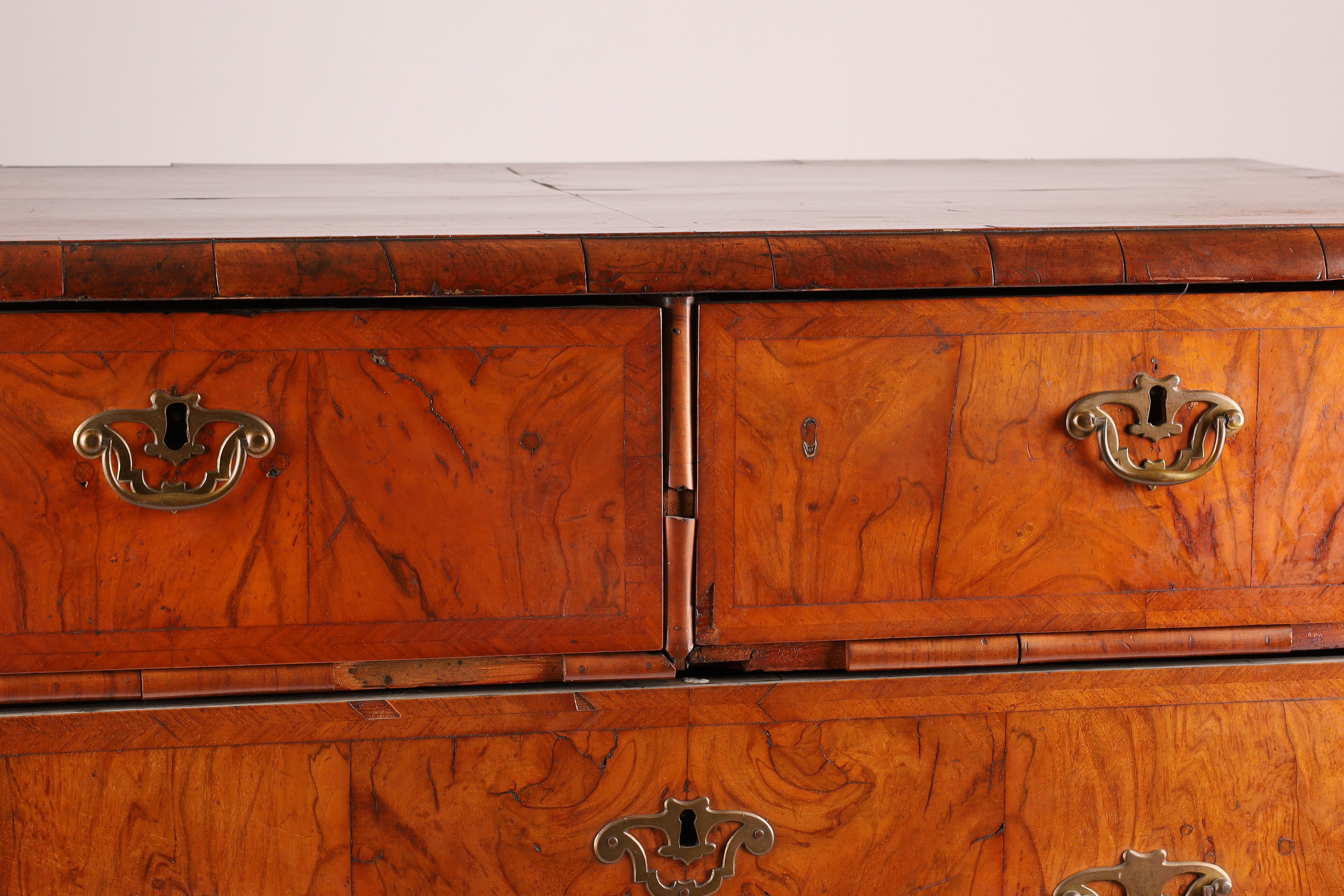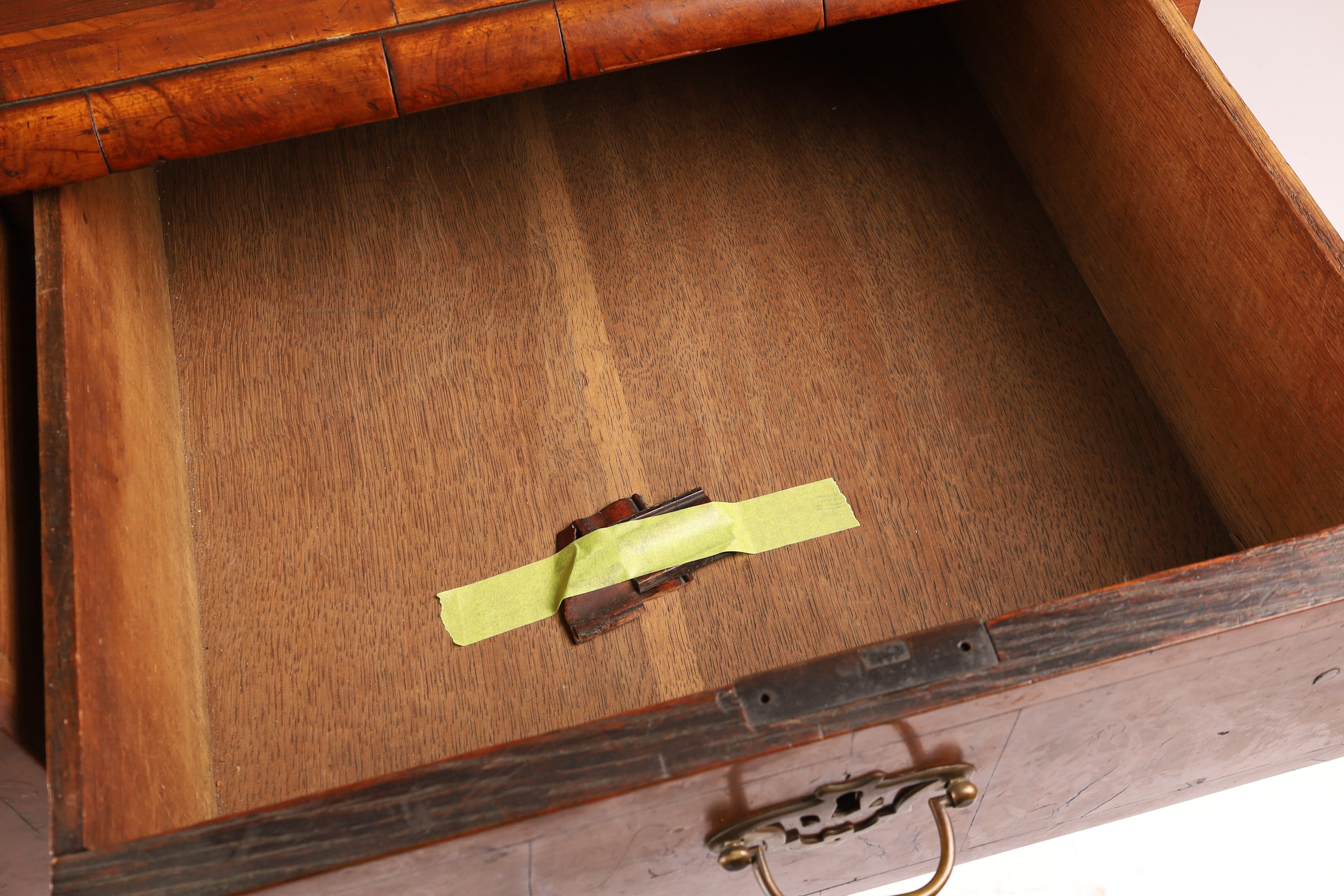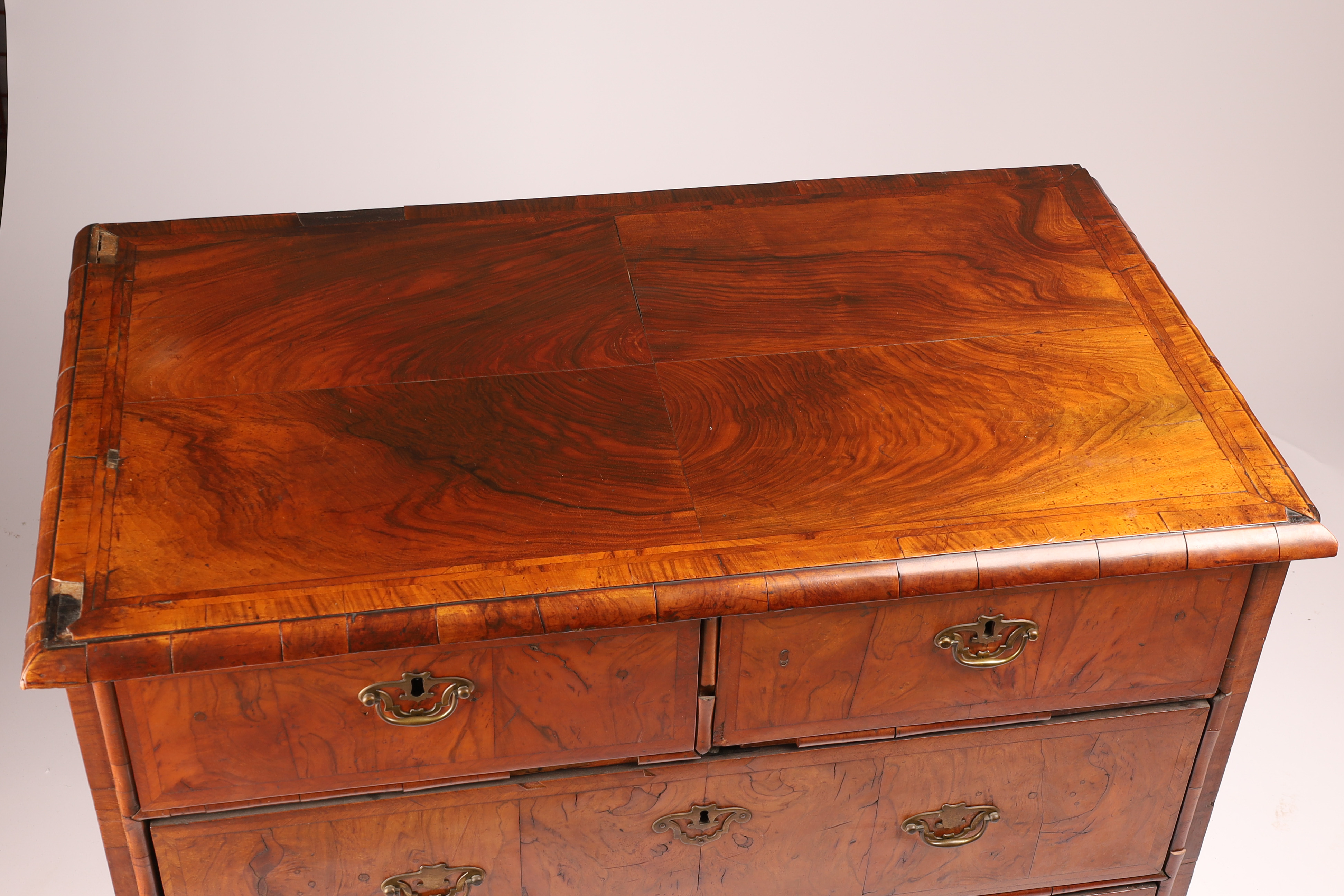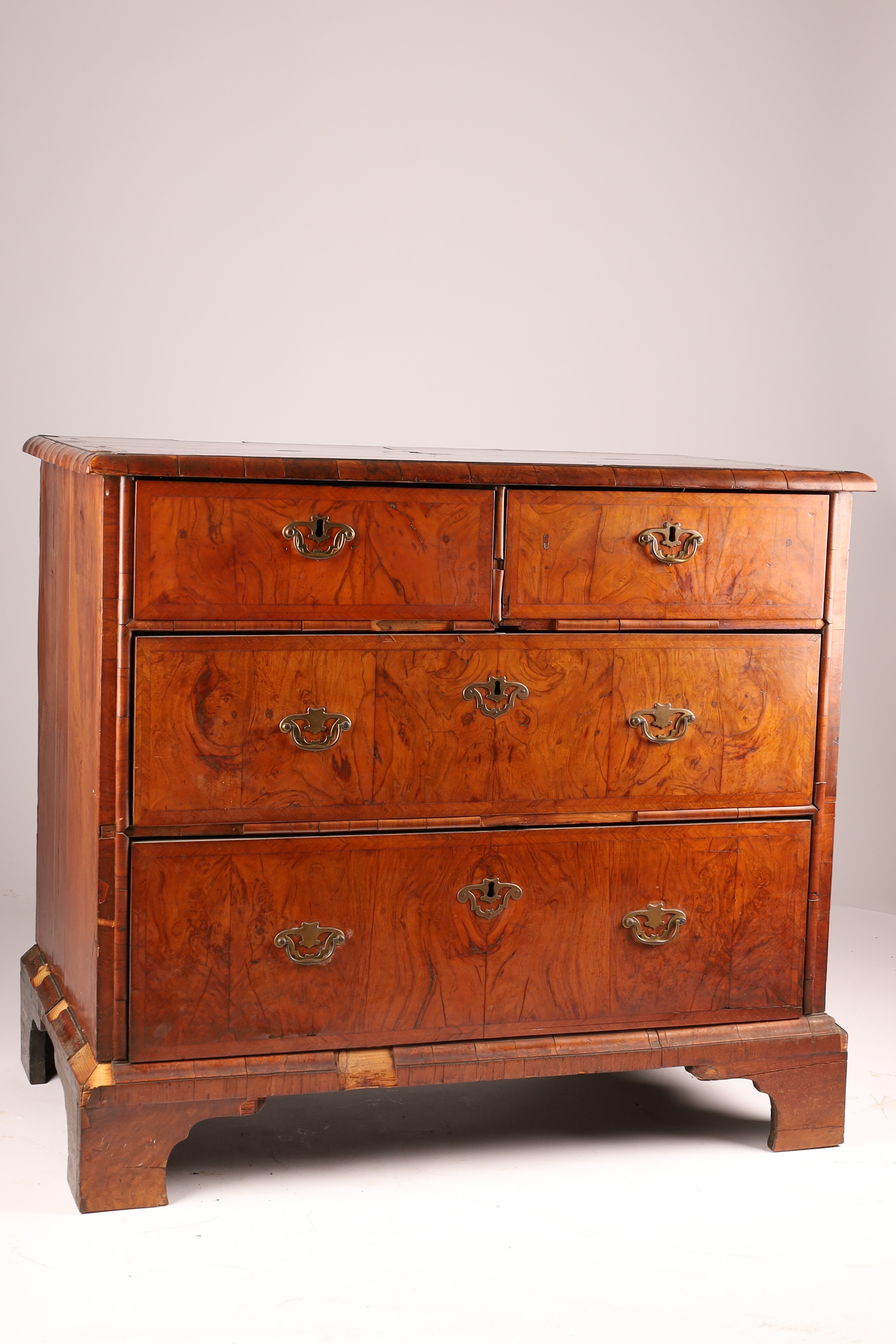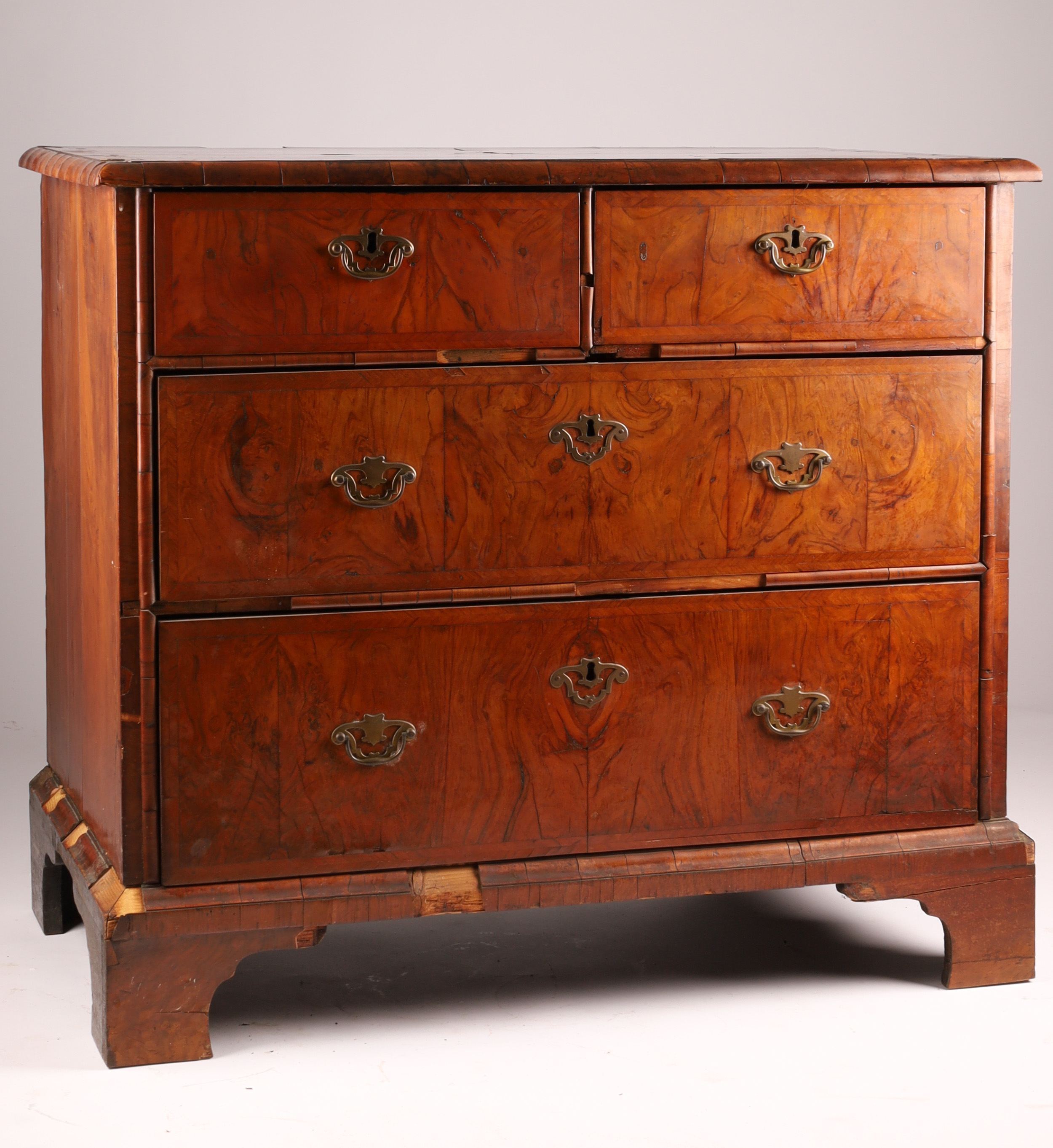 Antique English Georgian / George I Walnut Chest of Drawers, 2 short drawers over 2 long. Loss to veneer, as shown. 32.5 inches H x 21 deep x 37 W.