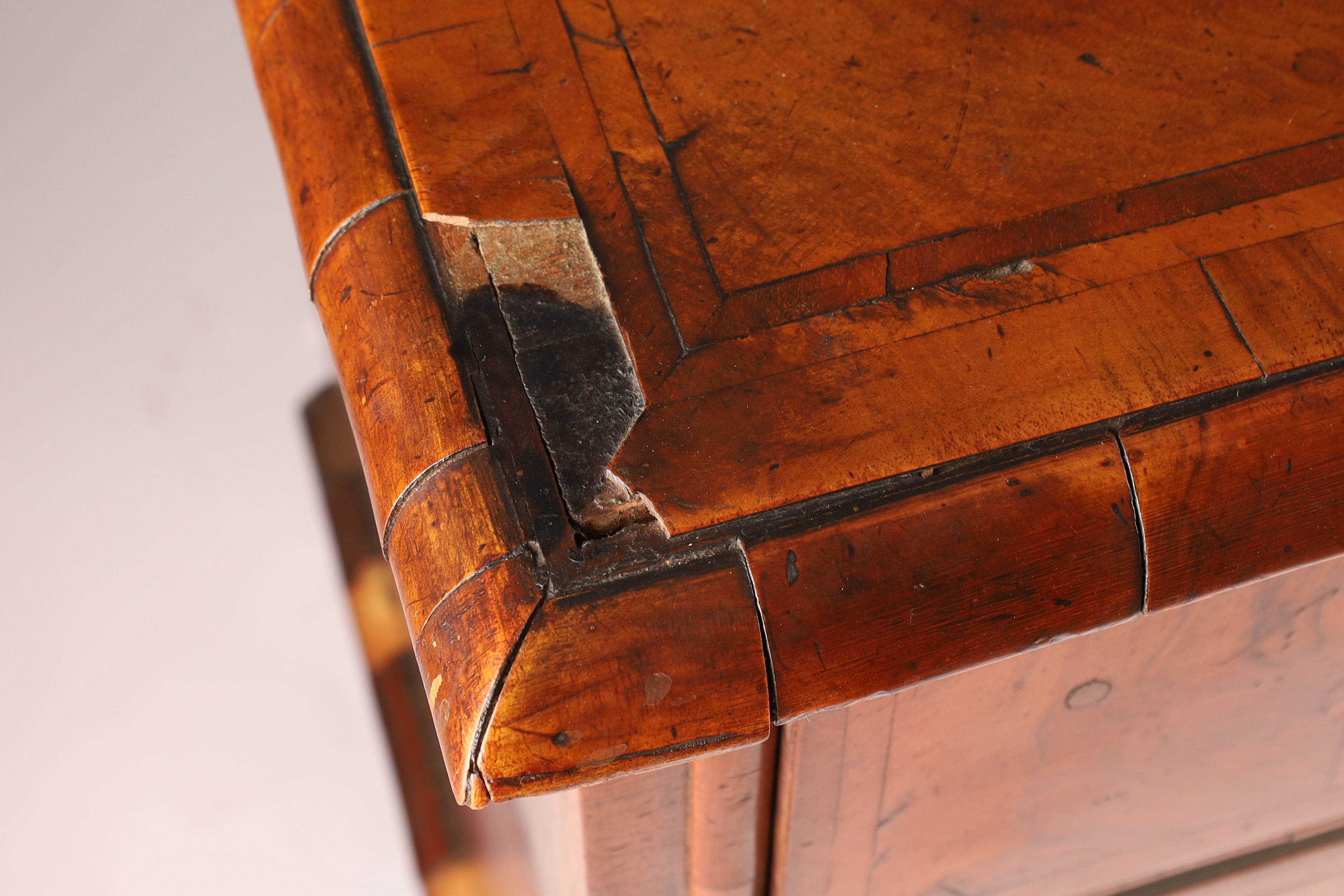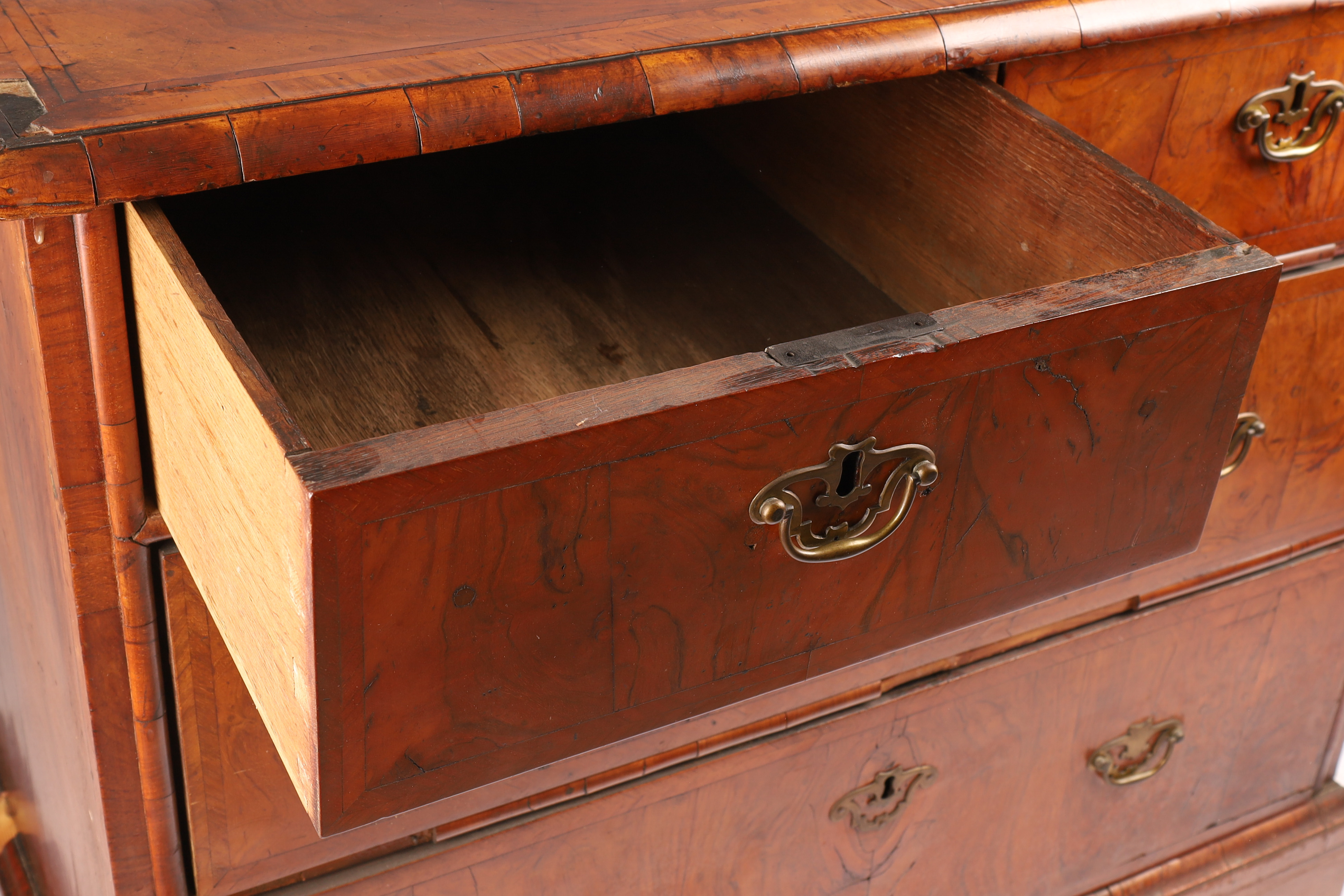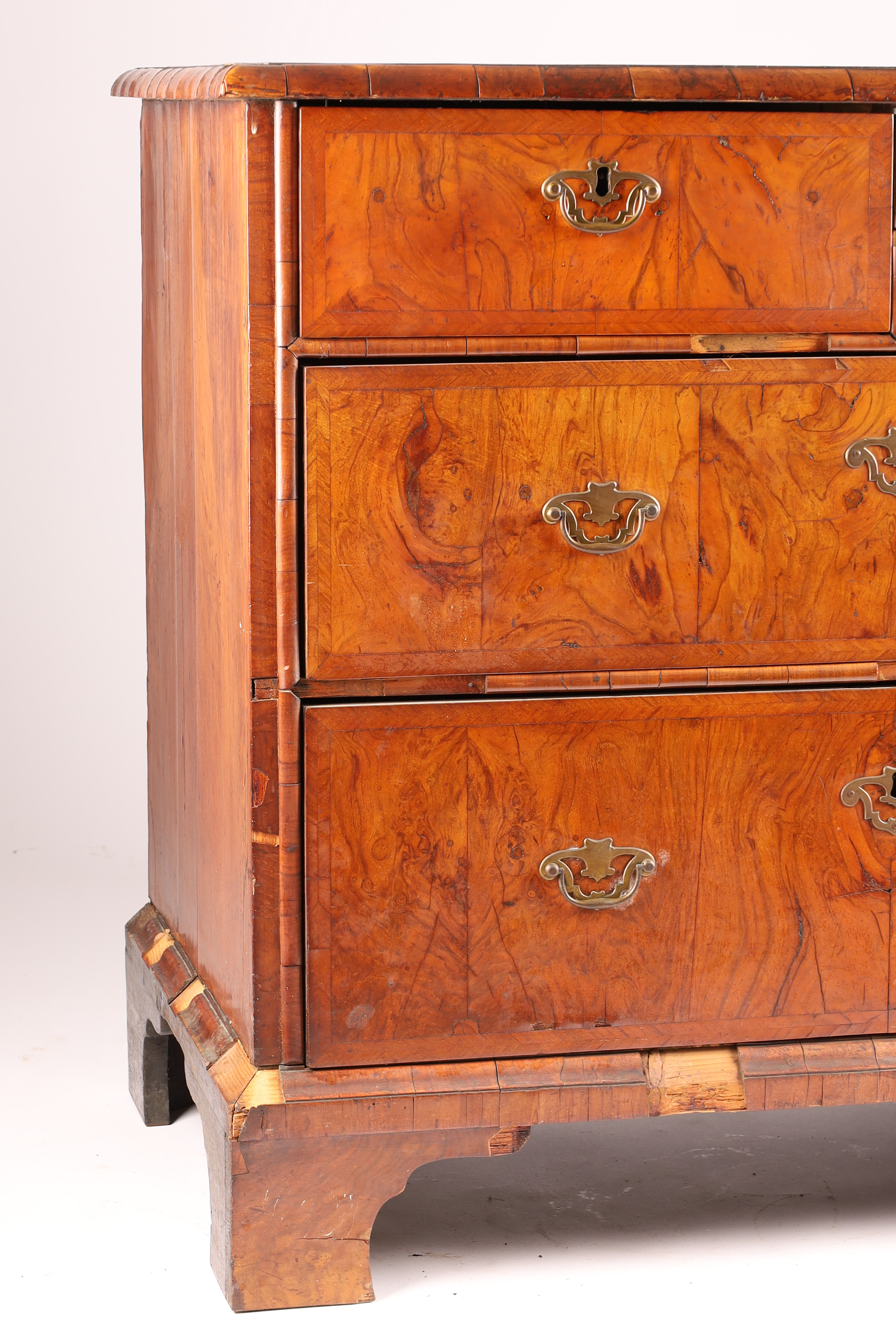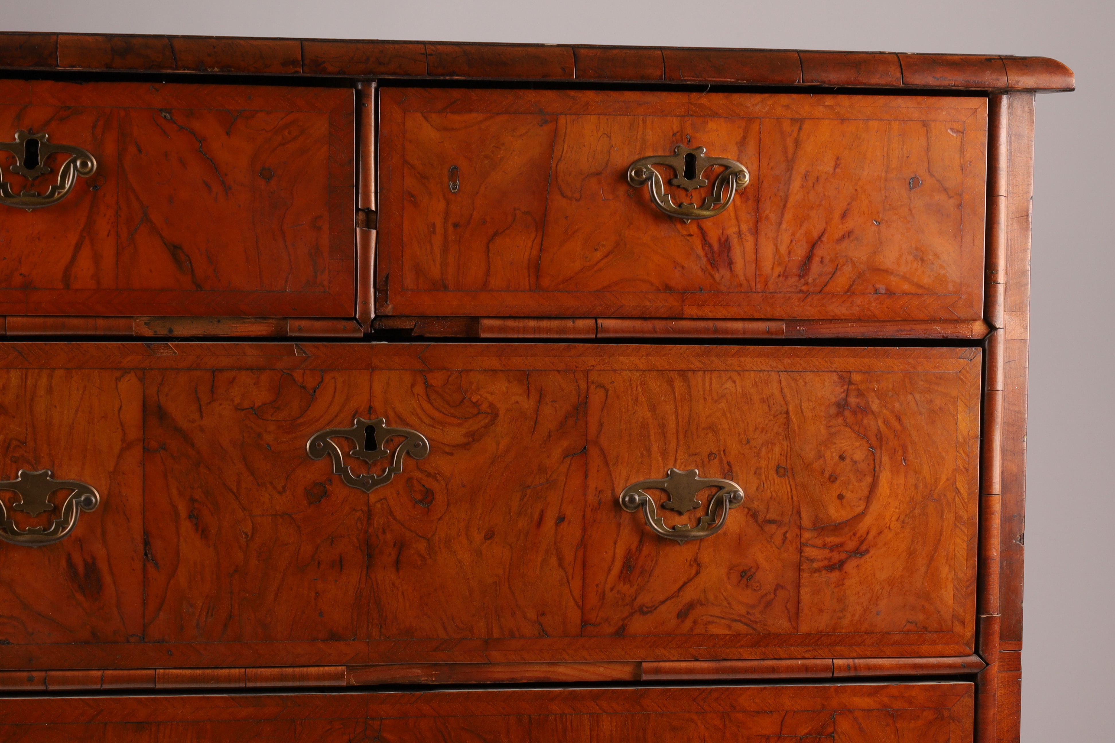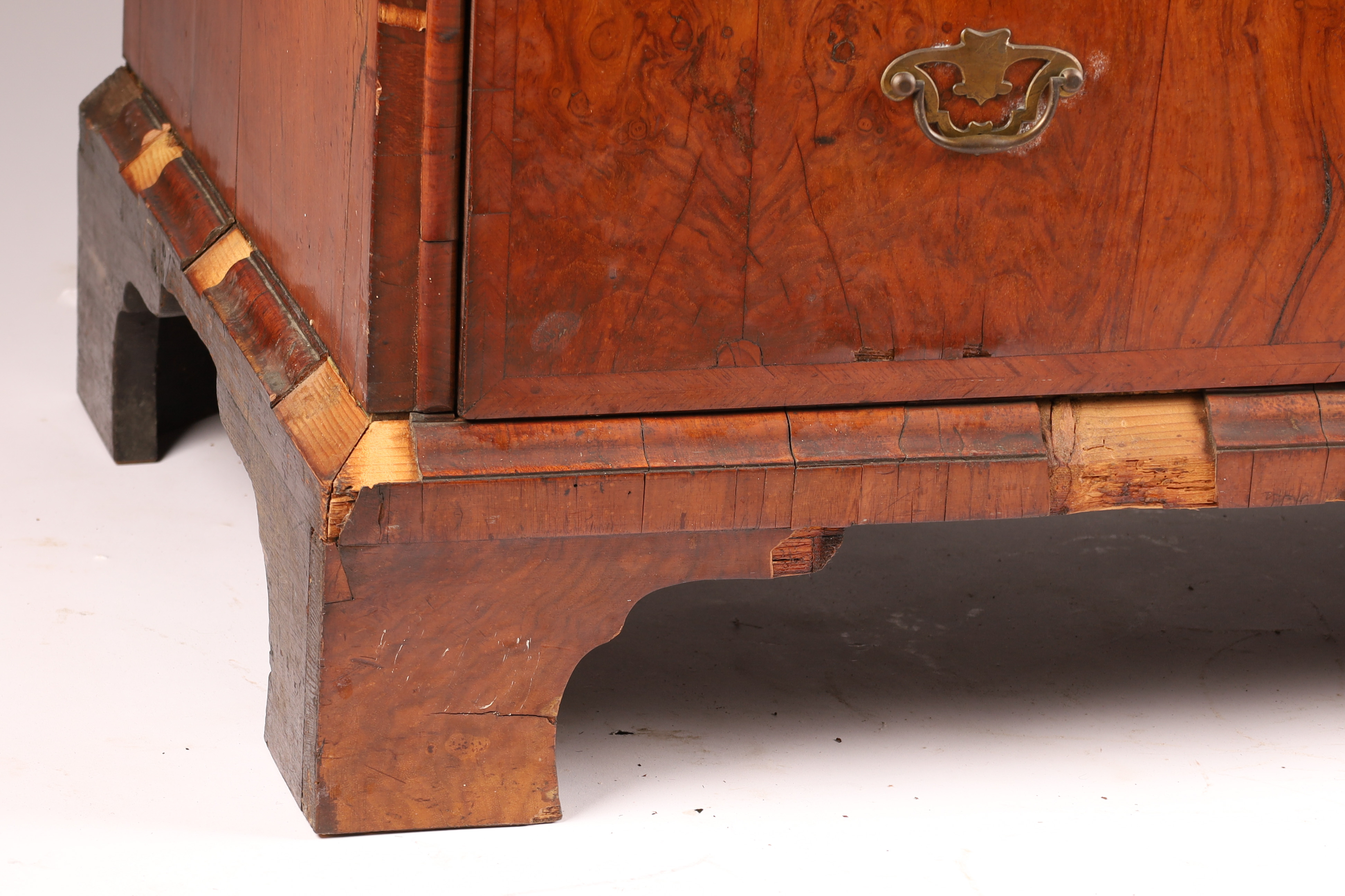 Antique English Georgian / George I Walnut Chest of Drawers, 2 short drawers over 2 long. Loss to veneer, as shown. 32.5 inches H x 21 deep x 37 W.